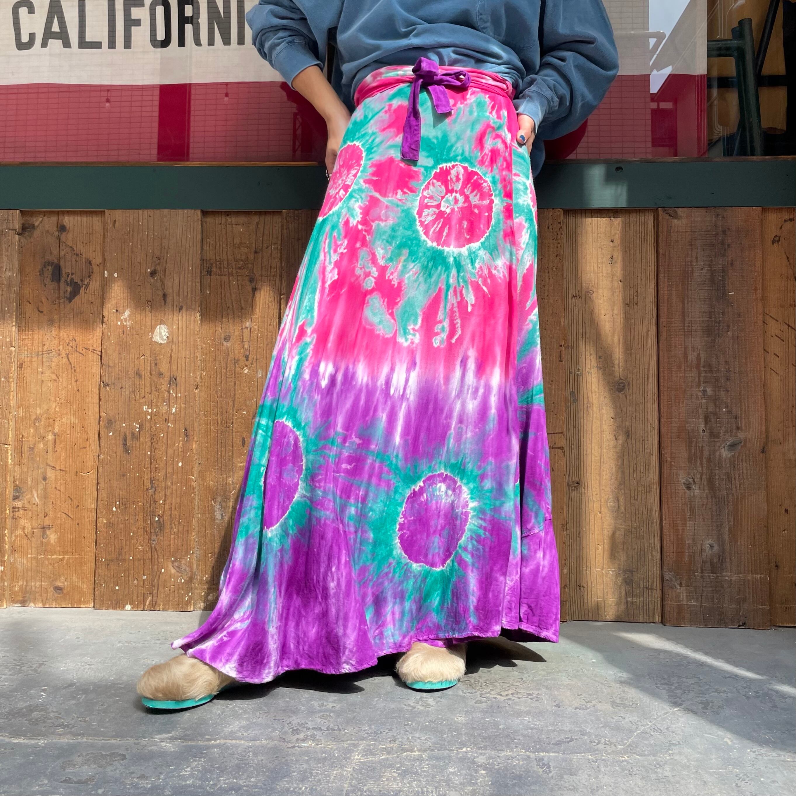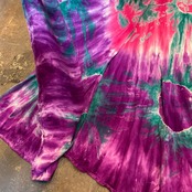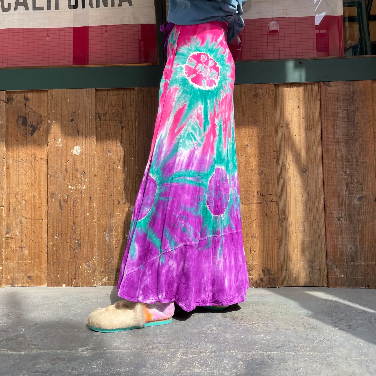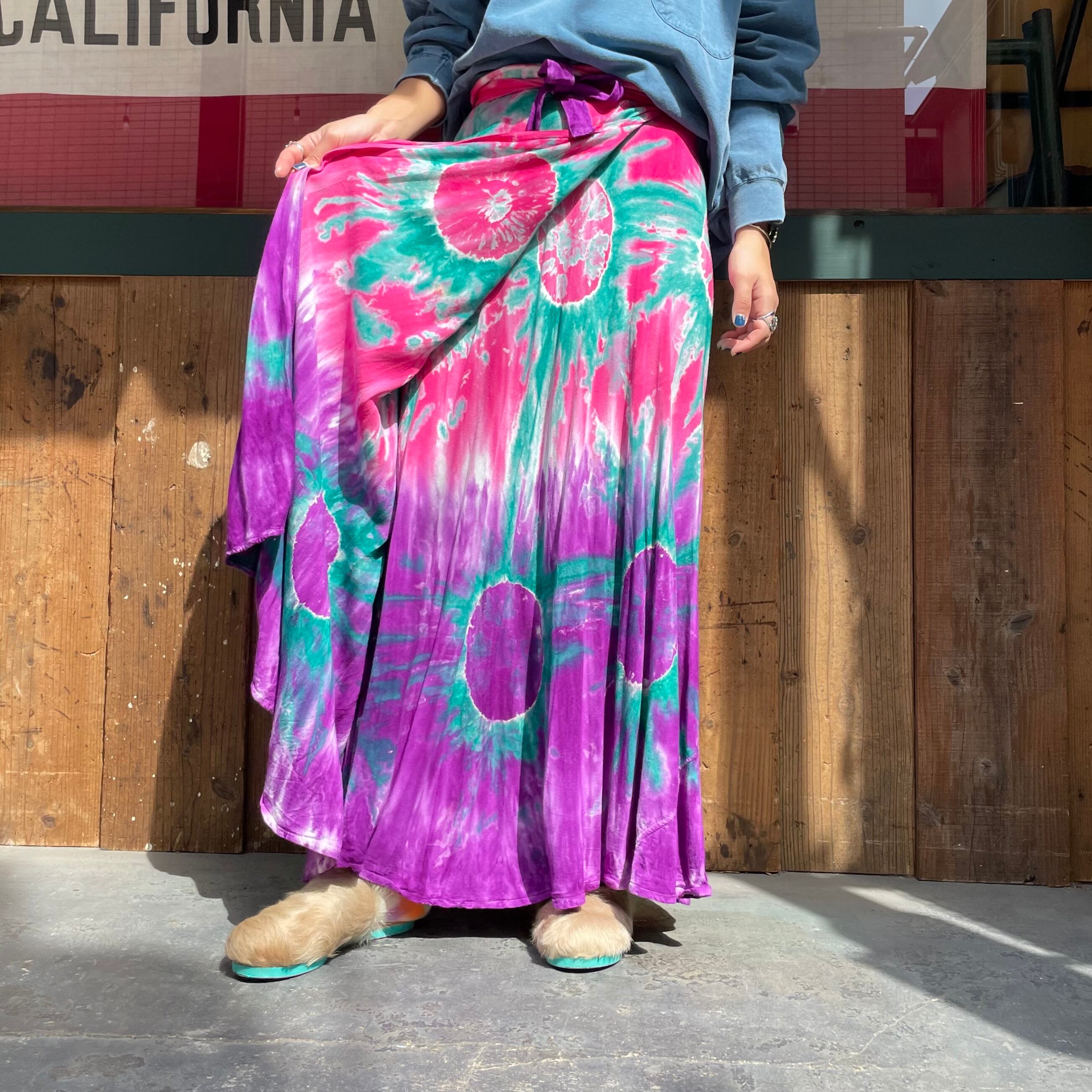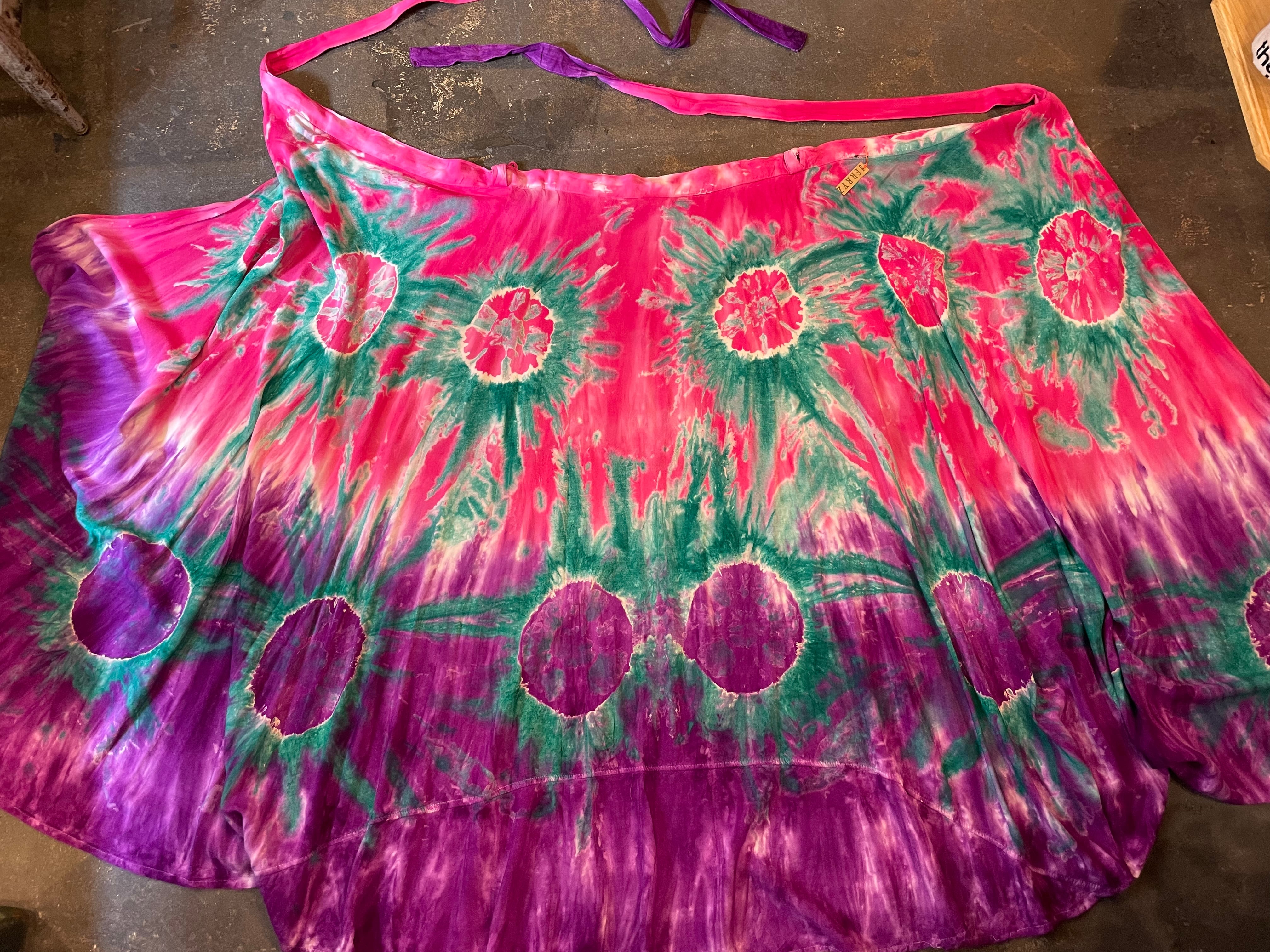 ピンク緑むらさきの色味と太陽のような模様がとてもかわいいタイダイの巻きスカートです。