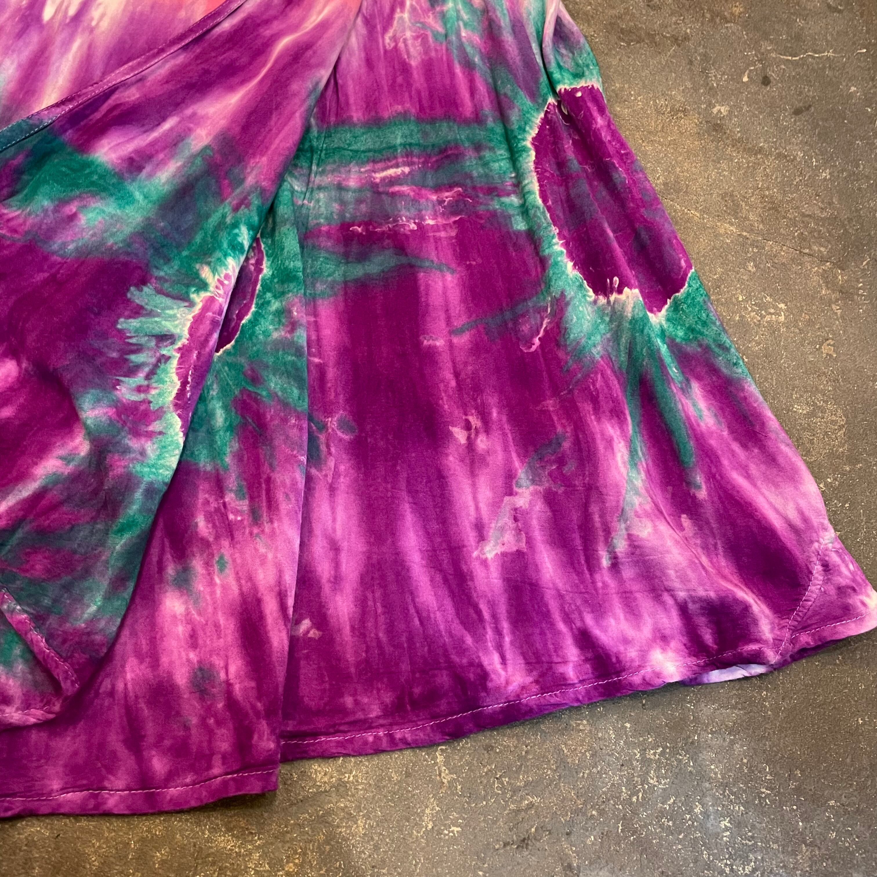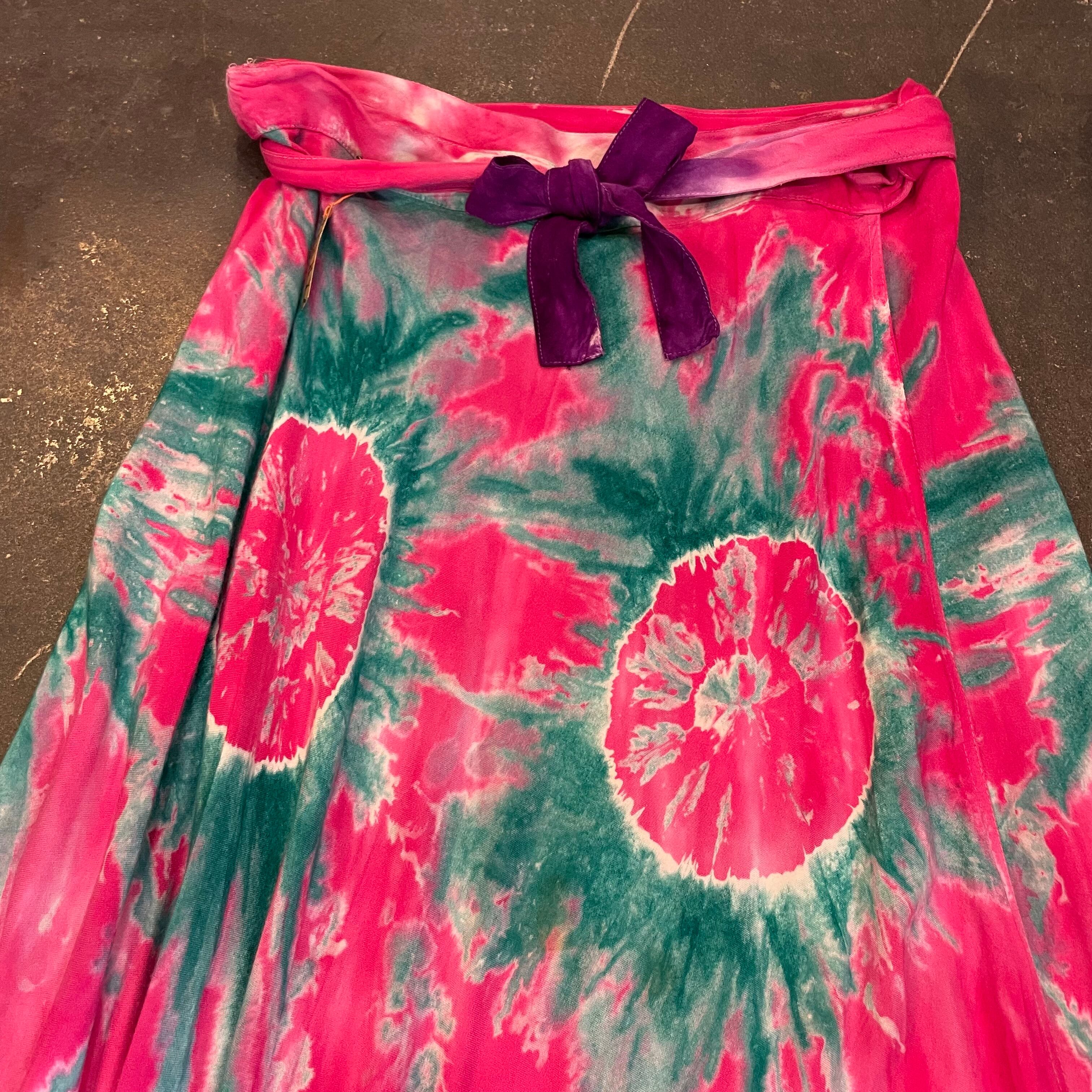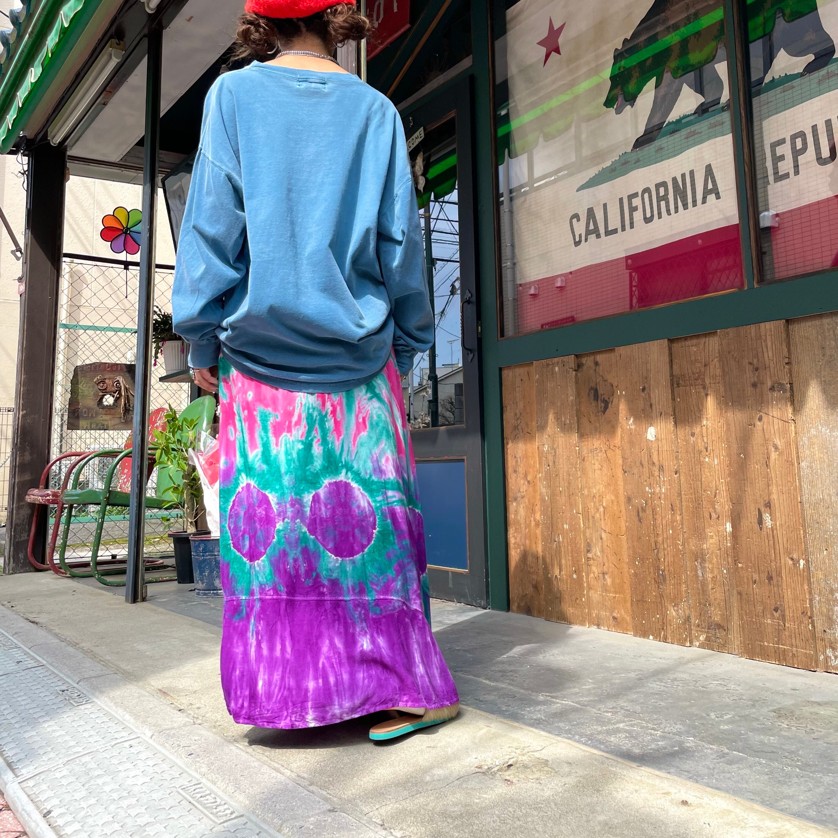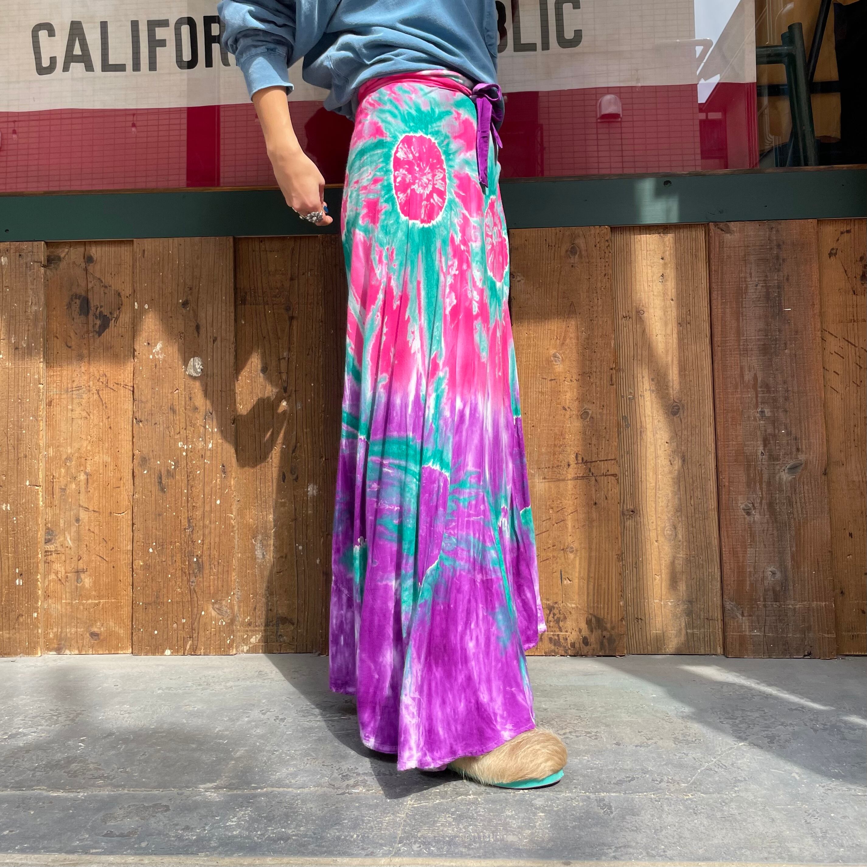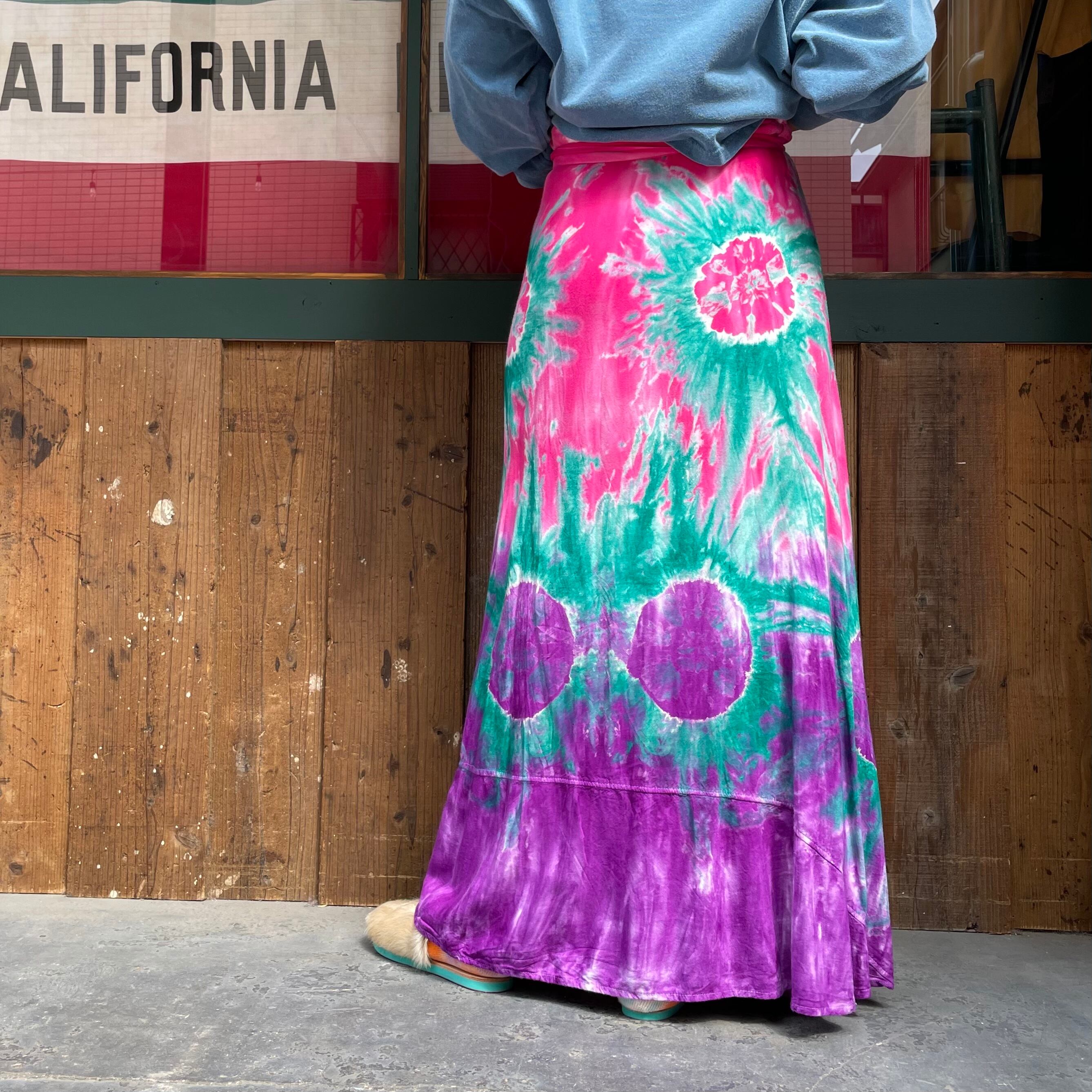 ピンク緑むらさきの色味と太陽のような模様がとてもかわいいタイダイの巻きスカートです。