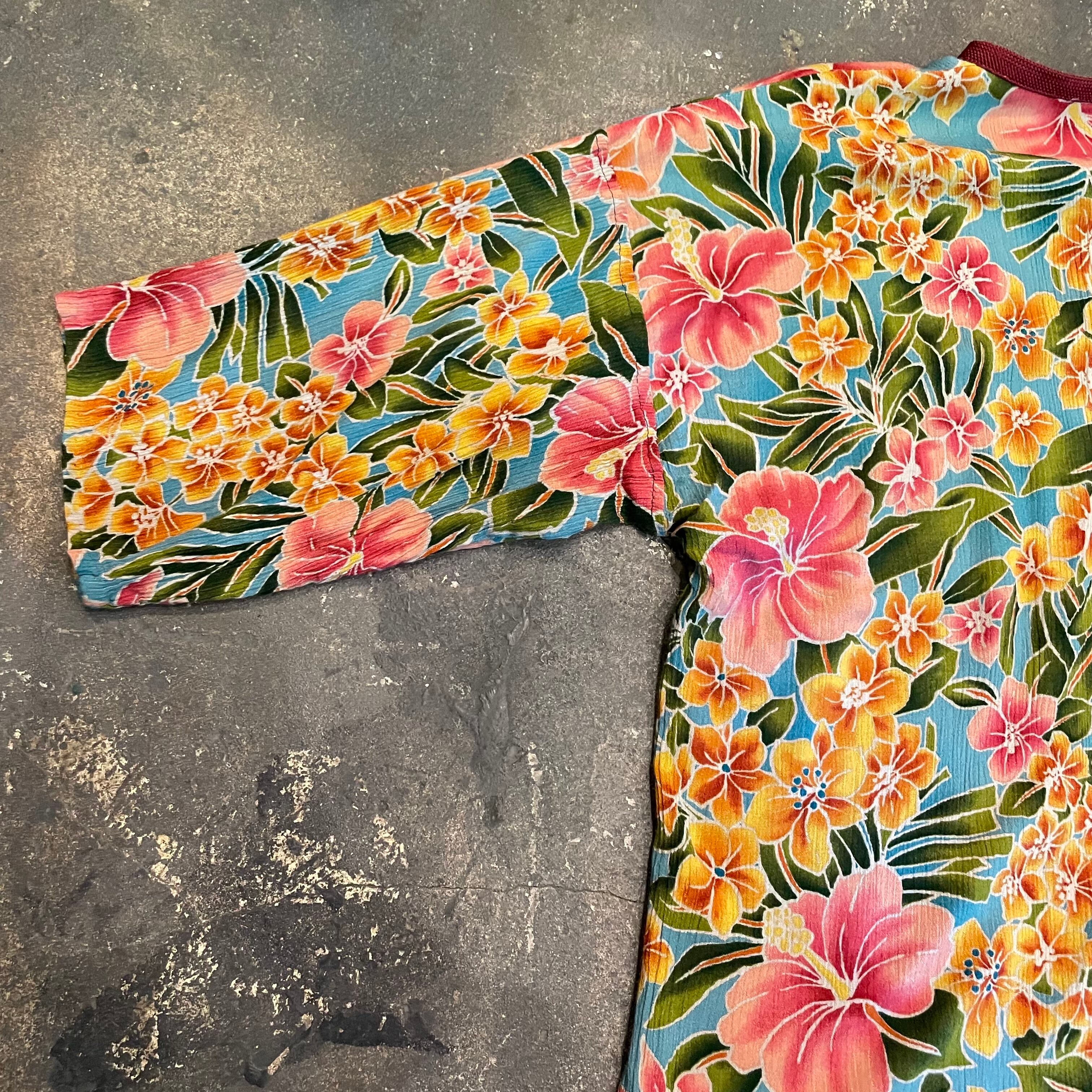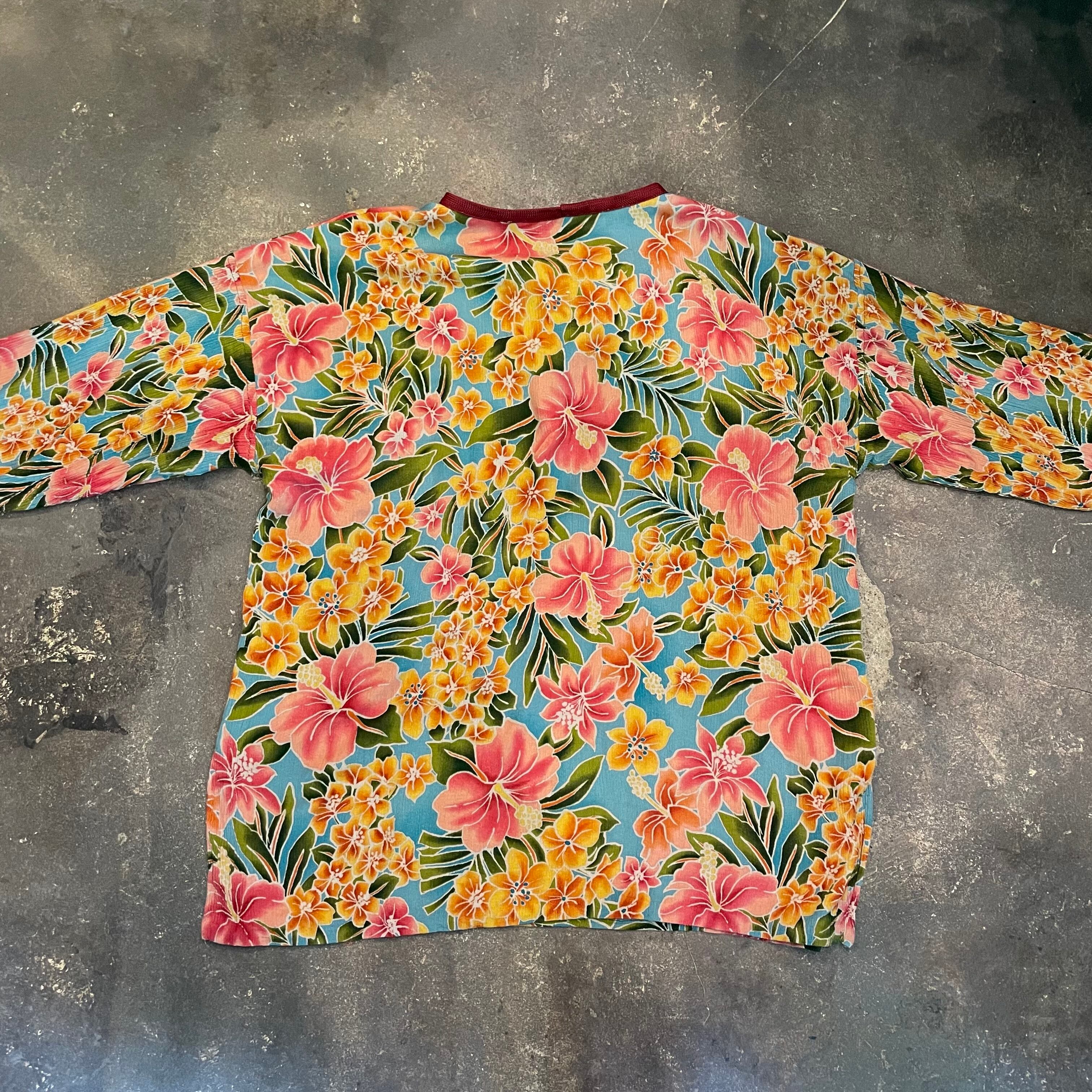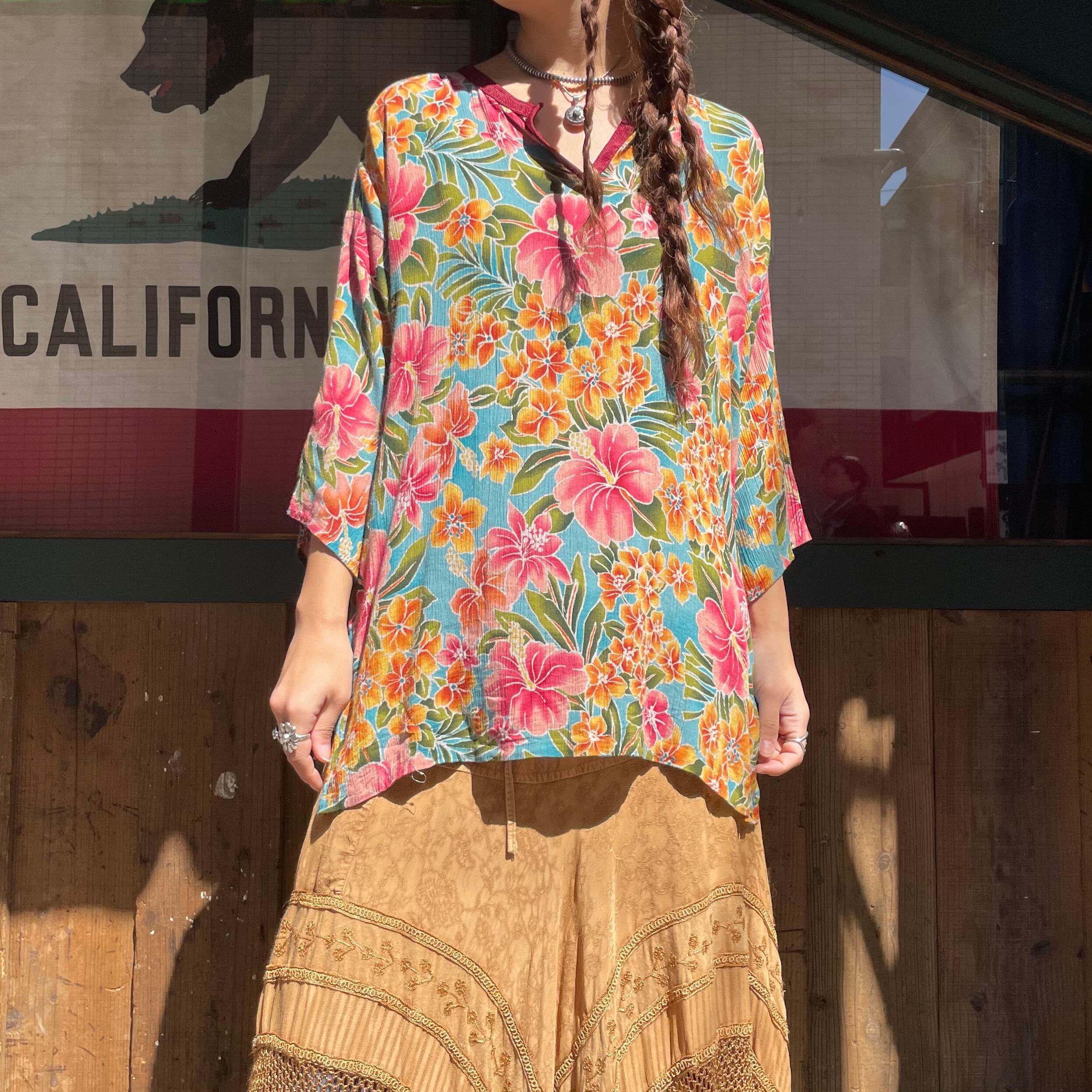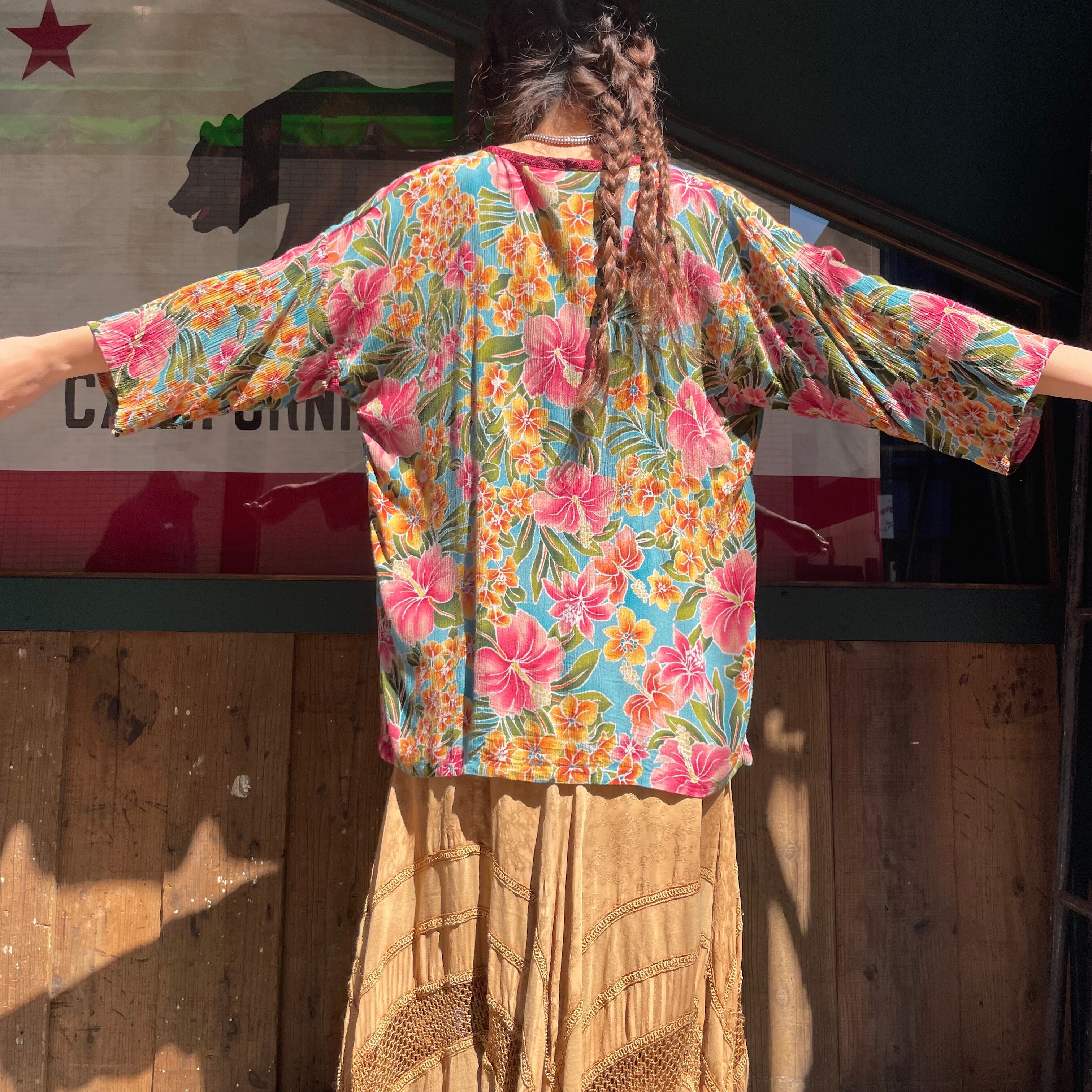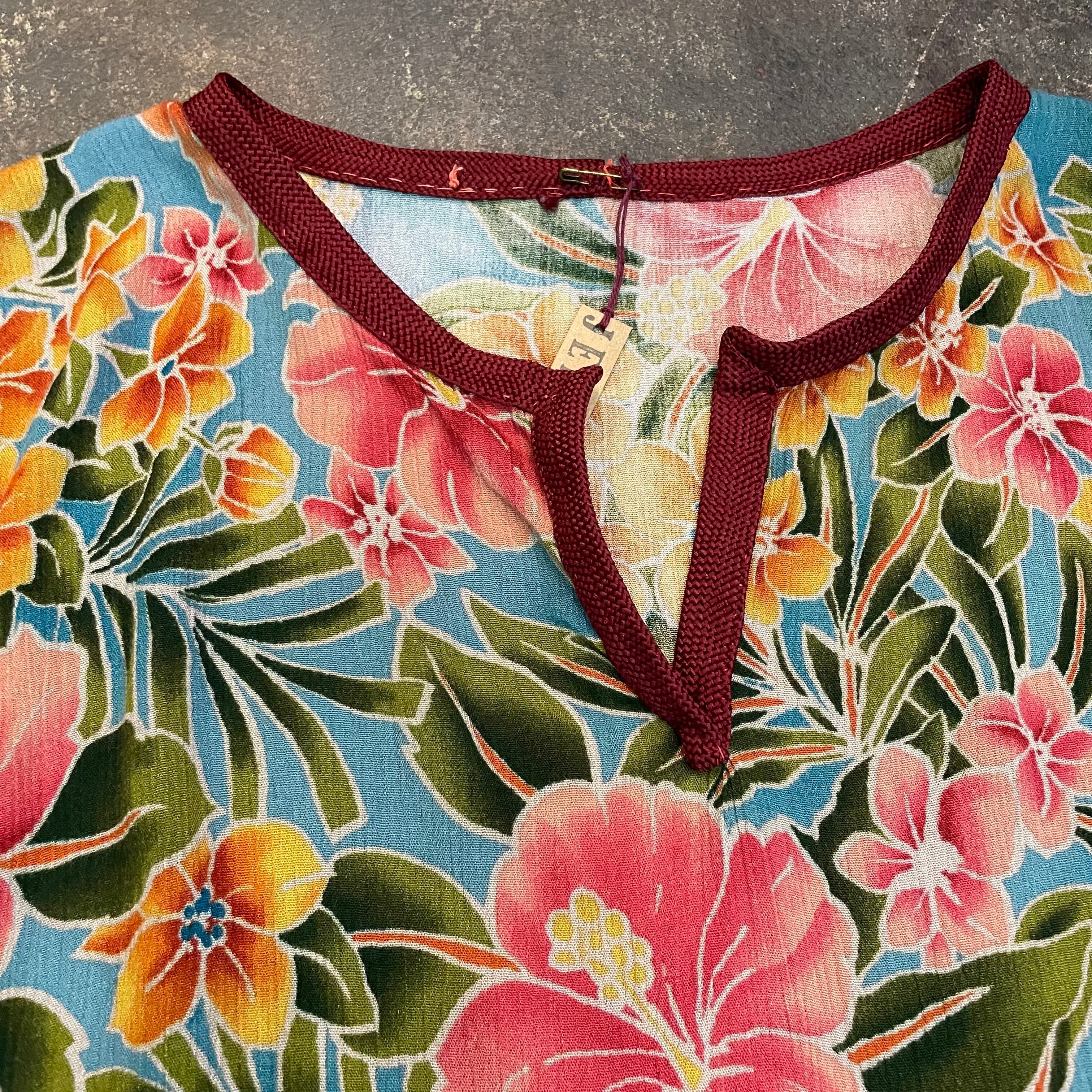 南国感のあるお花たちの柄がかわいいトップスです。水色ベースで独特なタッチの雰囲気のある柄ですね。