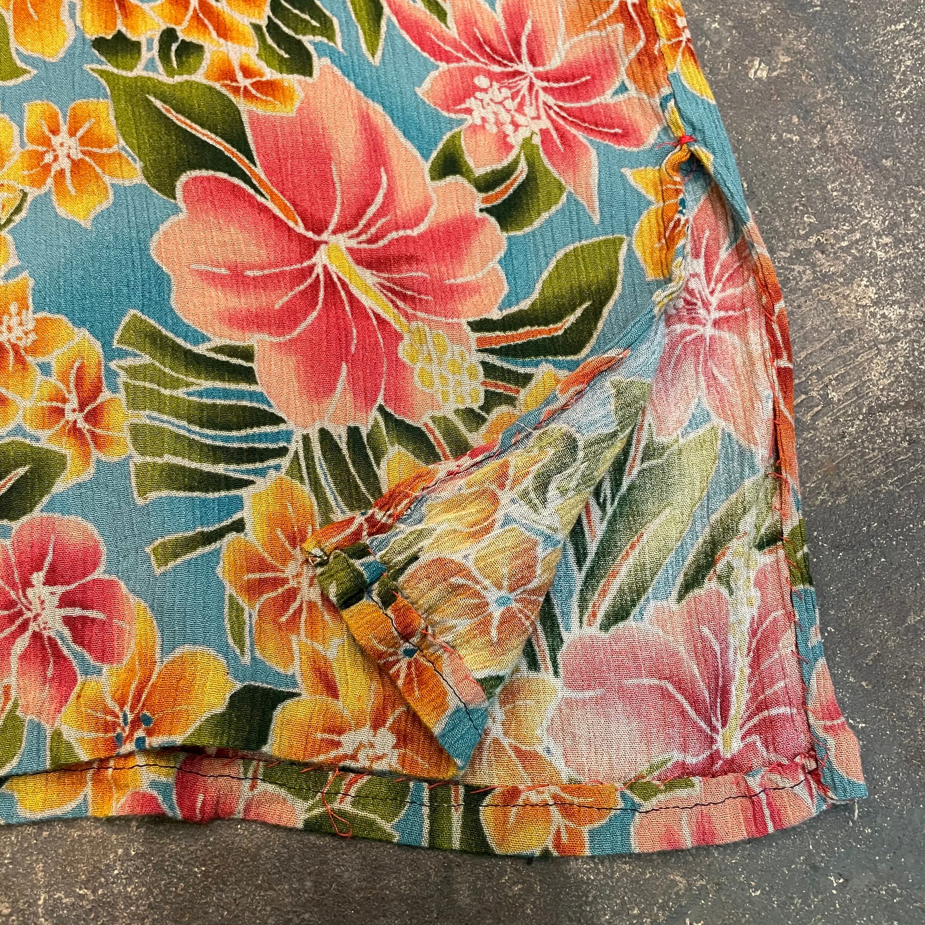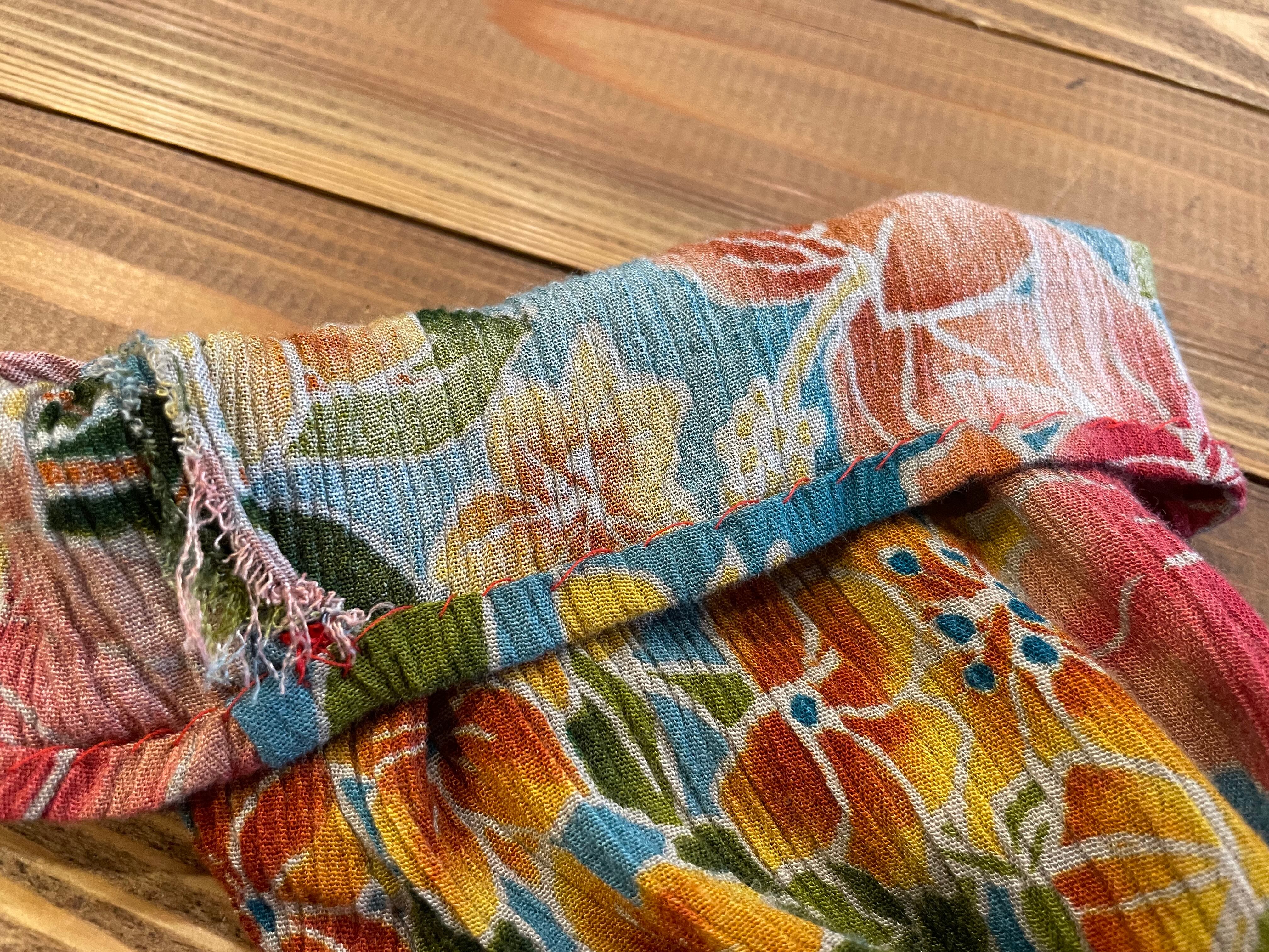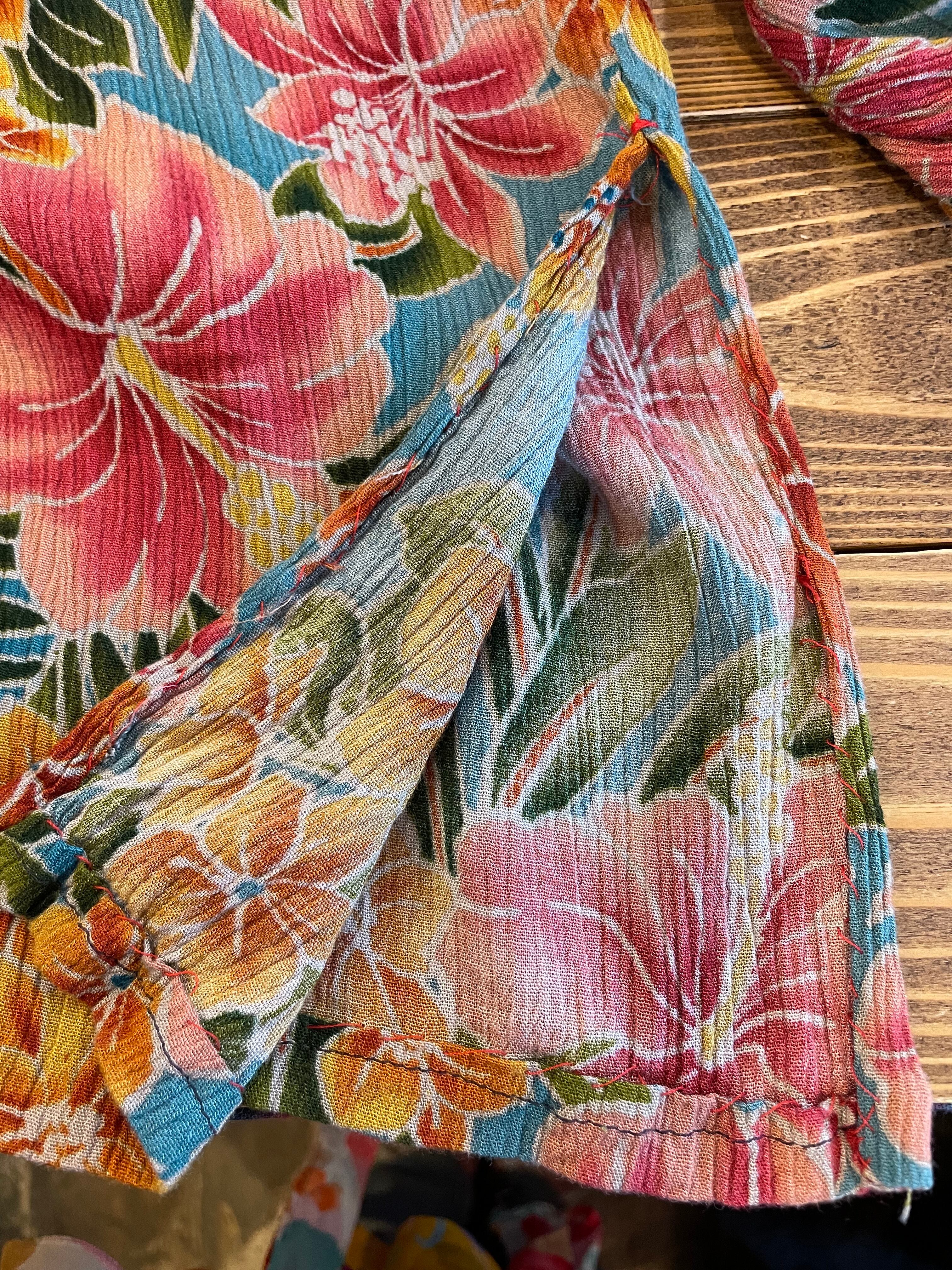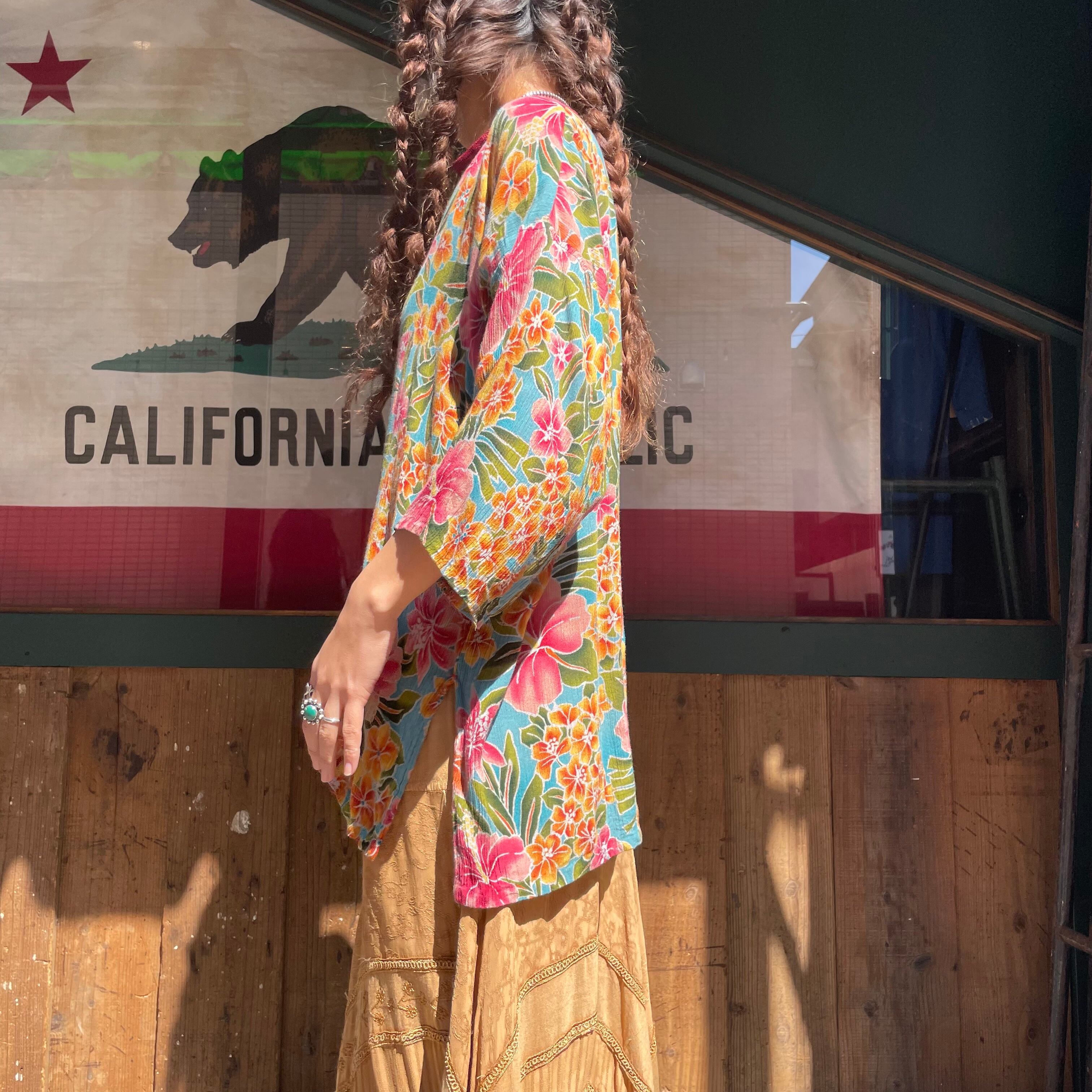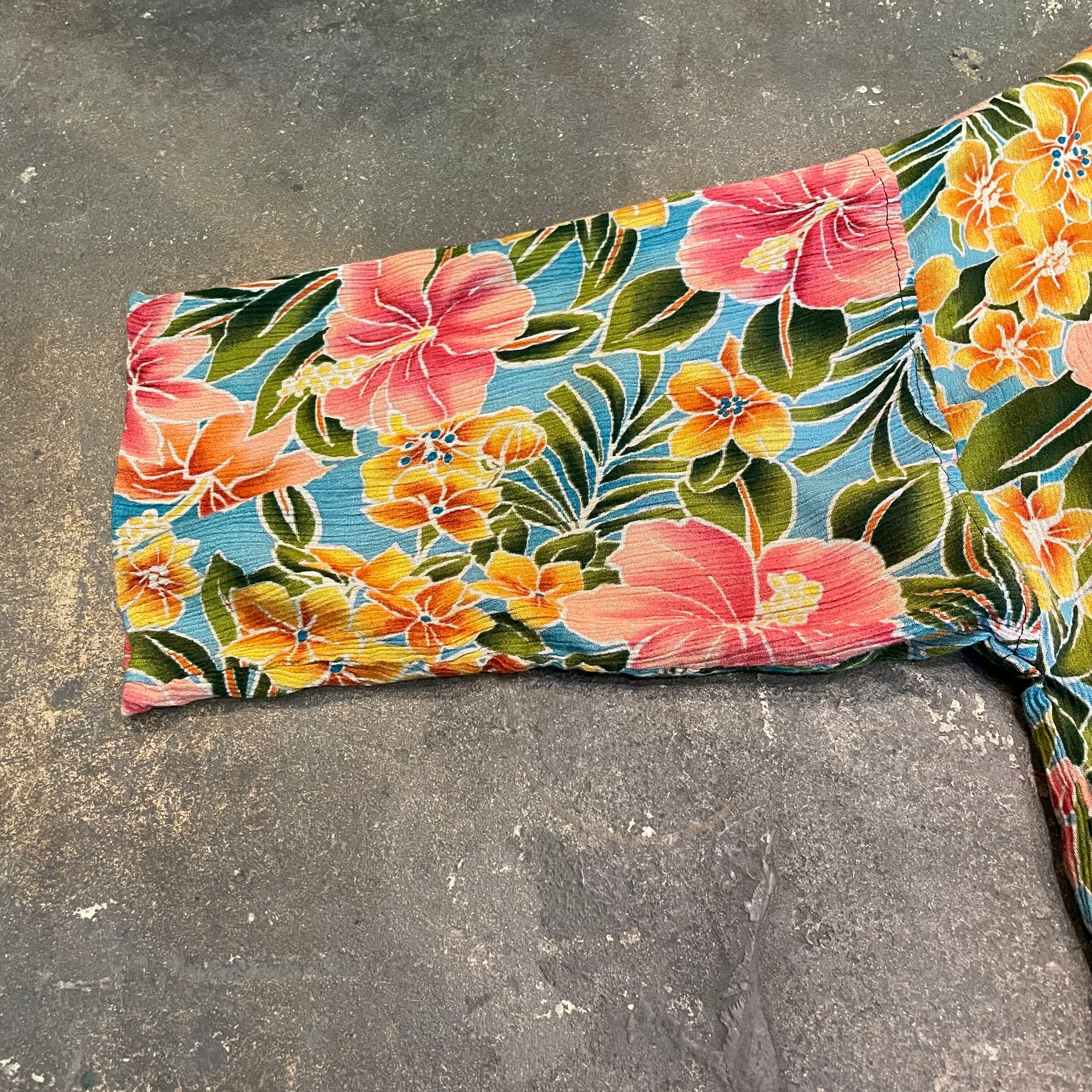 南国感のあるお花たちの柄がかわいいトップスです。水色ベースで独特なタッチの雰囲気のある柄ですね。