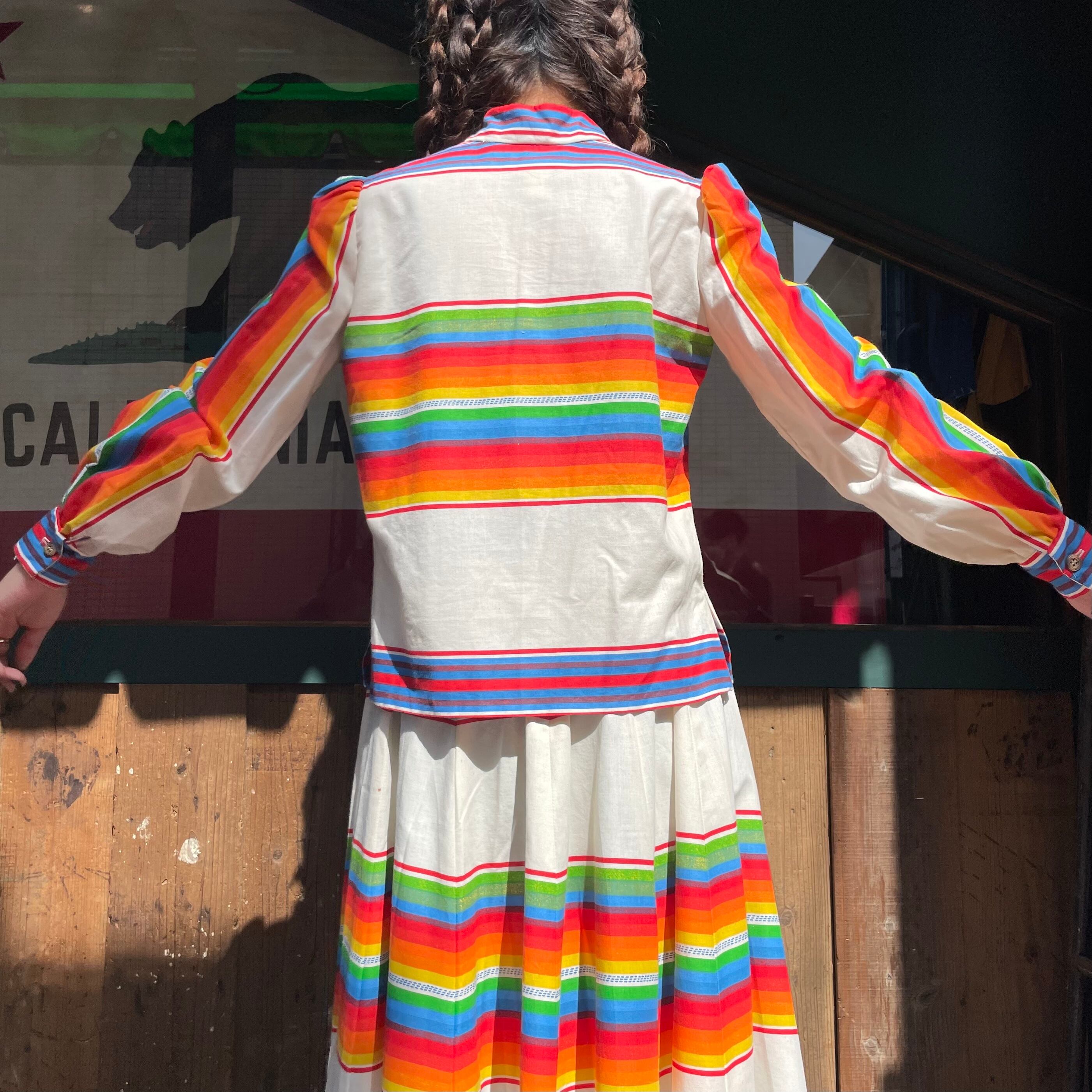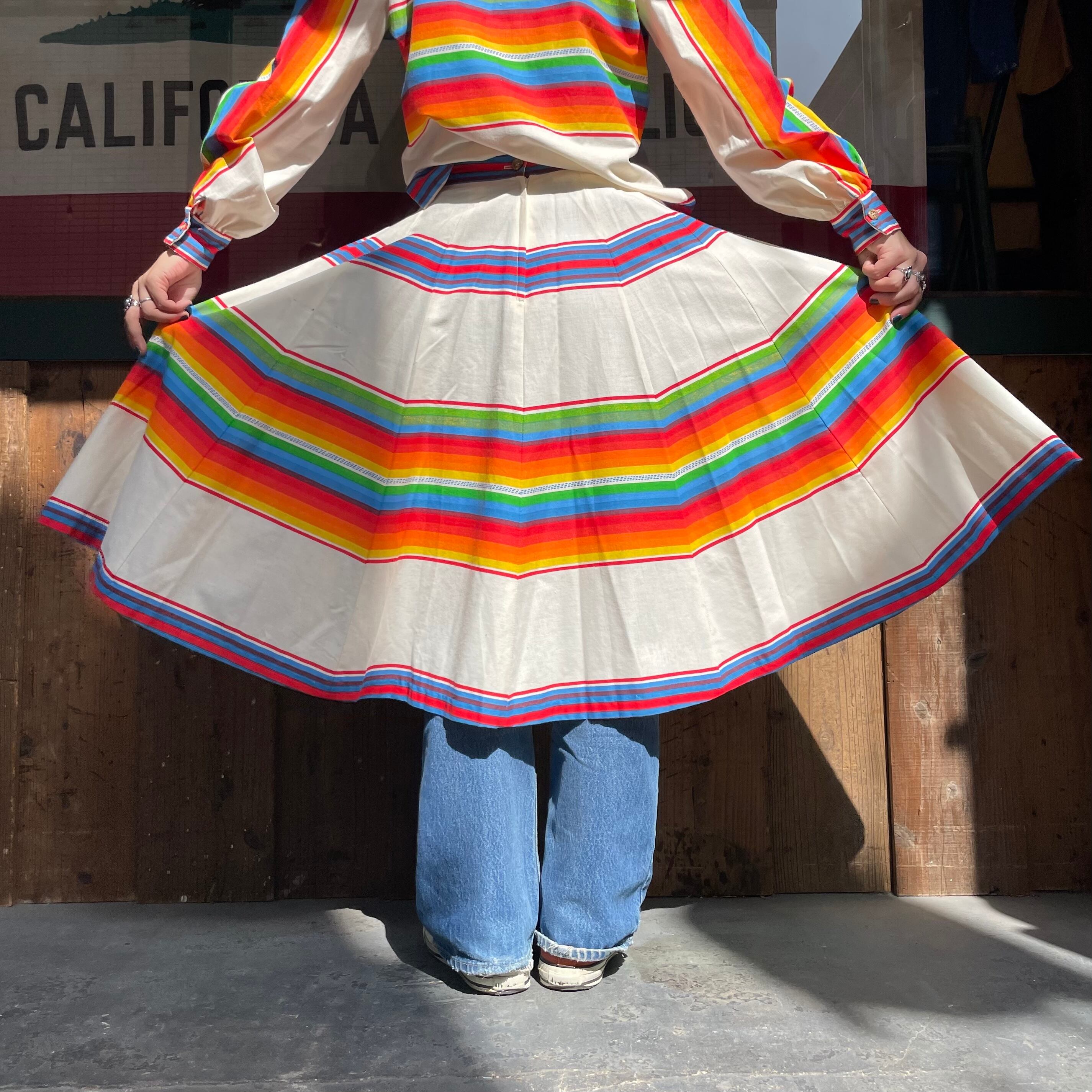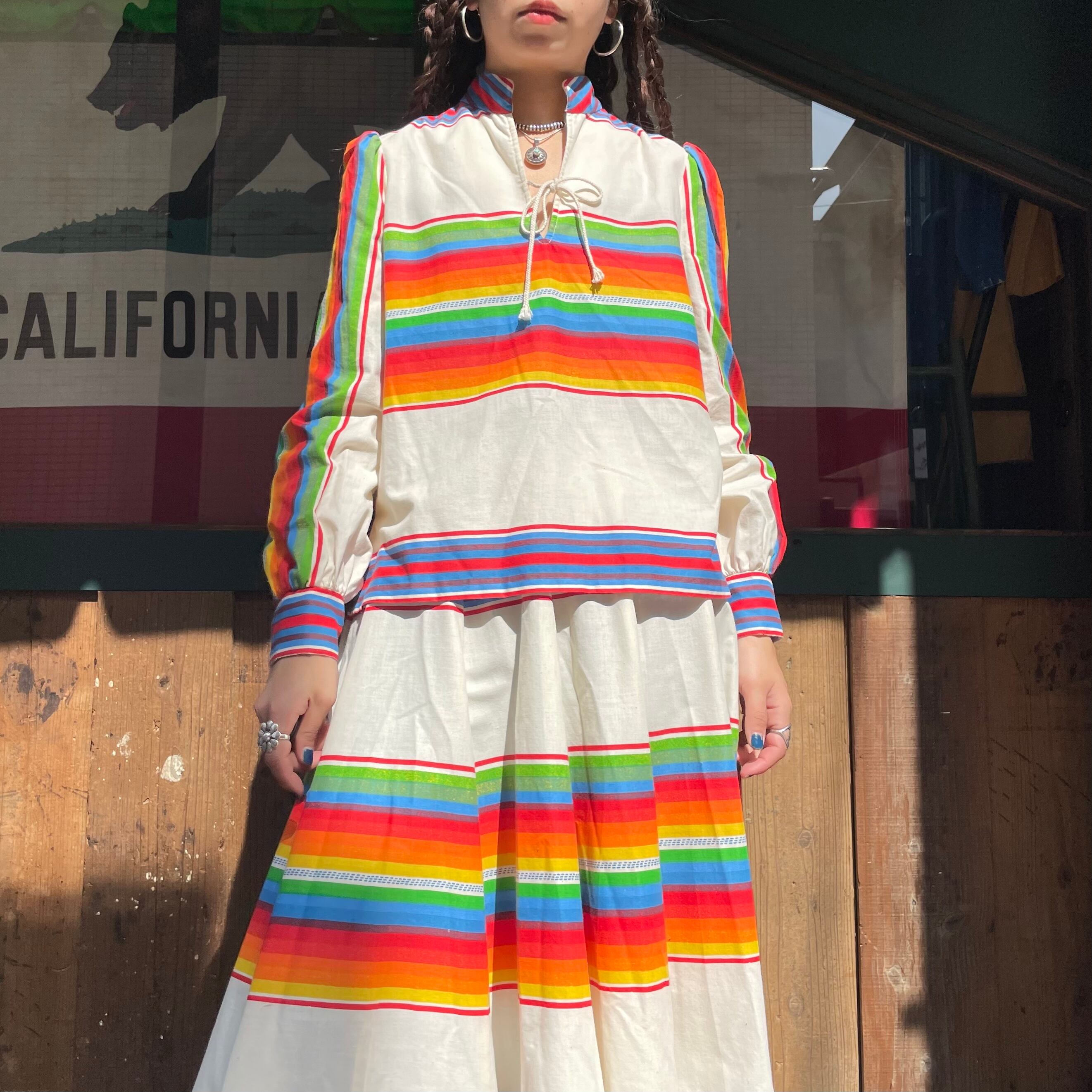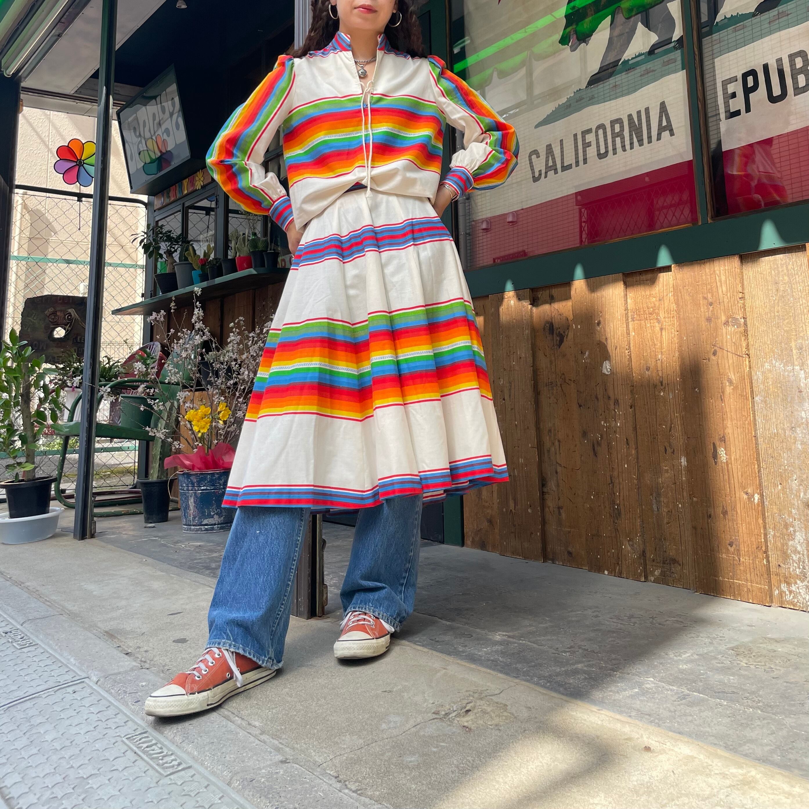 レインボーなデザインが目を惹く、とてもかわいい70年代ごろのセットアップです。スタンドカラーのブラウスと膝下丈のスカートで、どちらもとてときれいなシルエットです。