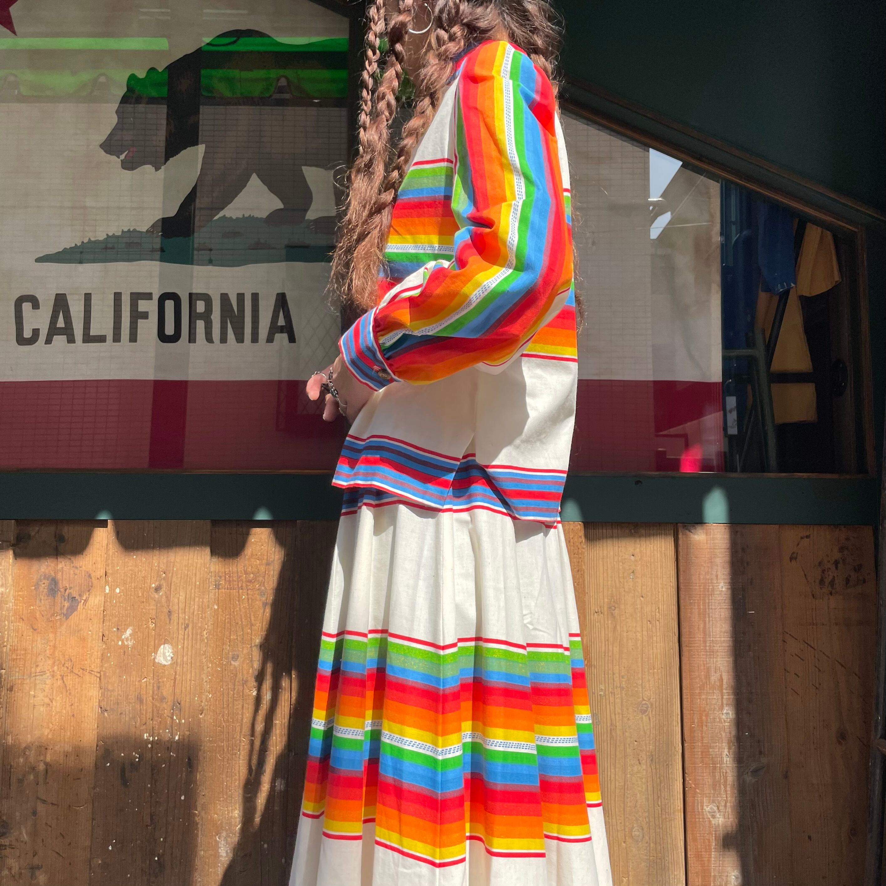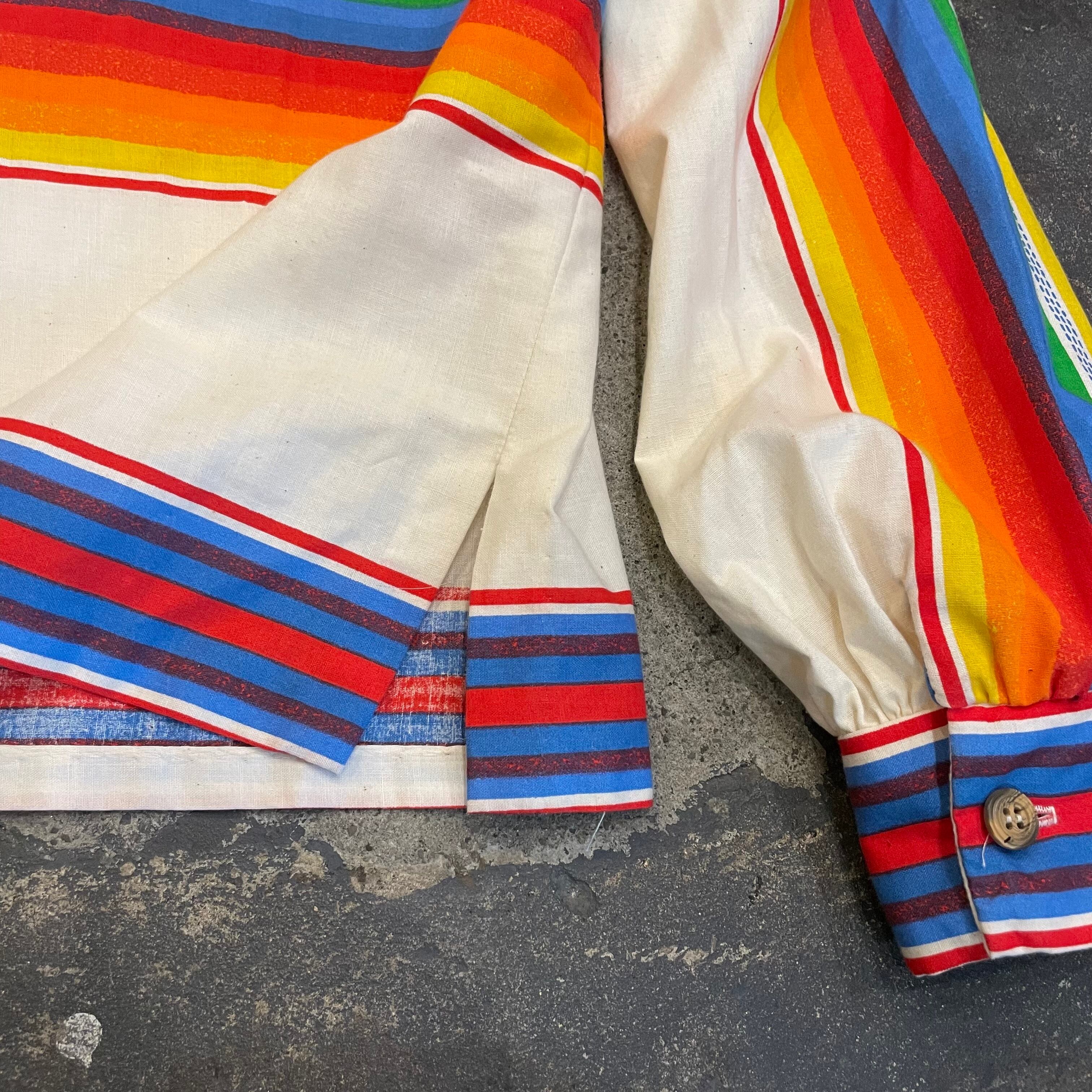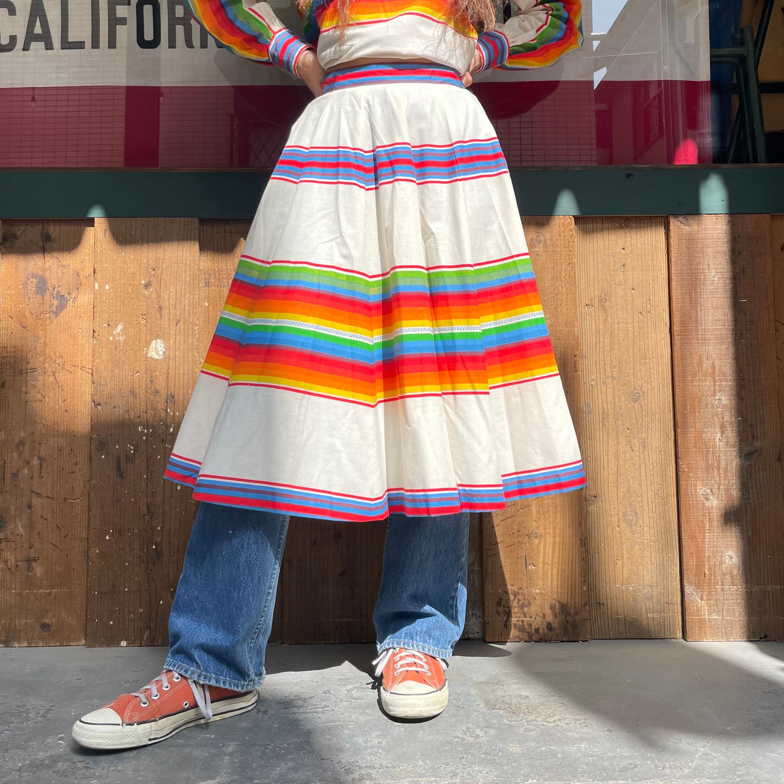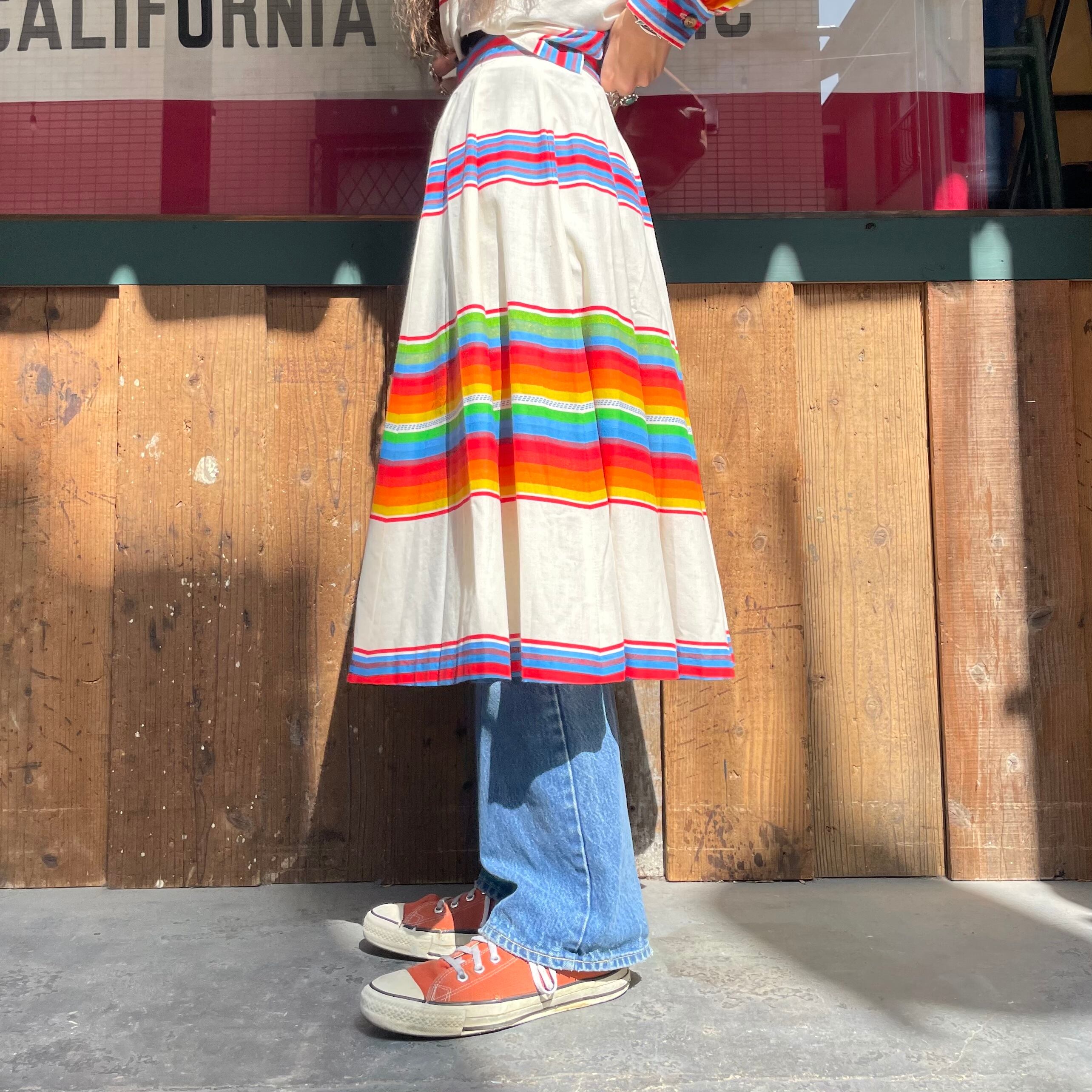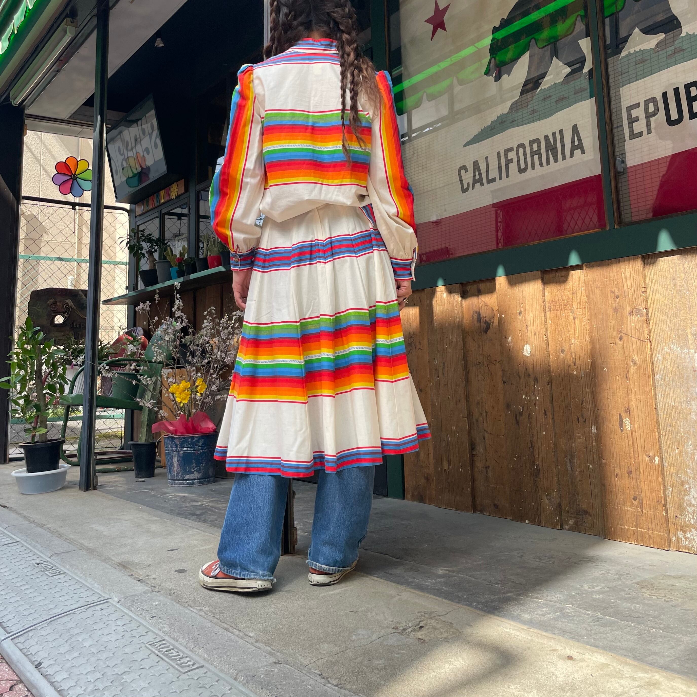 レインボーなデザインが目を惹く、とてもかわいい70年代ごろのセットアップです。スタンドカラーのブラウスと膝下丈のスカートで、どちらもとてときれいなシルエットです。