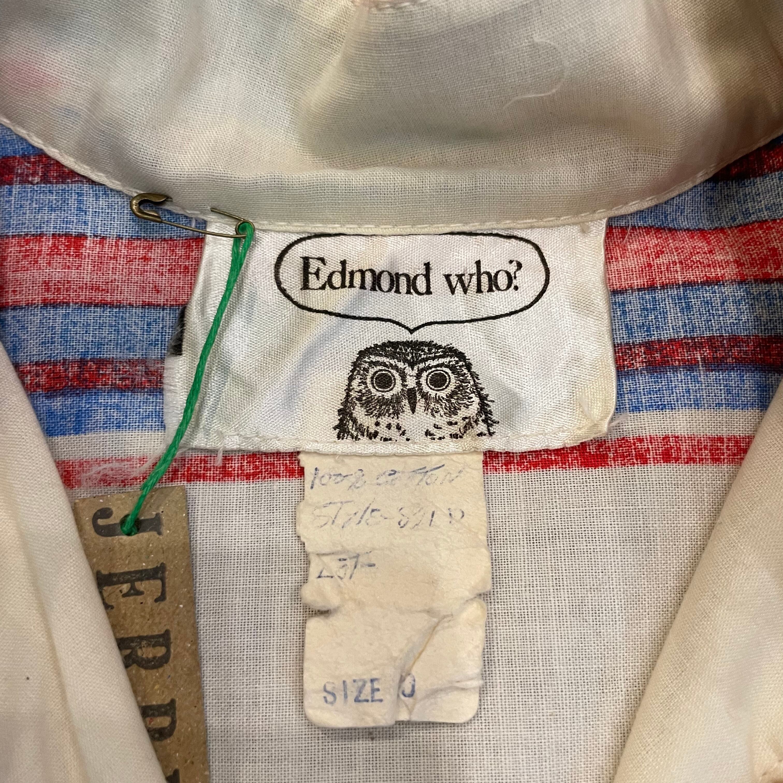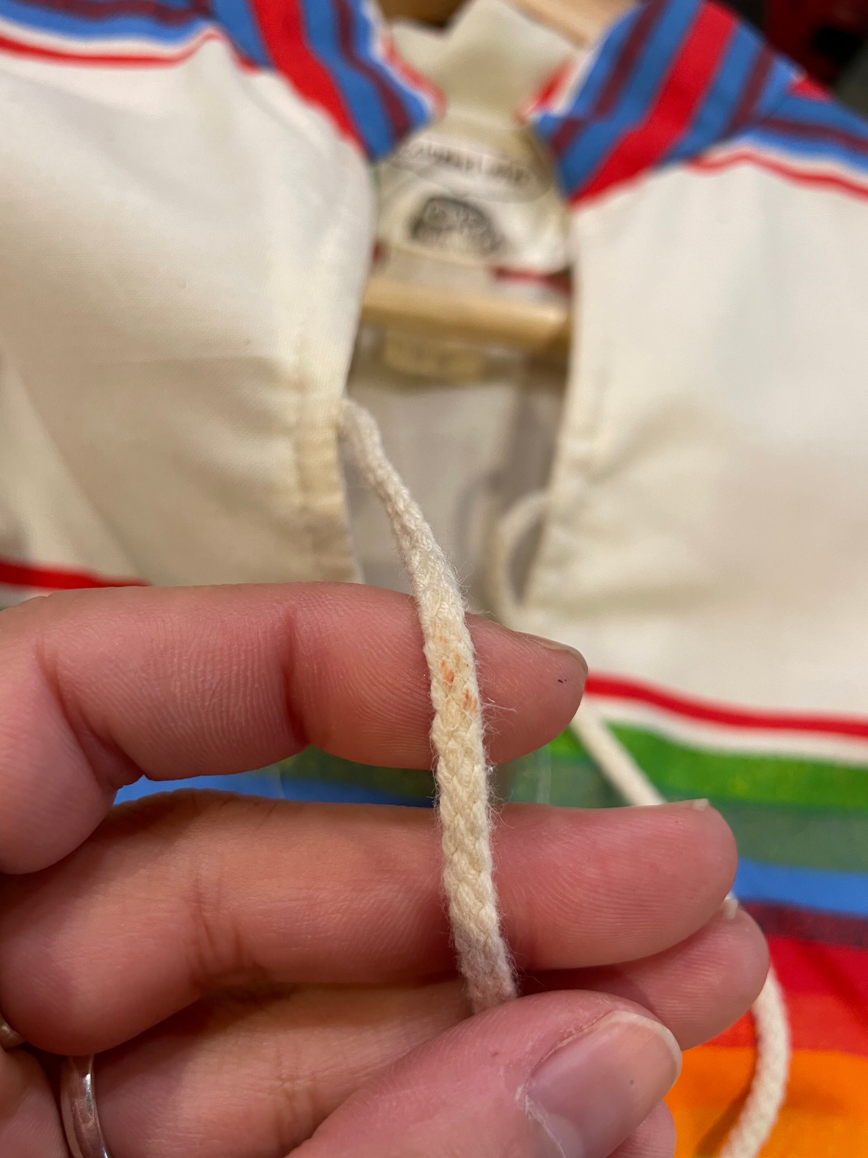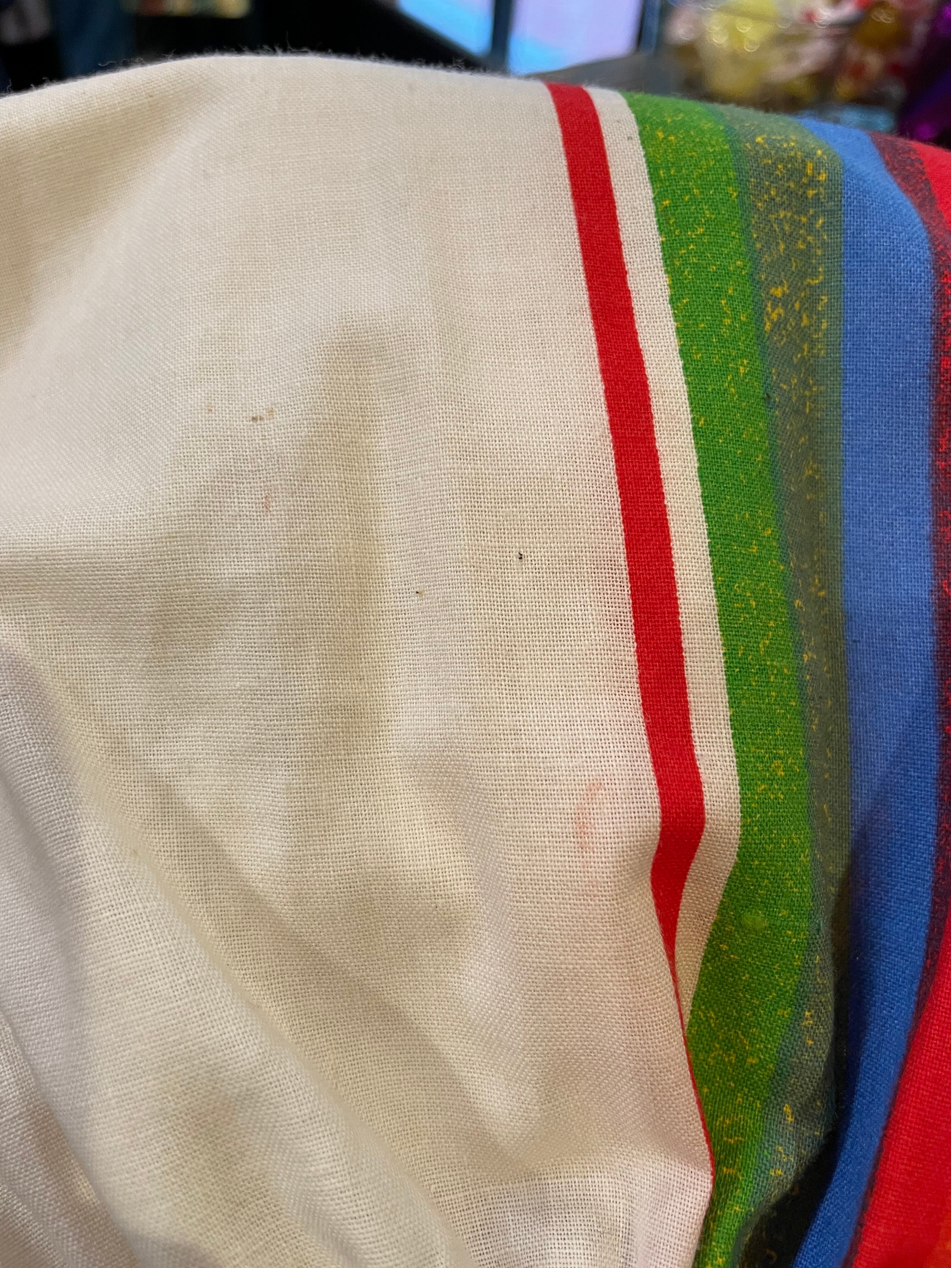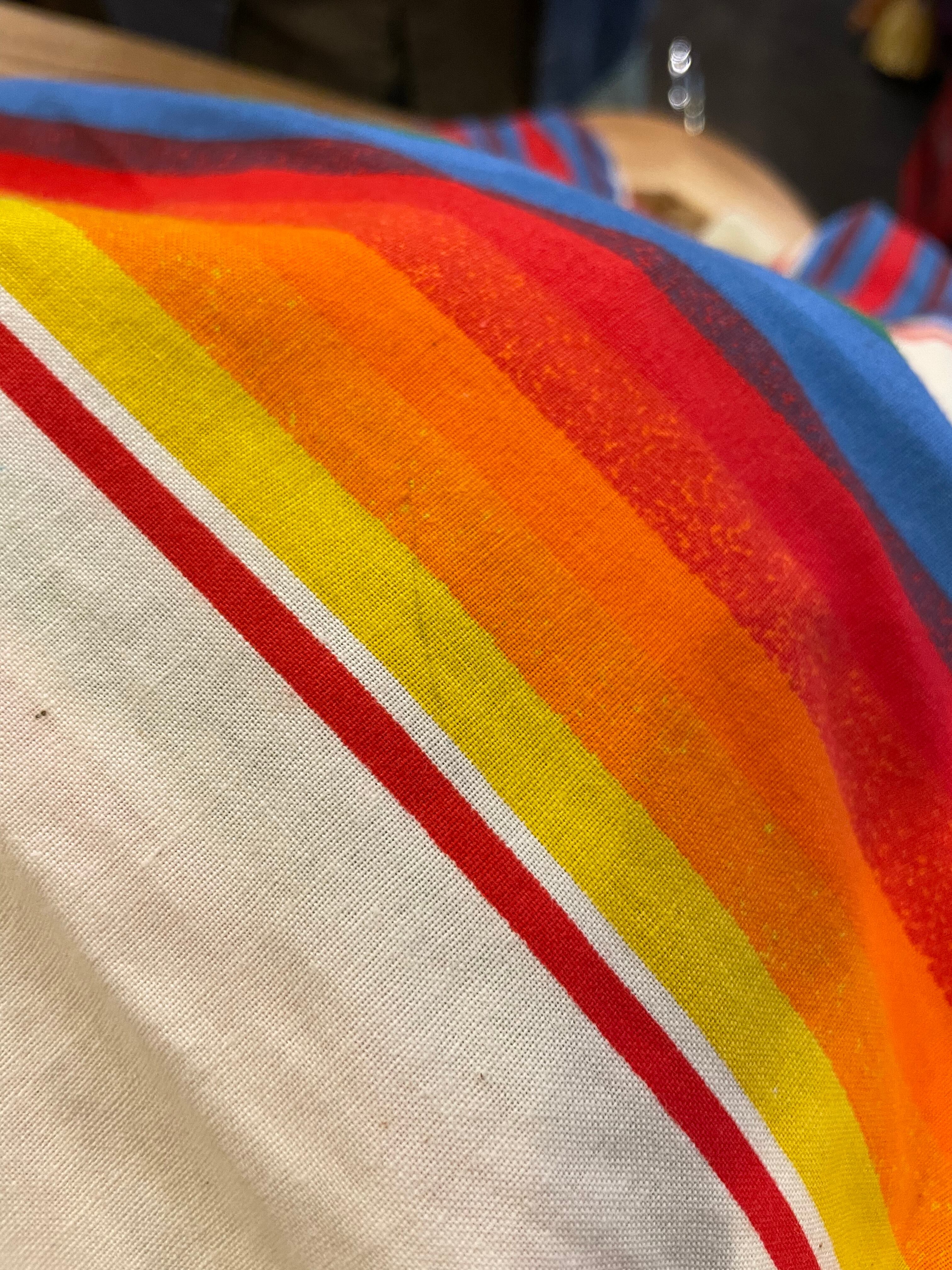 レインボーなデザインが目を惹く、とてもかわいい70年代ごろのセットアップです。スタンドカラーのブラウスと膝下丈のスカートで、どちらもとてときれいなシルエットです。