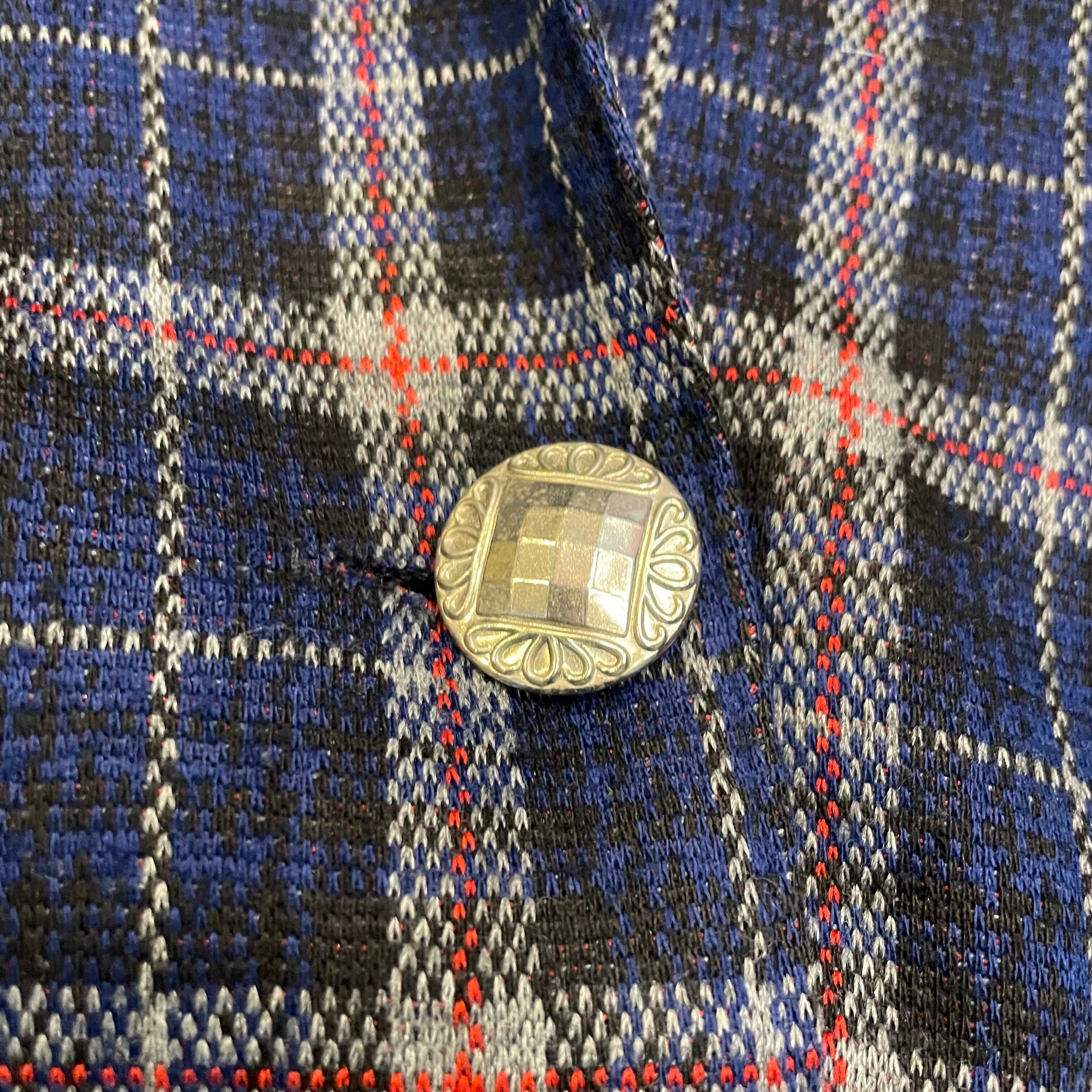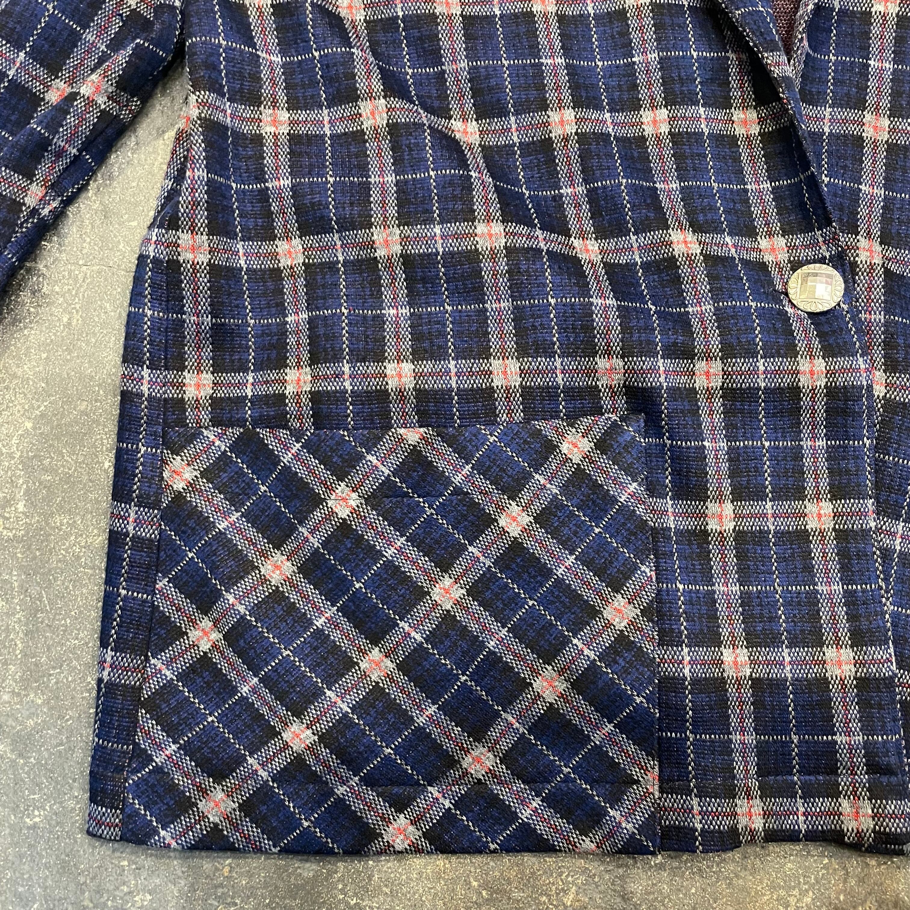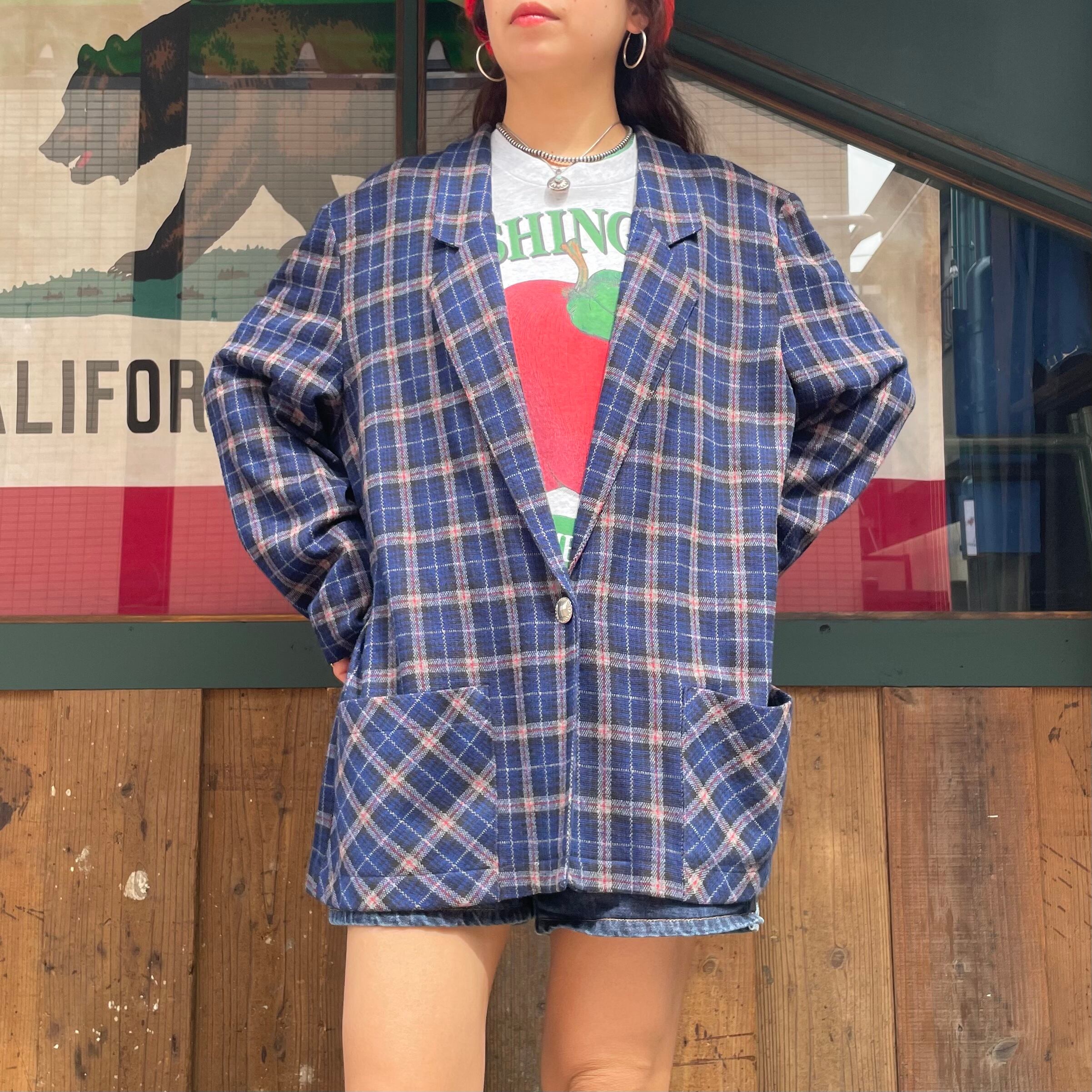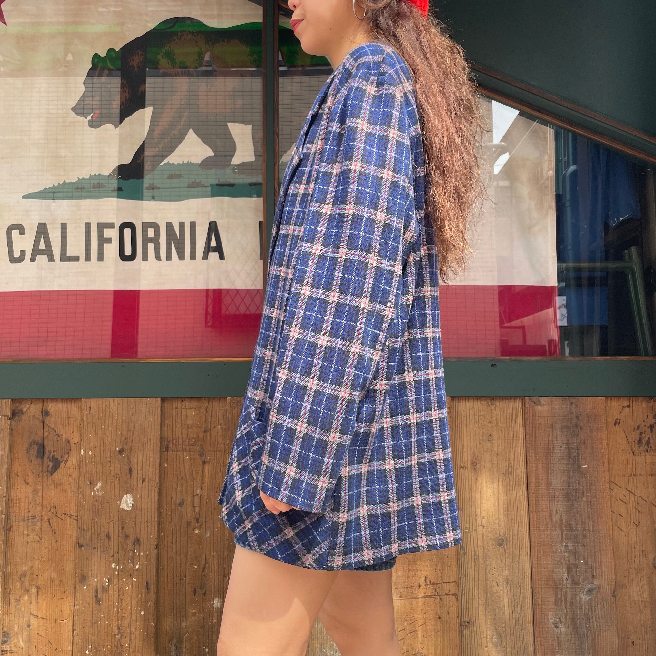 濃いめの青のチェック柄がかわいいテーラードカラーのジャケットです。