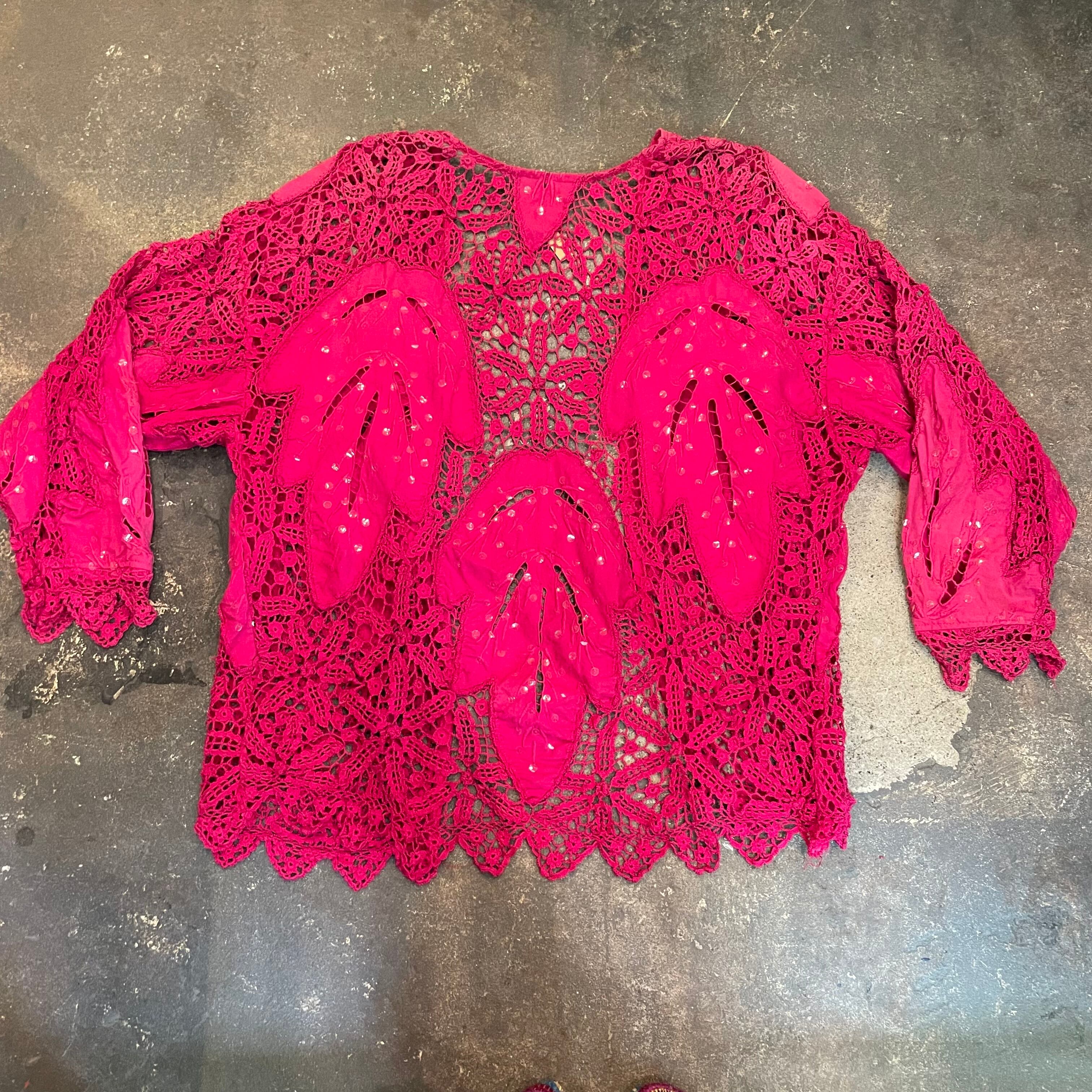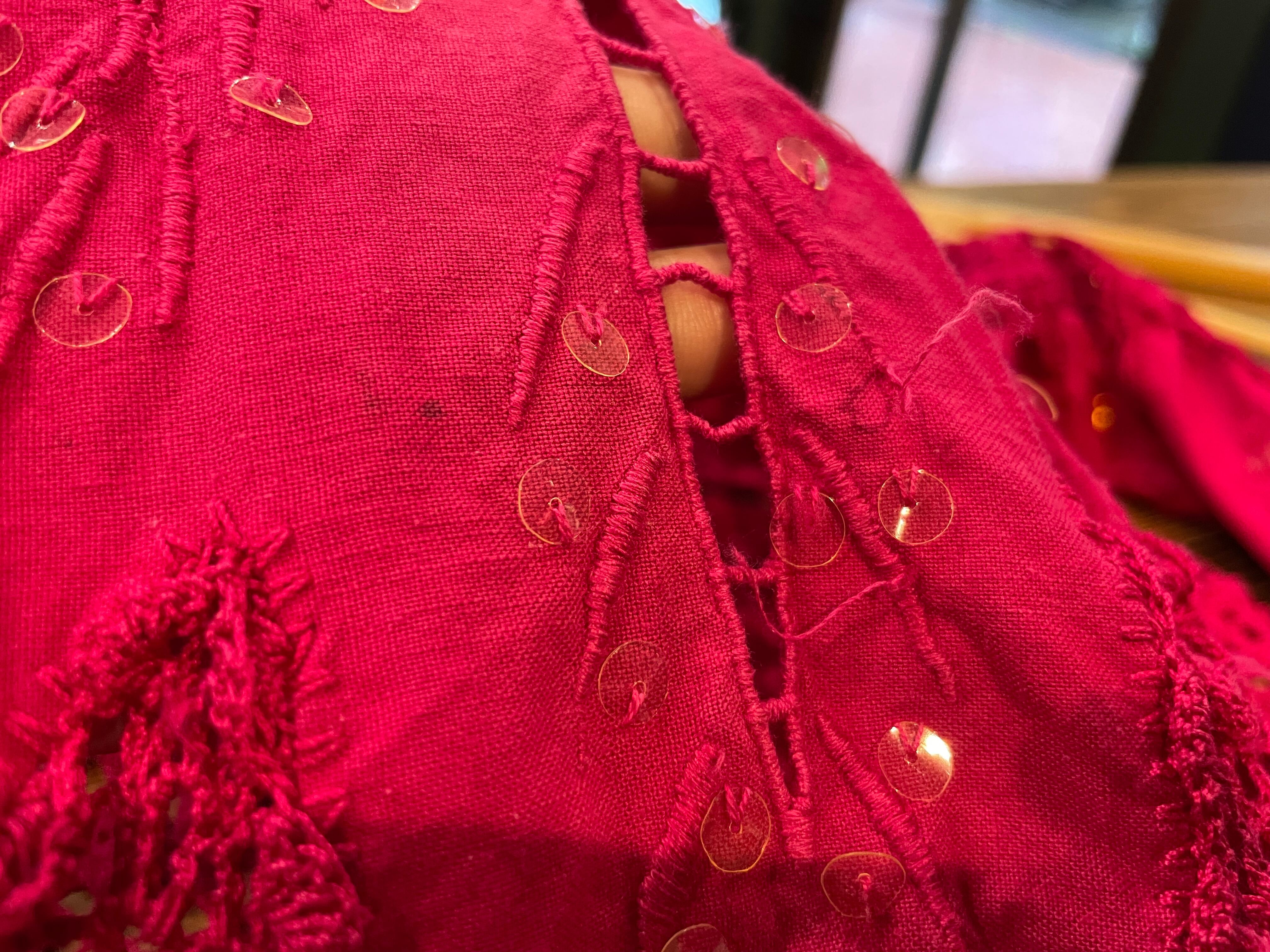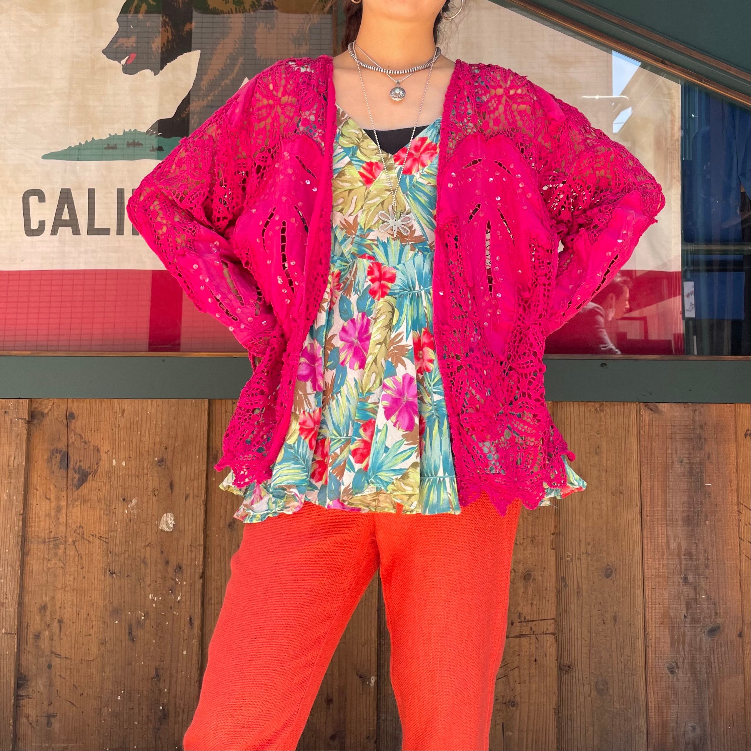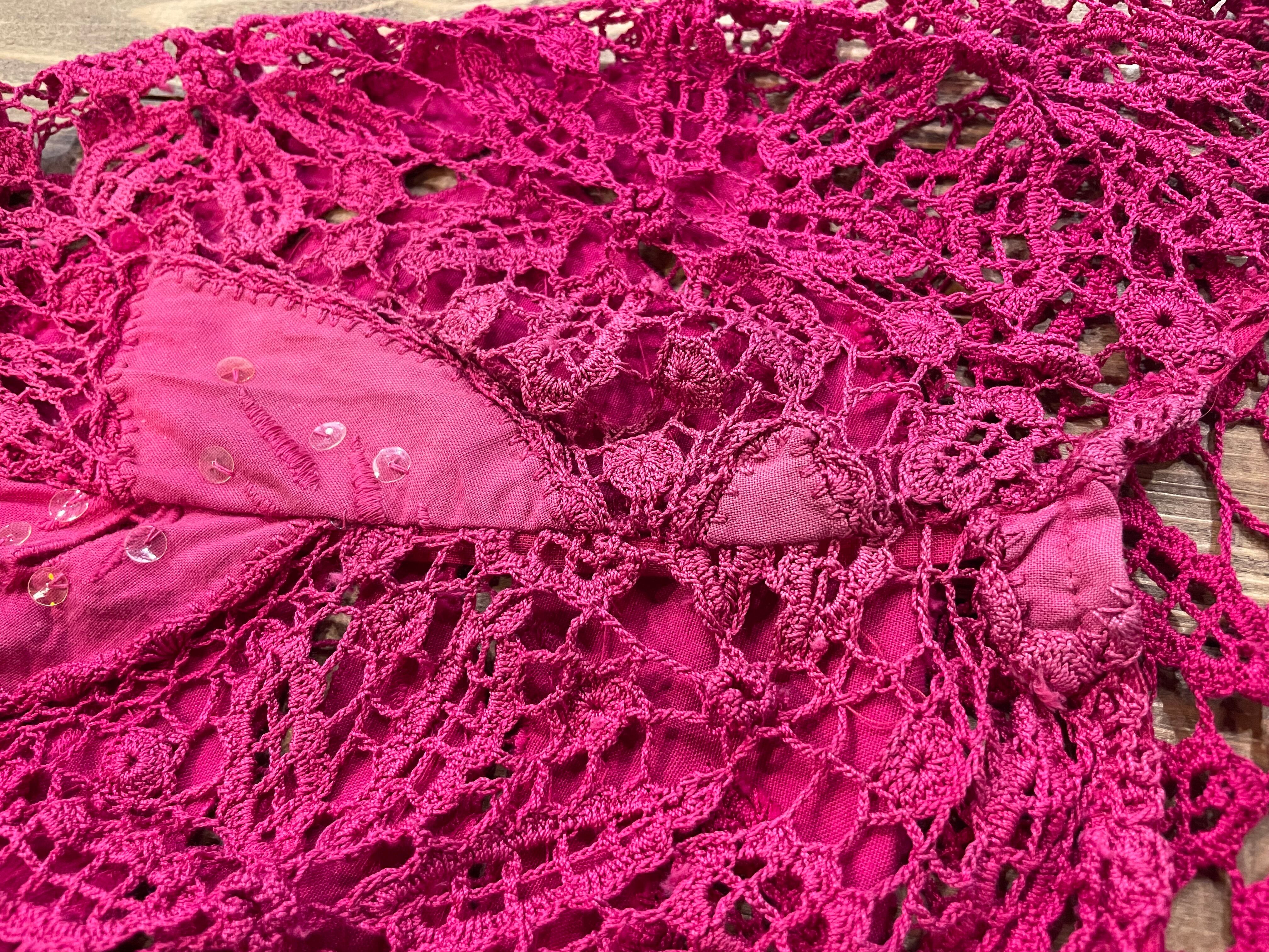 かぎ針編みに葉っぱのようなモチーフがついていたり、透明のスパンコールがきらっとかわいいカーディガンです。