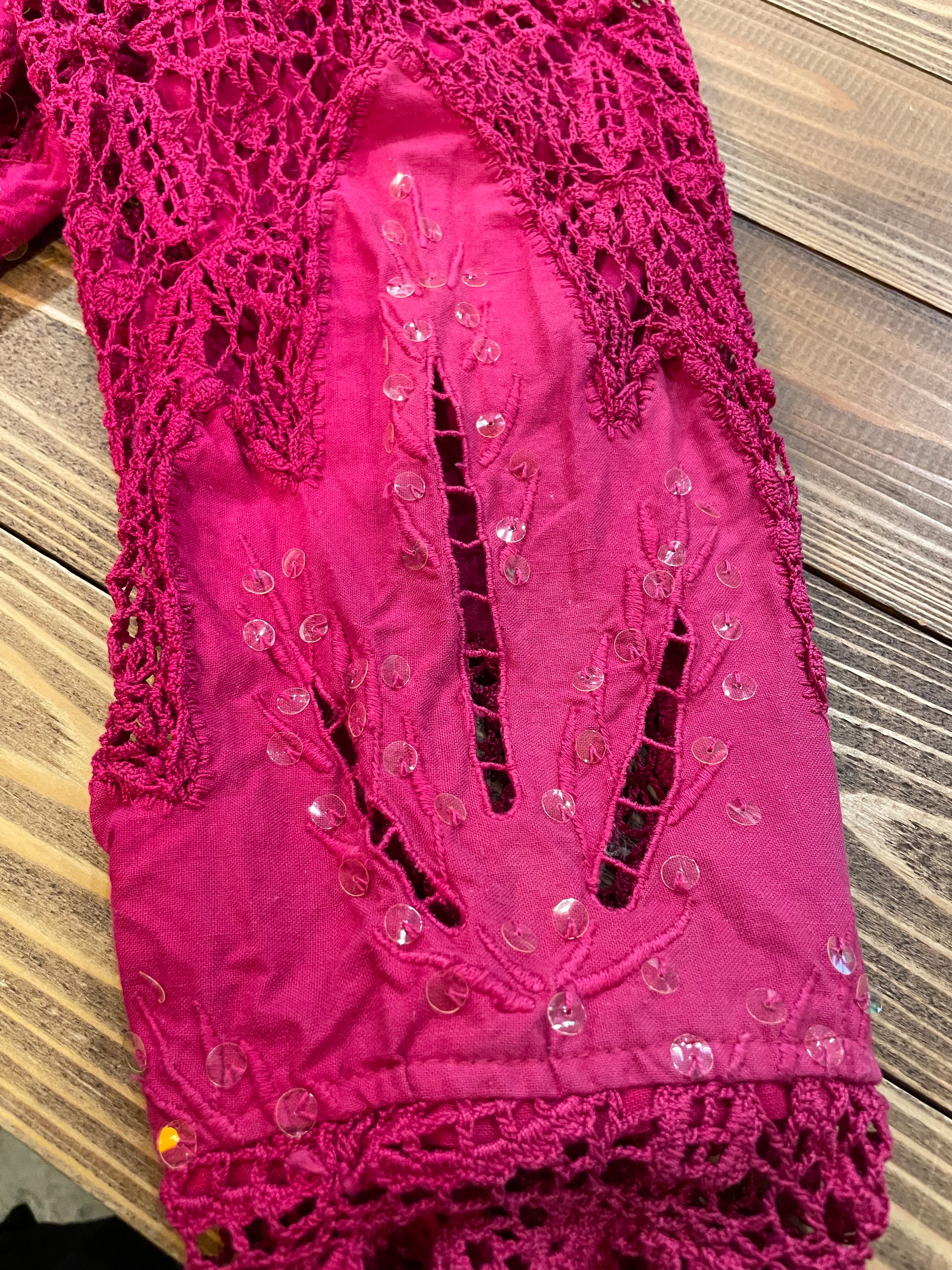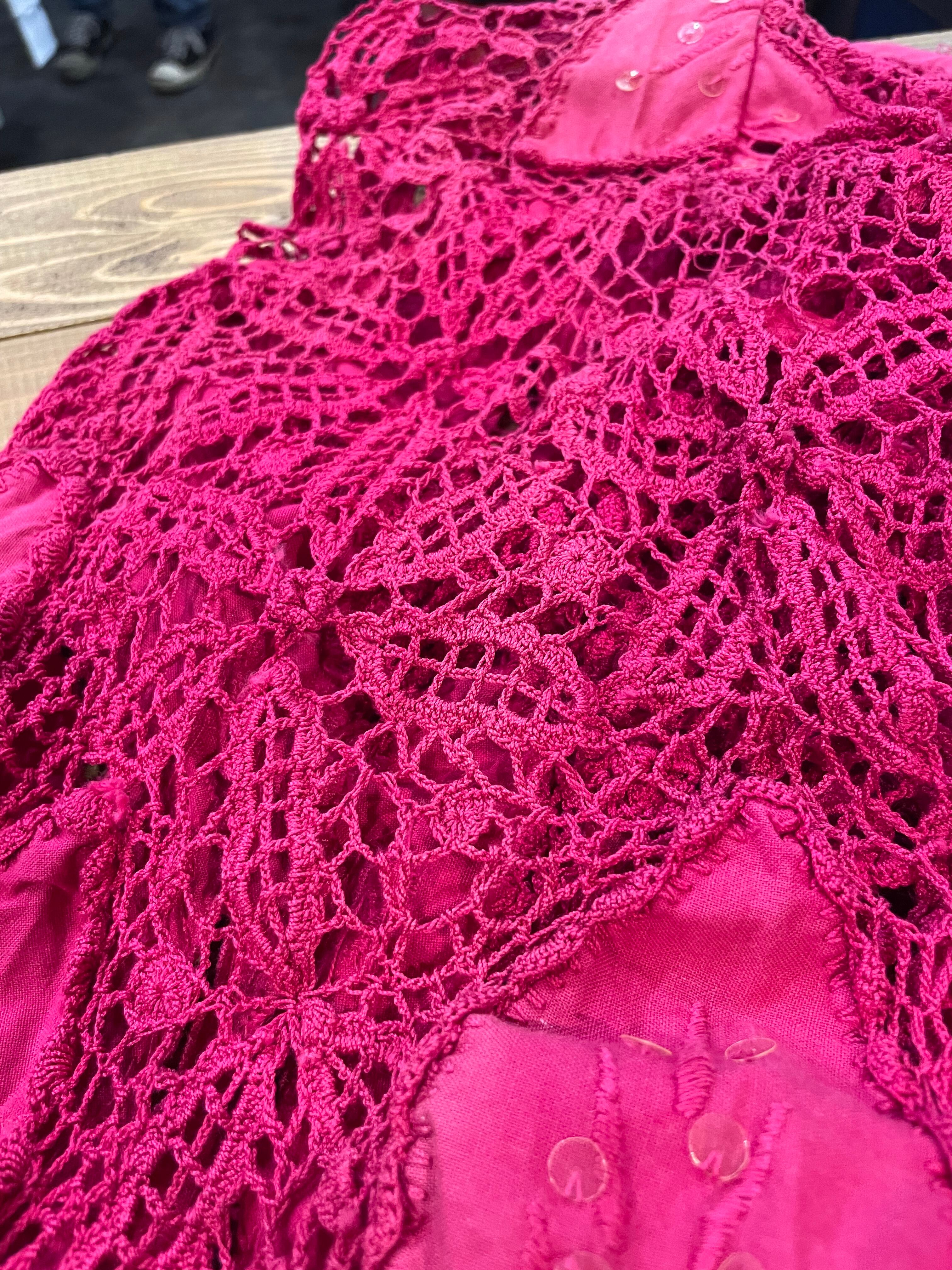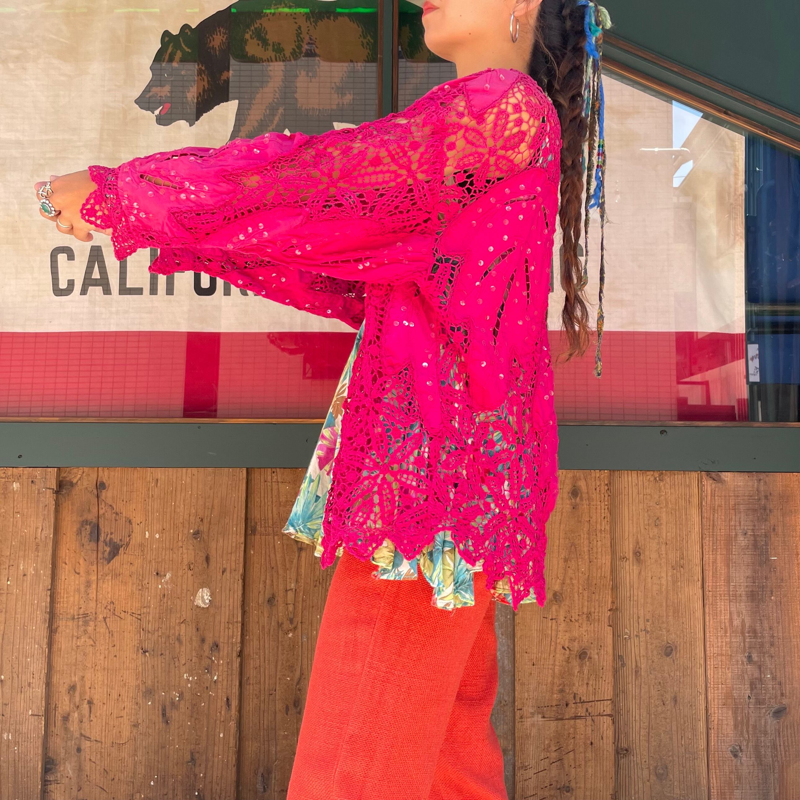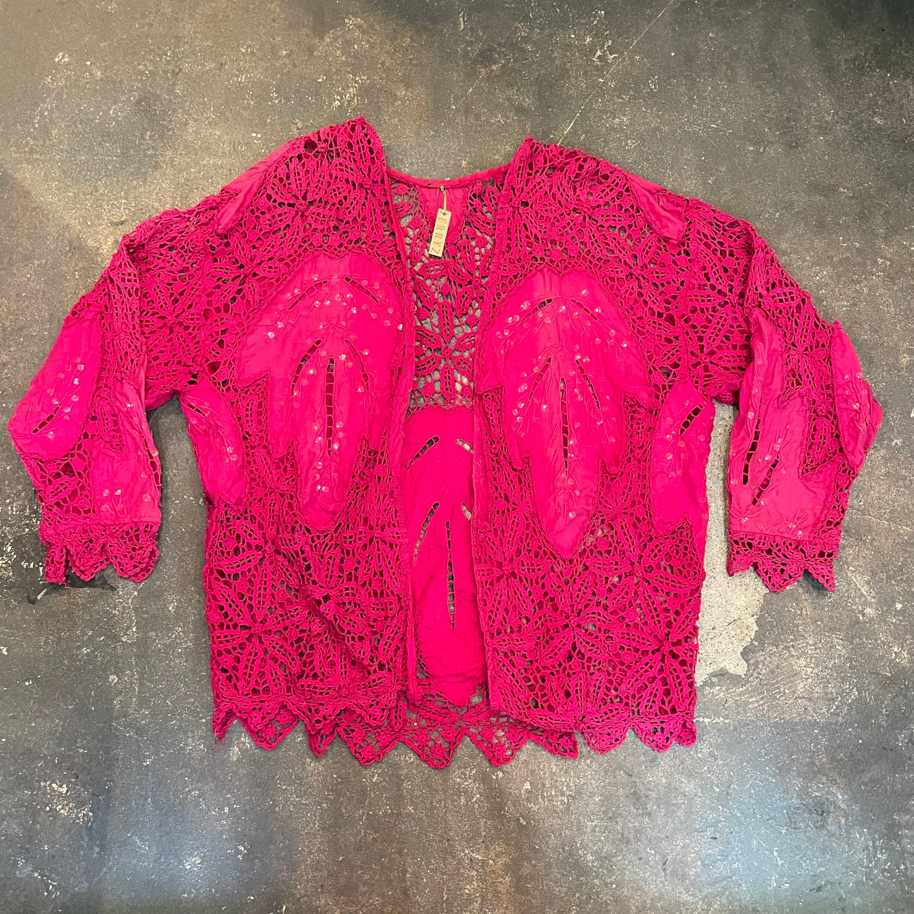 かぎ針編みに葉っぱのようなモチーフがついていたり、透明のスパンコールがきらっとかわいいカーディガンです。