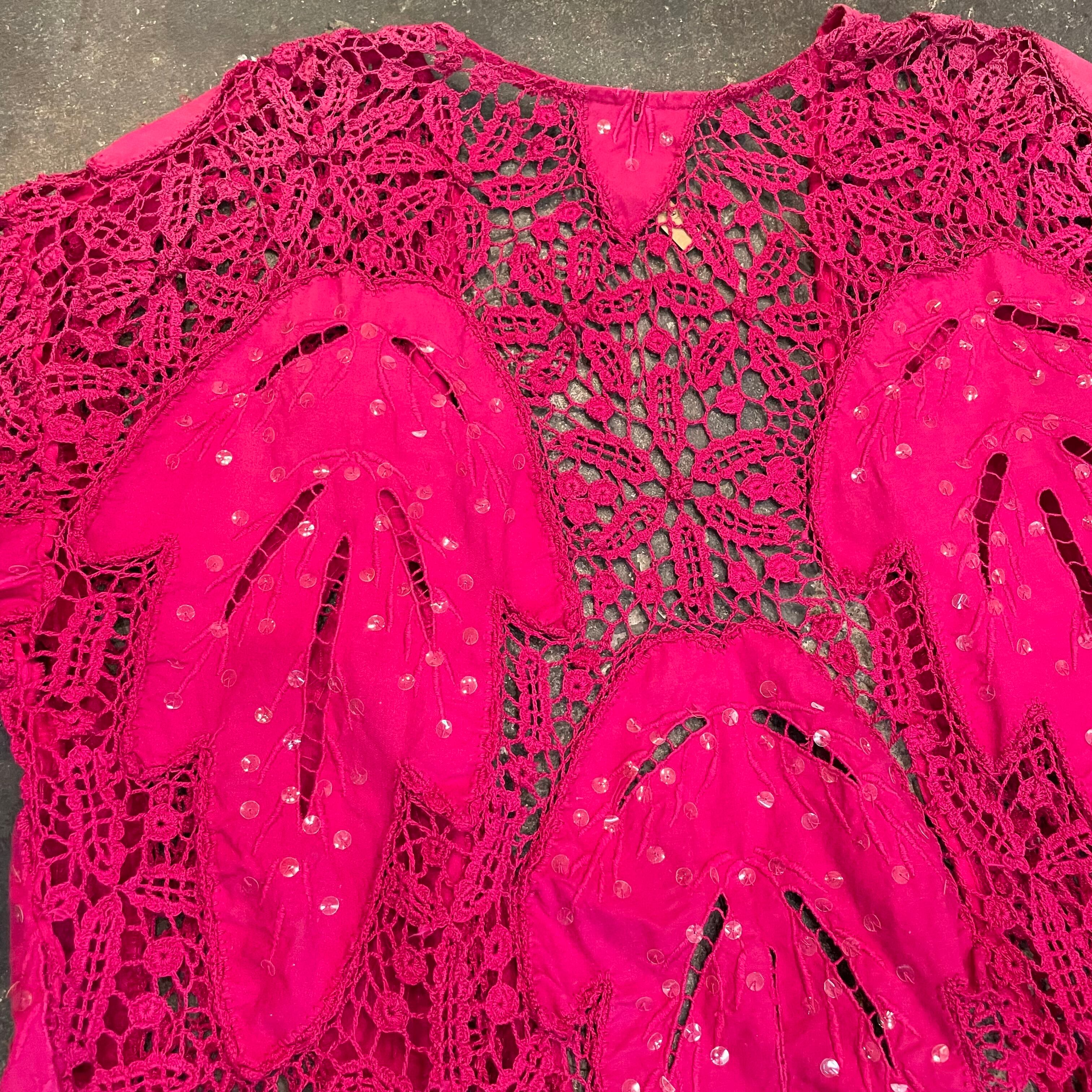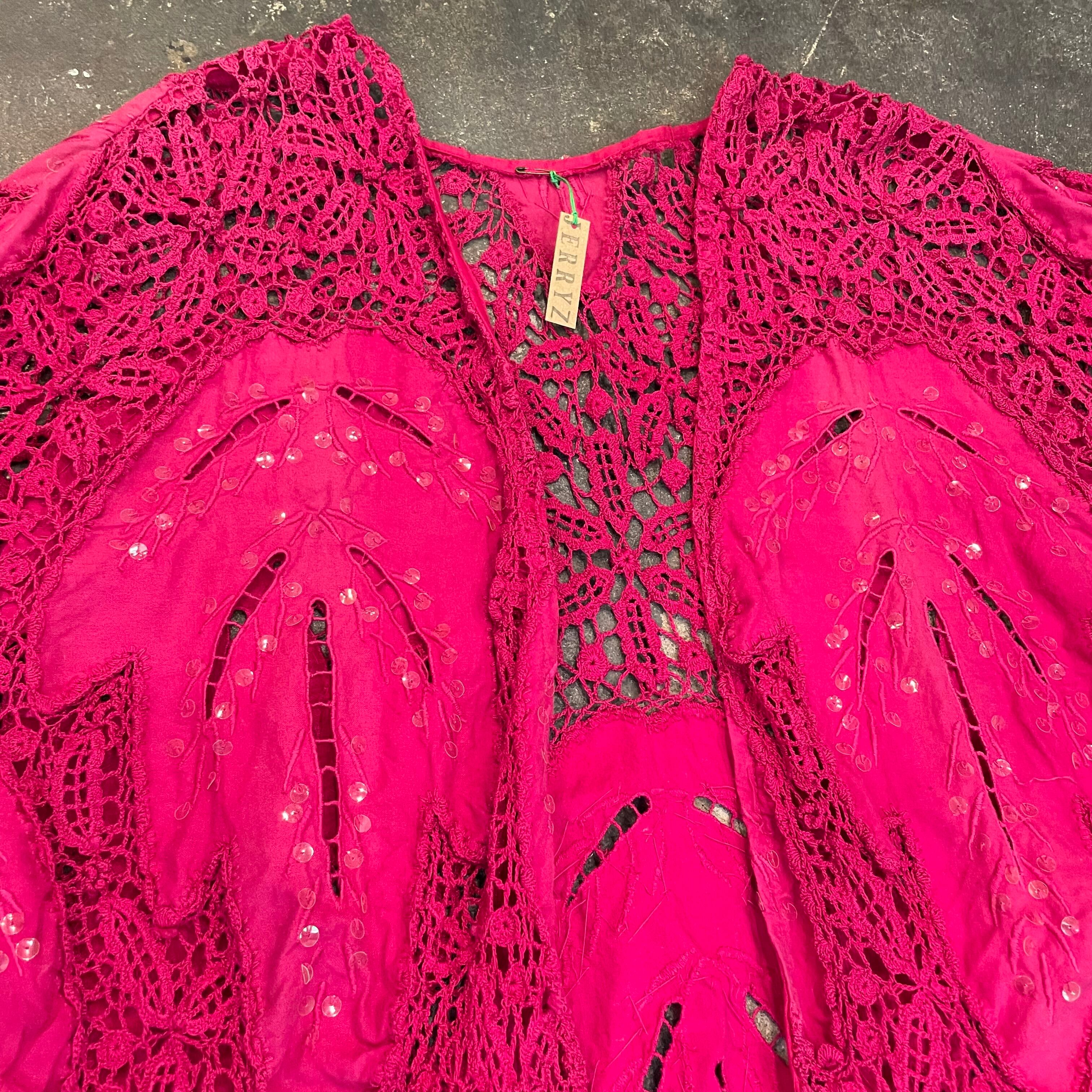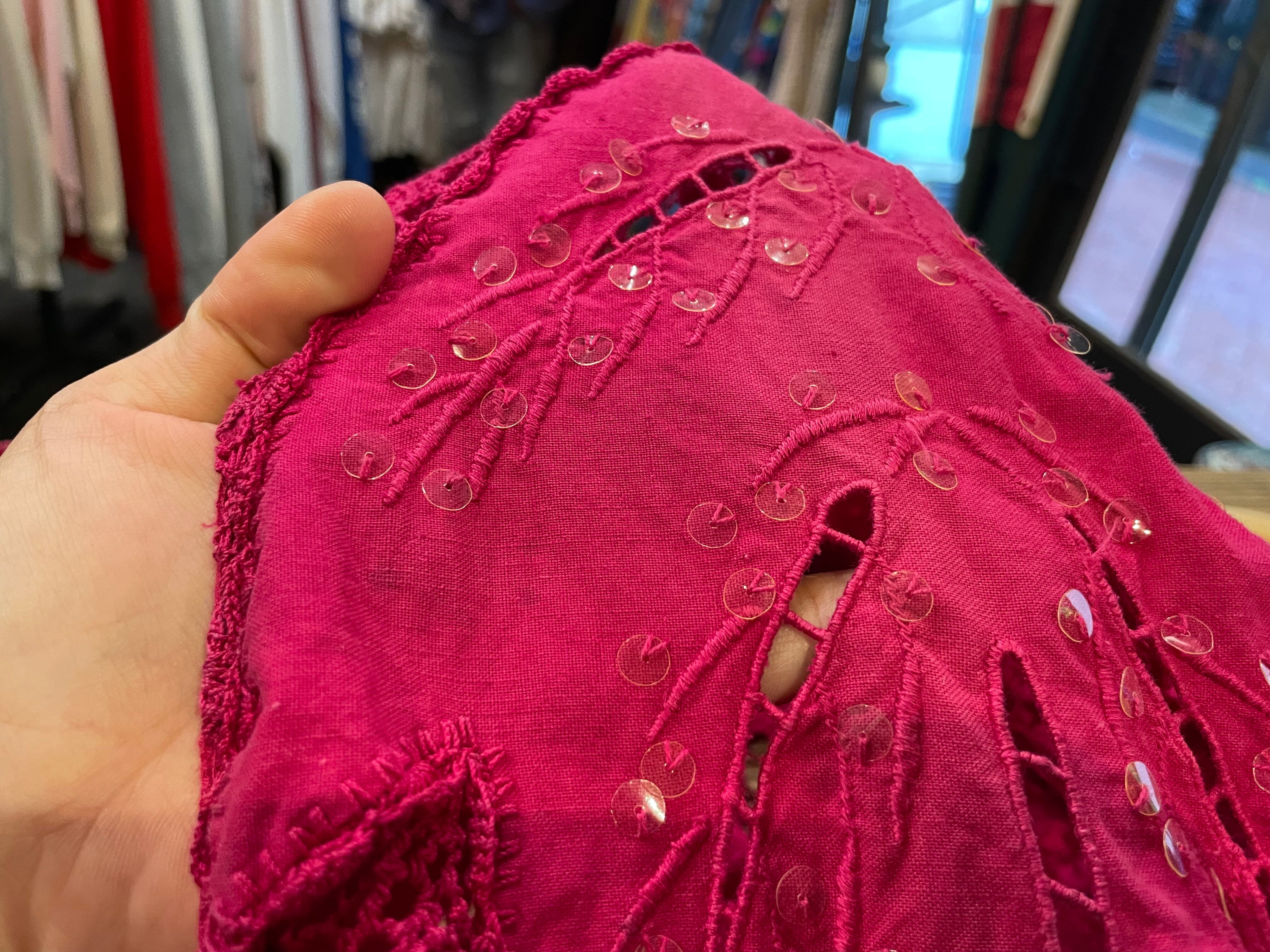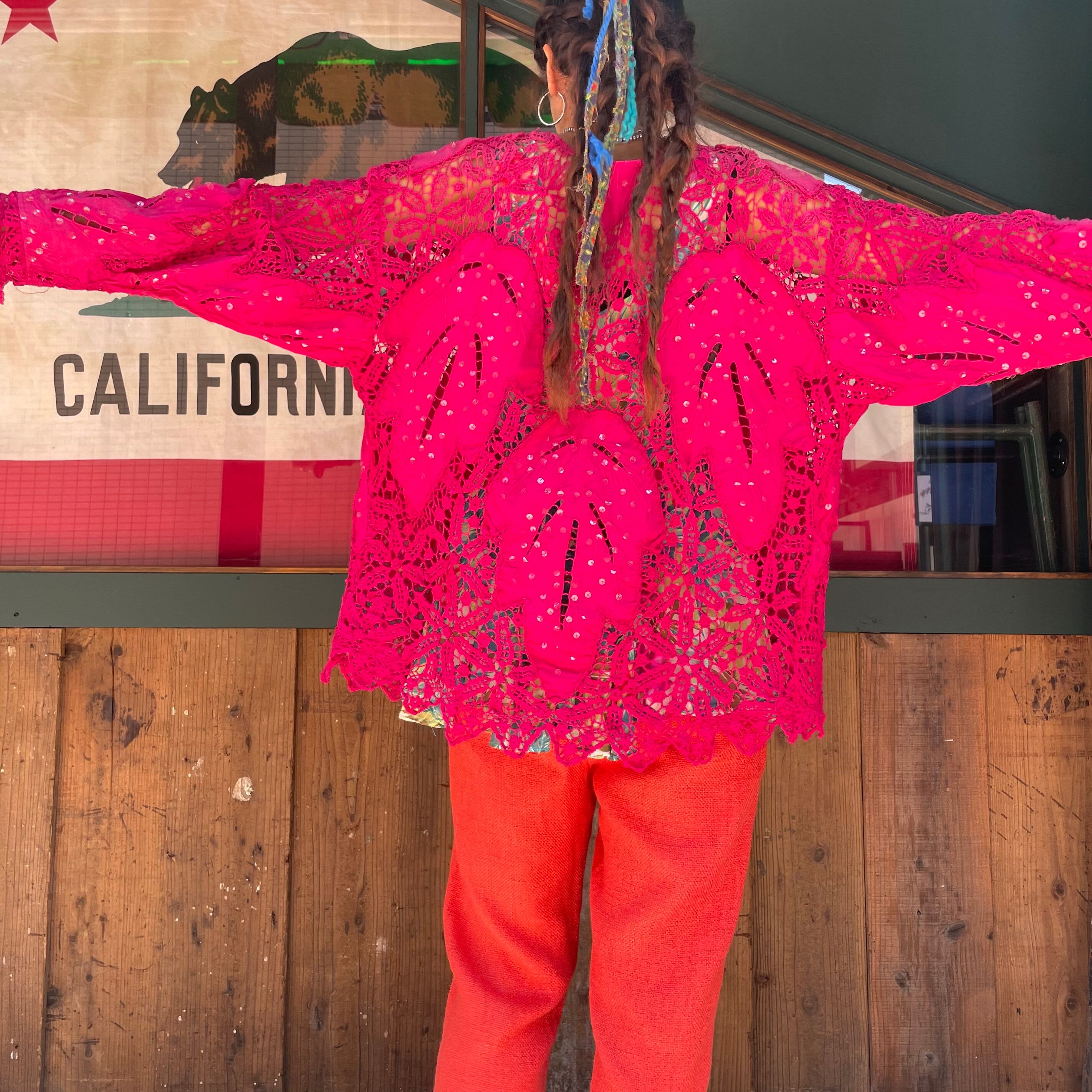 かぎ針編みに葉っぱのようなモチーフがついていたり、透明のスパンコールがきらっとかわいいカーディガンです。