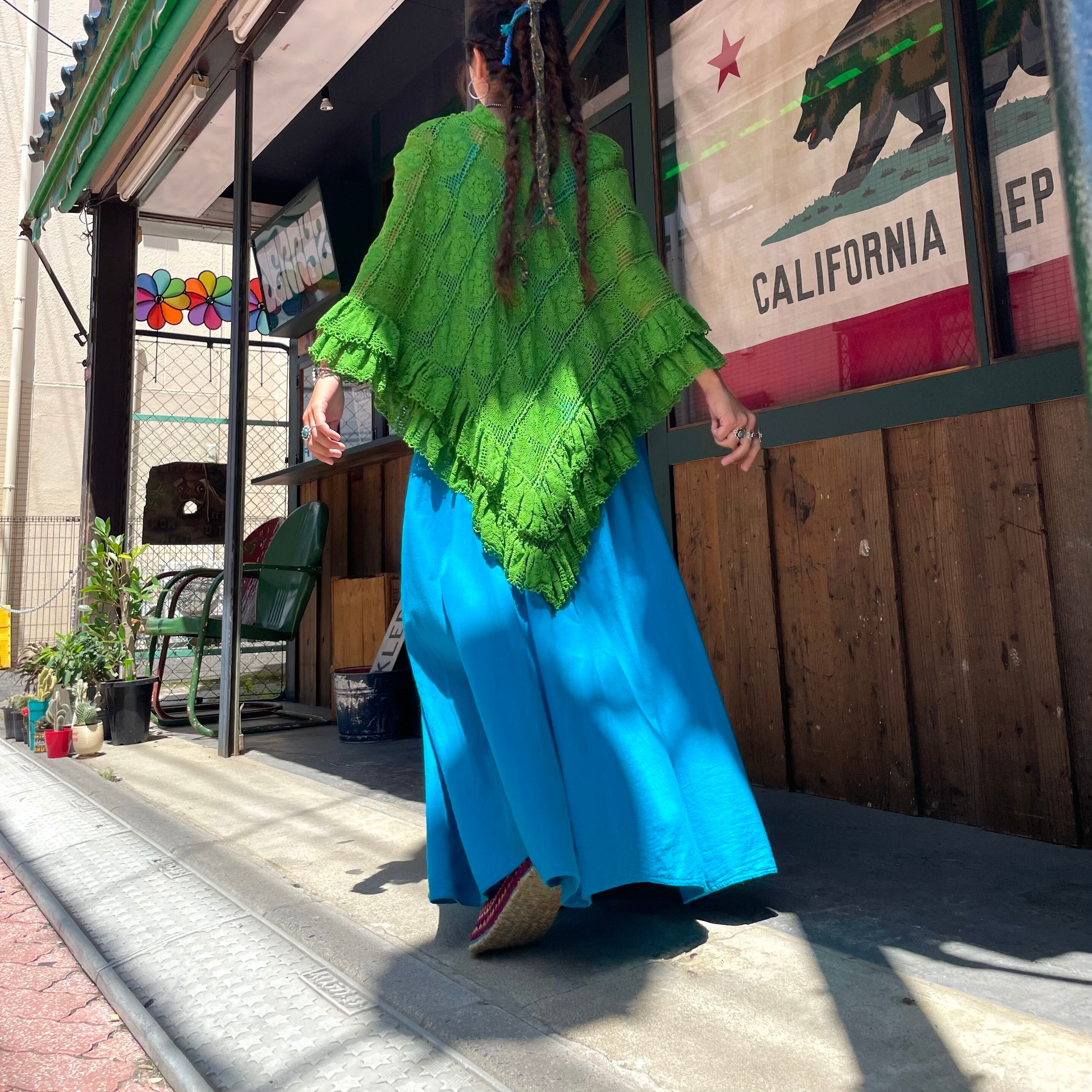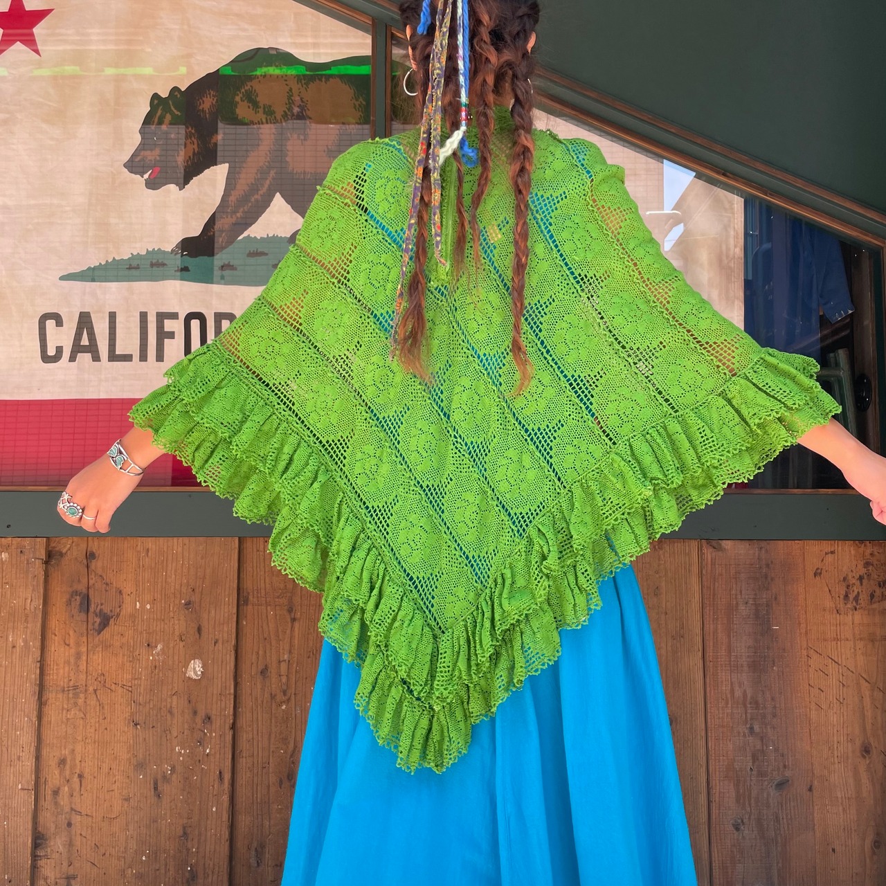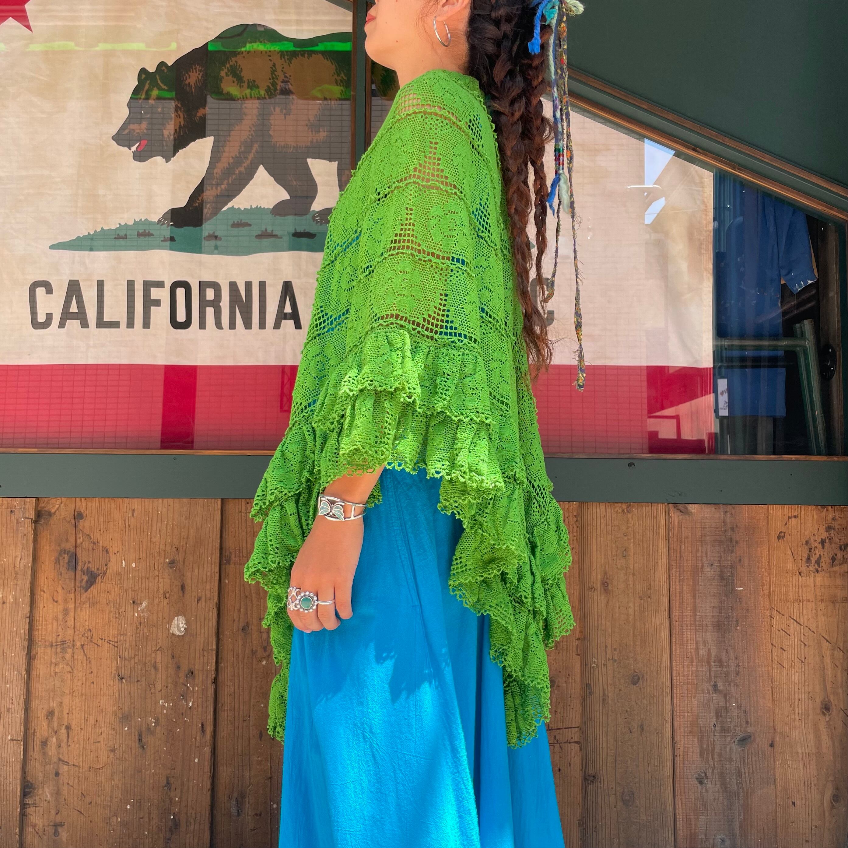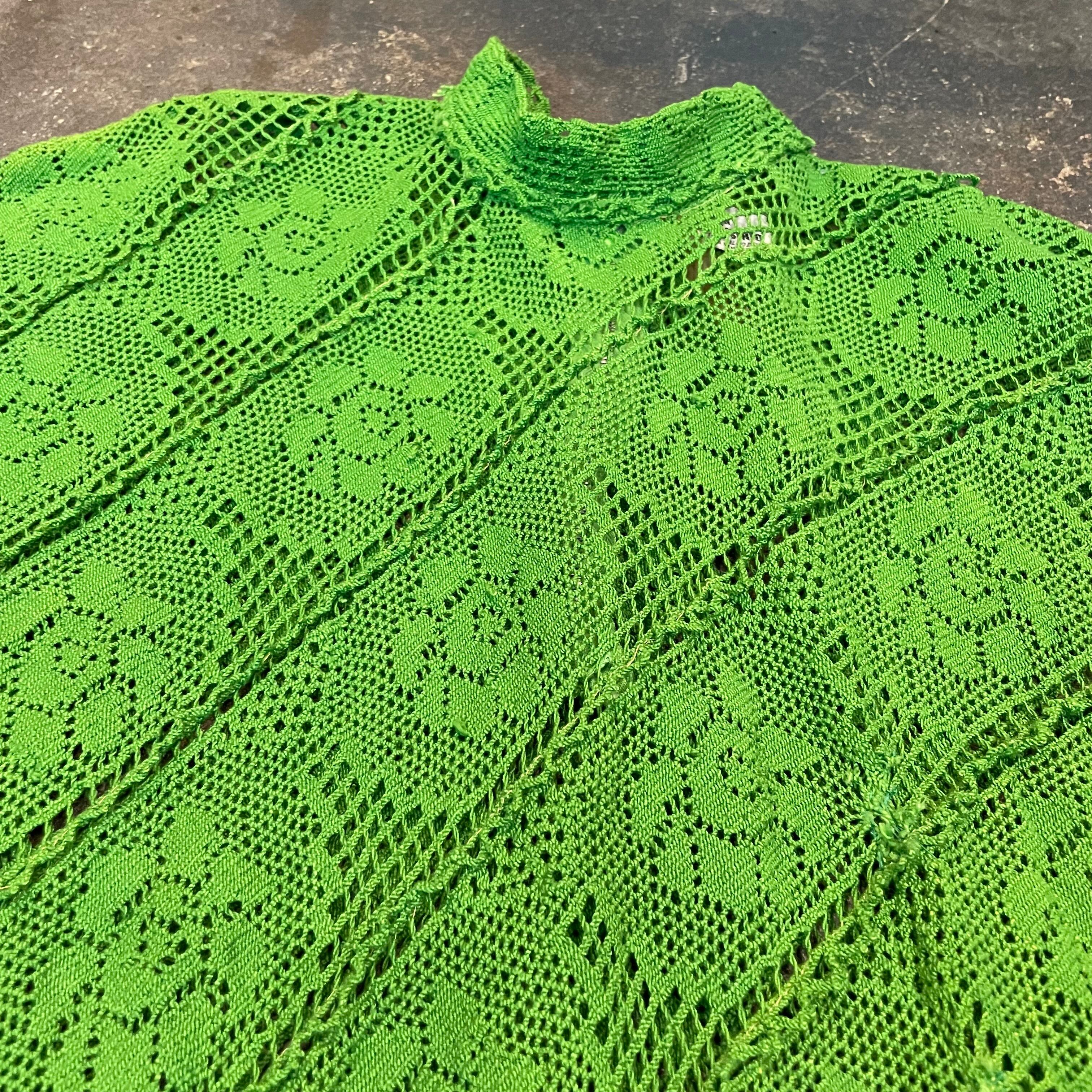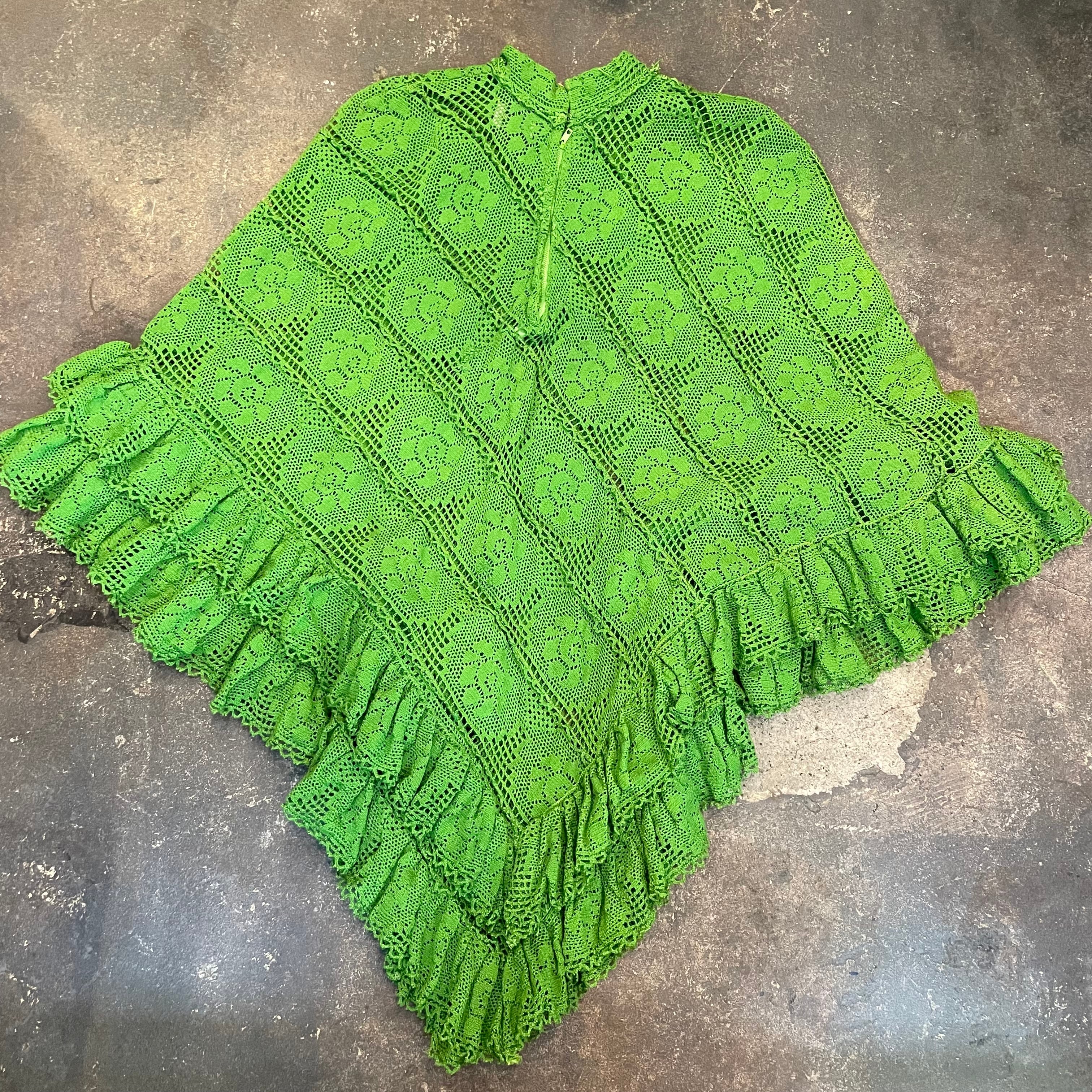 鮮やかなキミドリ色が目を惹くレースのポンチョです。
