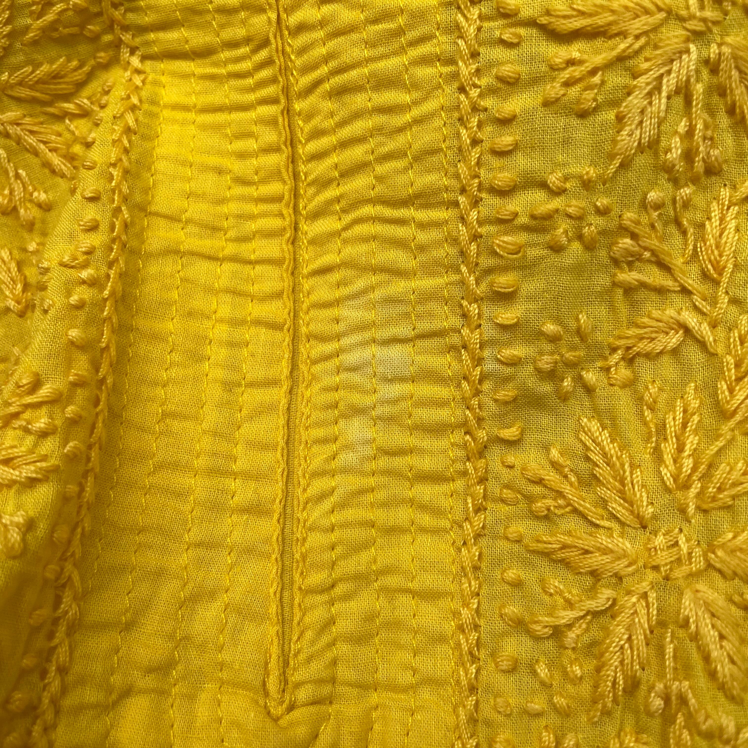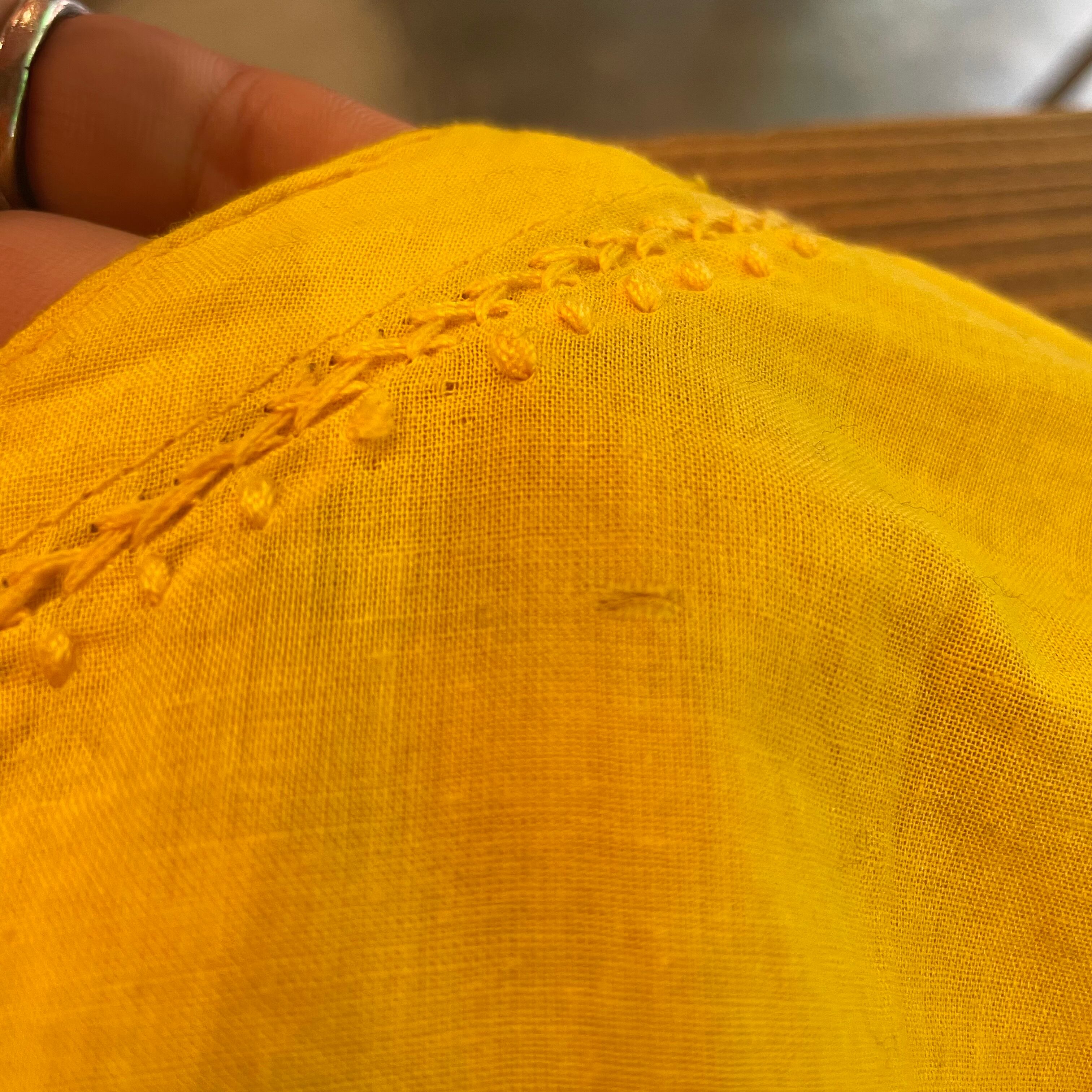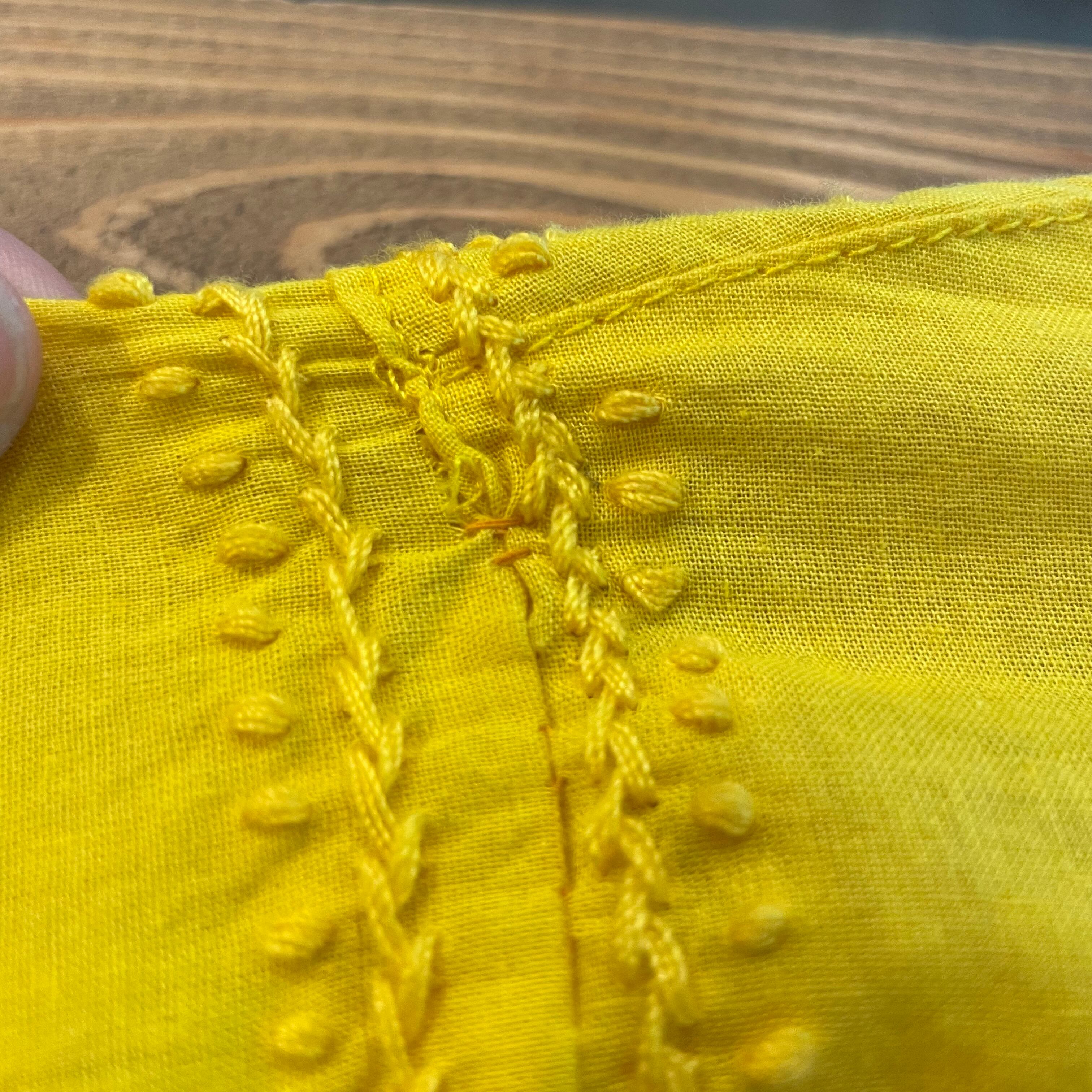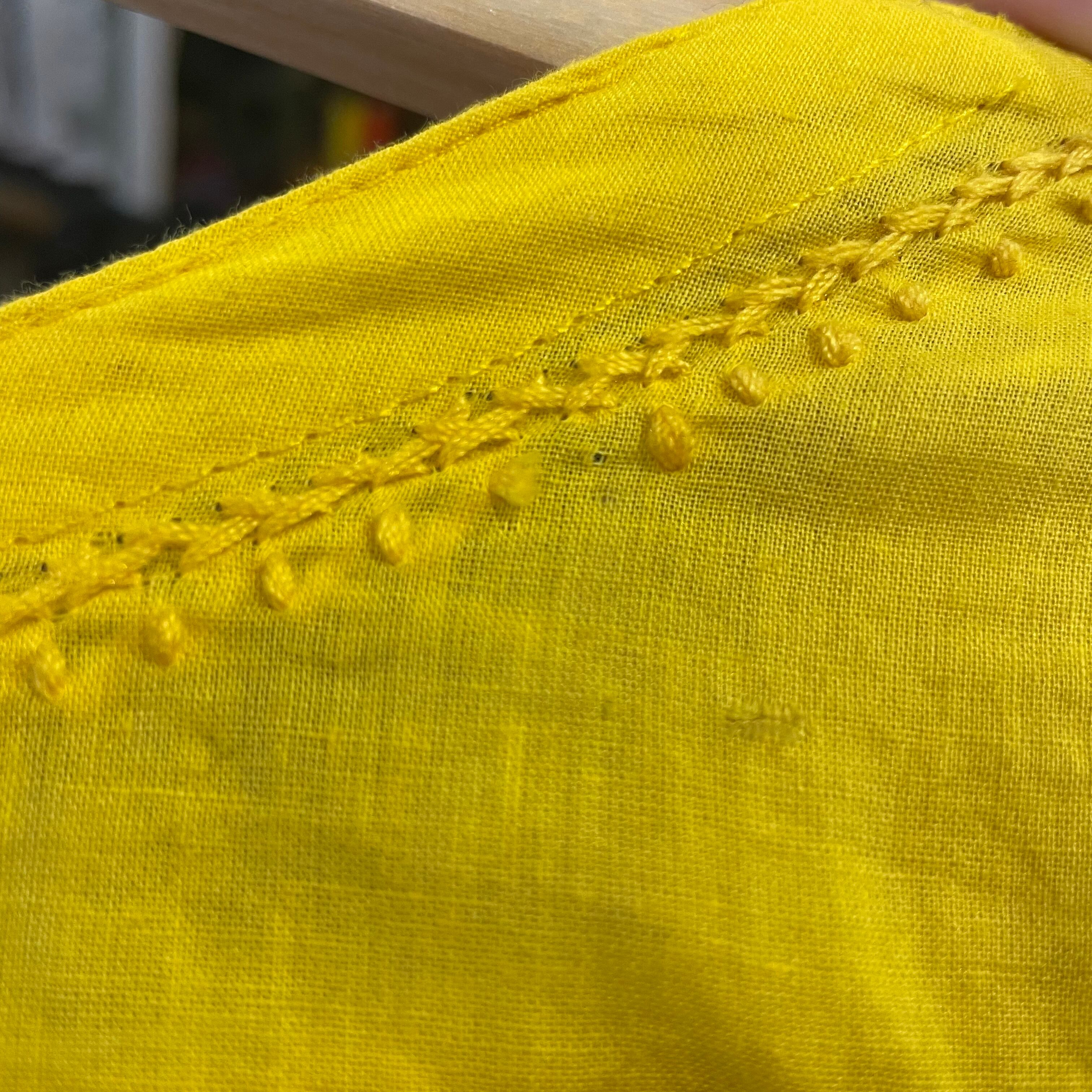 元気の出る鮮やかな黄色がかわいいワンピースです。同じ色で施された手刺繍がさりげなく存在感があってとても素敵です。
