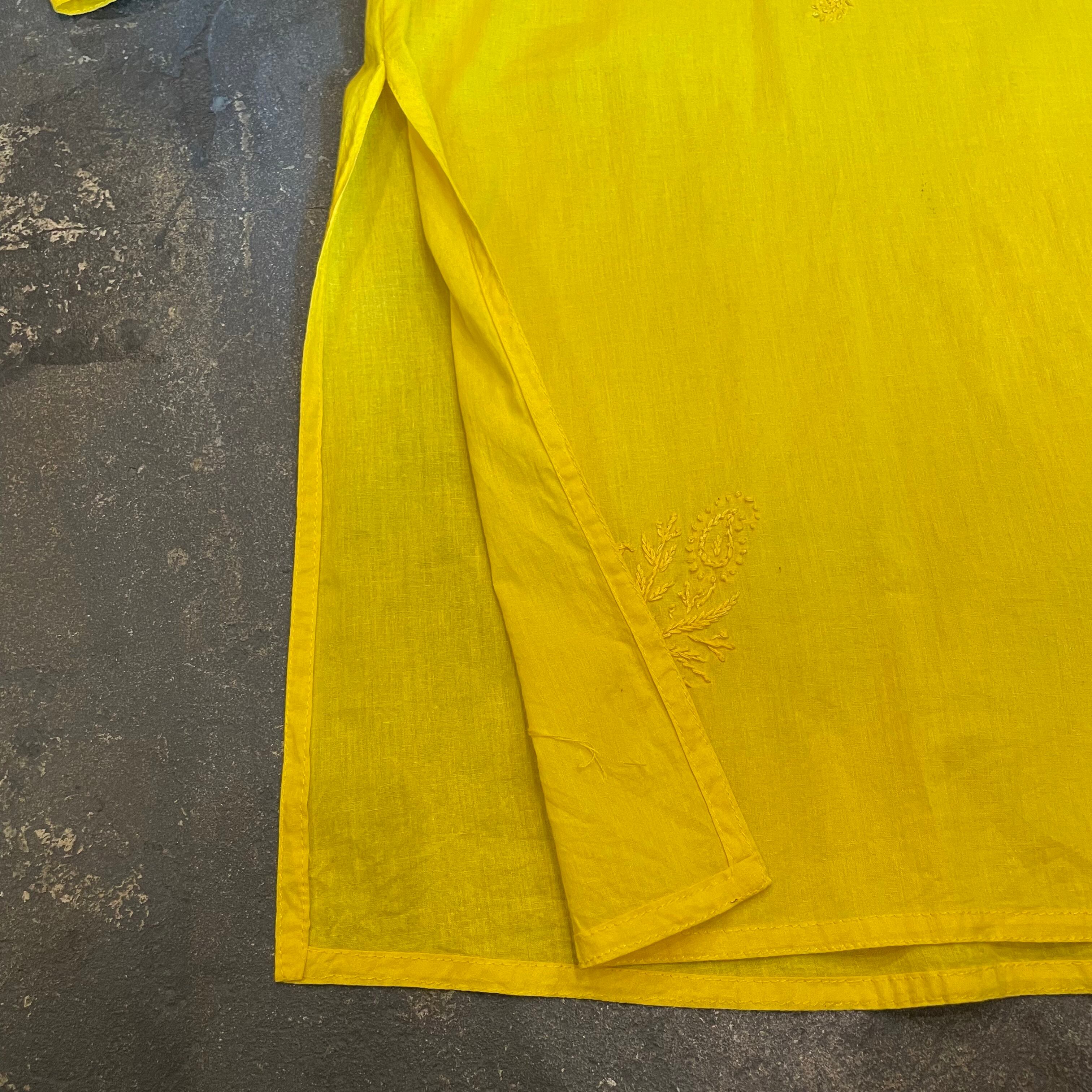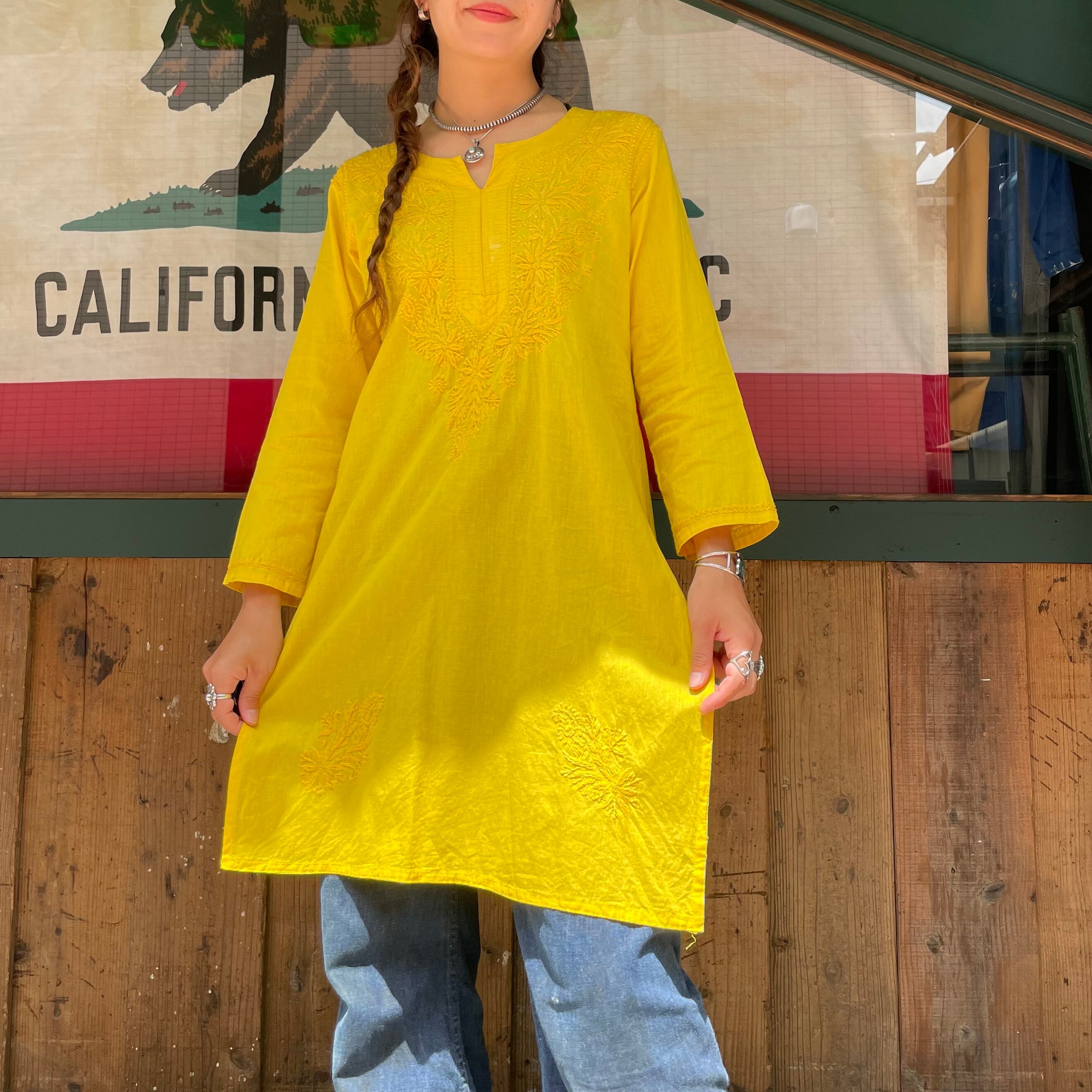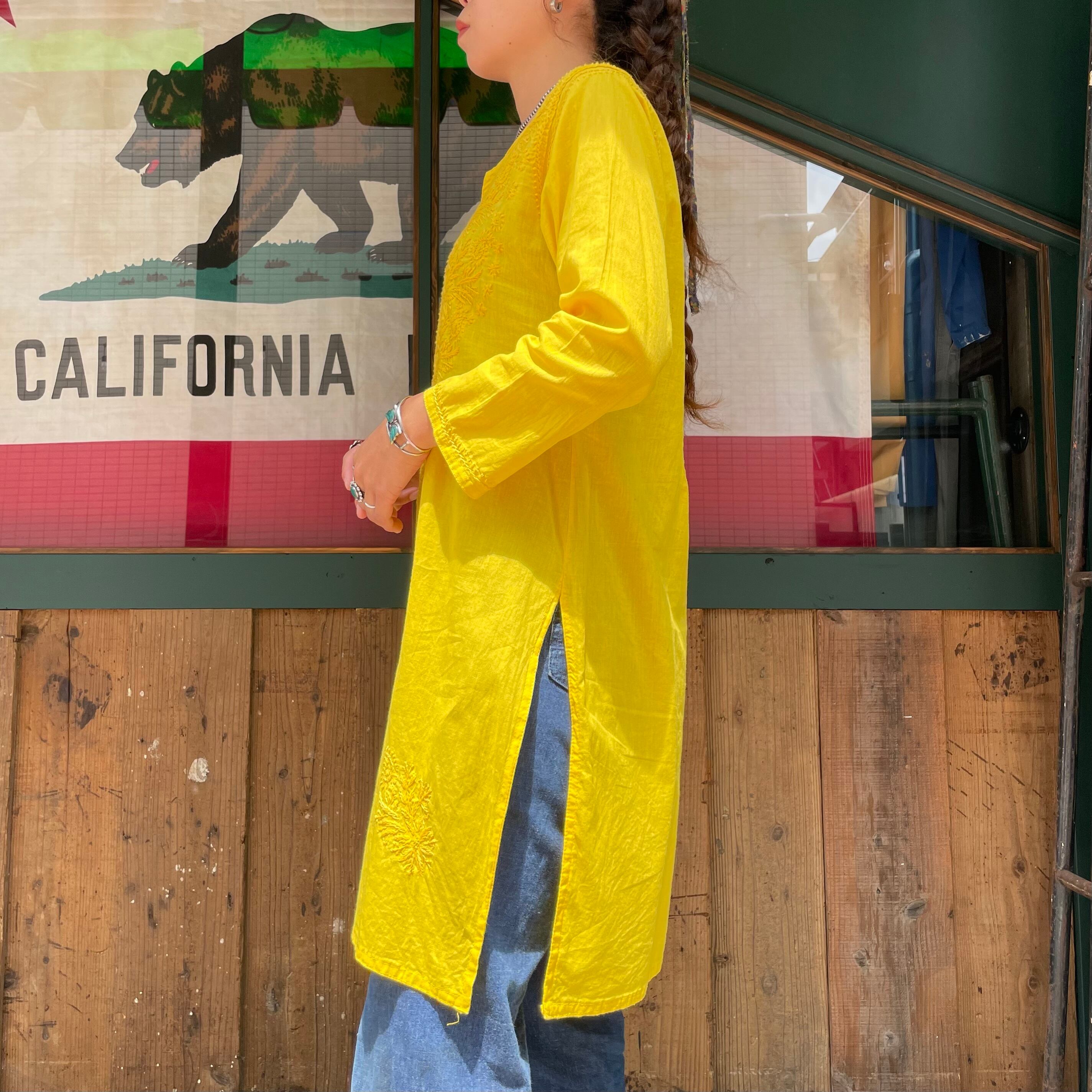 元気の出る鮮やかな黄色がかわいいワンピースです。同じ色で施された手刺繍がさりげなく存在感があってとても素敵です。