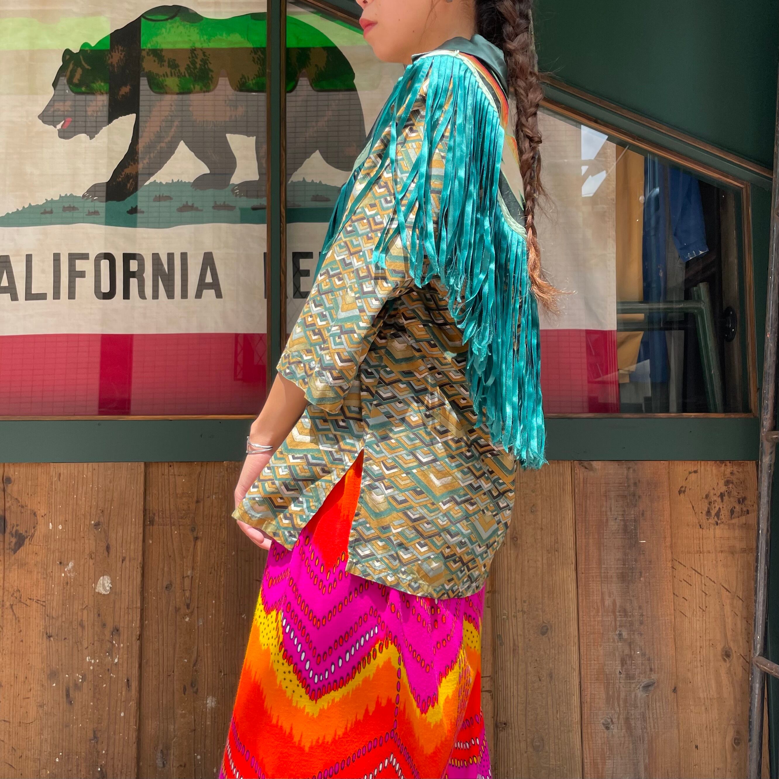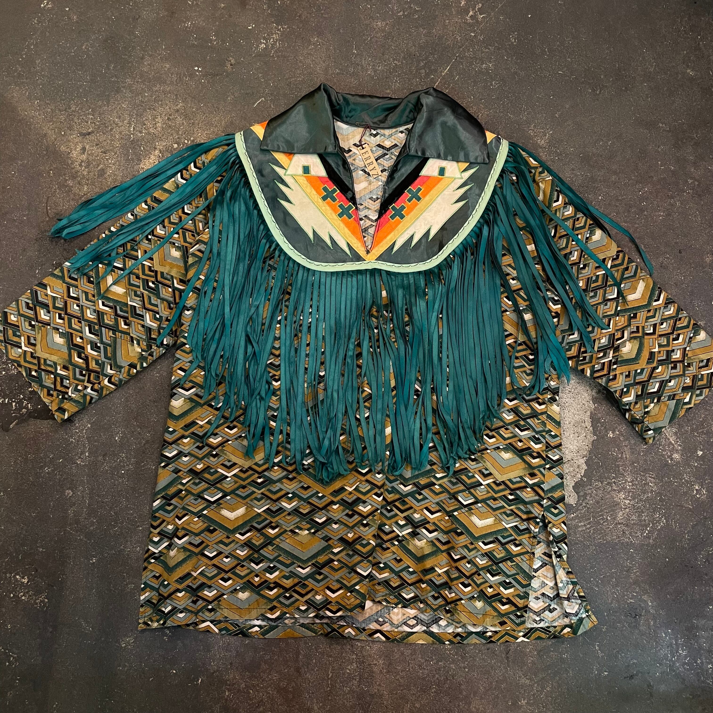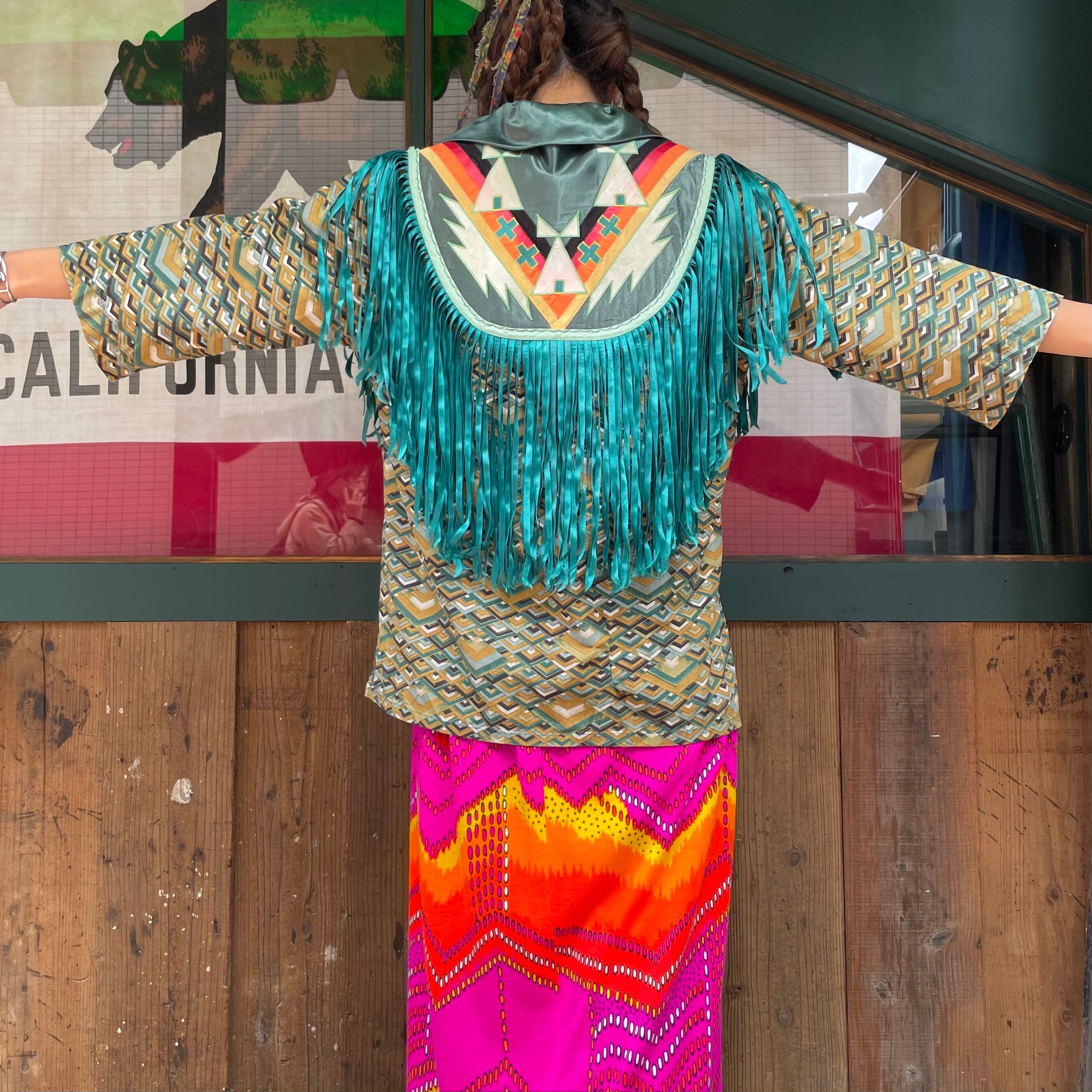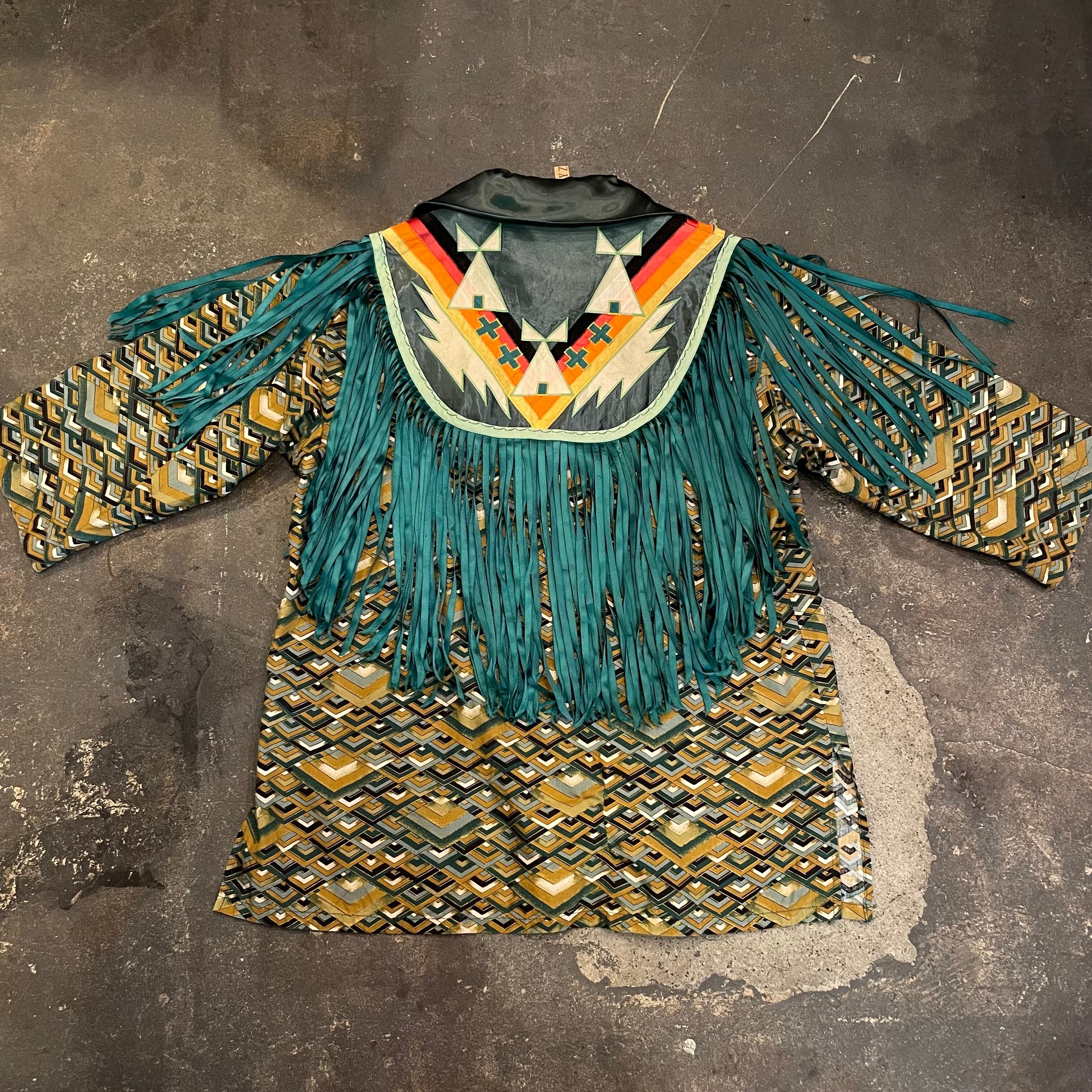 緑のフリンジもヨーク部分のネイティブっぽい雰囲気のパッチワークもかっこいい、オーラのある一枚です。