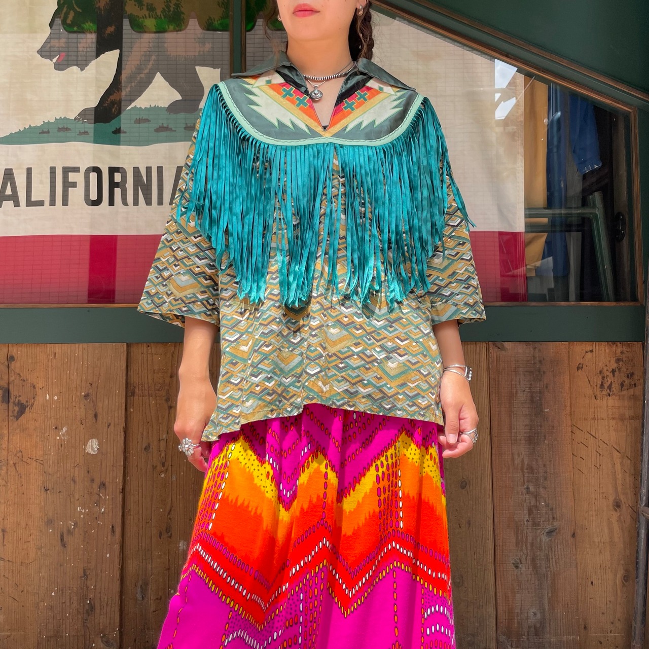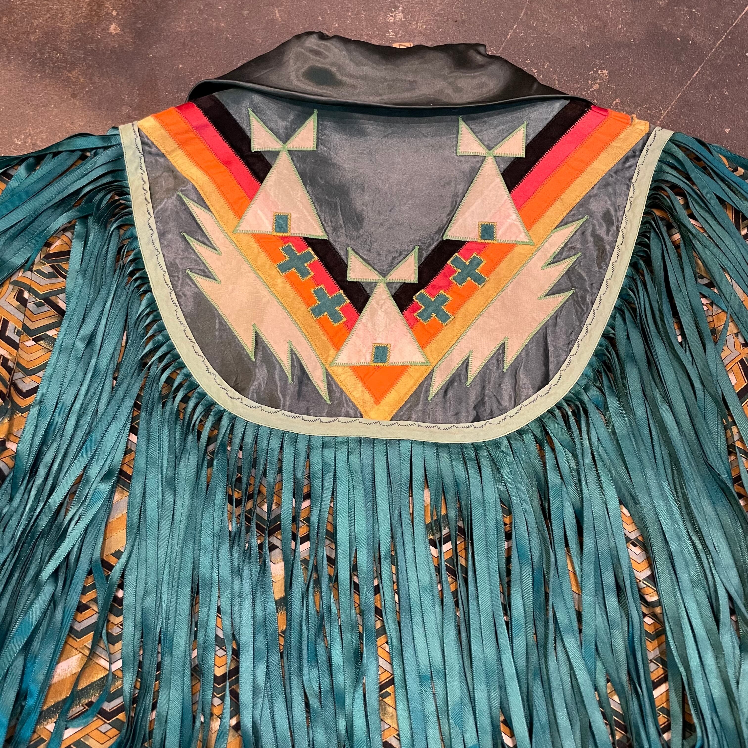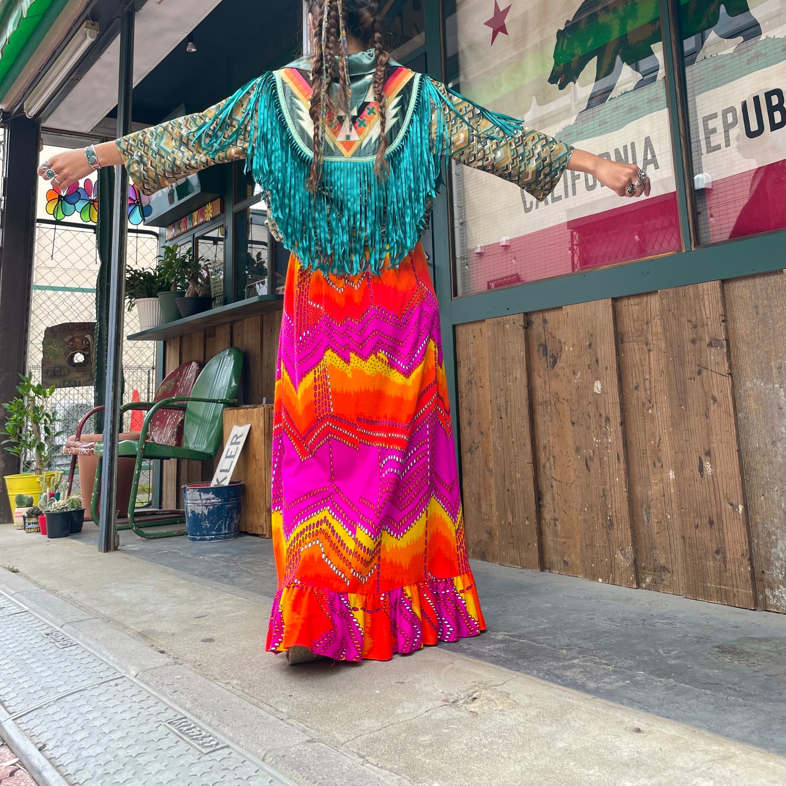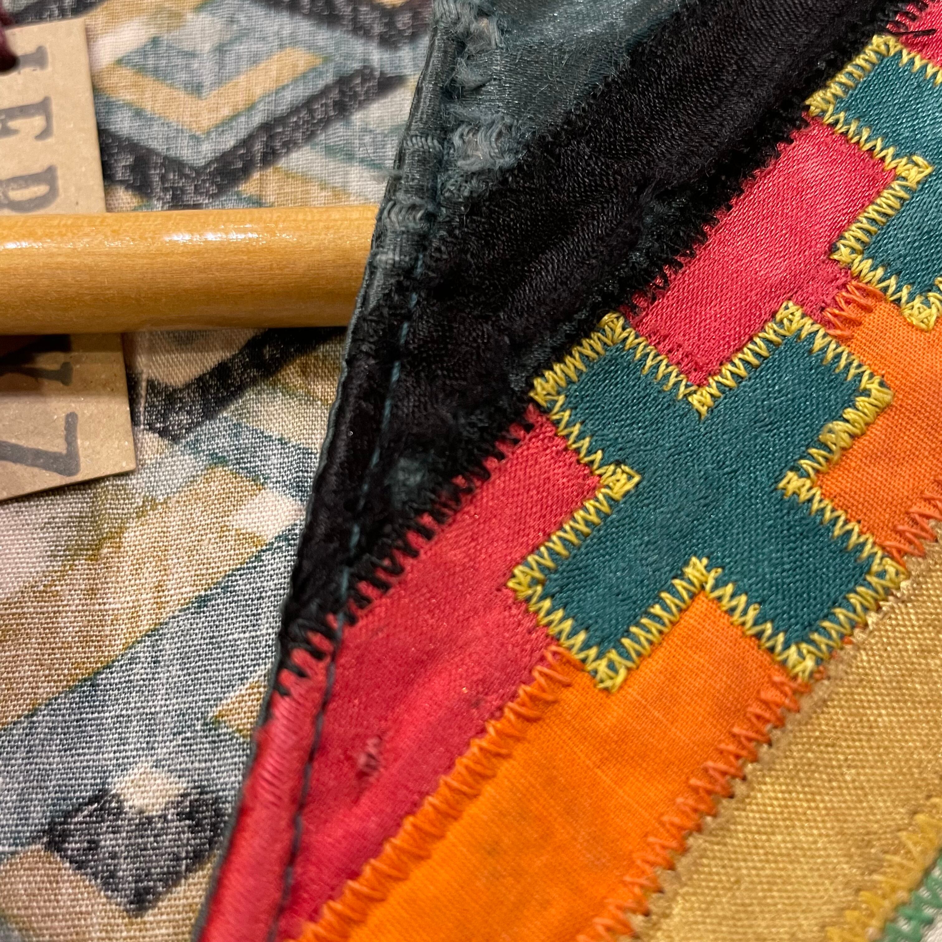緑のフリンジもヨーク部分のネイティブっぽい雰囲気のパッチワークもかっこいい、オーラのある一枚です。