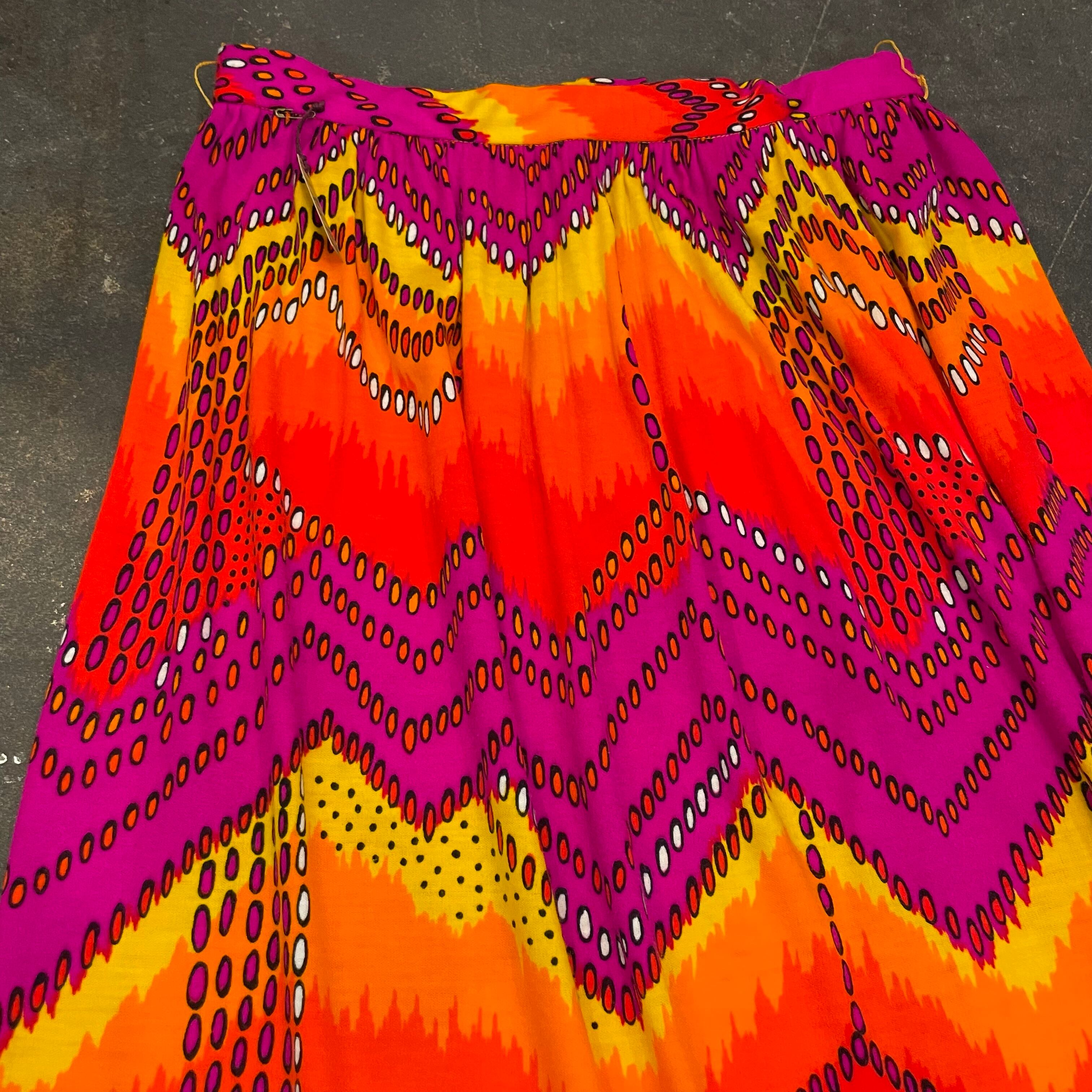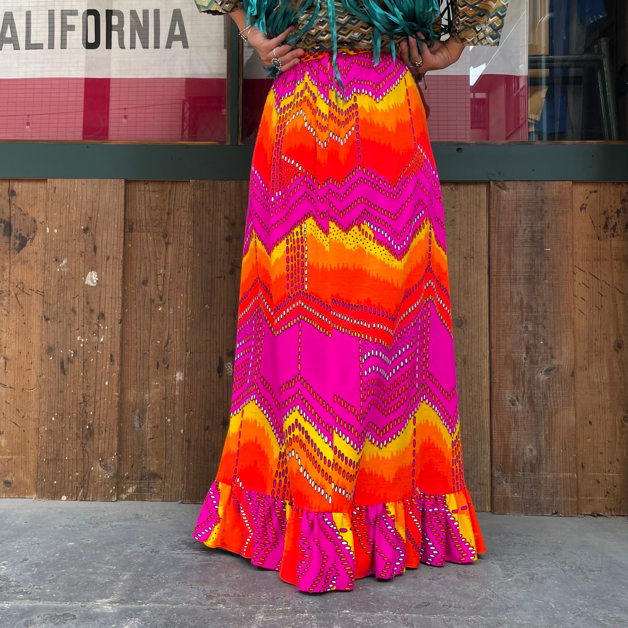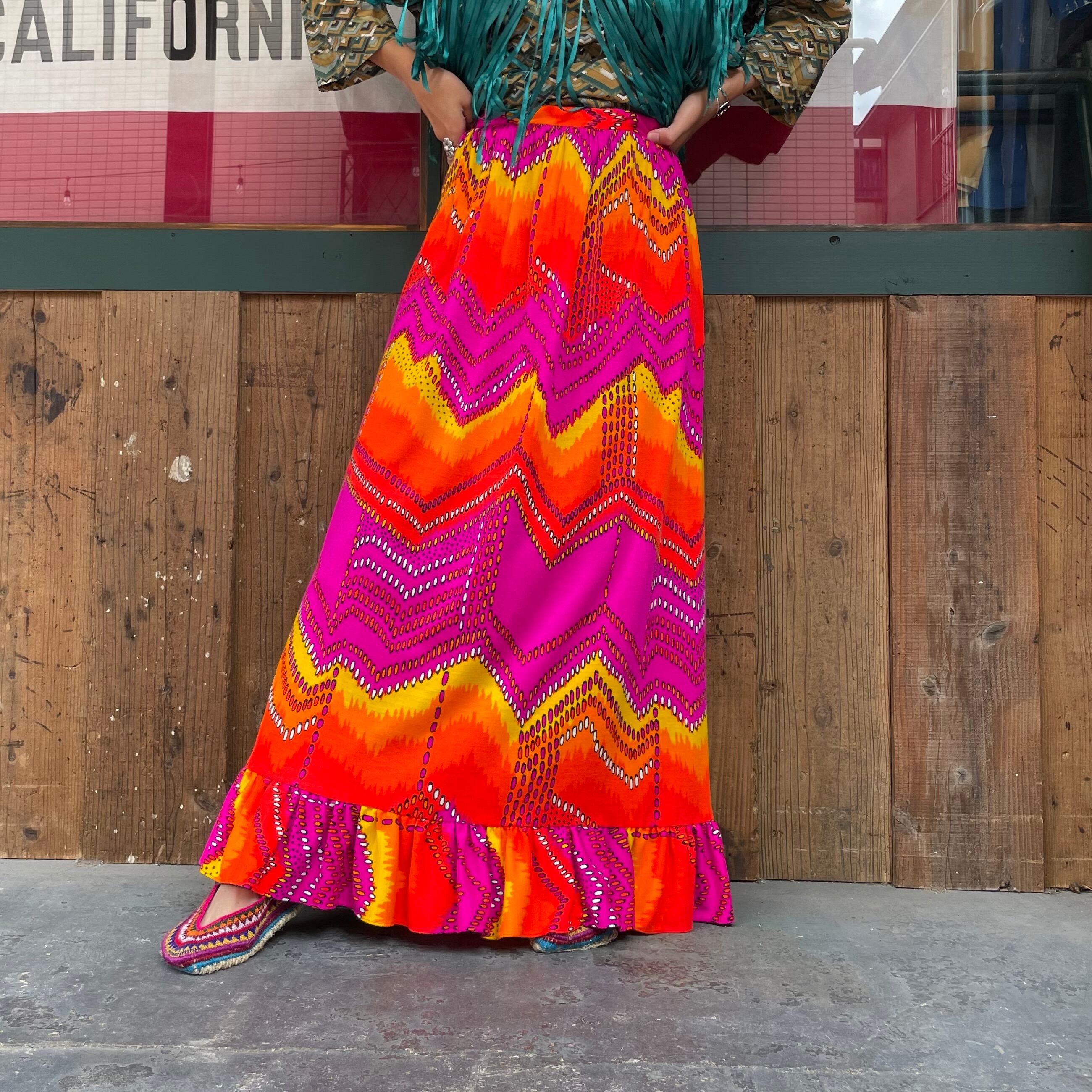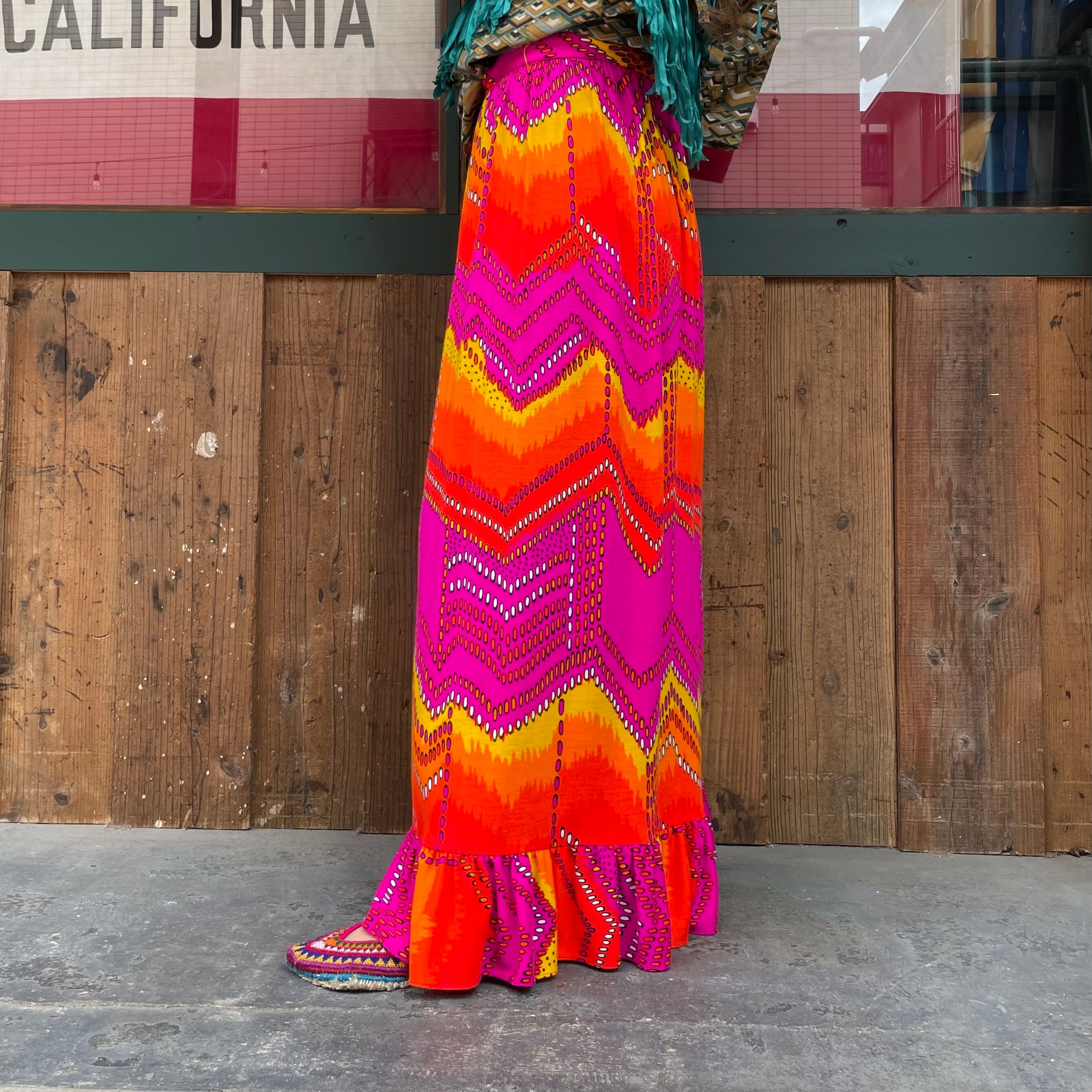 黄色からオレンジ、濃いピンクのグラデーションと幾何学模様がクレイジーなバランス感でとてもかわいいスカートです。