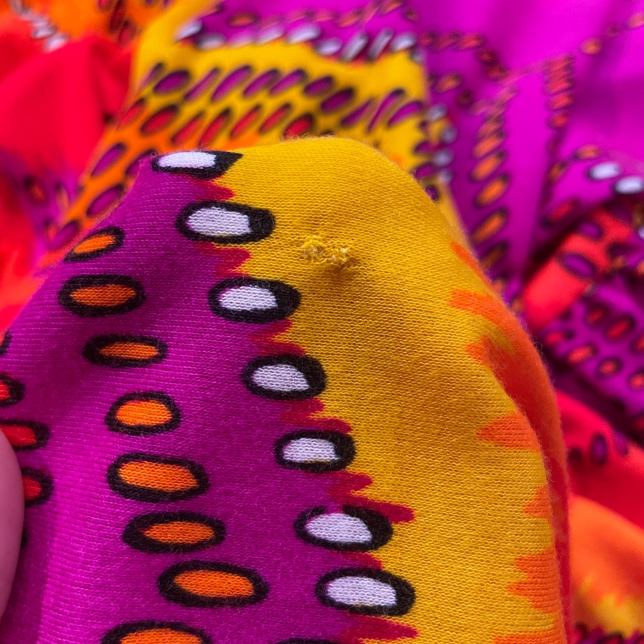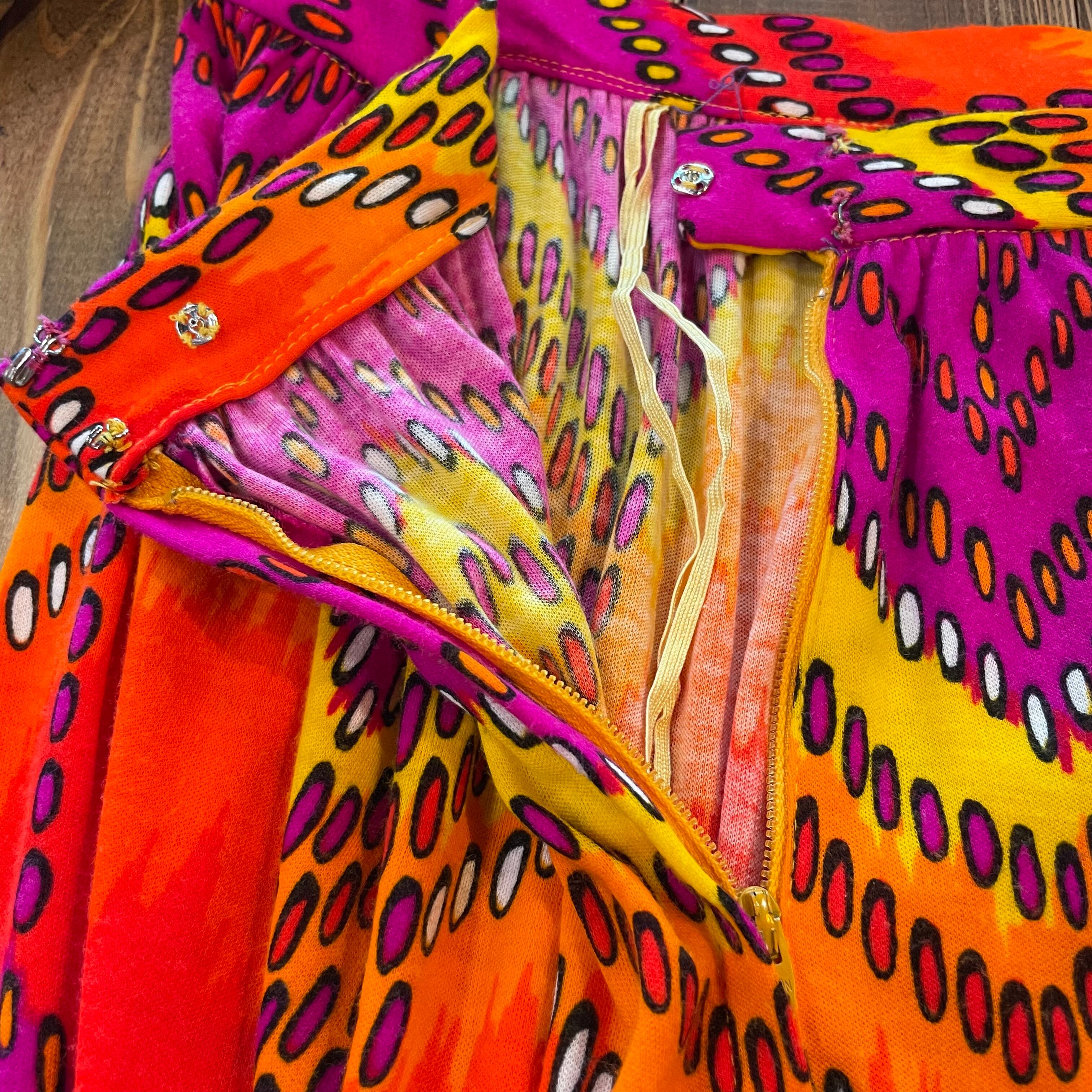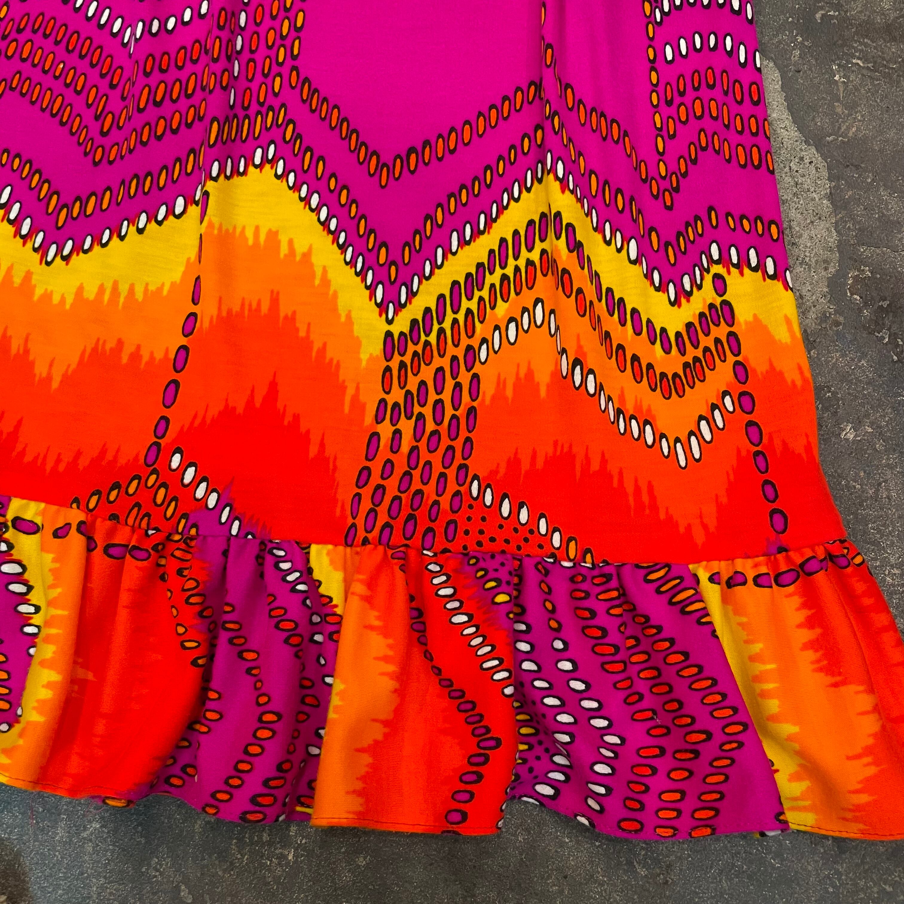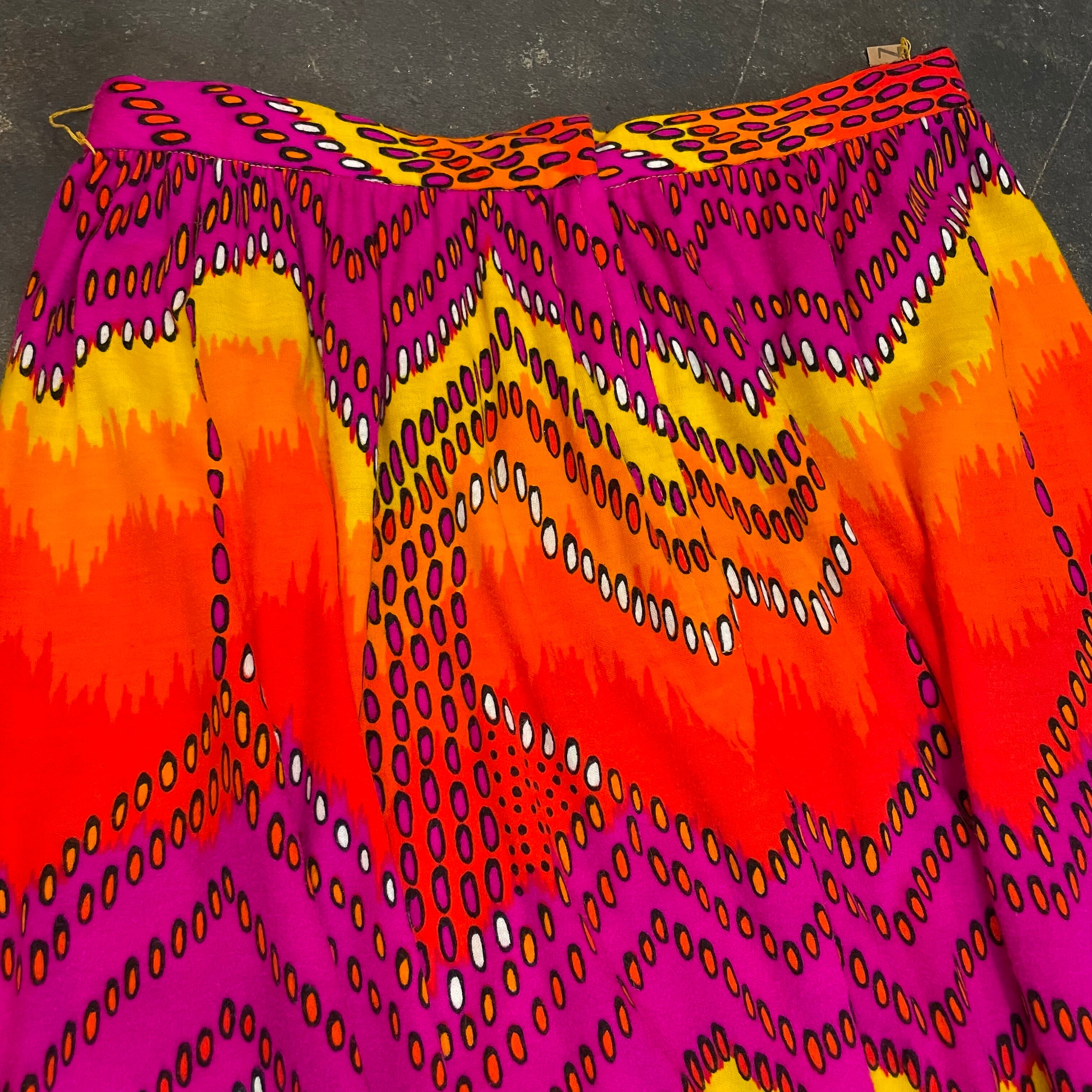 黄色からオレンジ、濃いピンクのグラデーションと幾何学模様がクレイジーなバランス感でとてもかわいいスカートです。