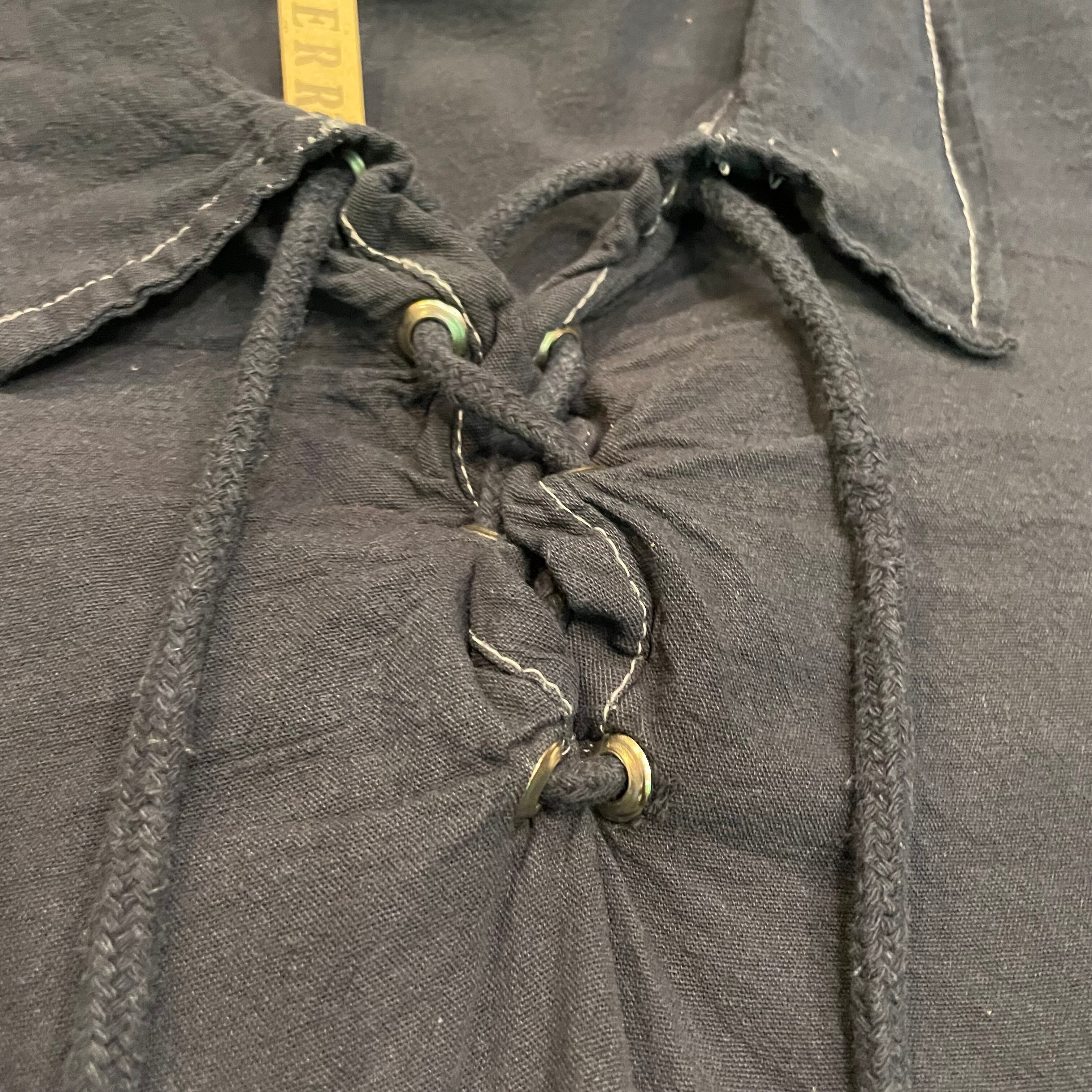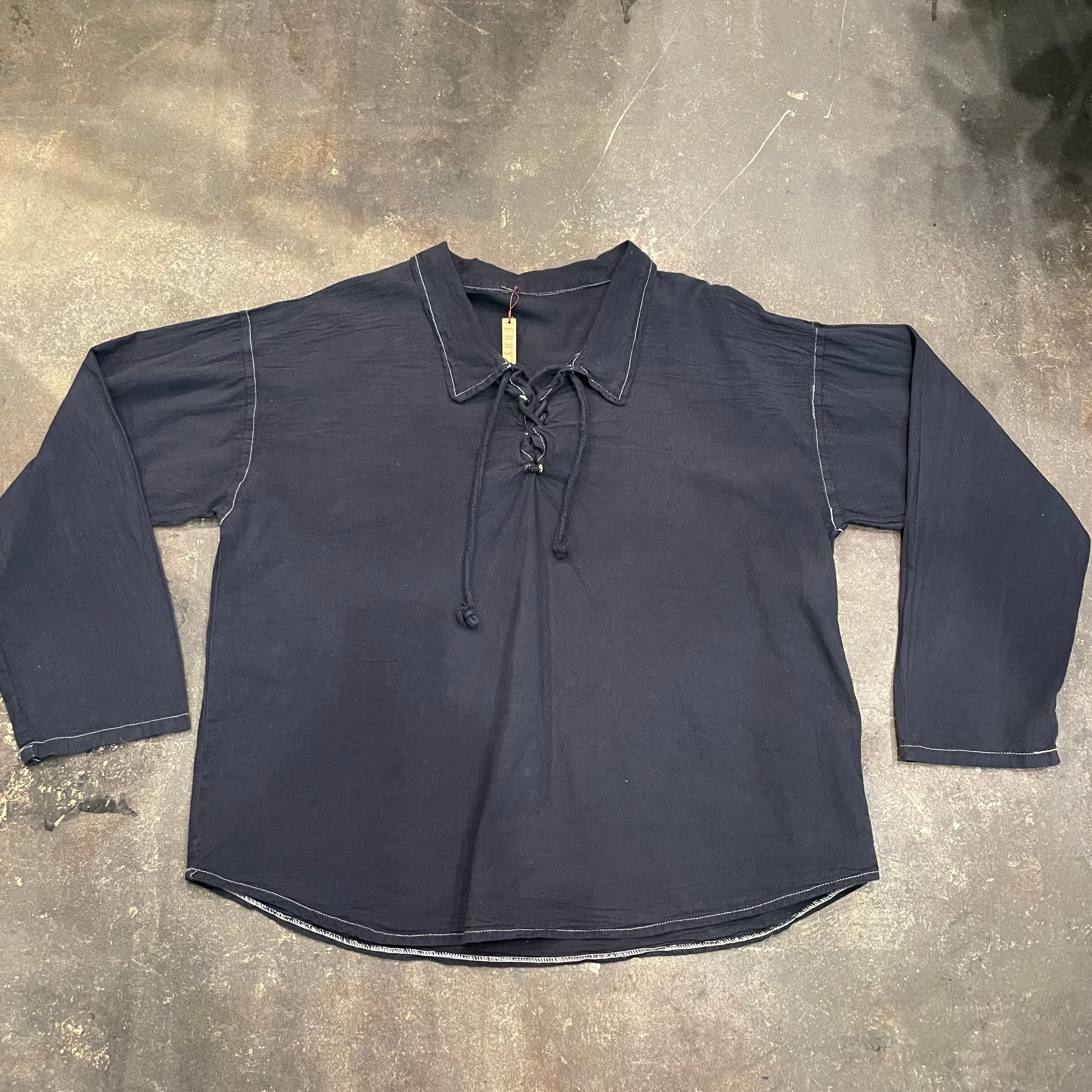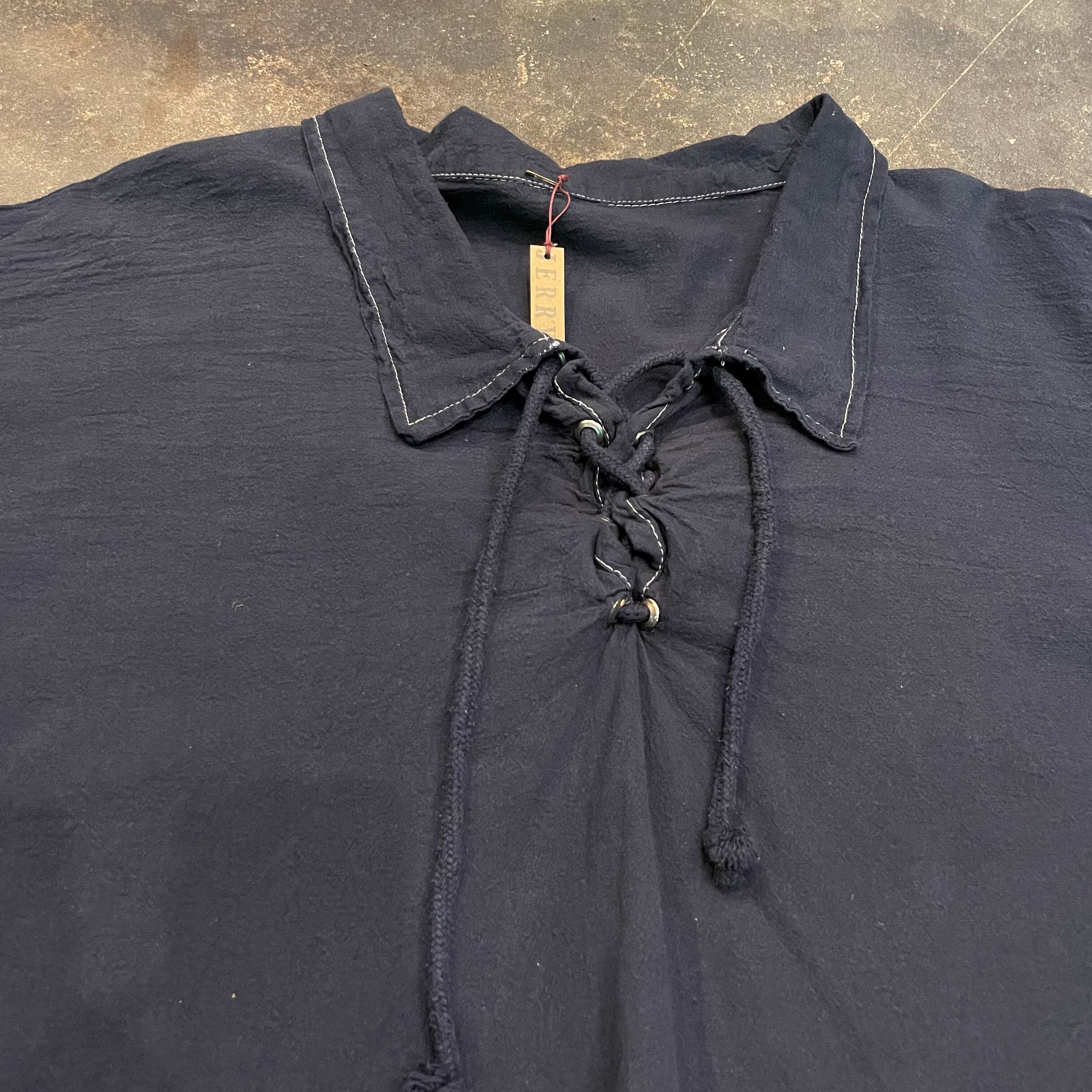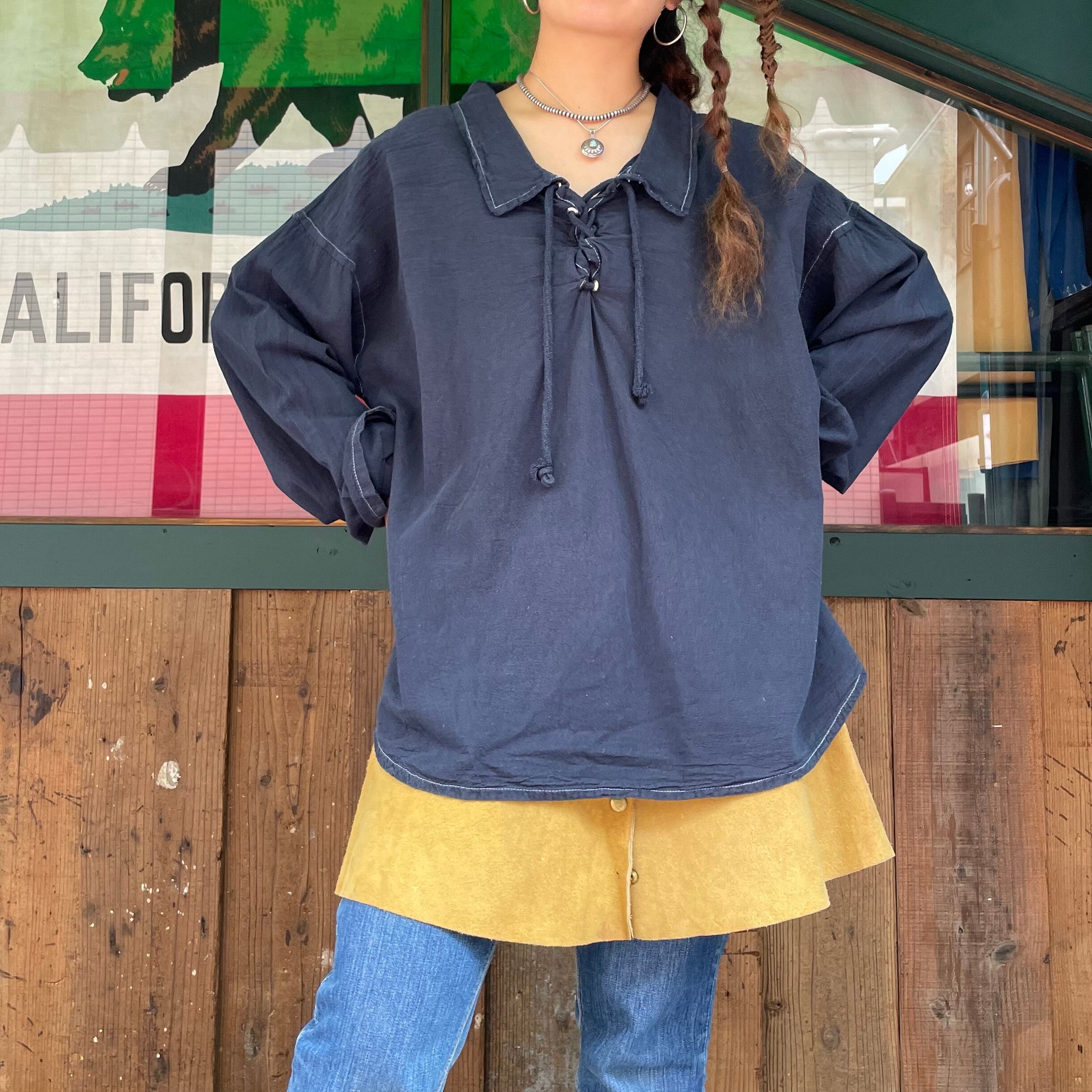 襟ぐりが広めでレースアップになっていたり、裾がやんわりラウンドしていたり、ざらっとした肌触りの薄手の素材も良い雰囲気です。