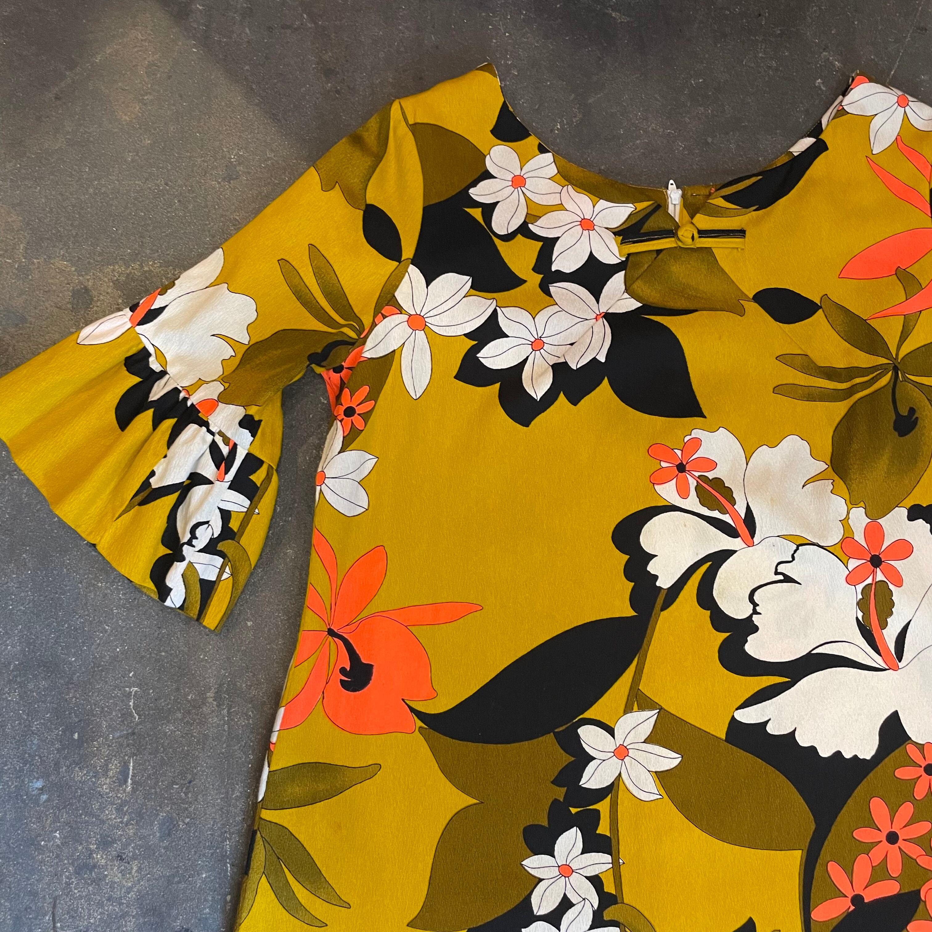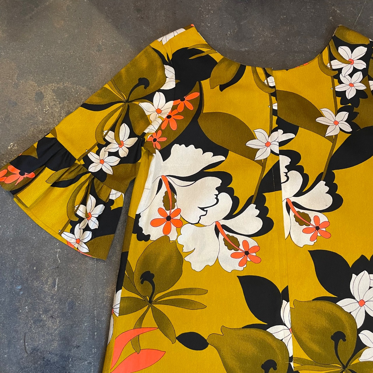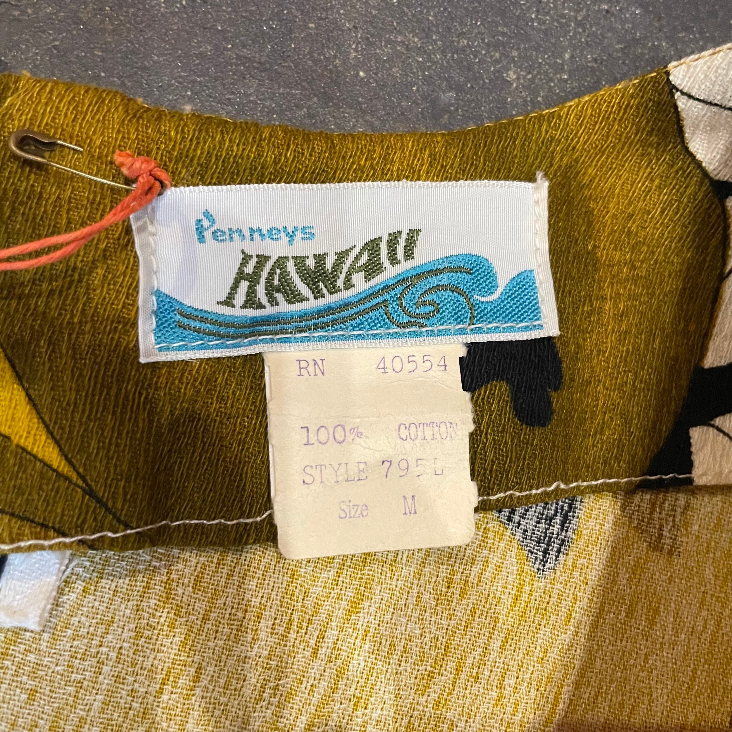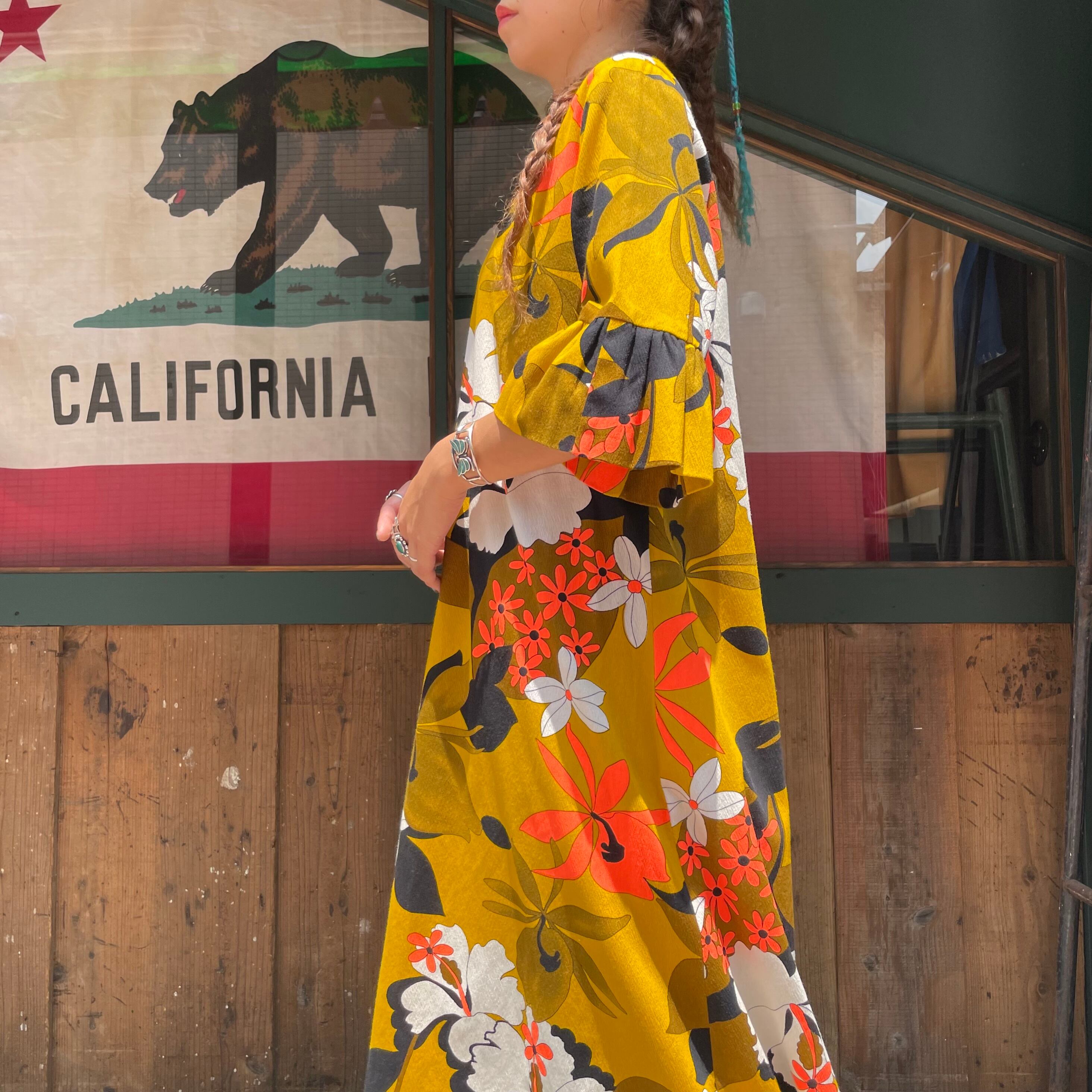 袖のデザインやシルエット、色味など全体的に大人っぽい雰囲気の70年代頃のハワイアンワンピースです。