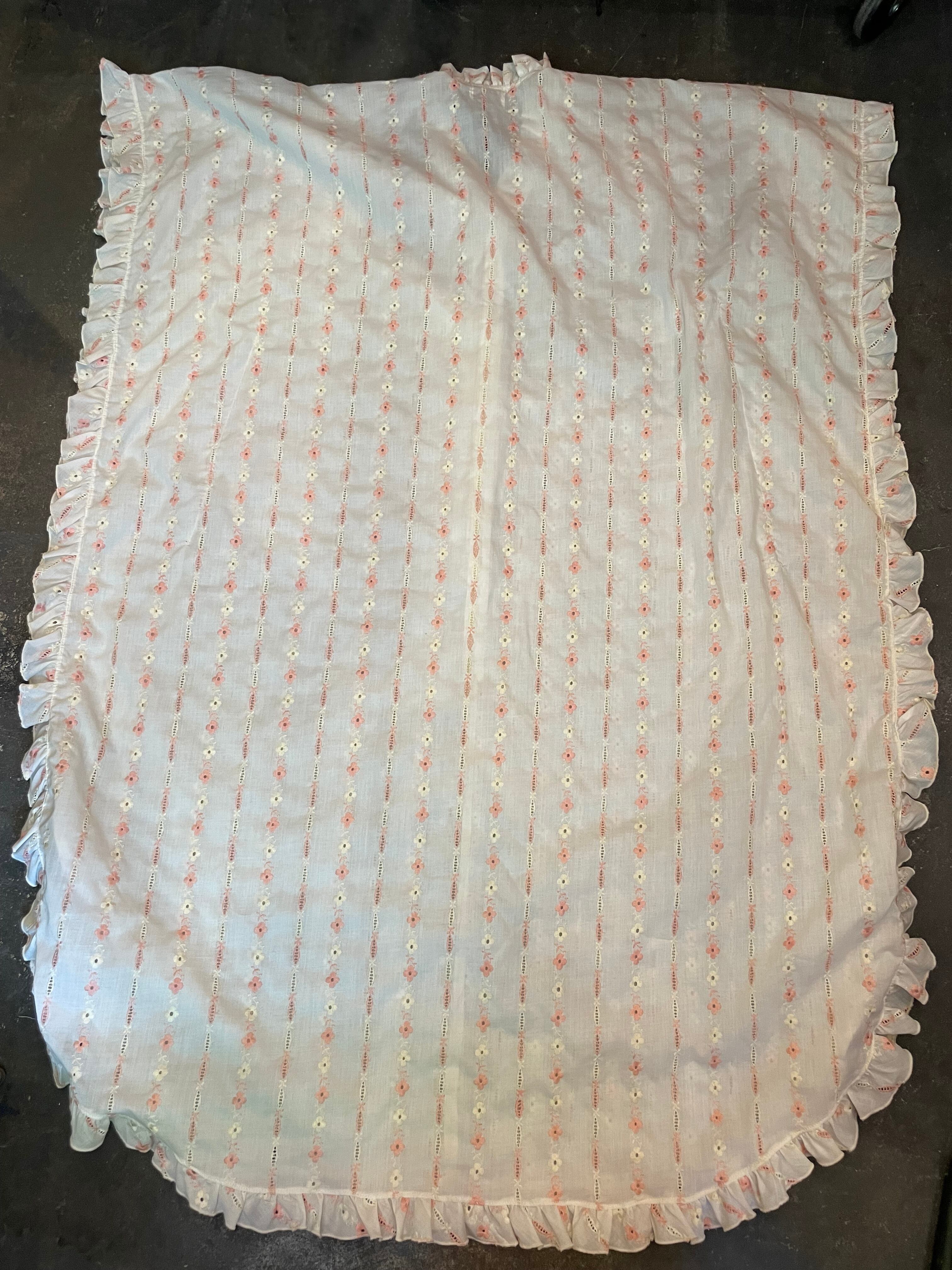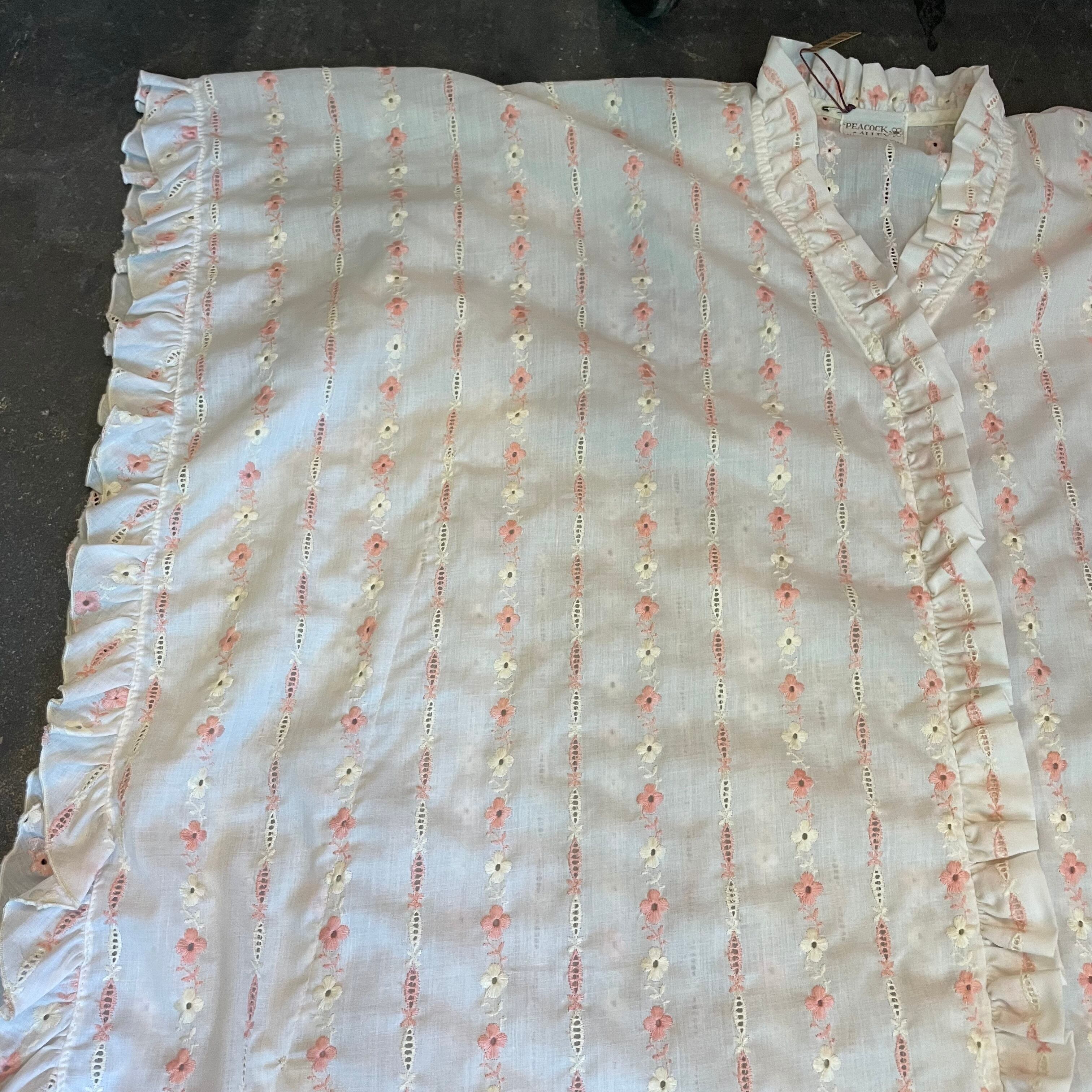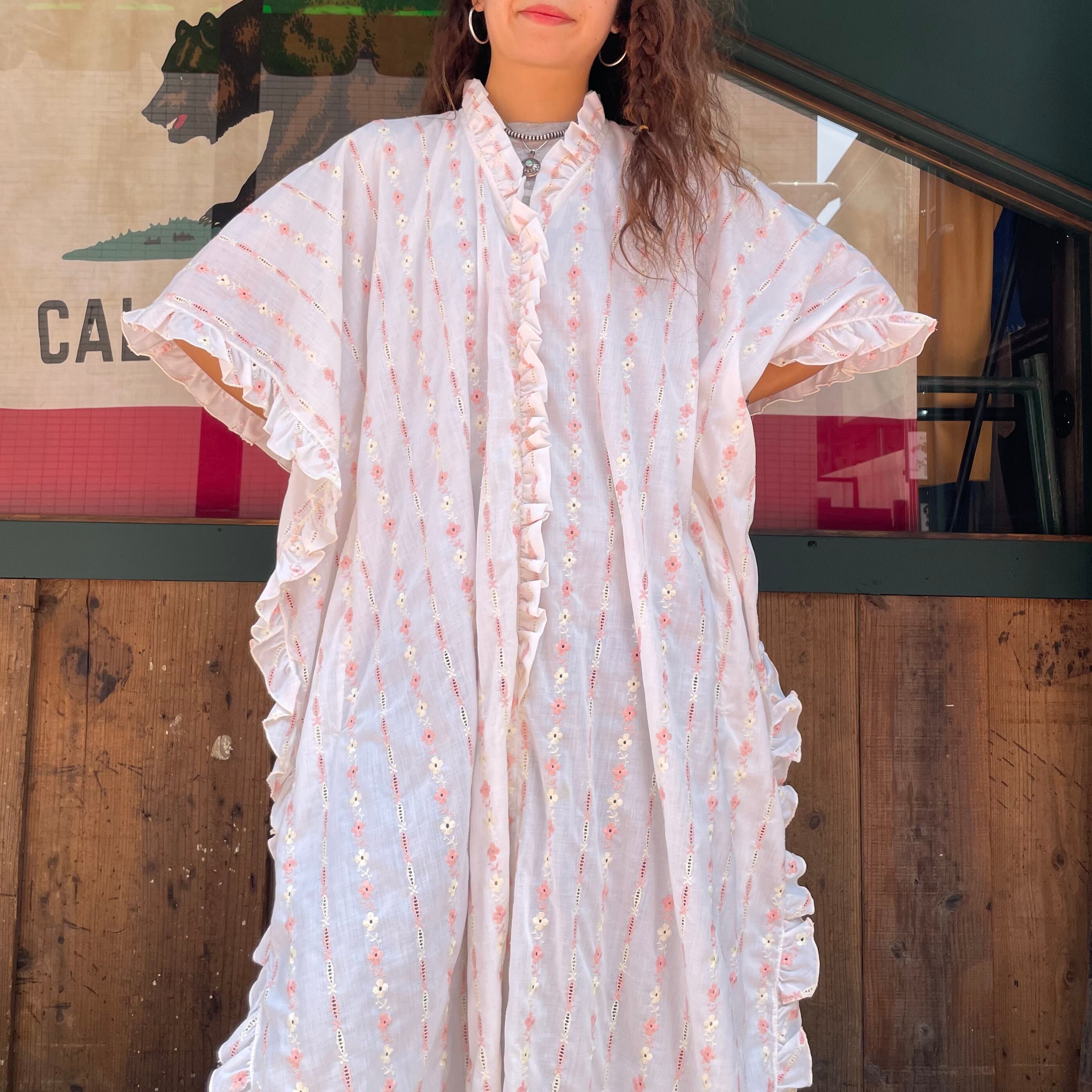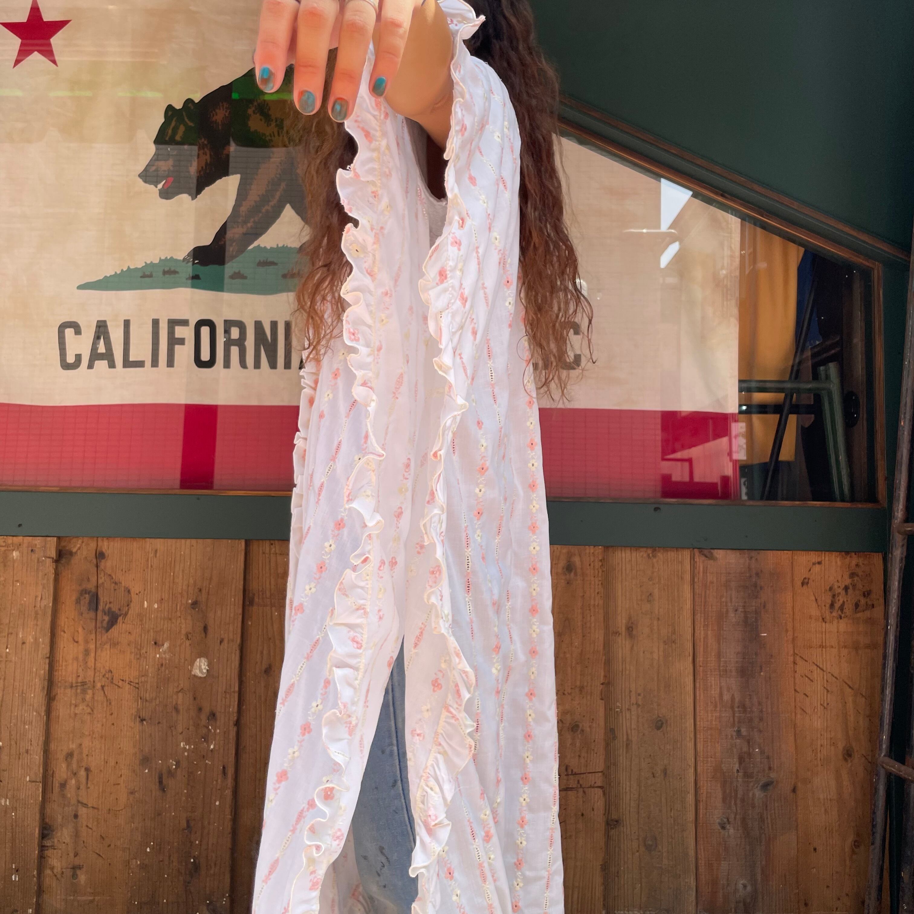 色味も淡いピンクや白っぽい雰囲気で全体的にラブリーですが、とても軽やかでポンチョのようなゆるいシルエットですので中にTシャツやパーカーを重ねてバランスを楽しんだり、ロングスカートを重ねたり、色々お楽しみいただけそうです。