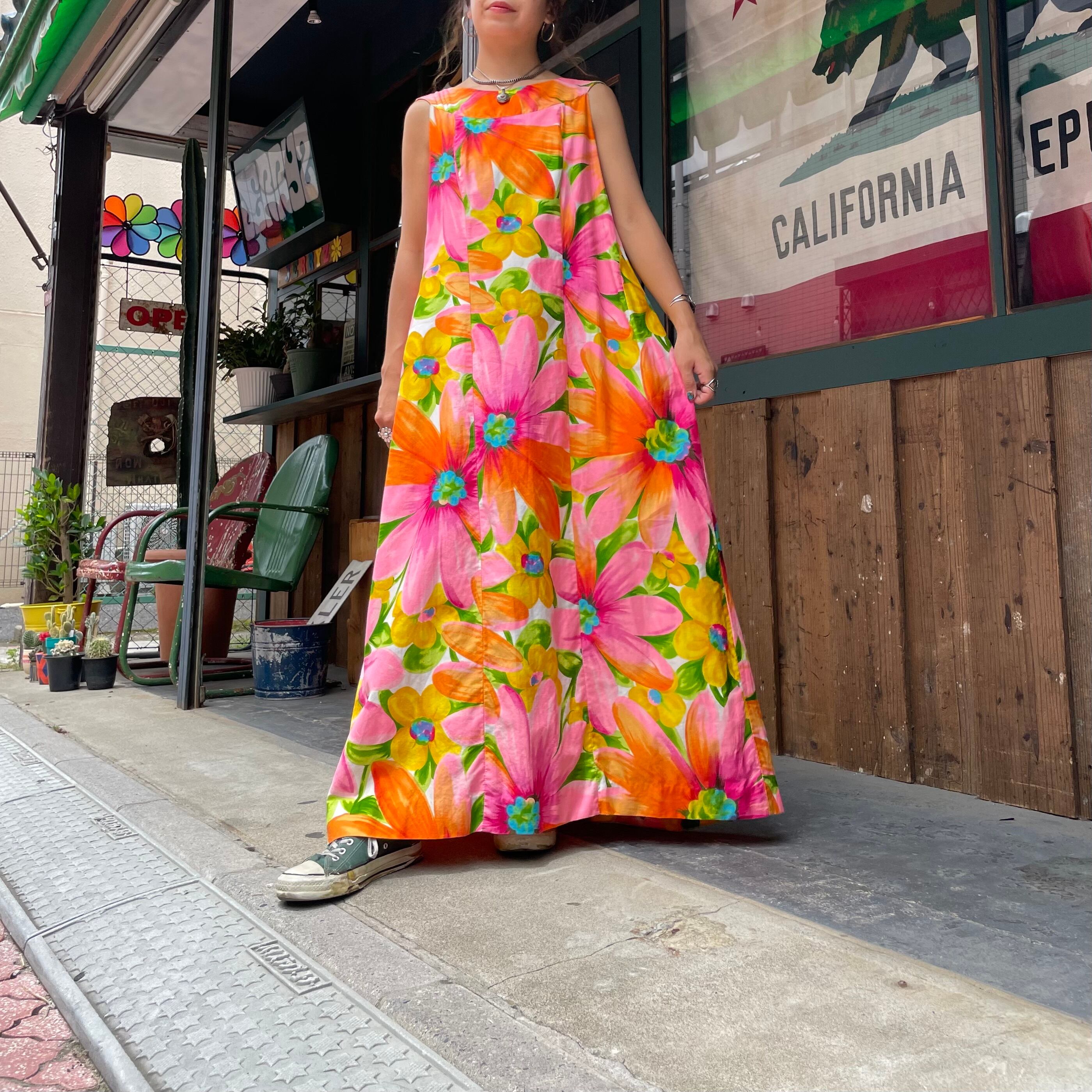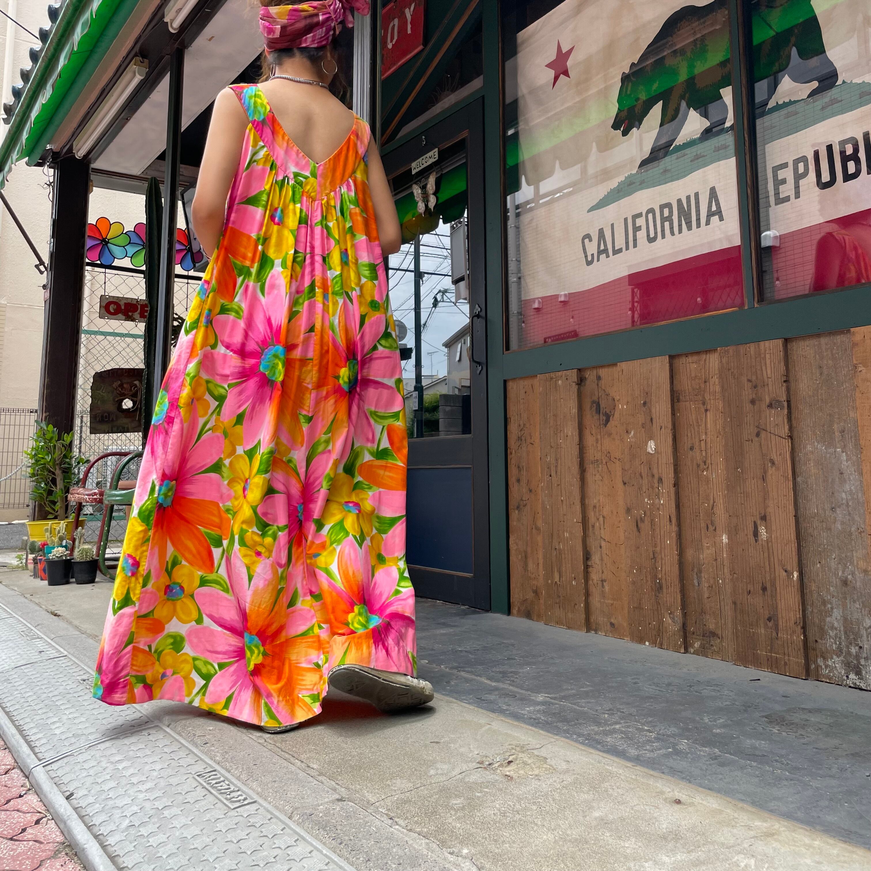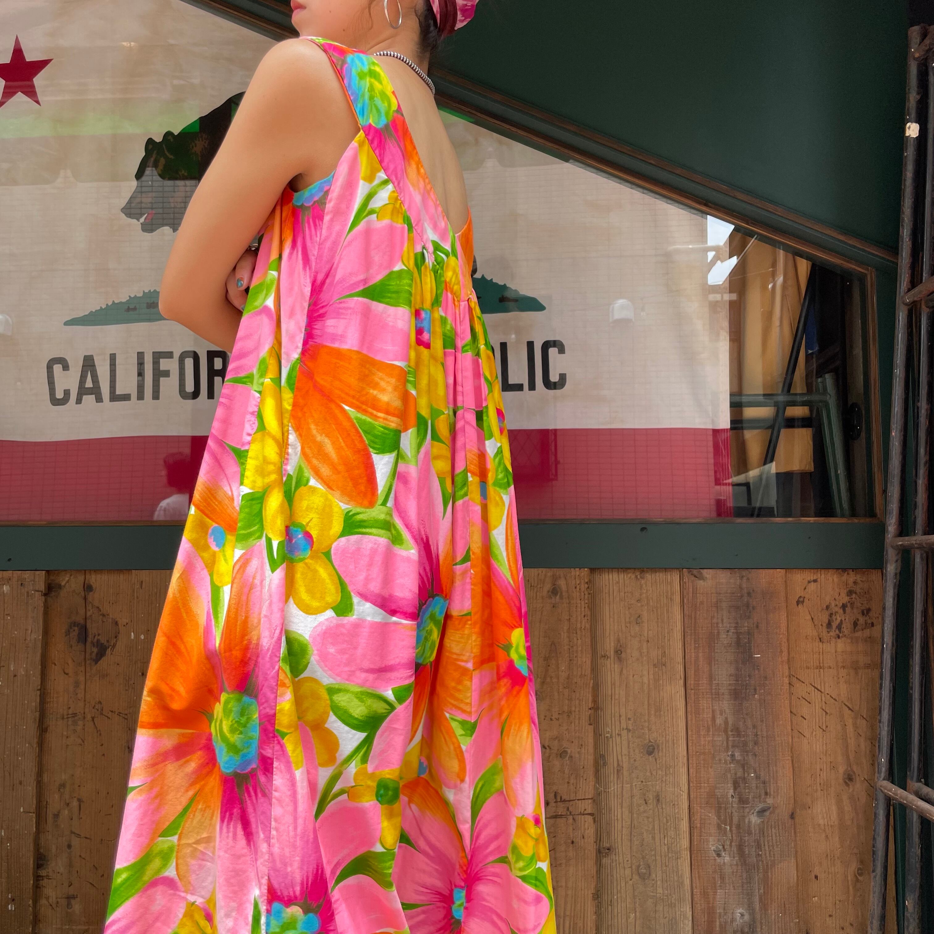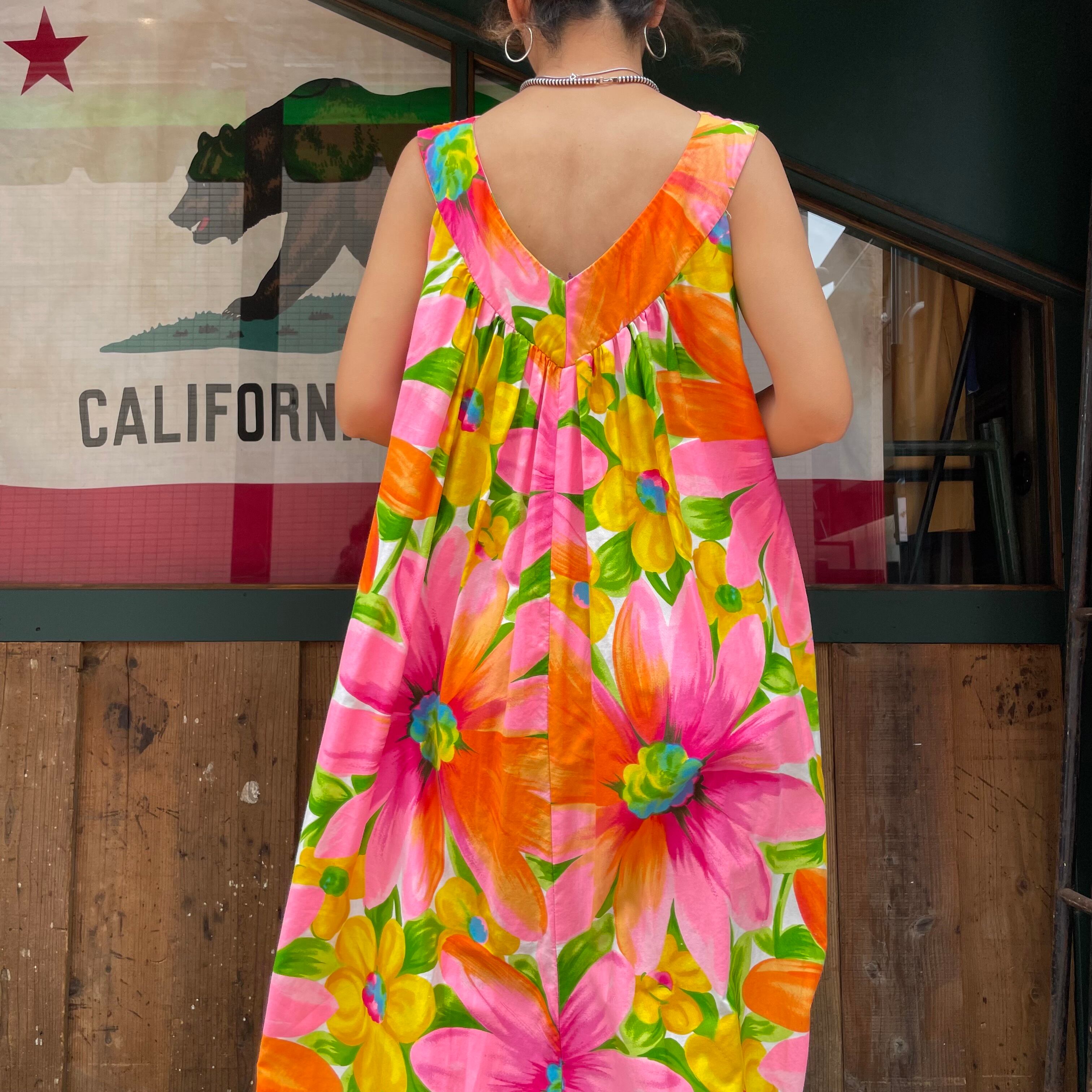 とても大きな花柄がインパクト抜群なワンピースです。背中がきれいに開いて、そこからのボリュームのあるシルエットがかわいいですね。
