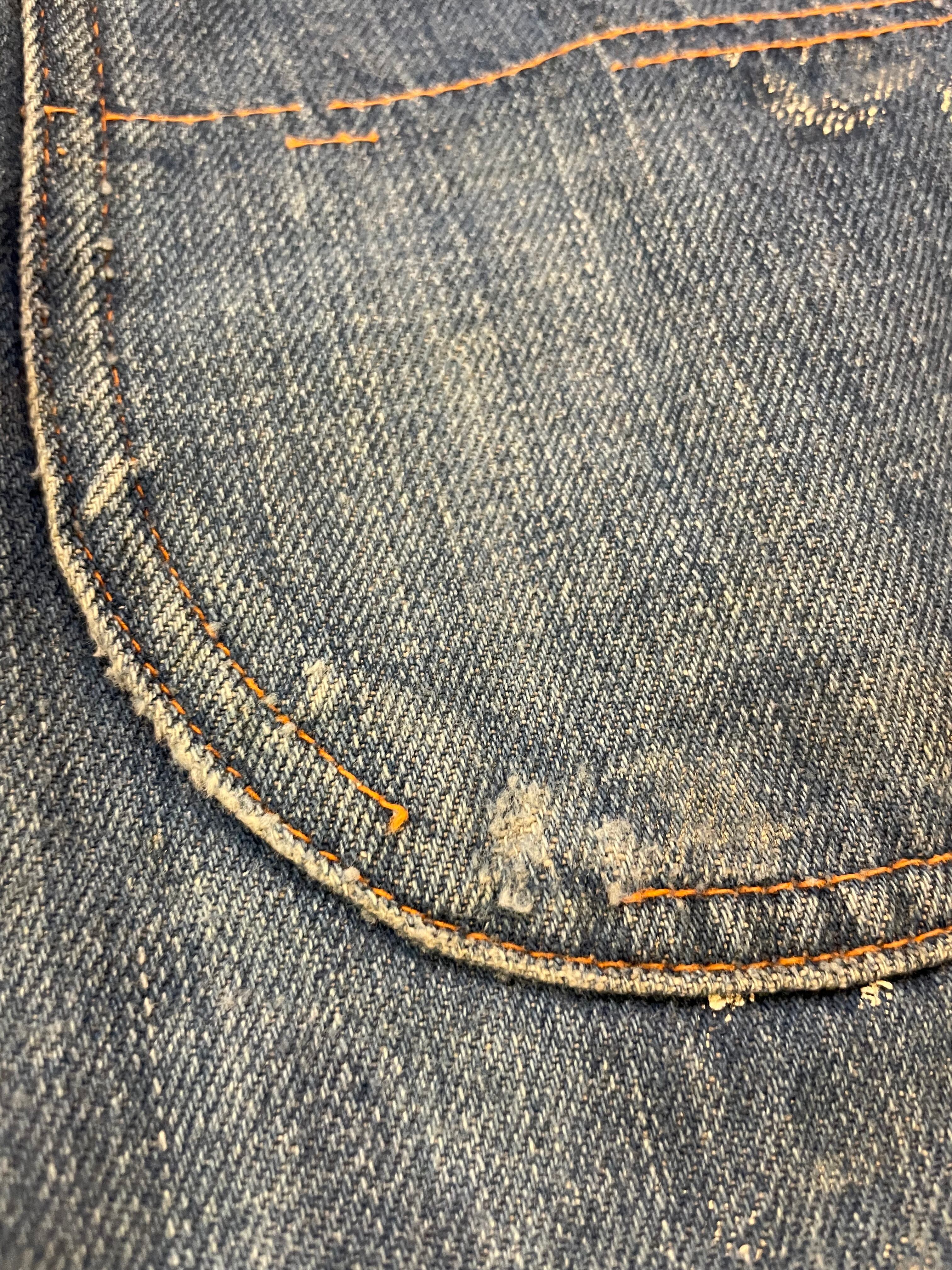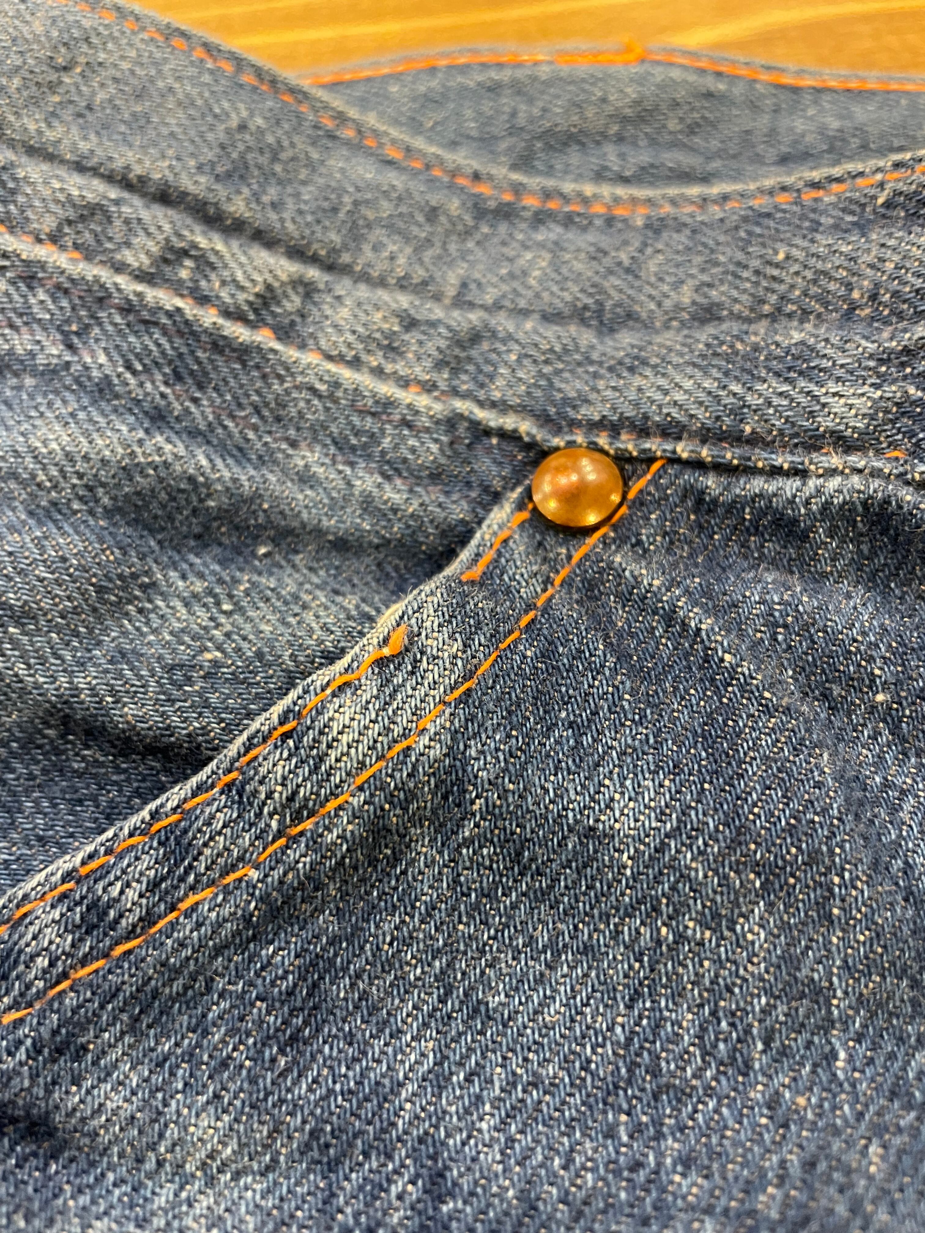 やや薄手のデニムで、元々がペインターパンツなのでゆったり太めなシルエットで履きやすいです。ペンキがとんでいたり汚れや色褪せが古着ならではの良い雰囲気でとてもかっこいい一枚です。