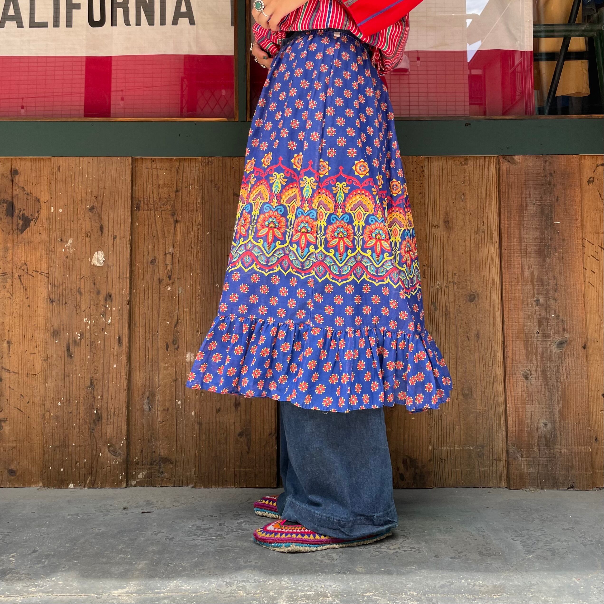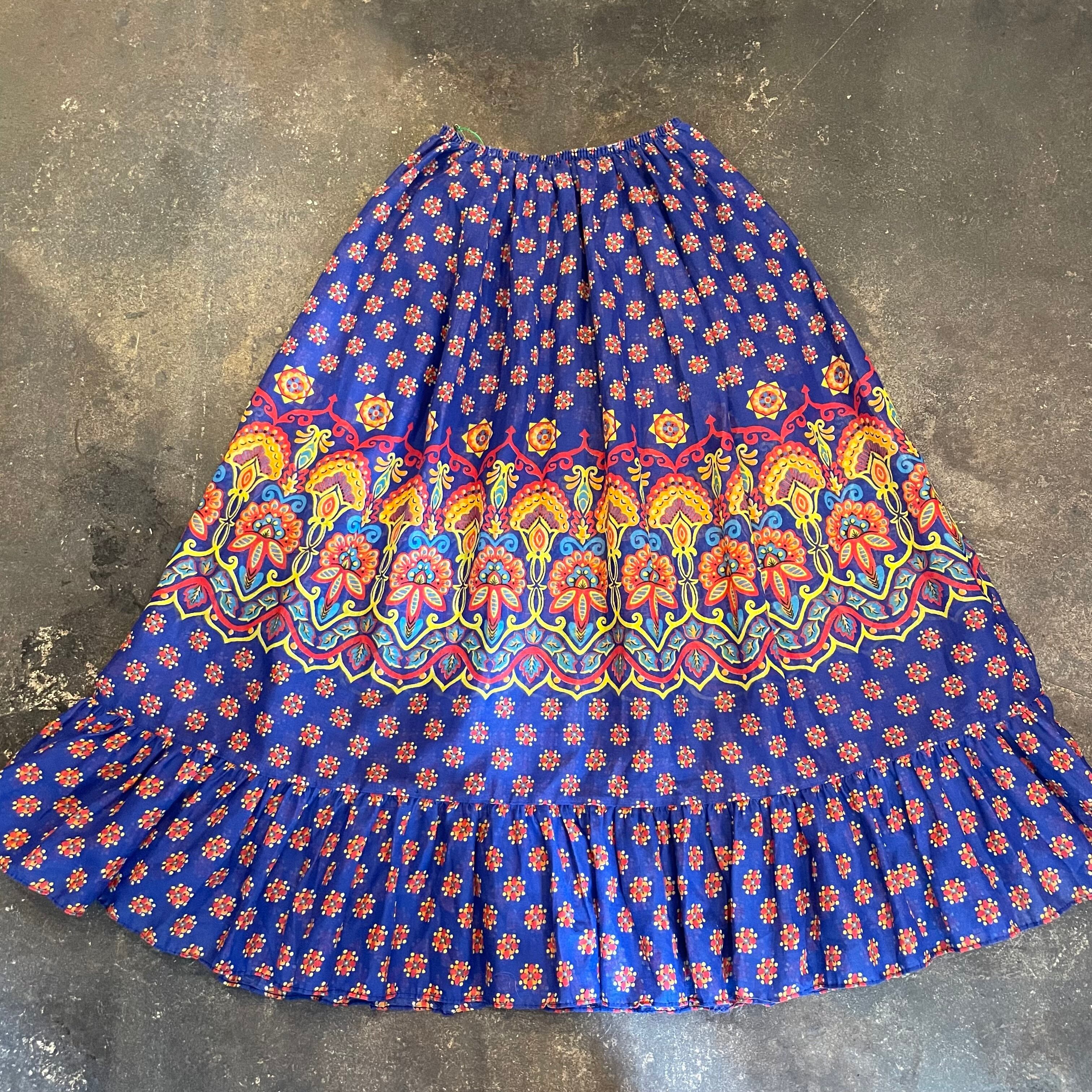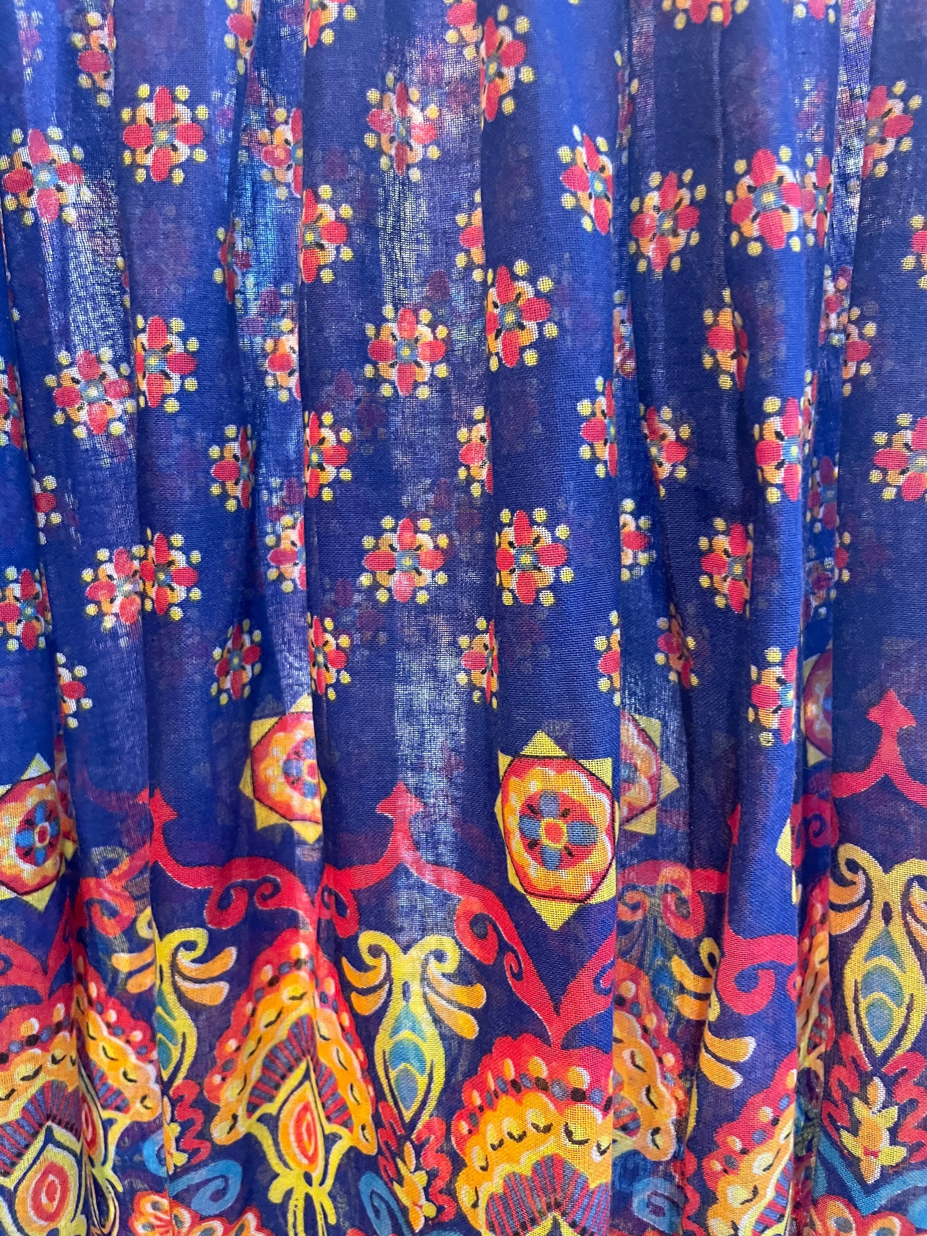 青地に赤や黄色の柄がかわいいシースルー素材のスカートです。