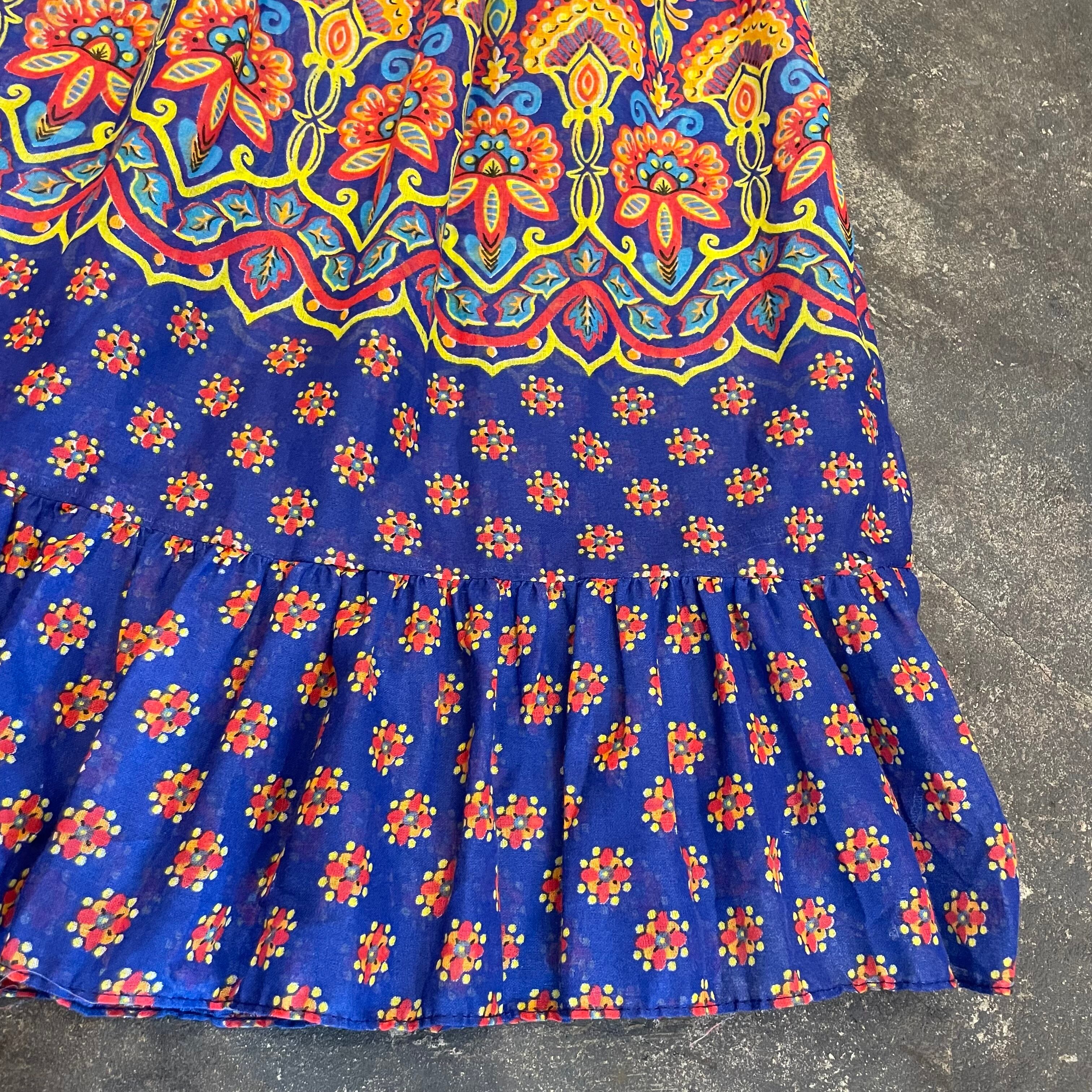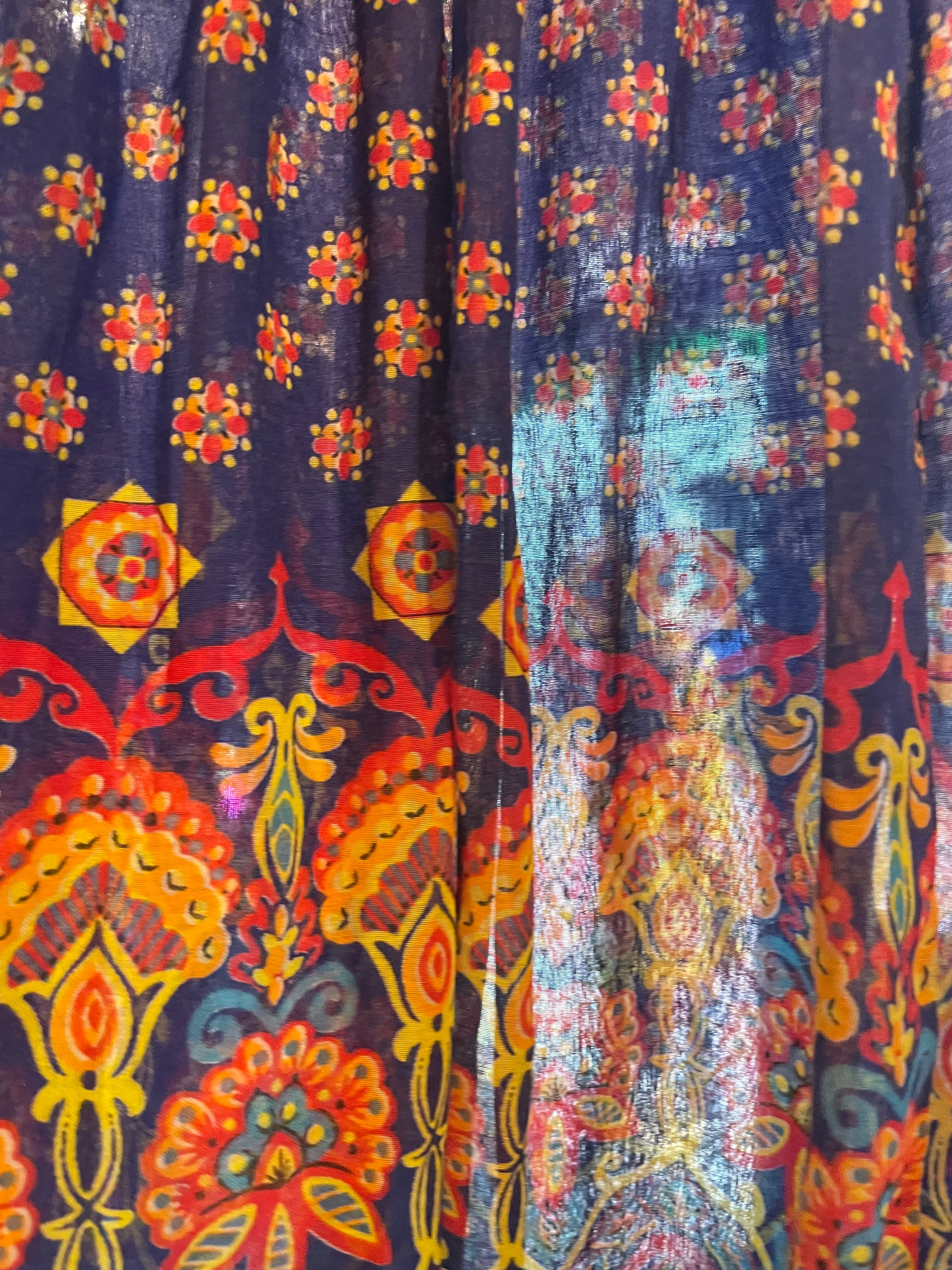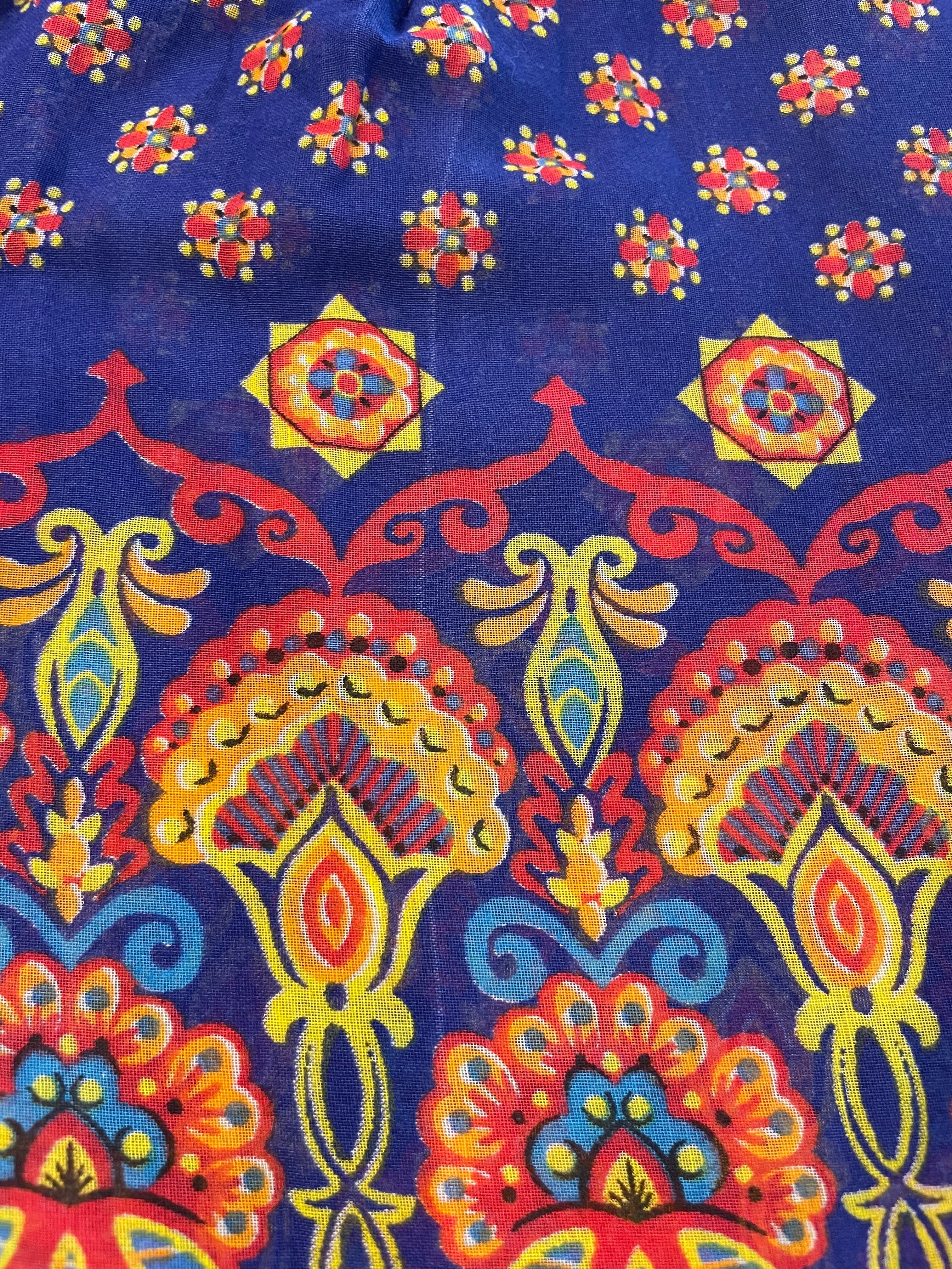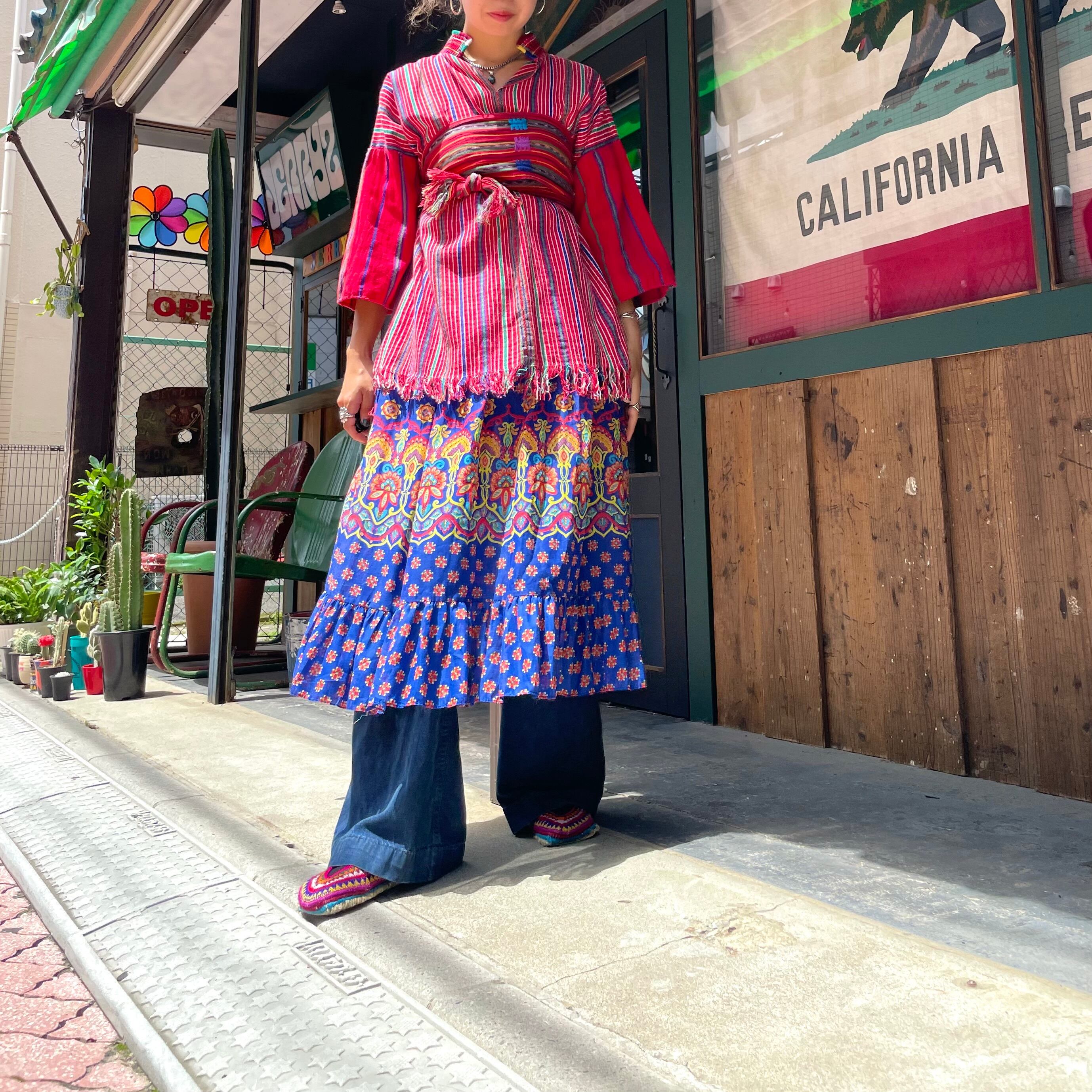 青地に赤や黄色の柄がかわいいシースルー素材のスカートです。