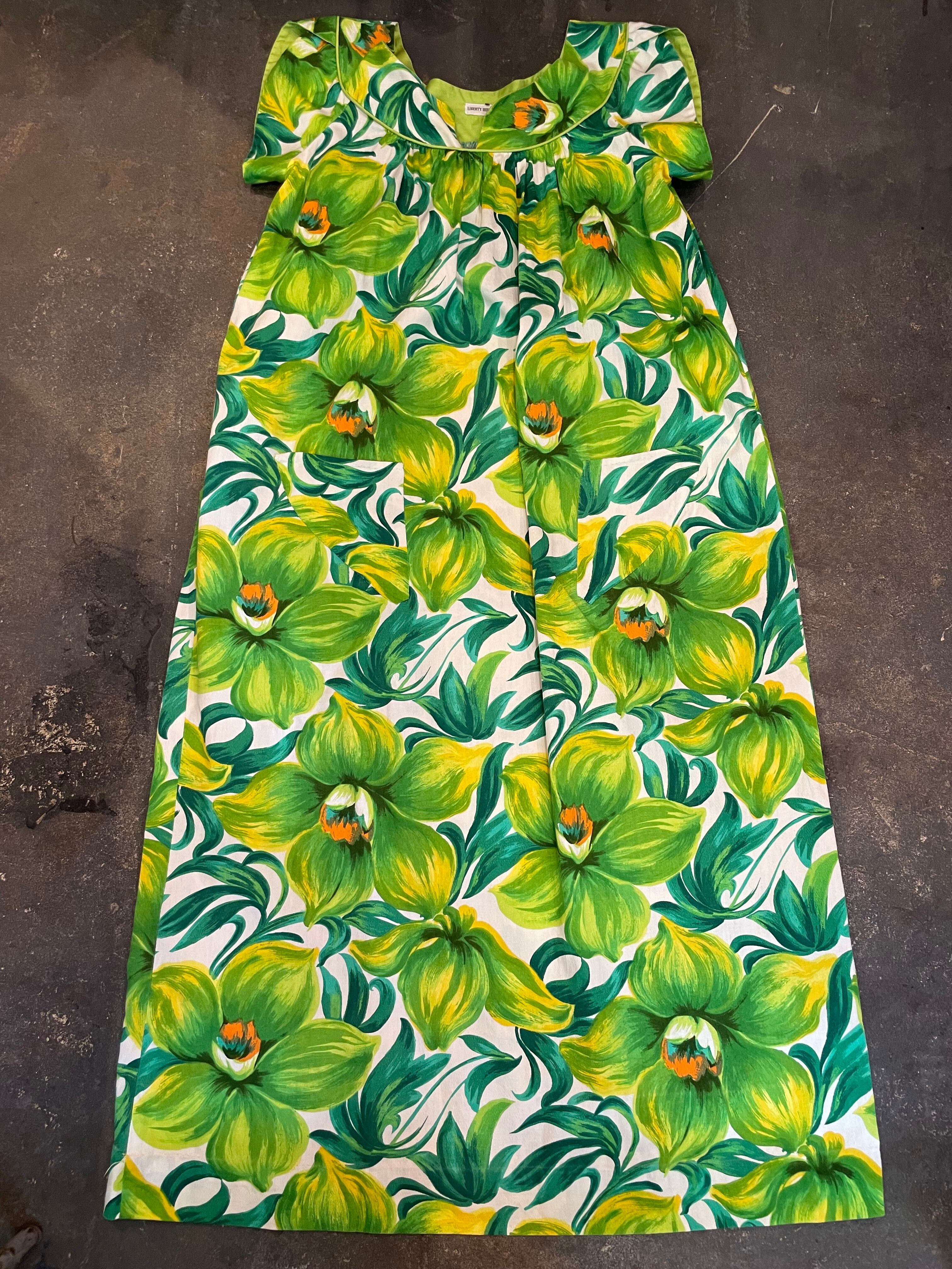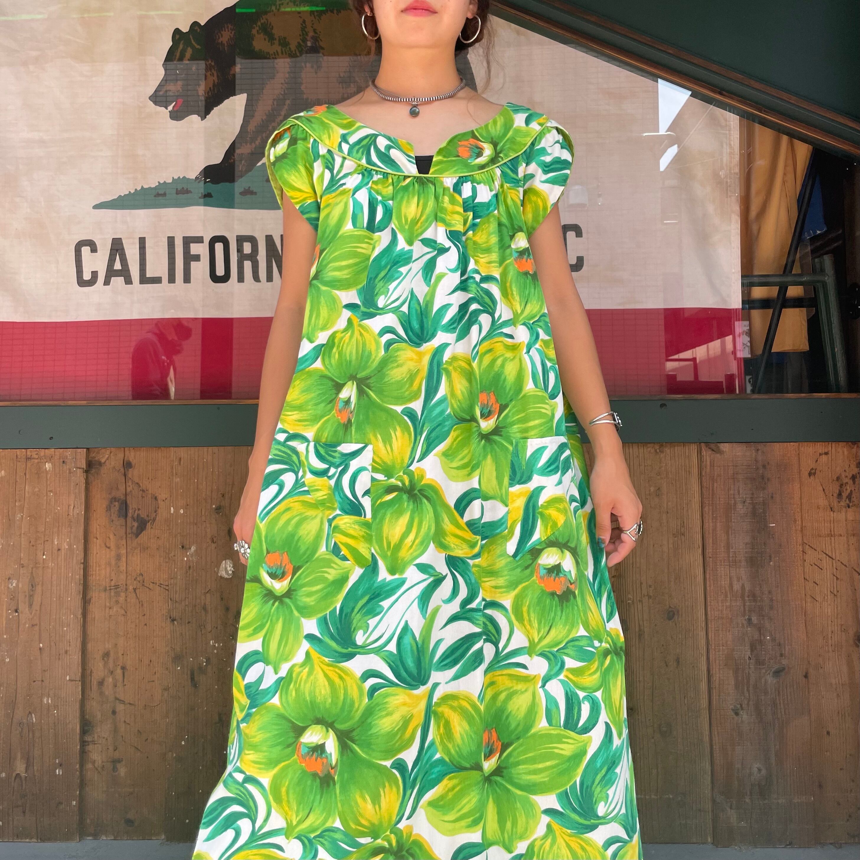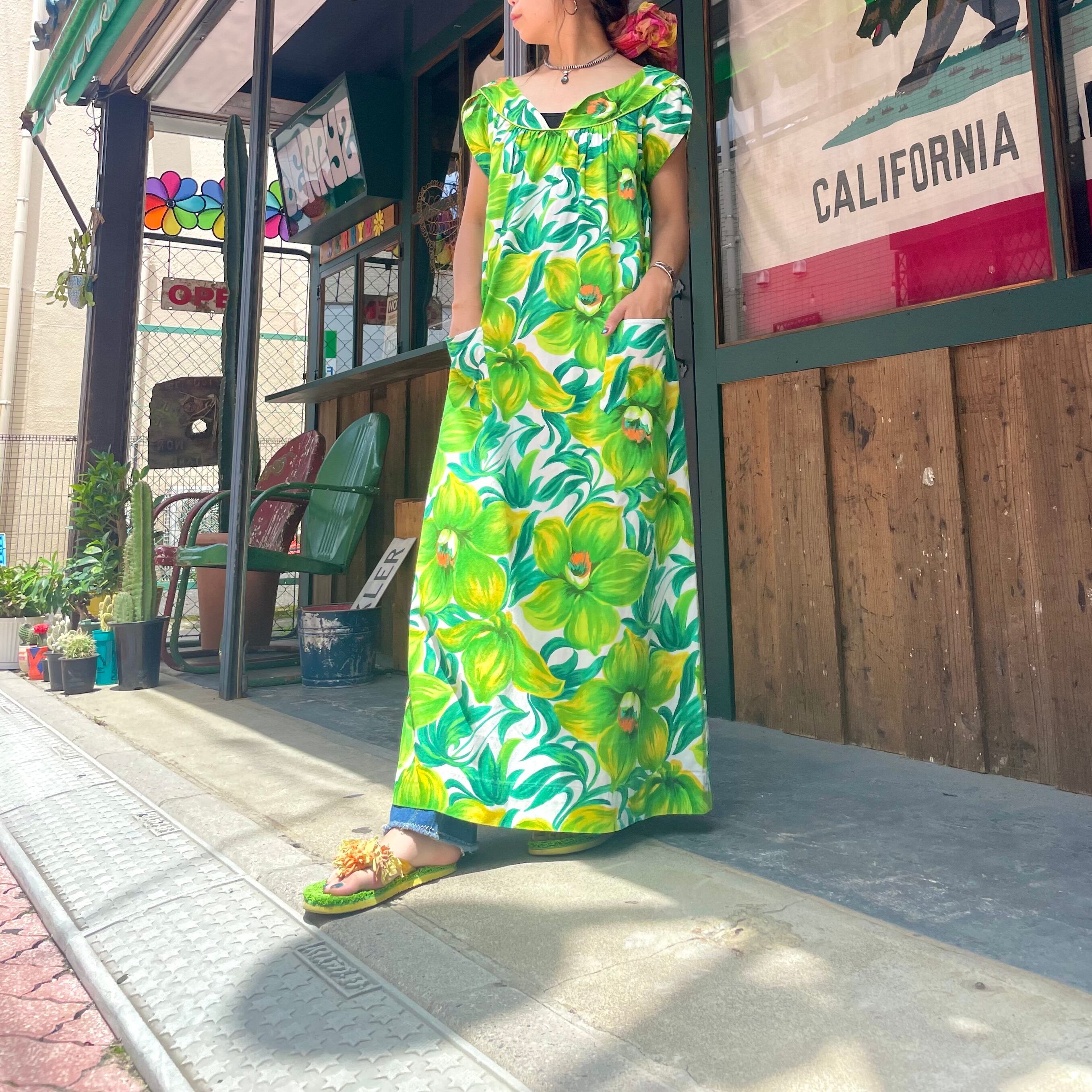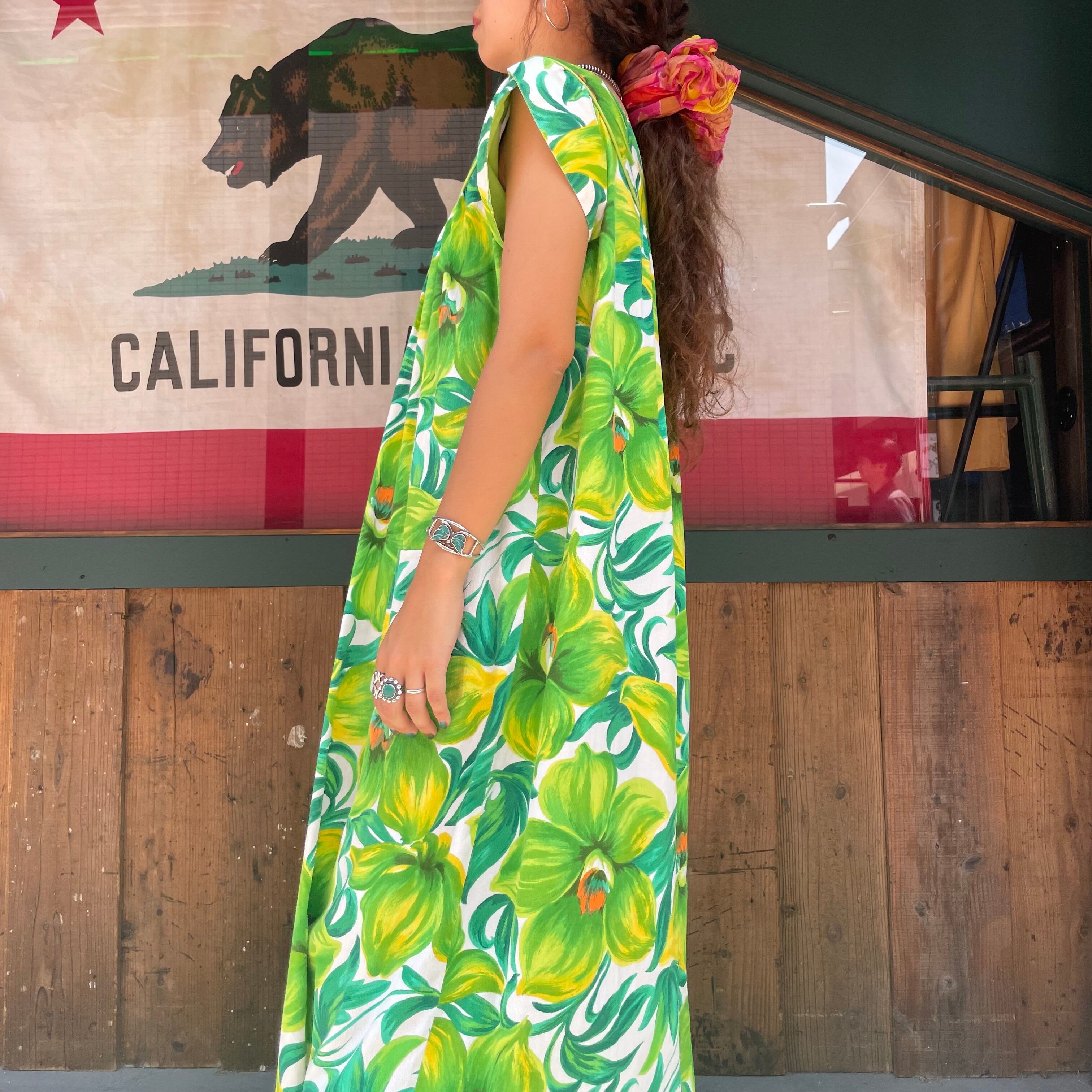 緑の大きな花柄がとても爽やかで涼しげな60〜70年代ごろのハワイアンワンピースです。
