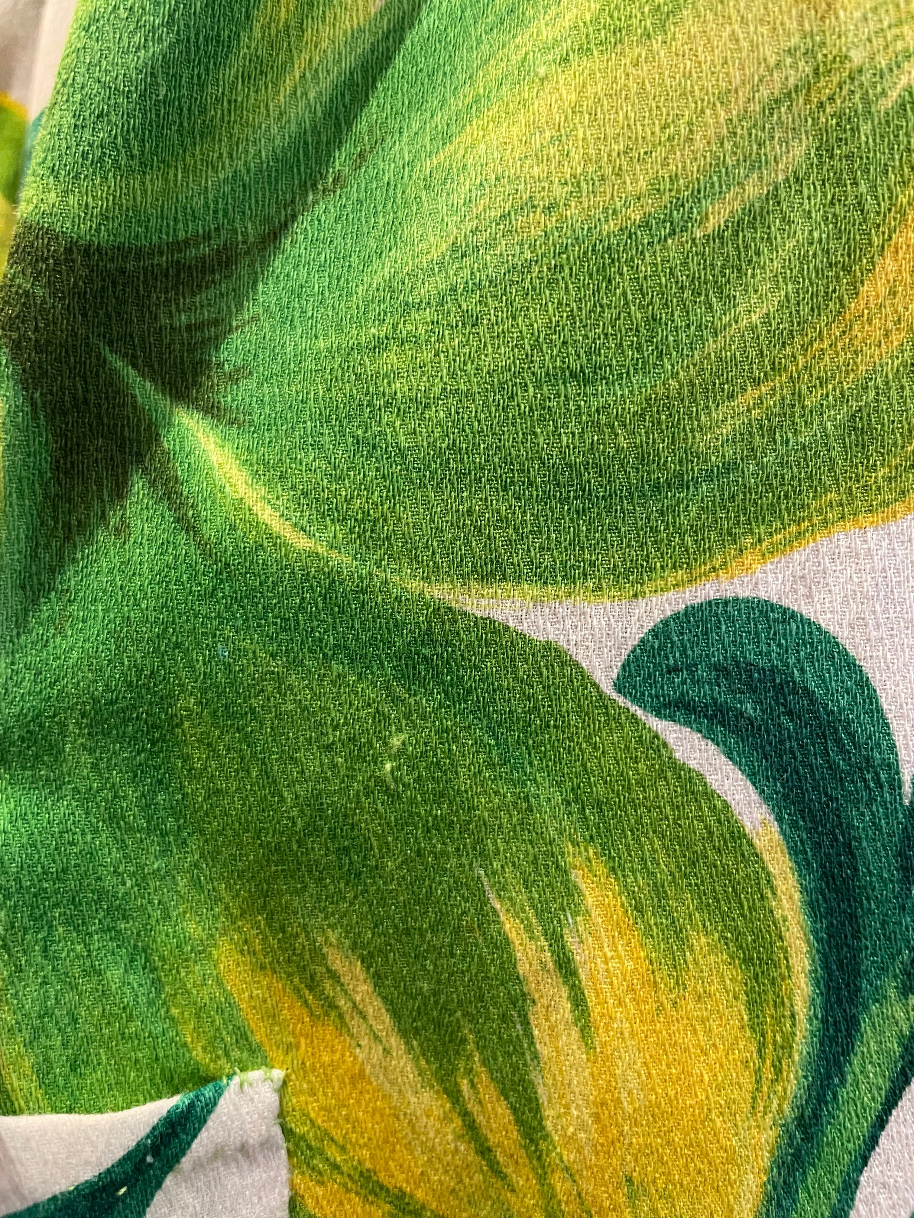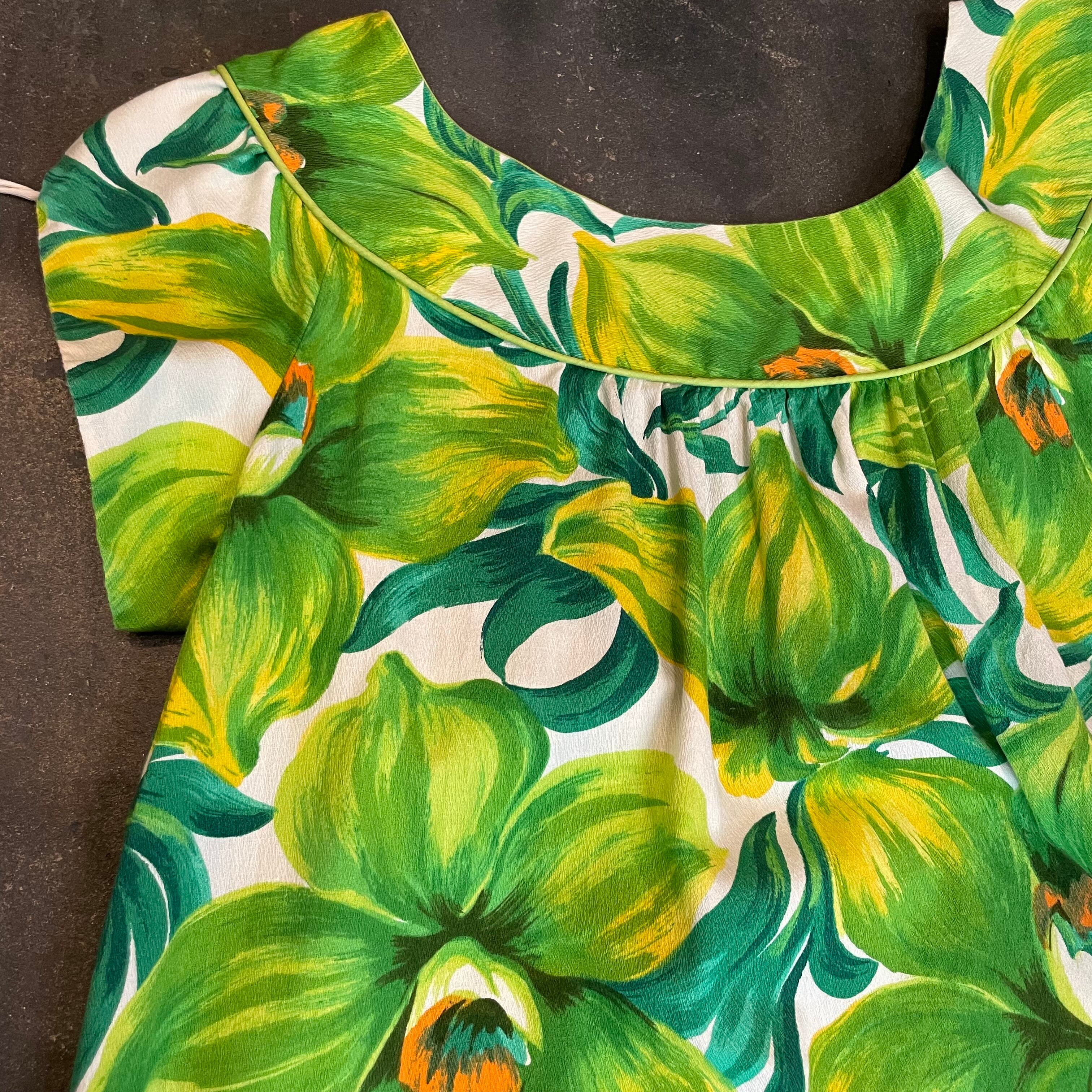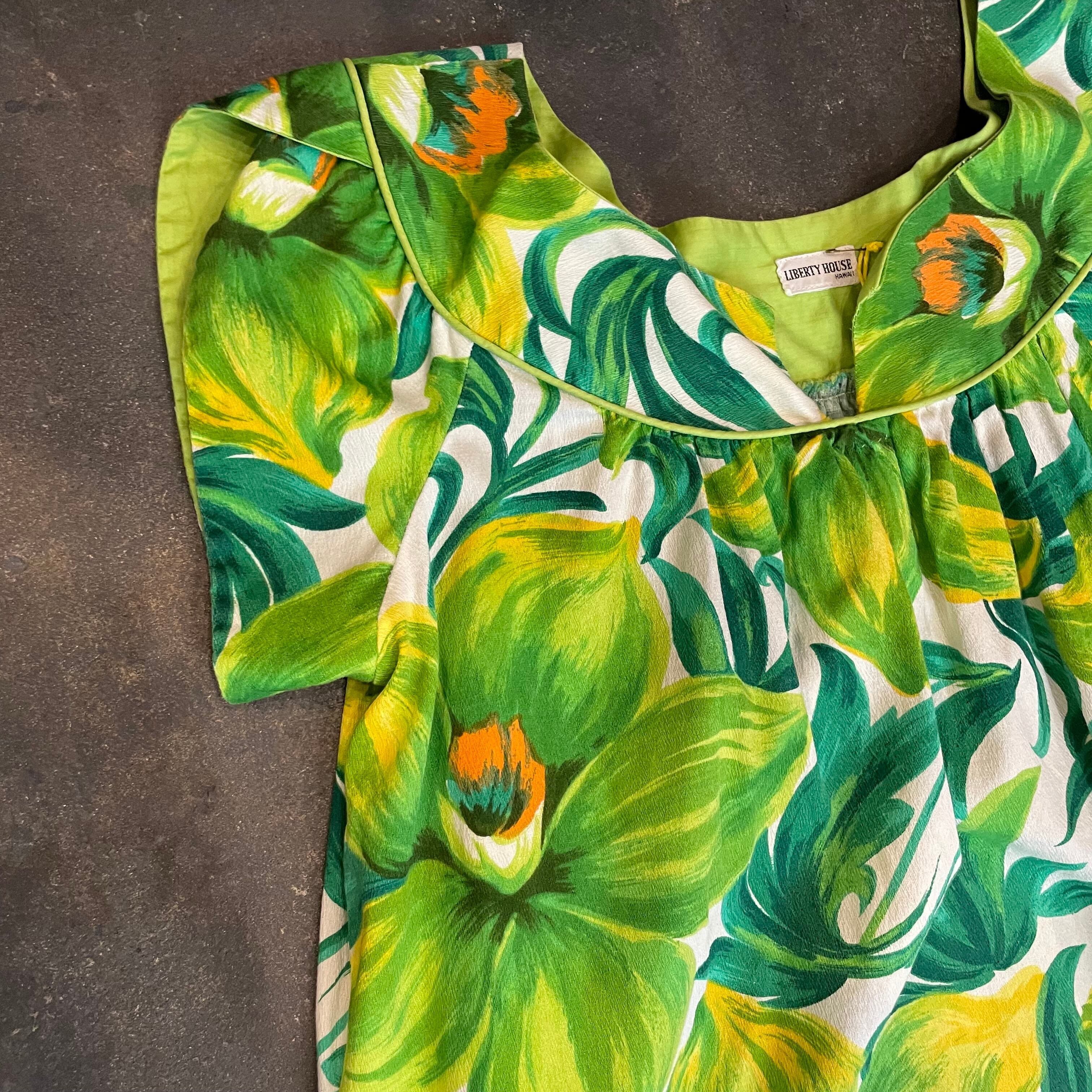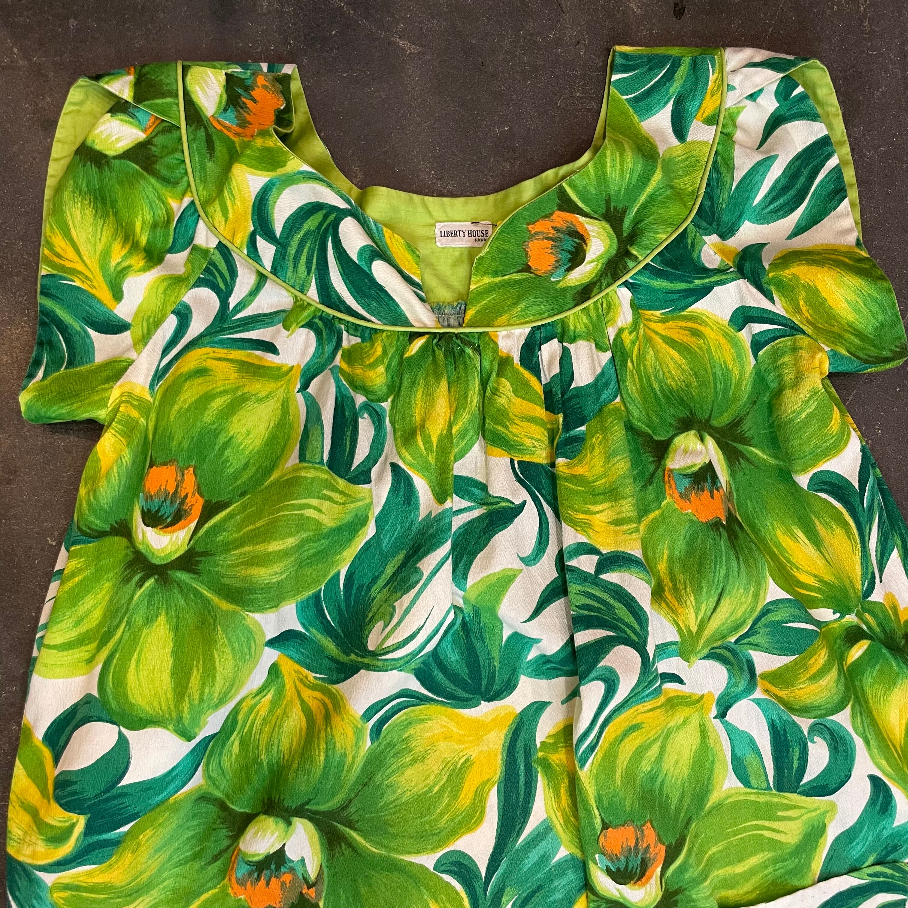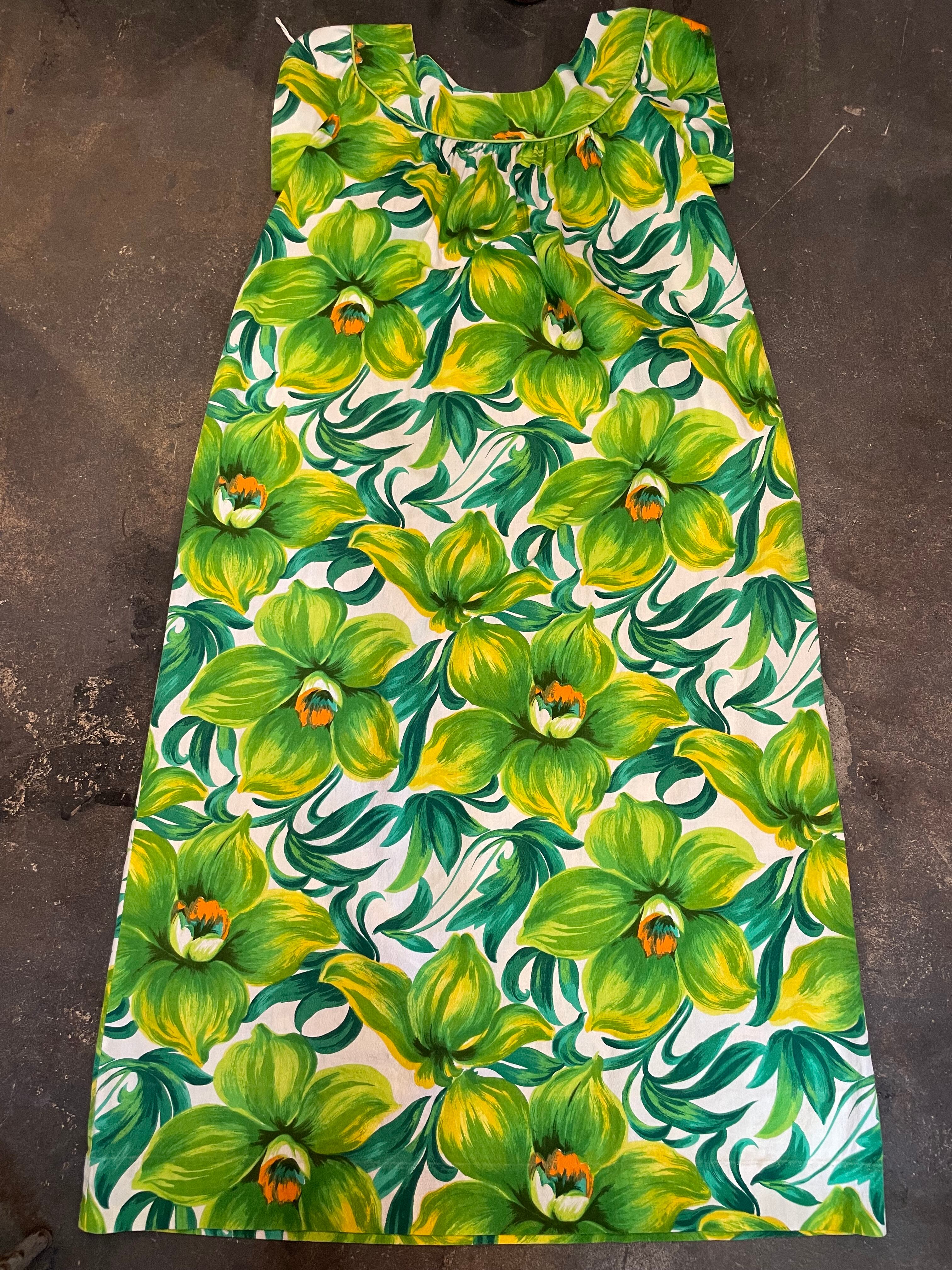 緑の大きな花柄がとても爽やかで涼しげな60〜70年代ごろのハワイアンワンピースです。