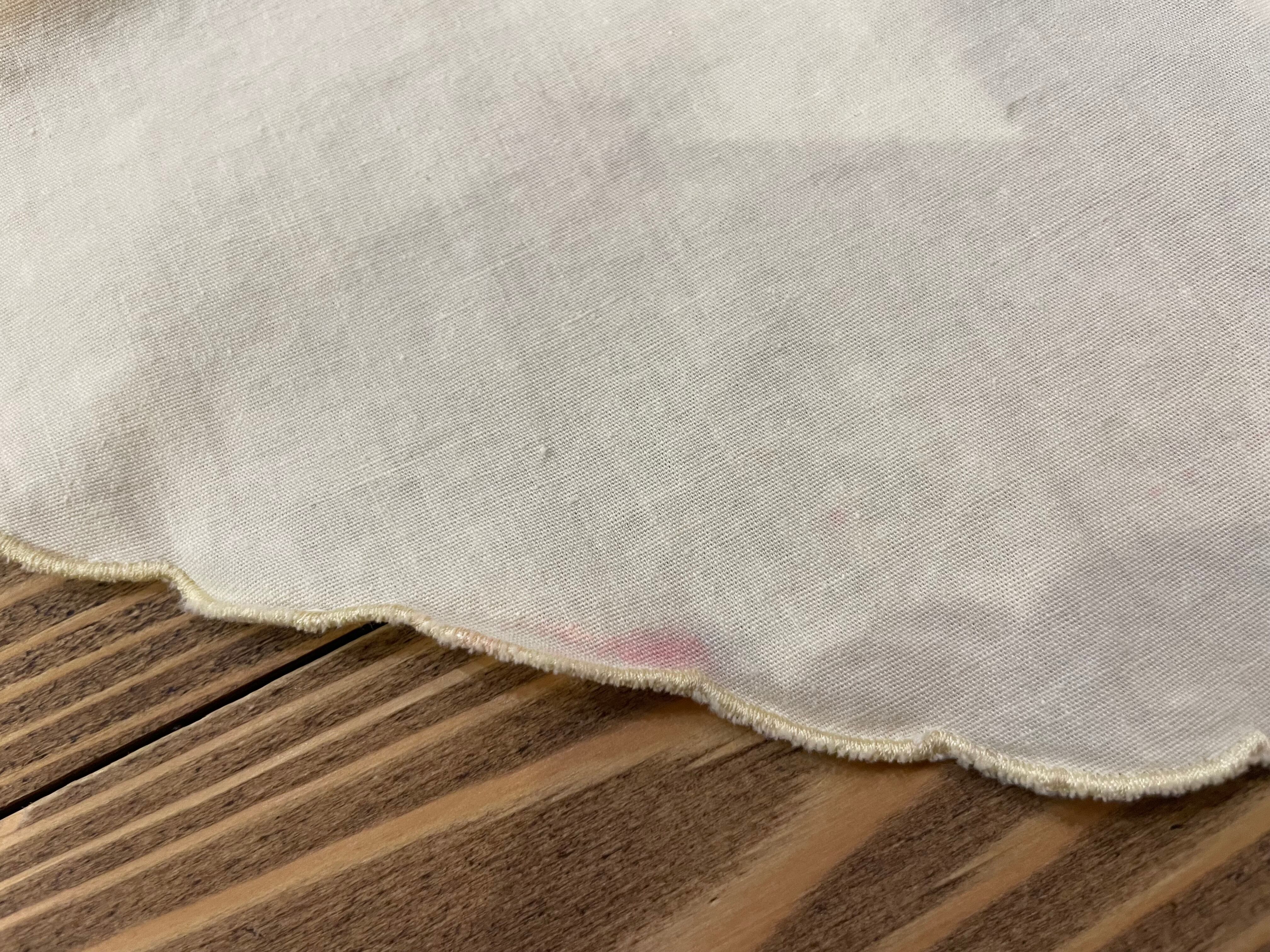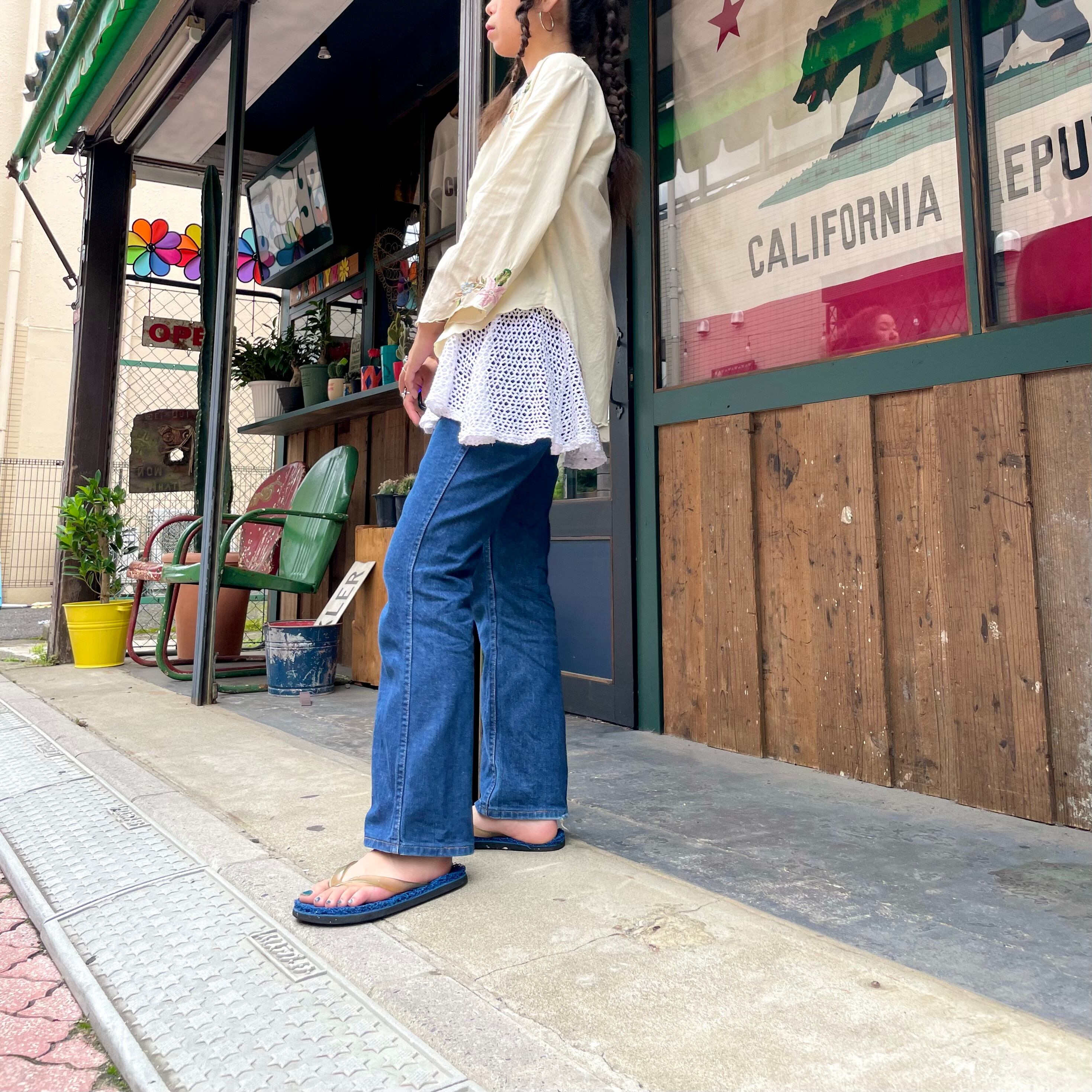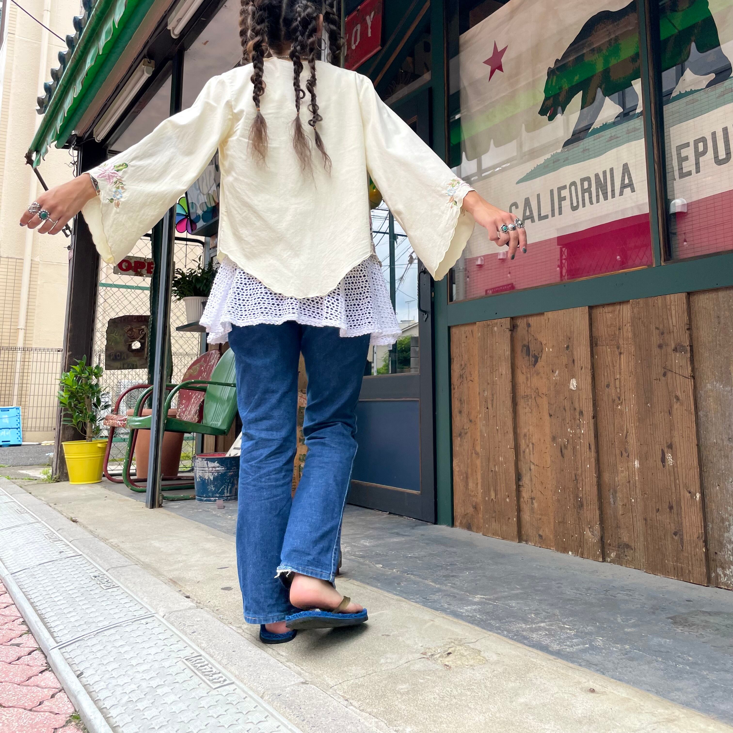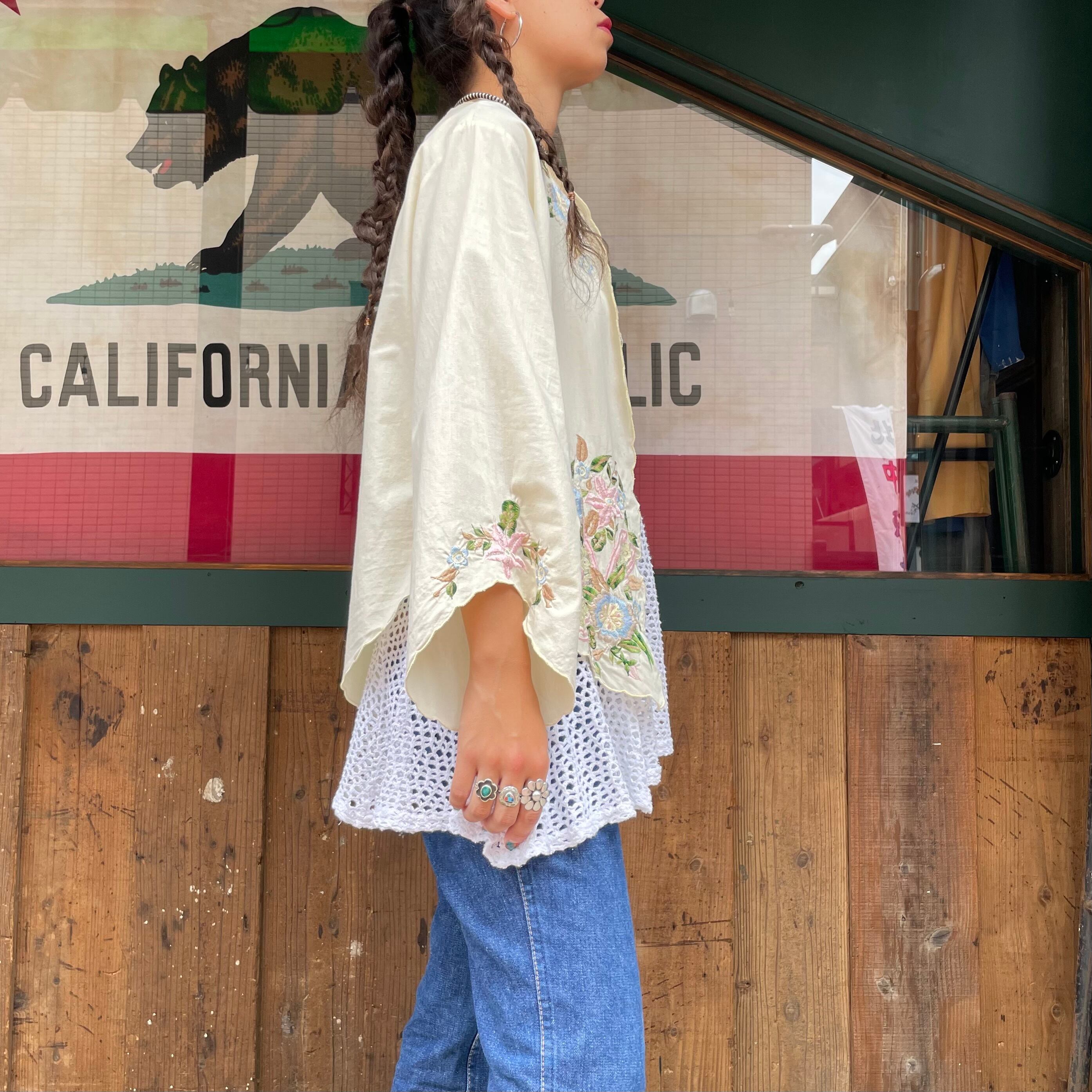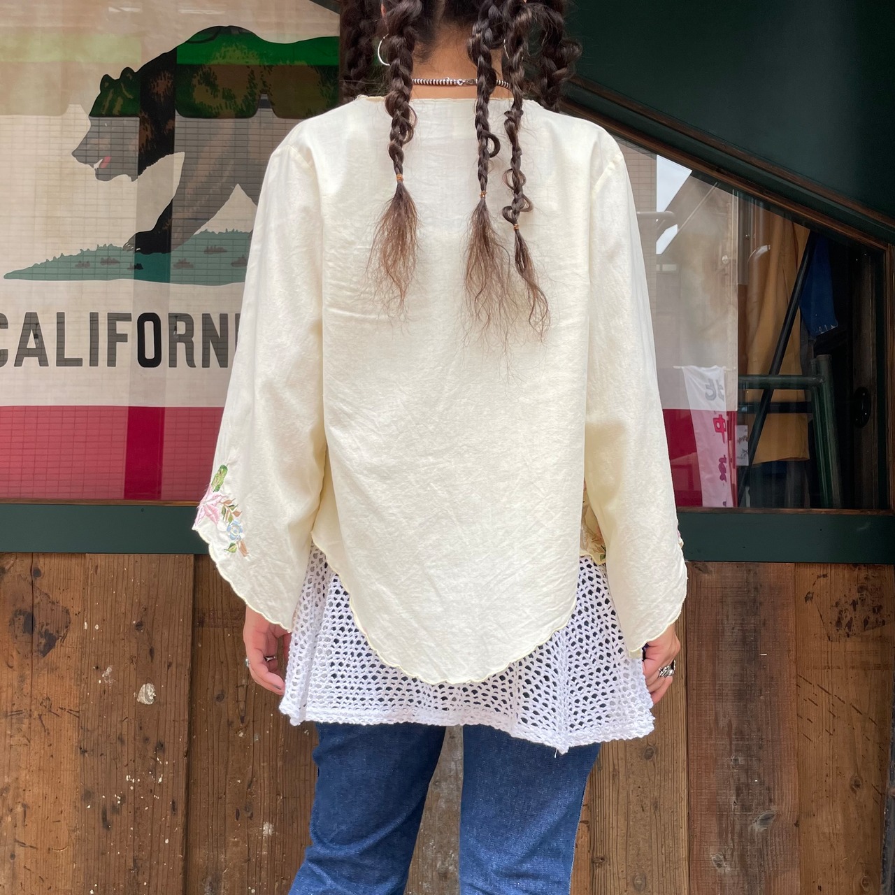 フレアスリーブで袖口にも刺繍があり、生地の端は全てスカラップになっていたら、素敵なデザインです。サイドが短くなっているシルエットがおもしろいのでいろんなコーディネートが楽しめそうな一枚です。