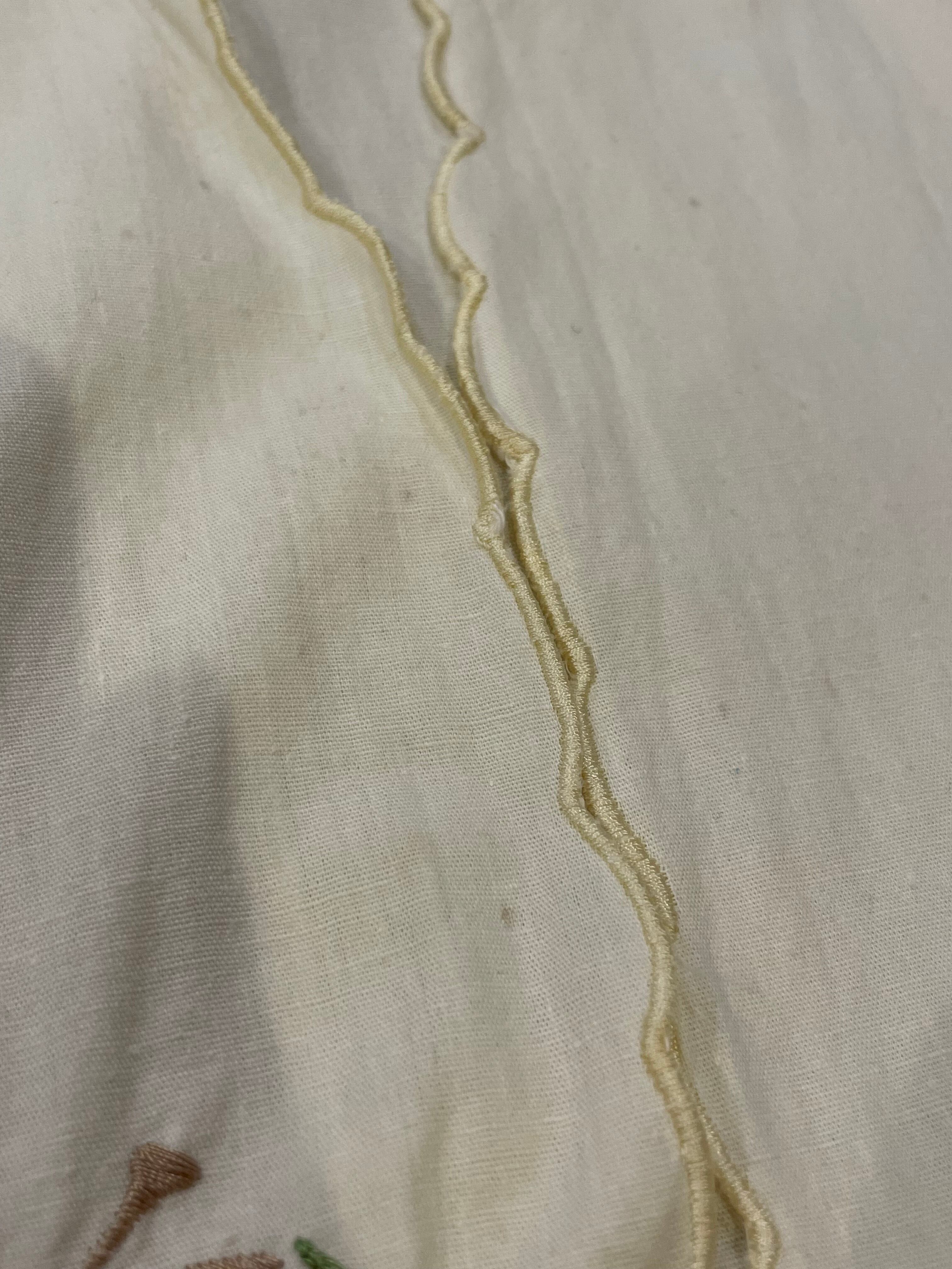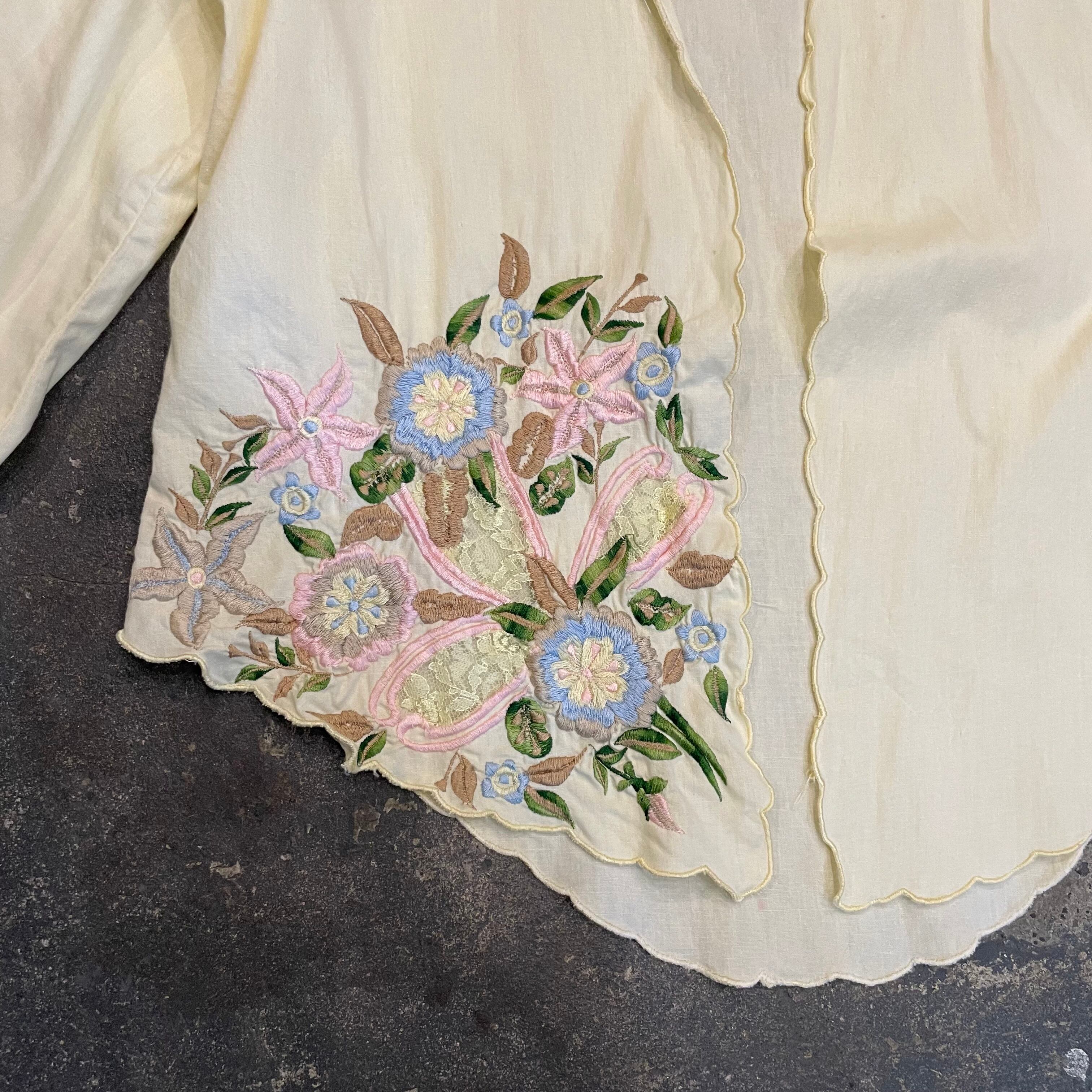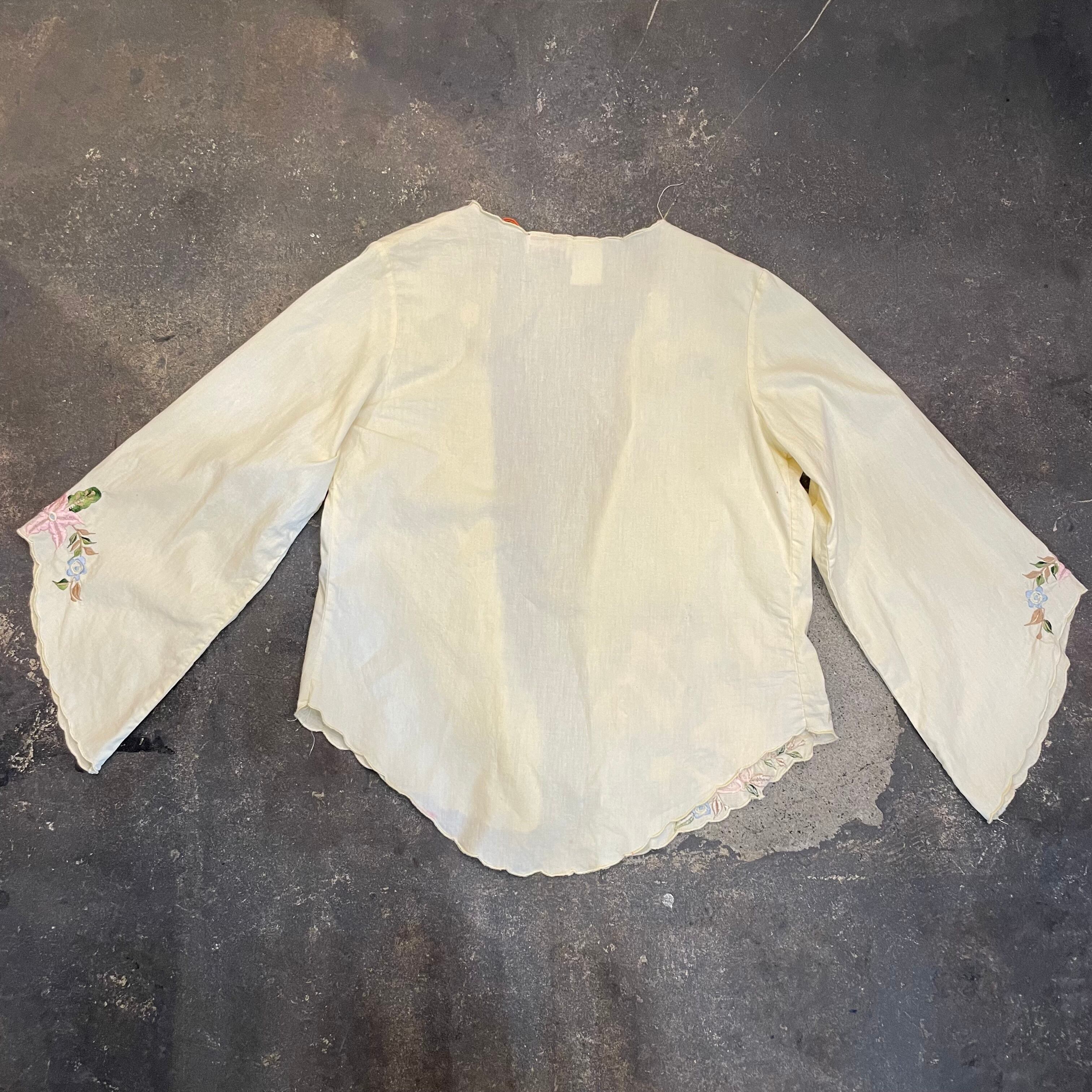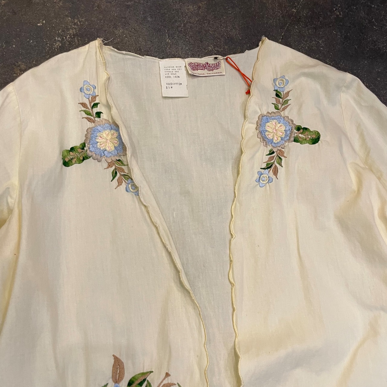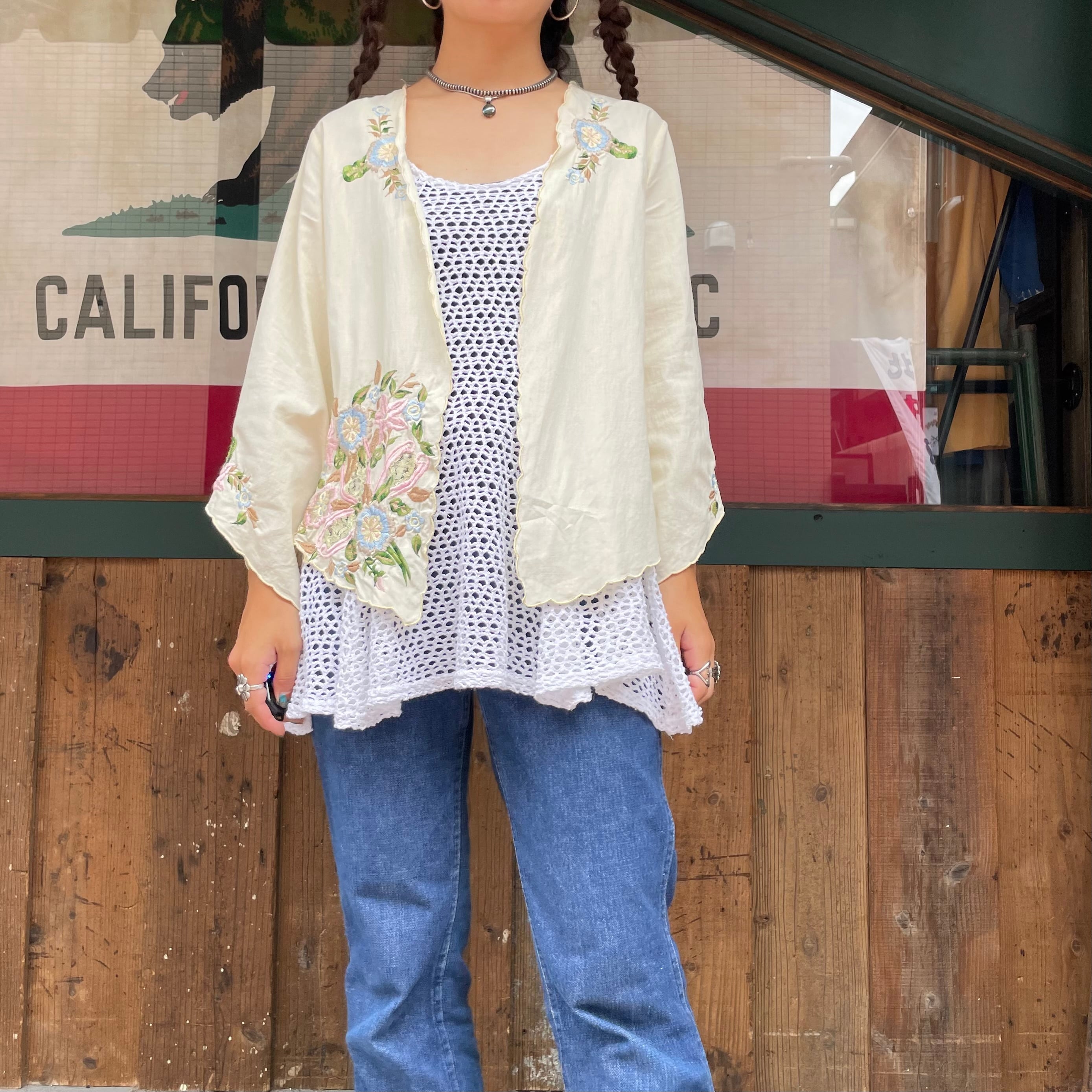 クリームっぽい優しい色味に爽やかなお花の刺繍がかわいい羽織りです。