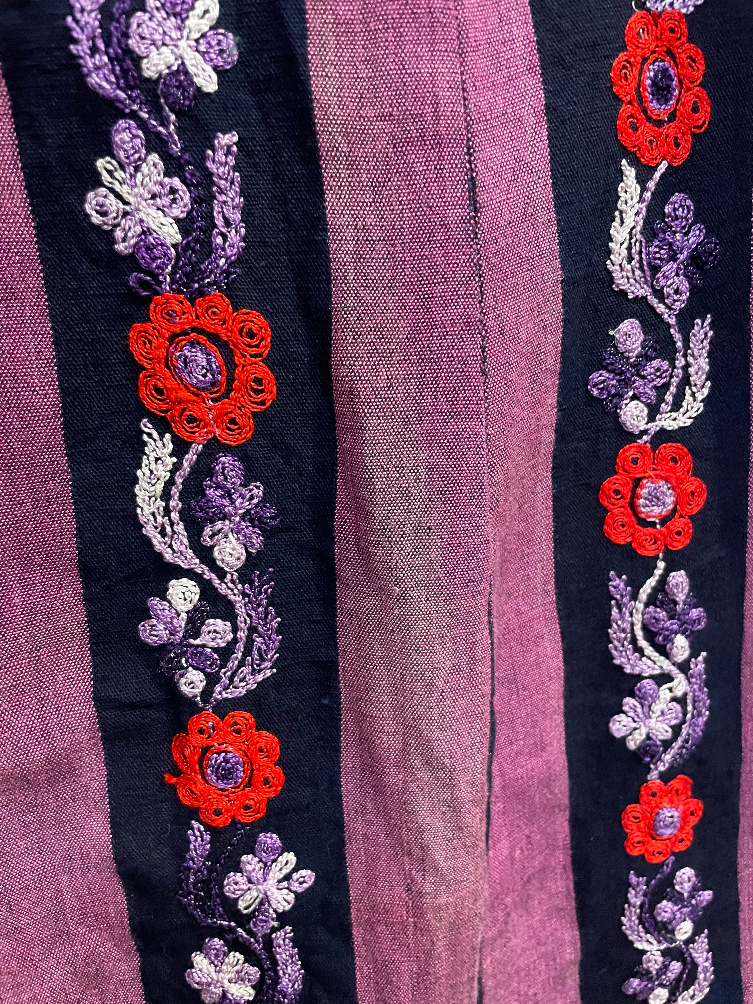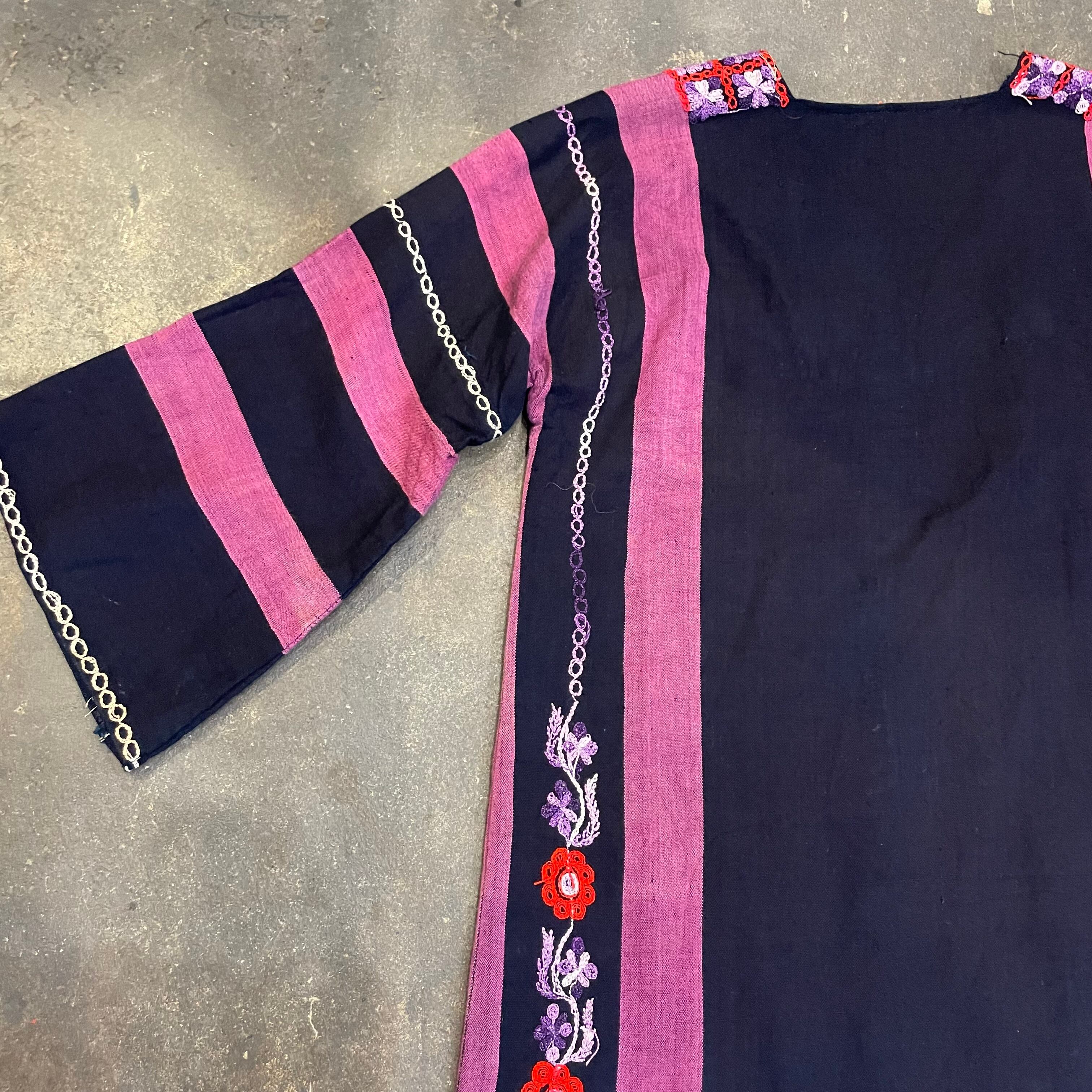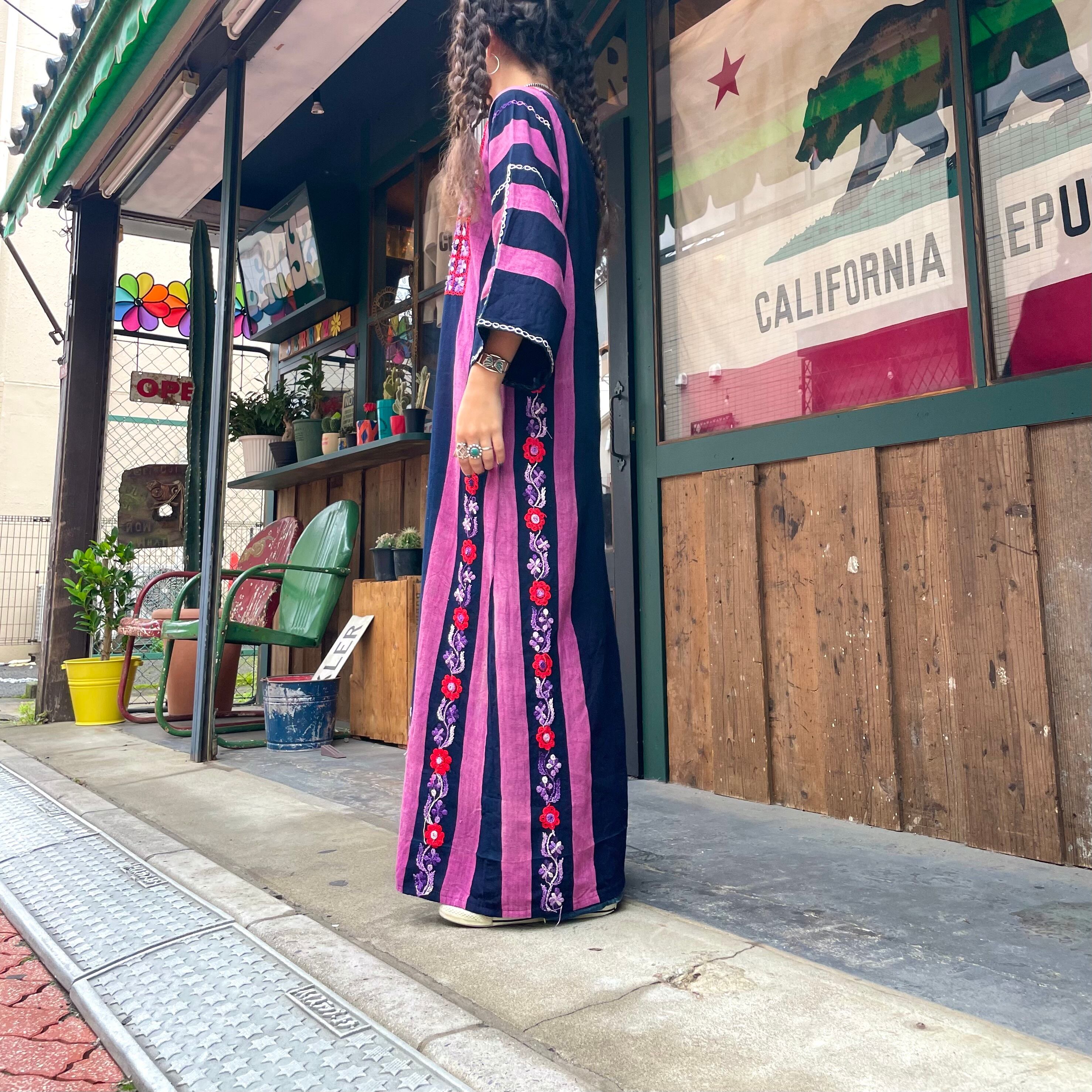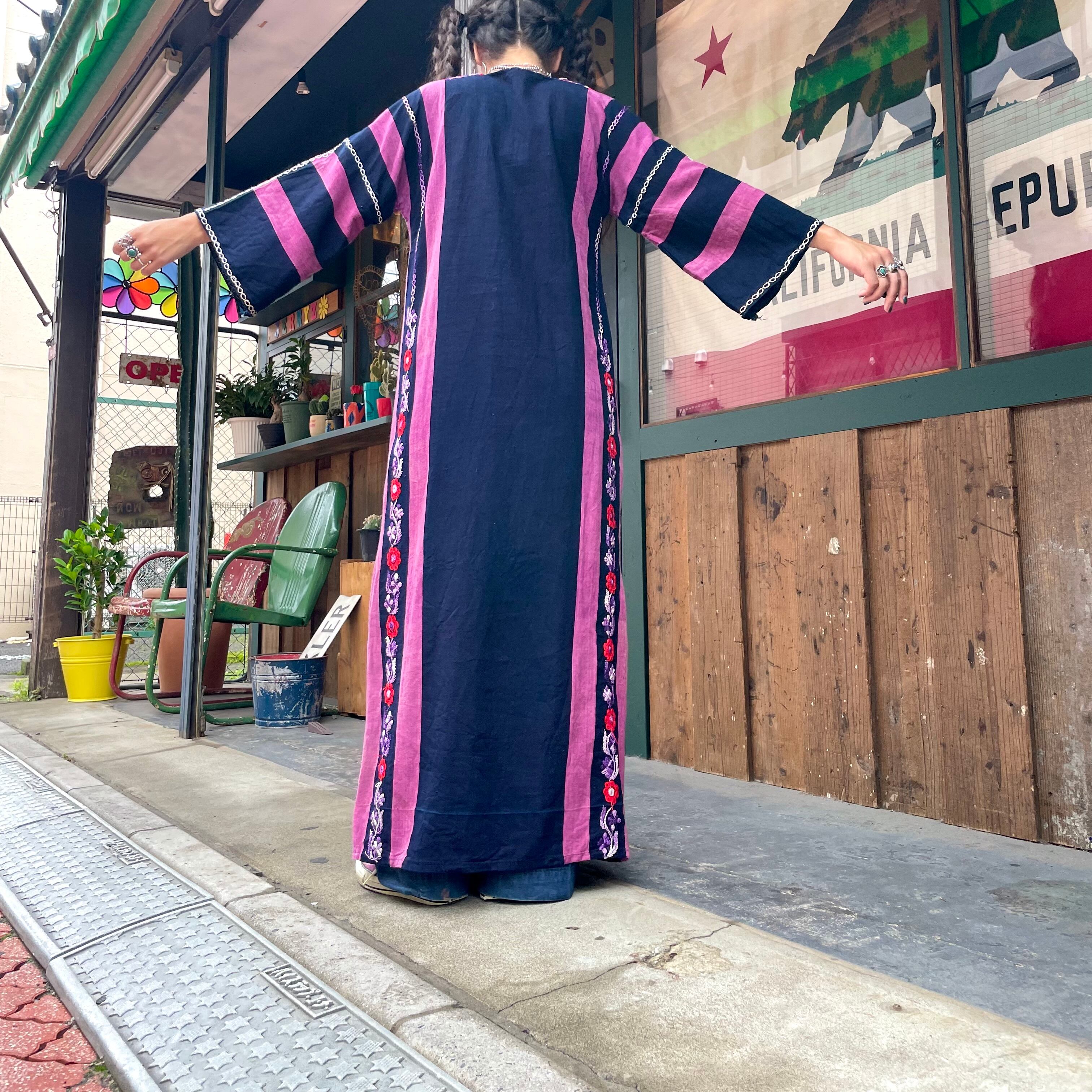 ネイビー×ムラサキのボーダー、胸元びっしりな刺繍、サイドのお花の刺繍などがとても素敵なワンピースです。