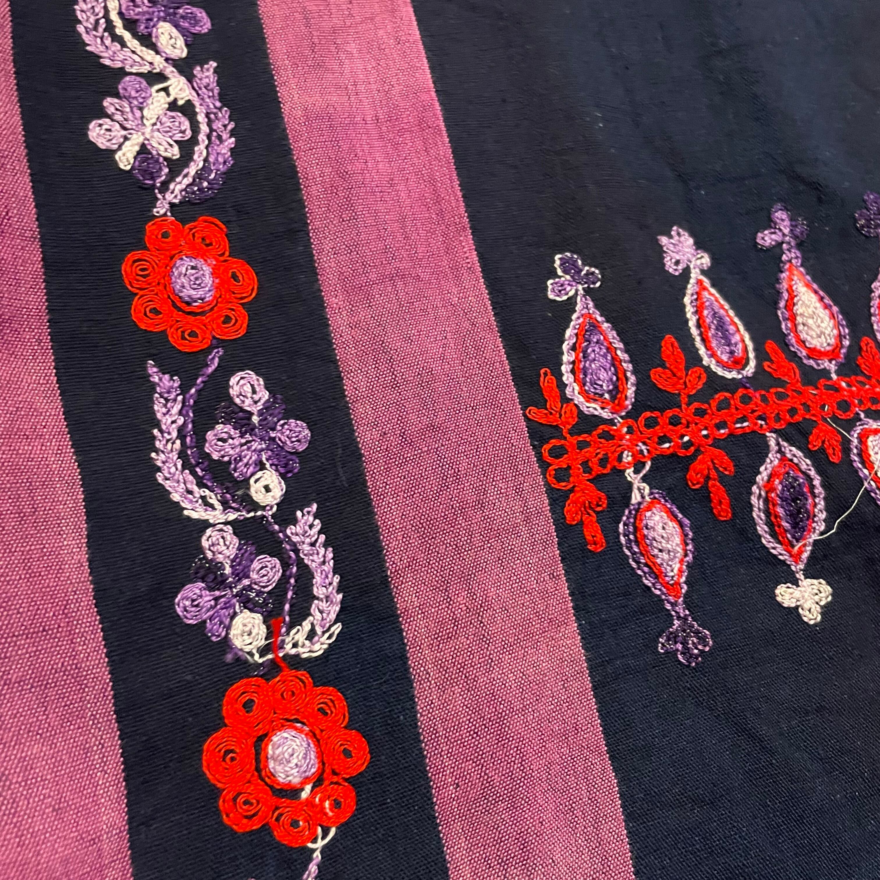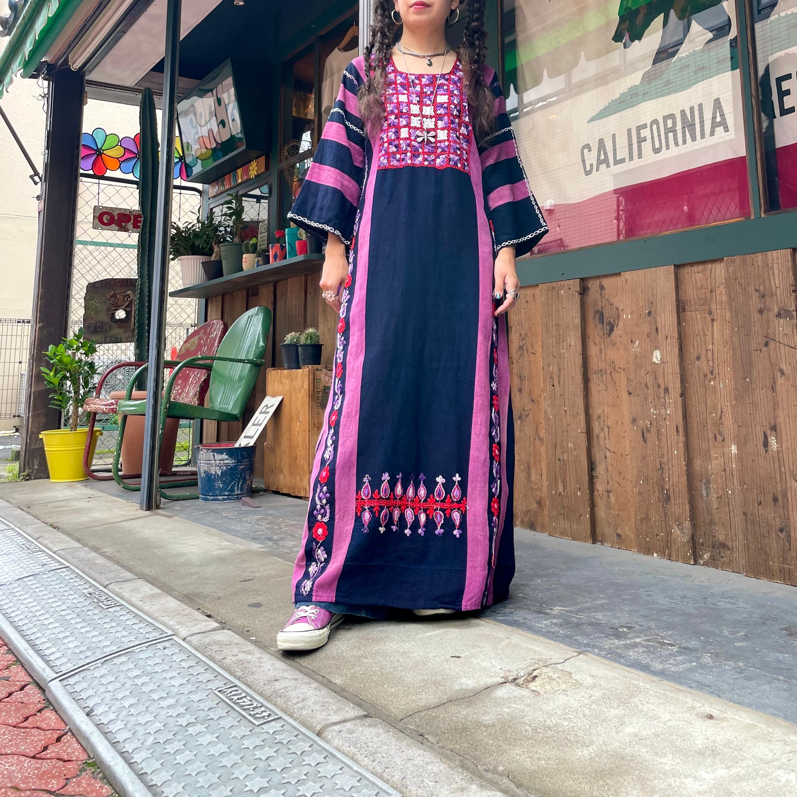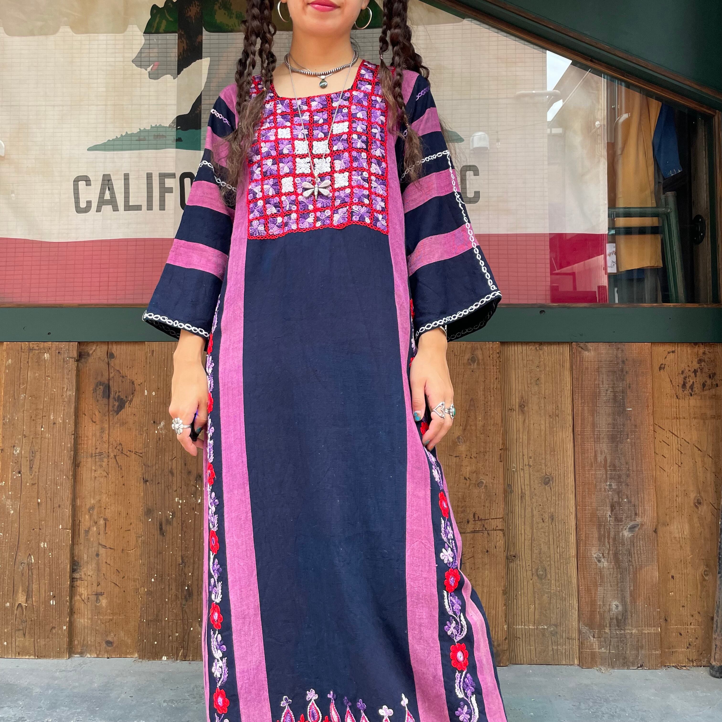 ネイビー×ムラサキのボーダー、胸元びっしりな刺繍、サイドのお花の刺繍などがとても素敵なワンピースです。