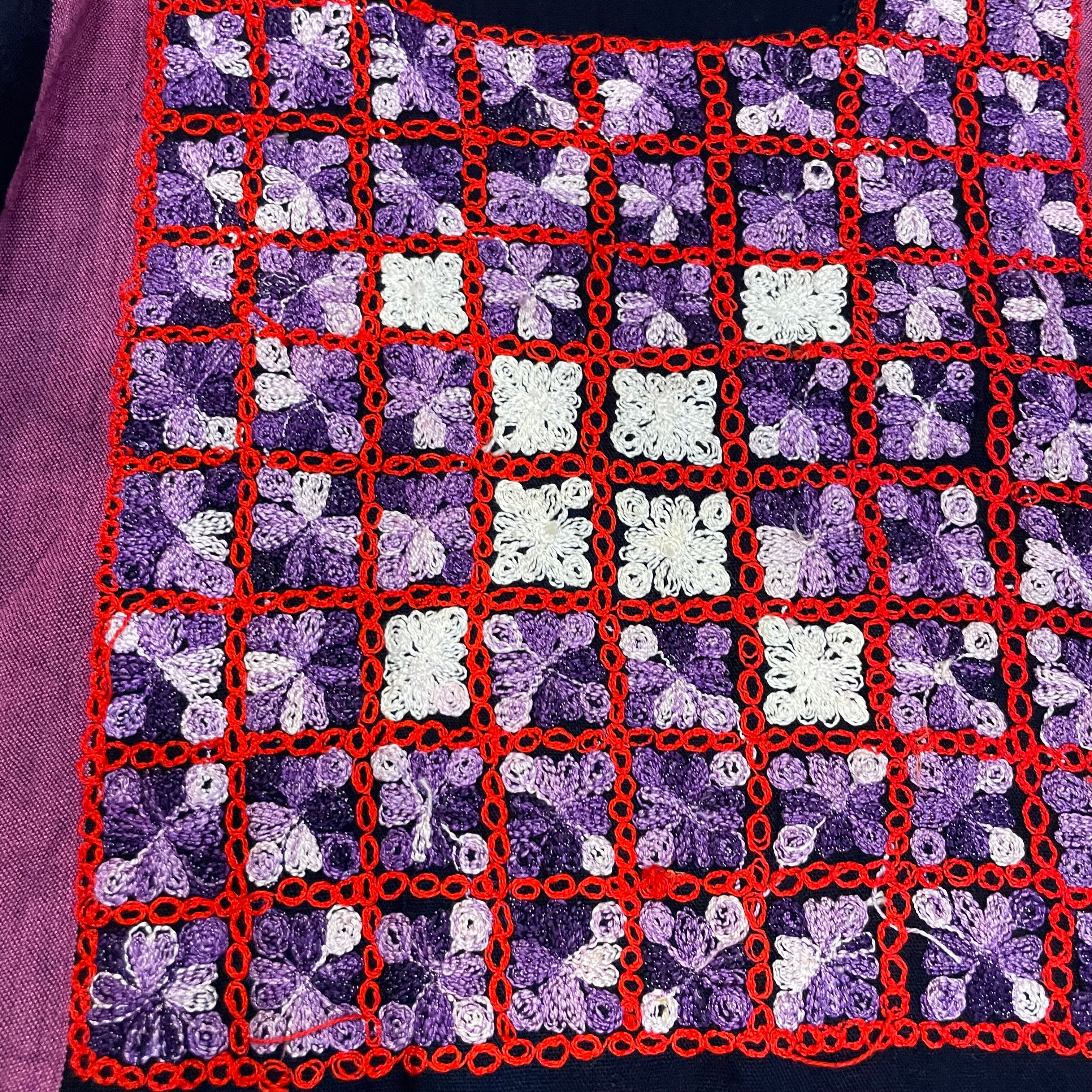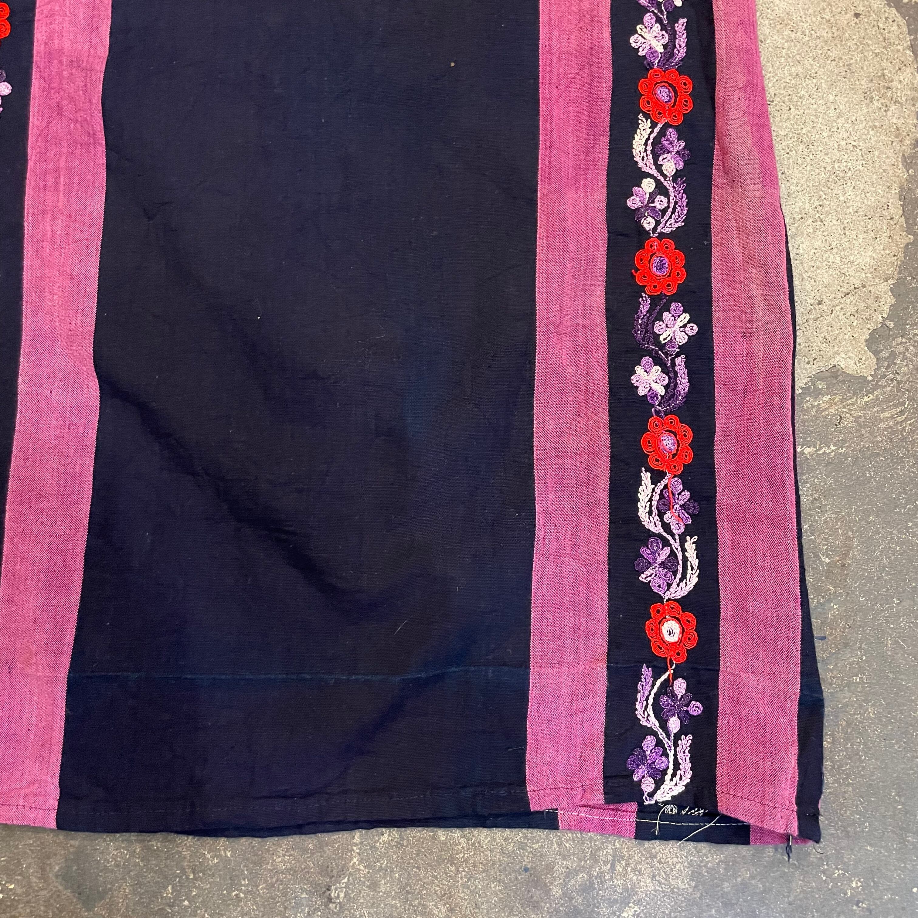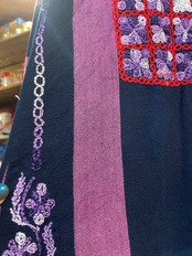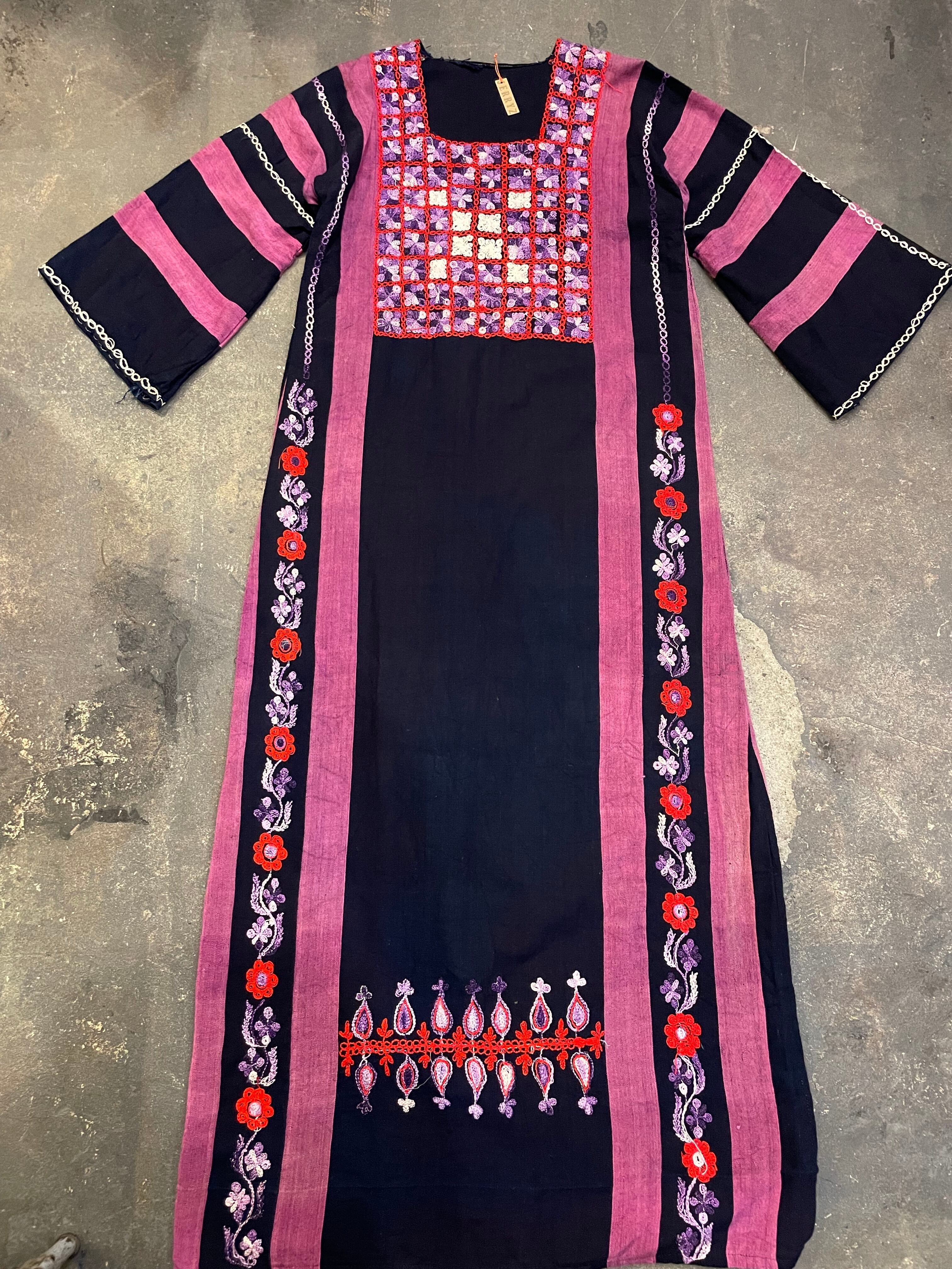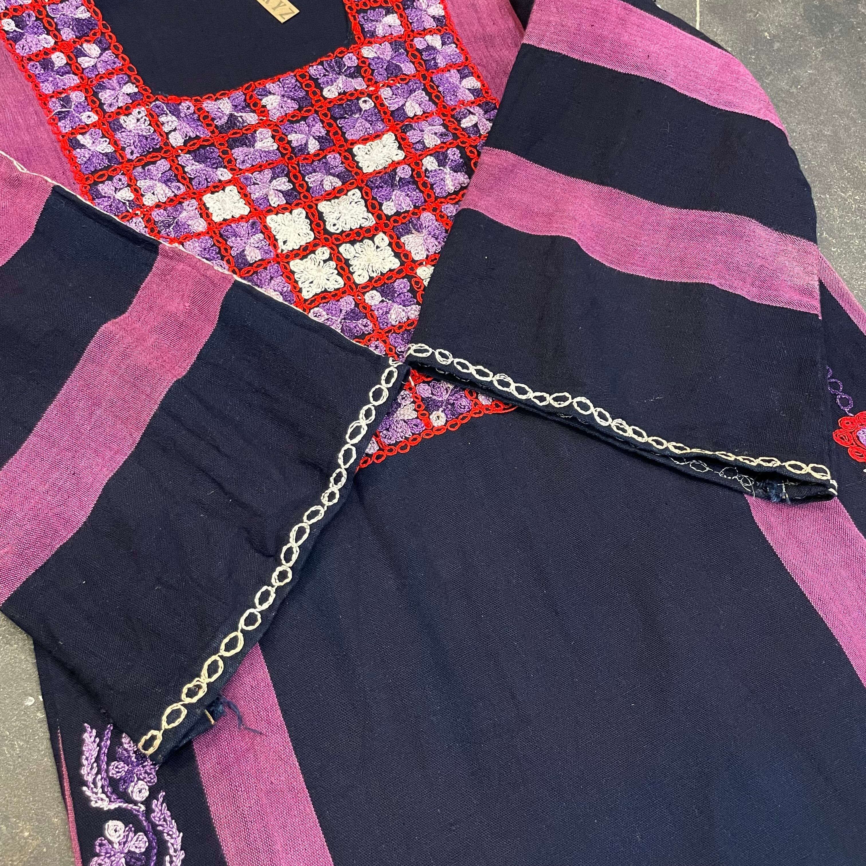 ネイビー×ムラサキのボーダー、胸元びっしりな刺繍、サイドのお花の刺繍などがとても素敵なワンピースです。