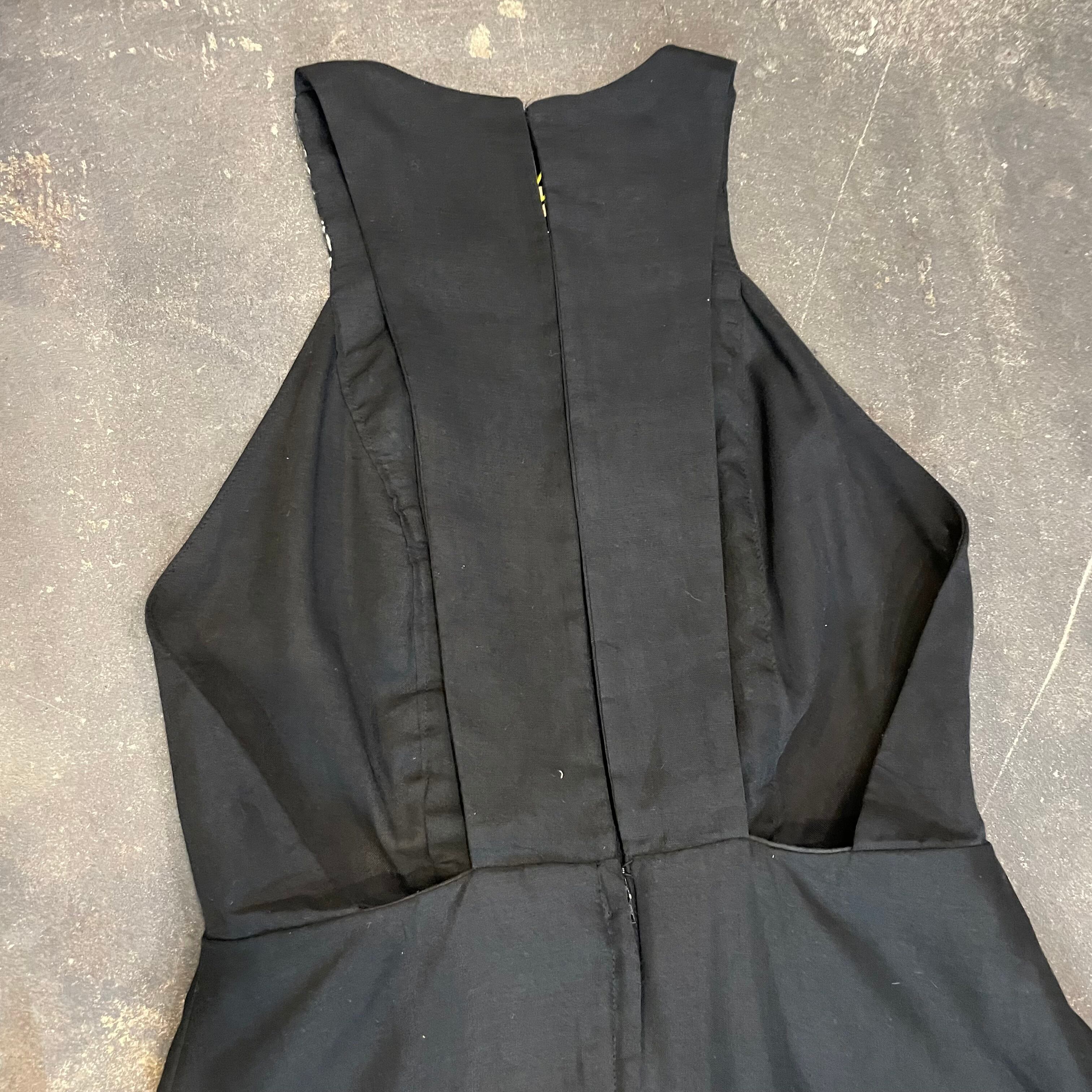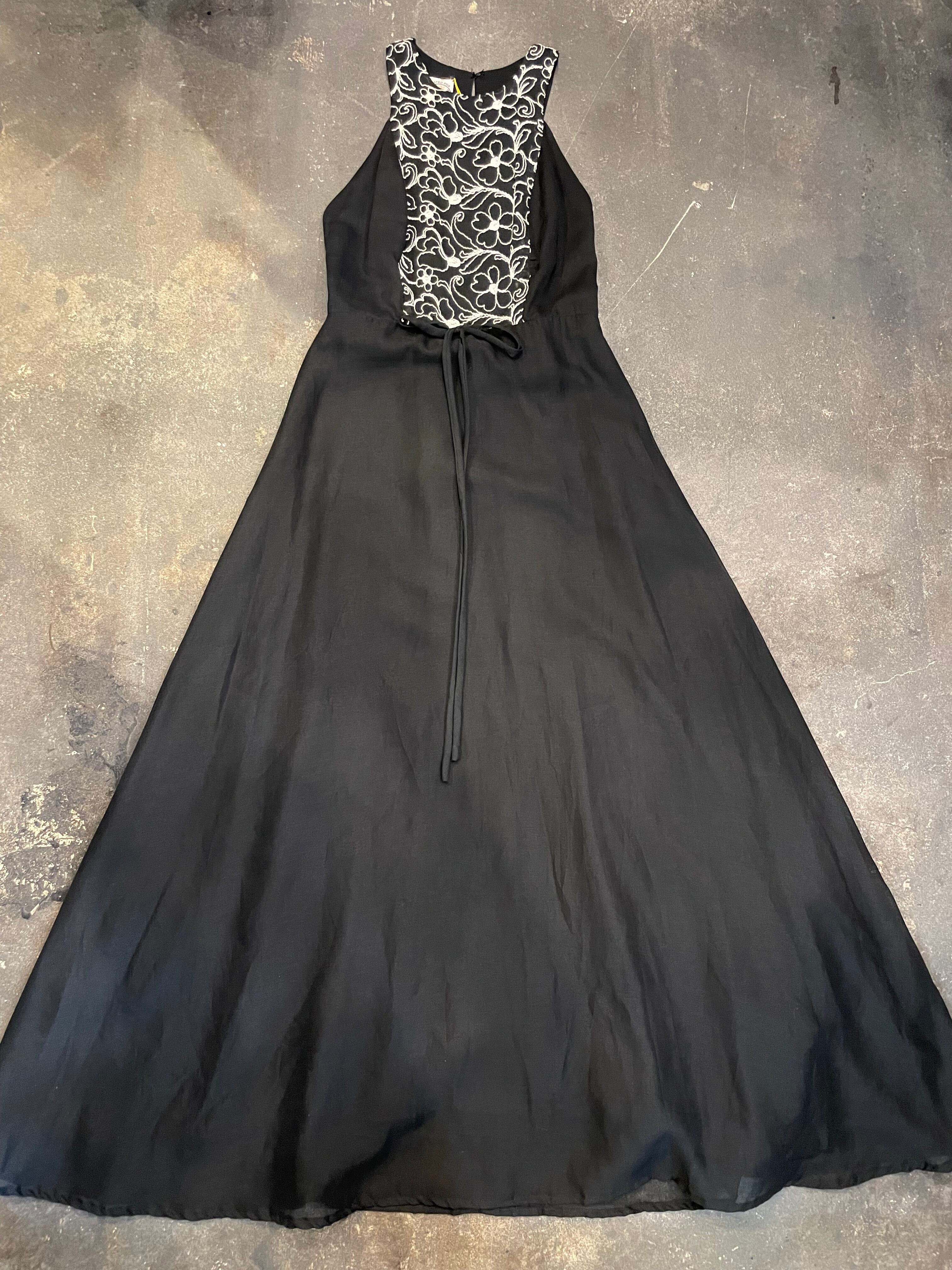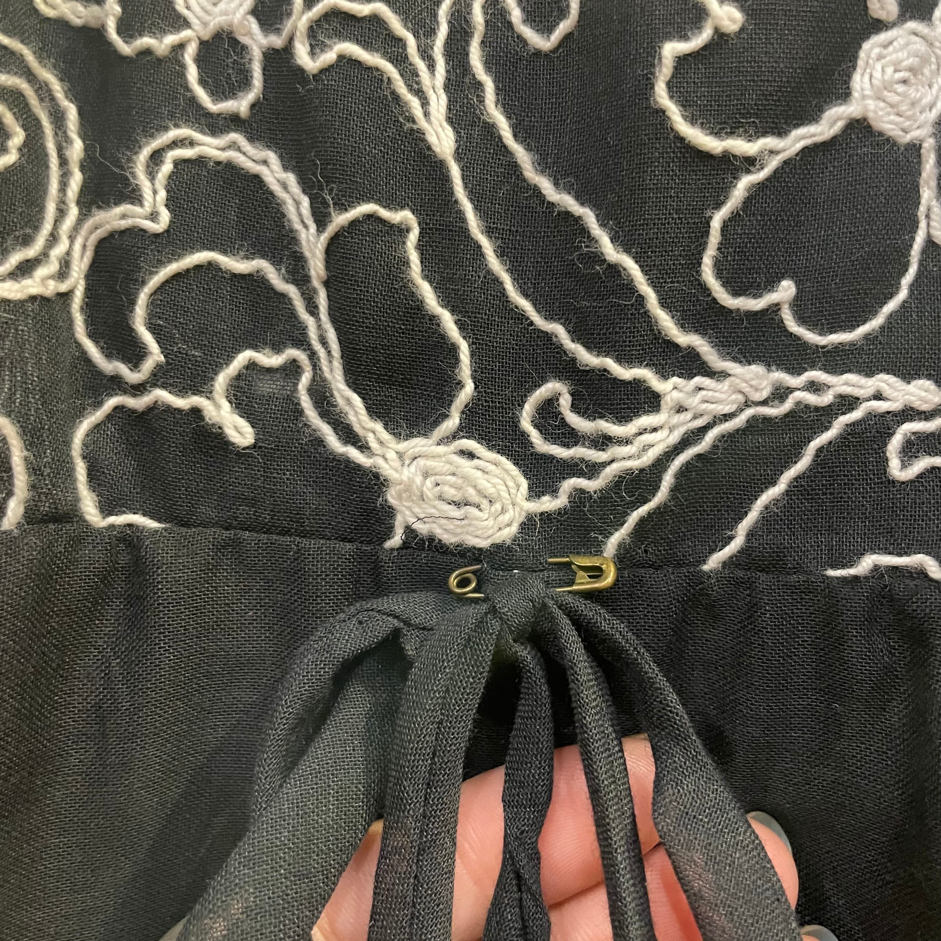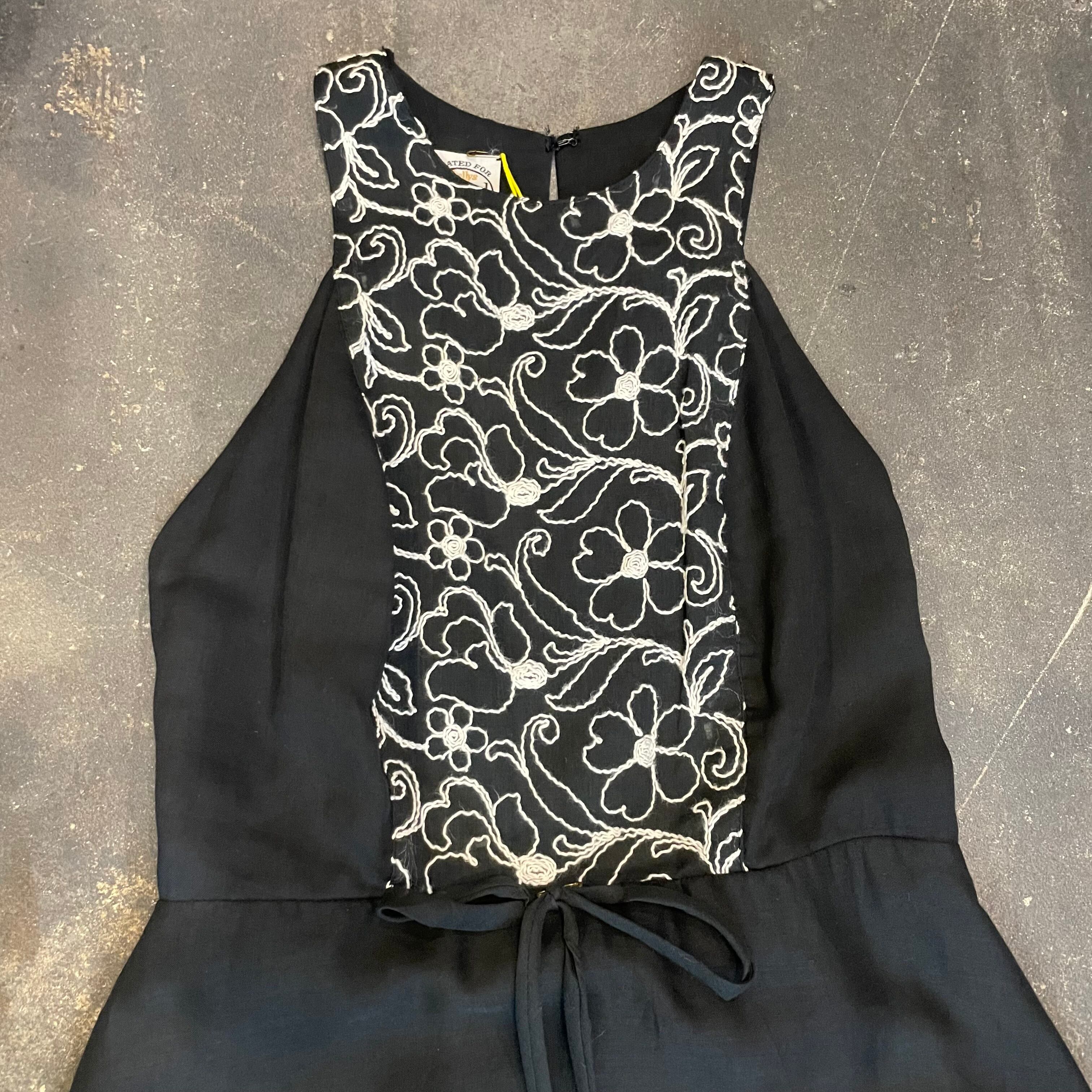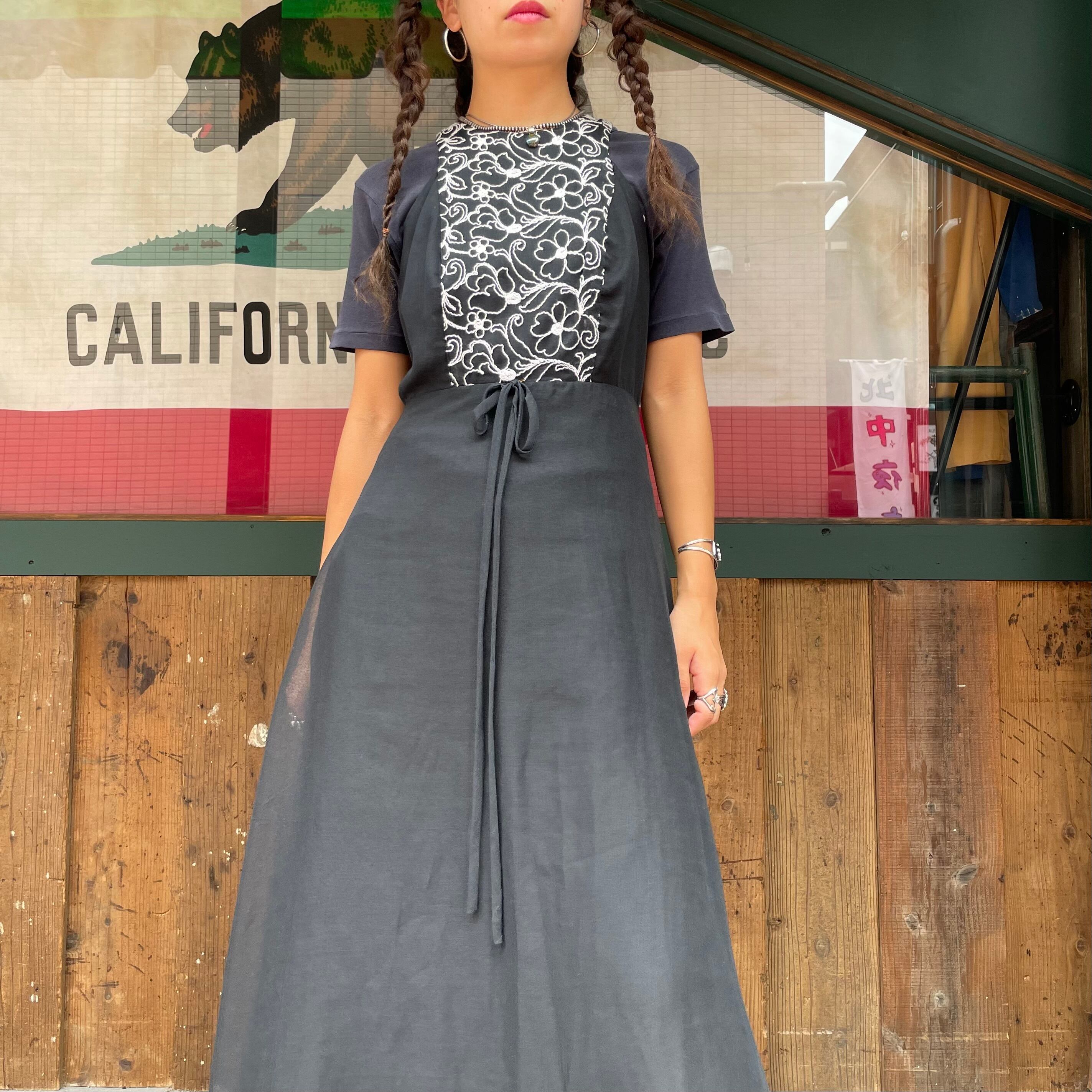 黒地に白のお花の刺繍でモノトーンなところが素敵な、シルエットがとても美しいワンピースです。