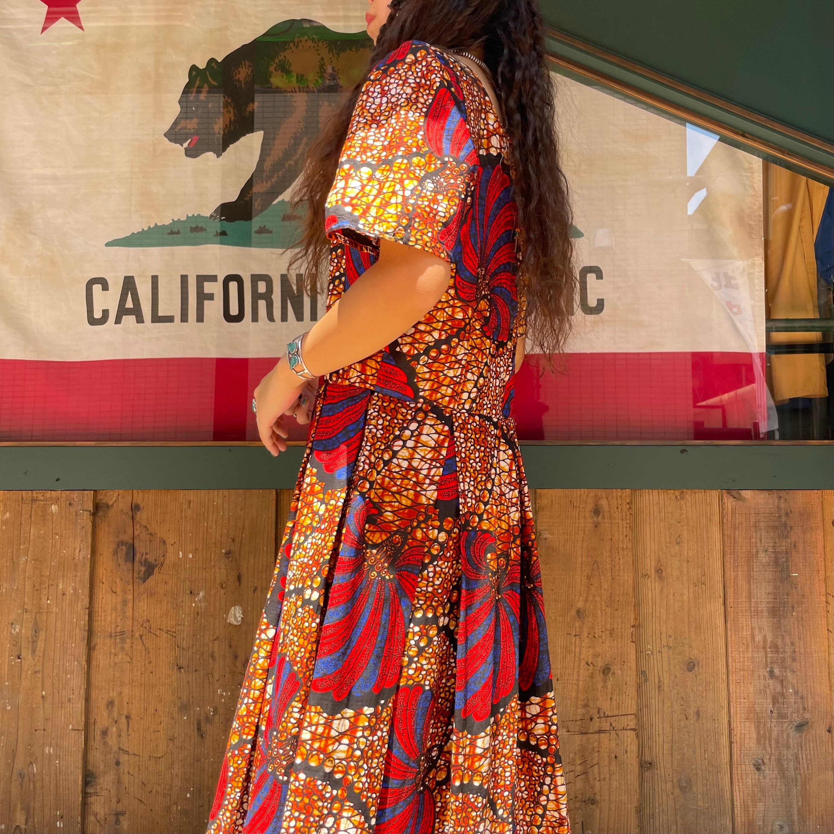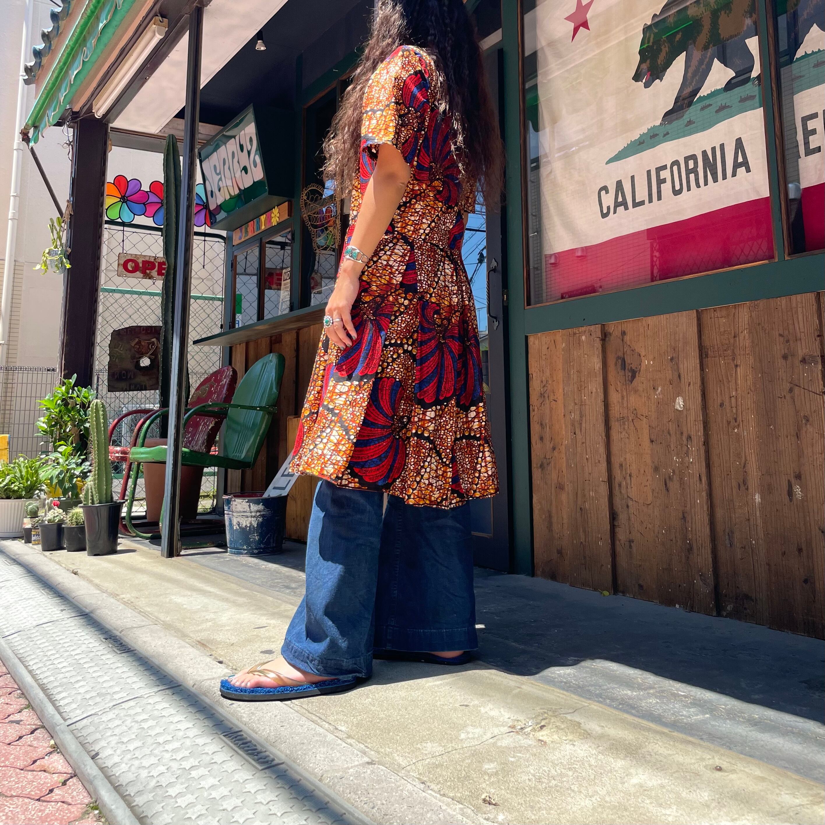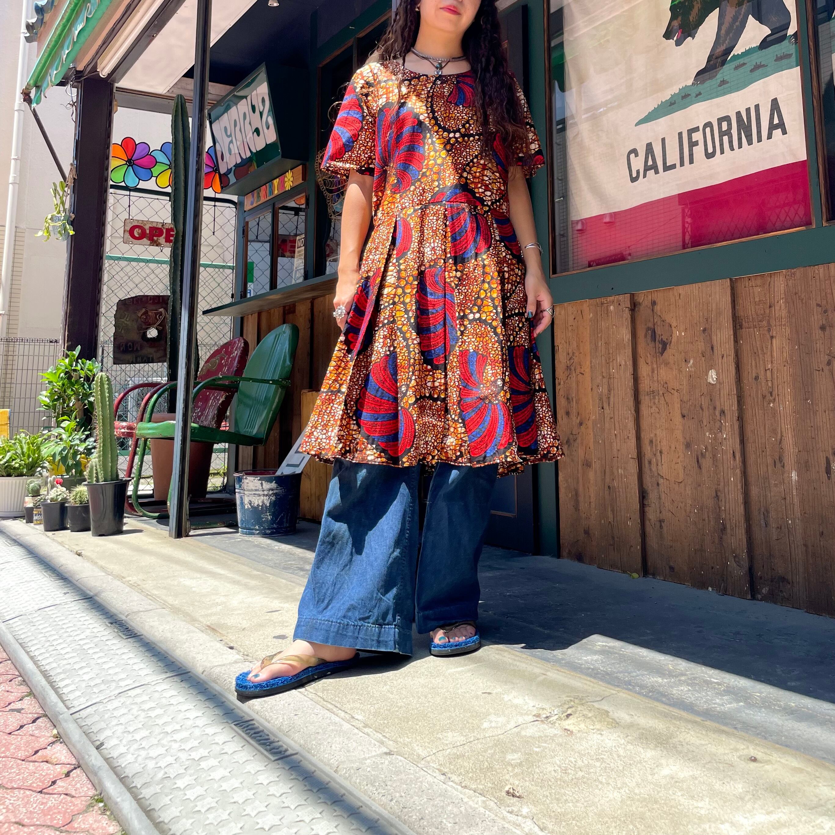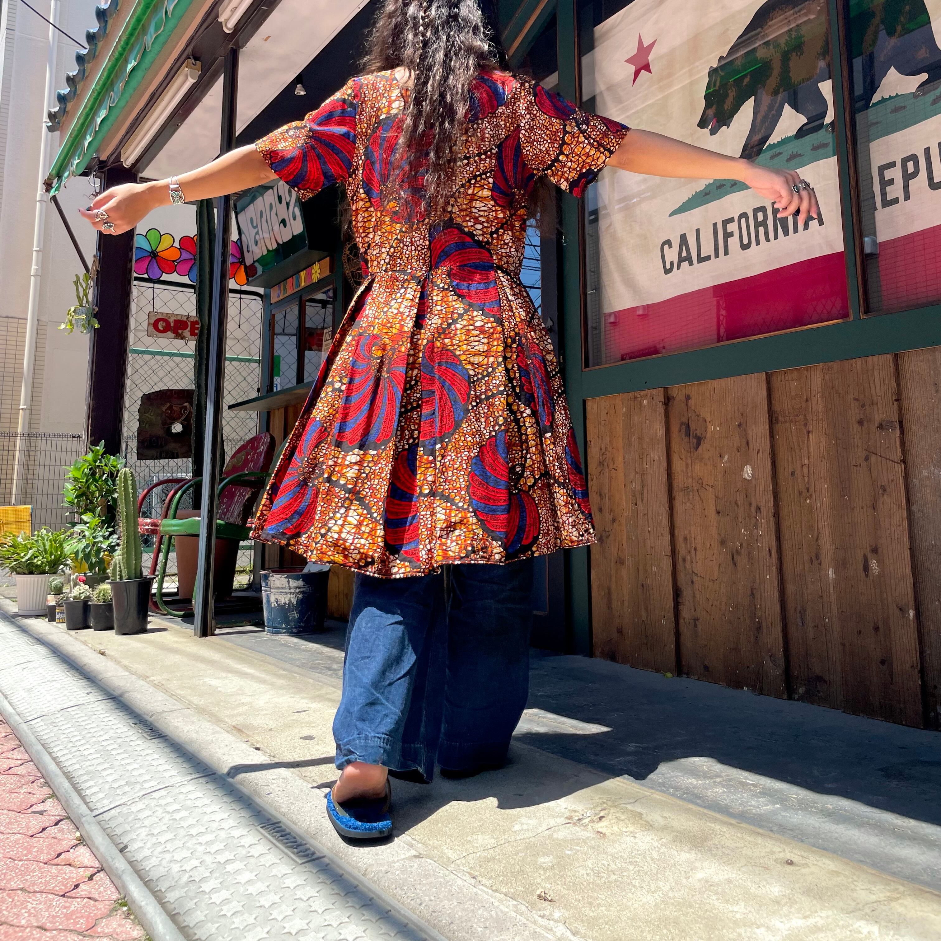 アフリカンバティック独特な色合わせや不思議な思い切りの良い柄などがとてもかわいいワンピースです。