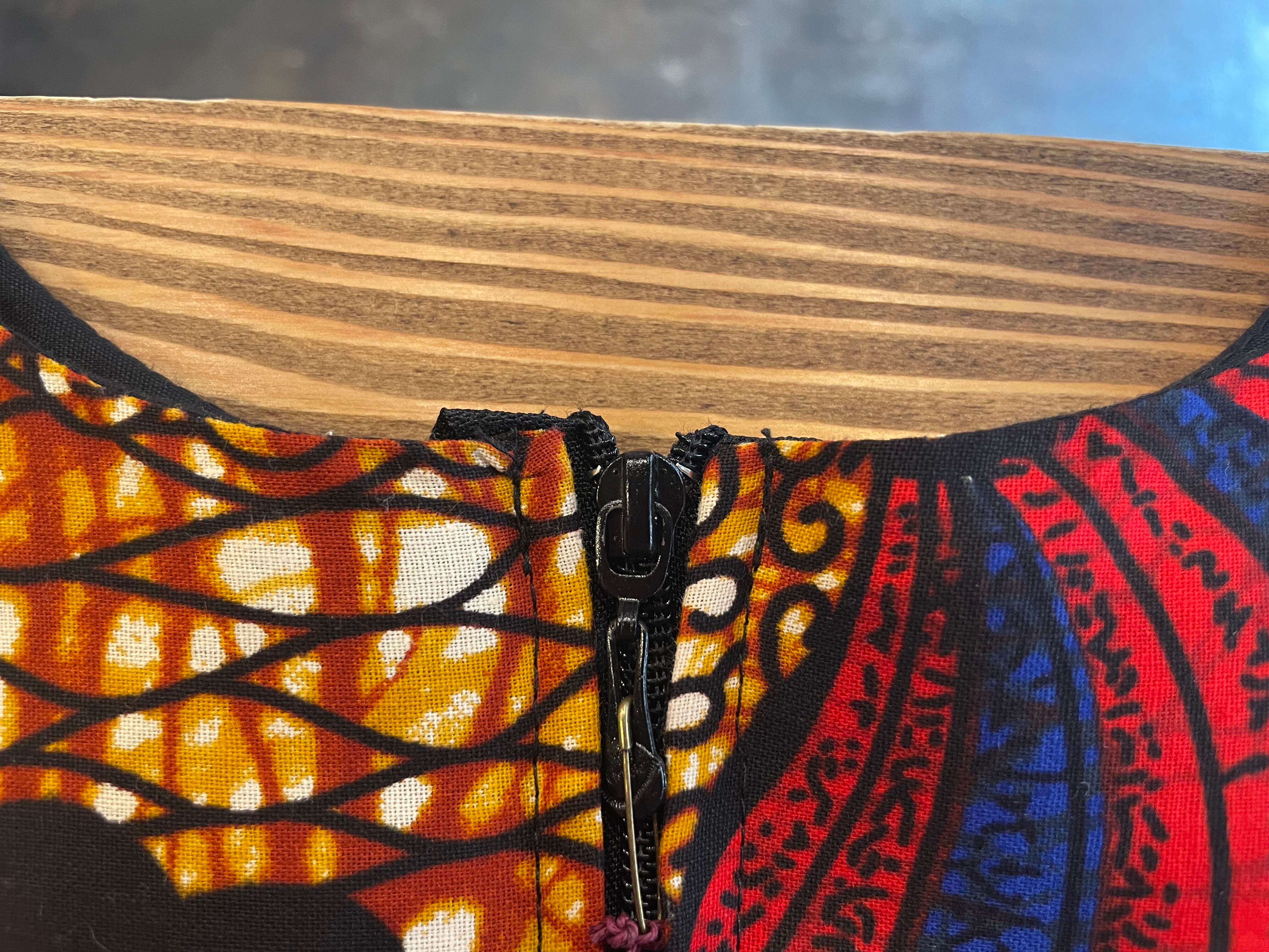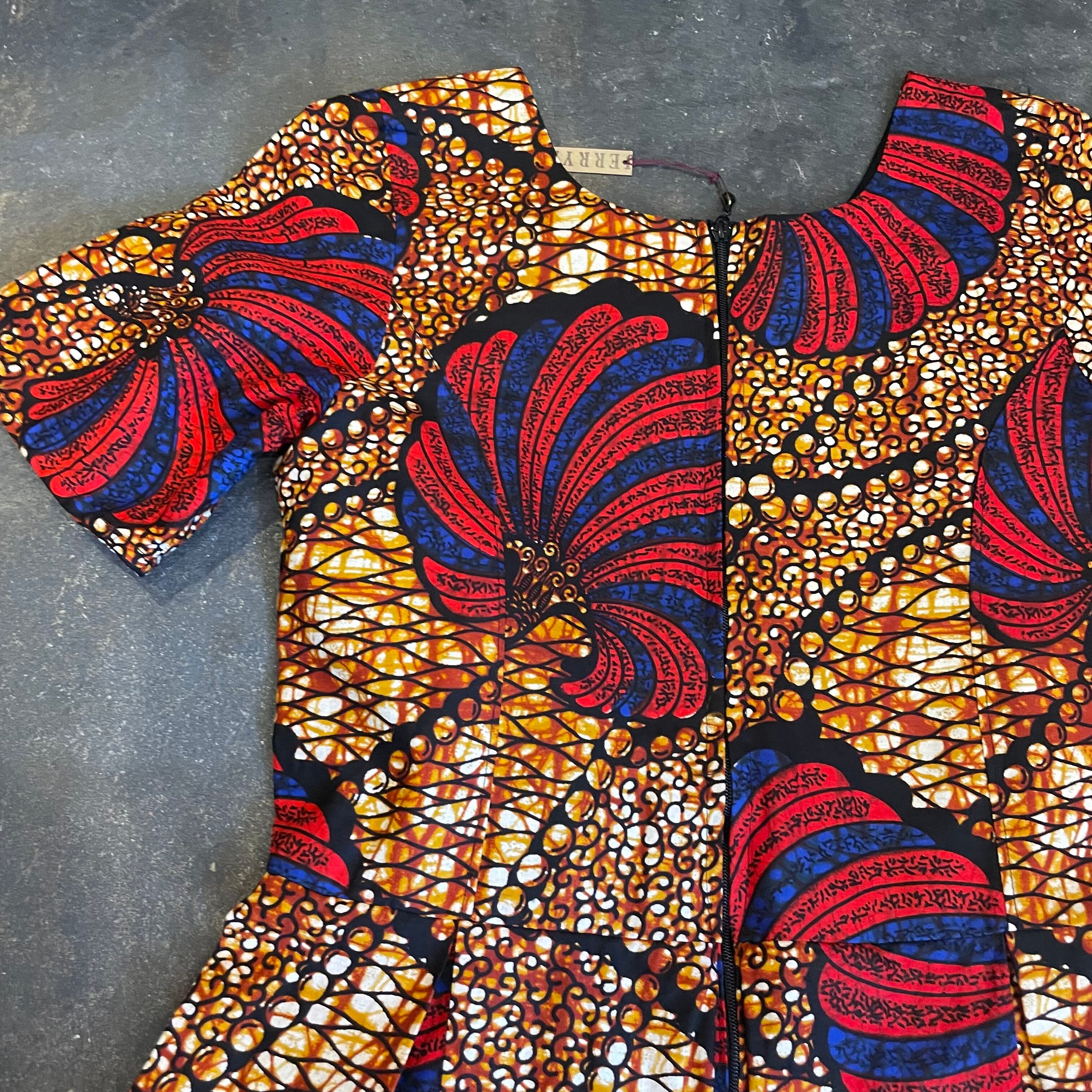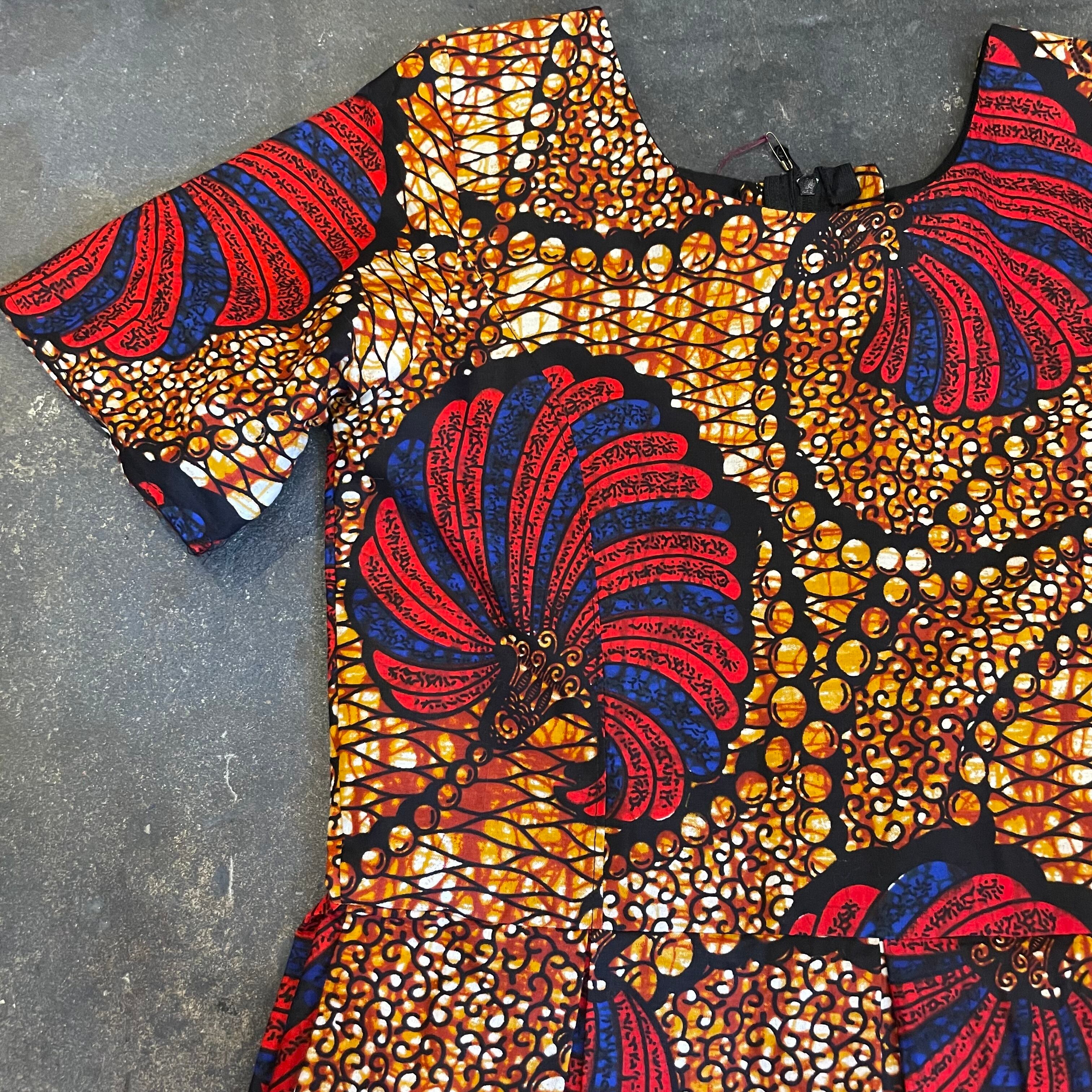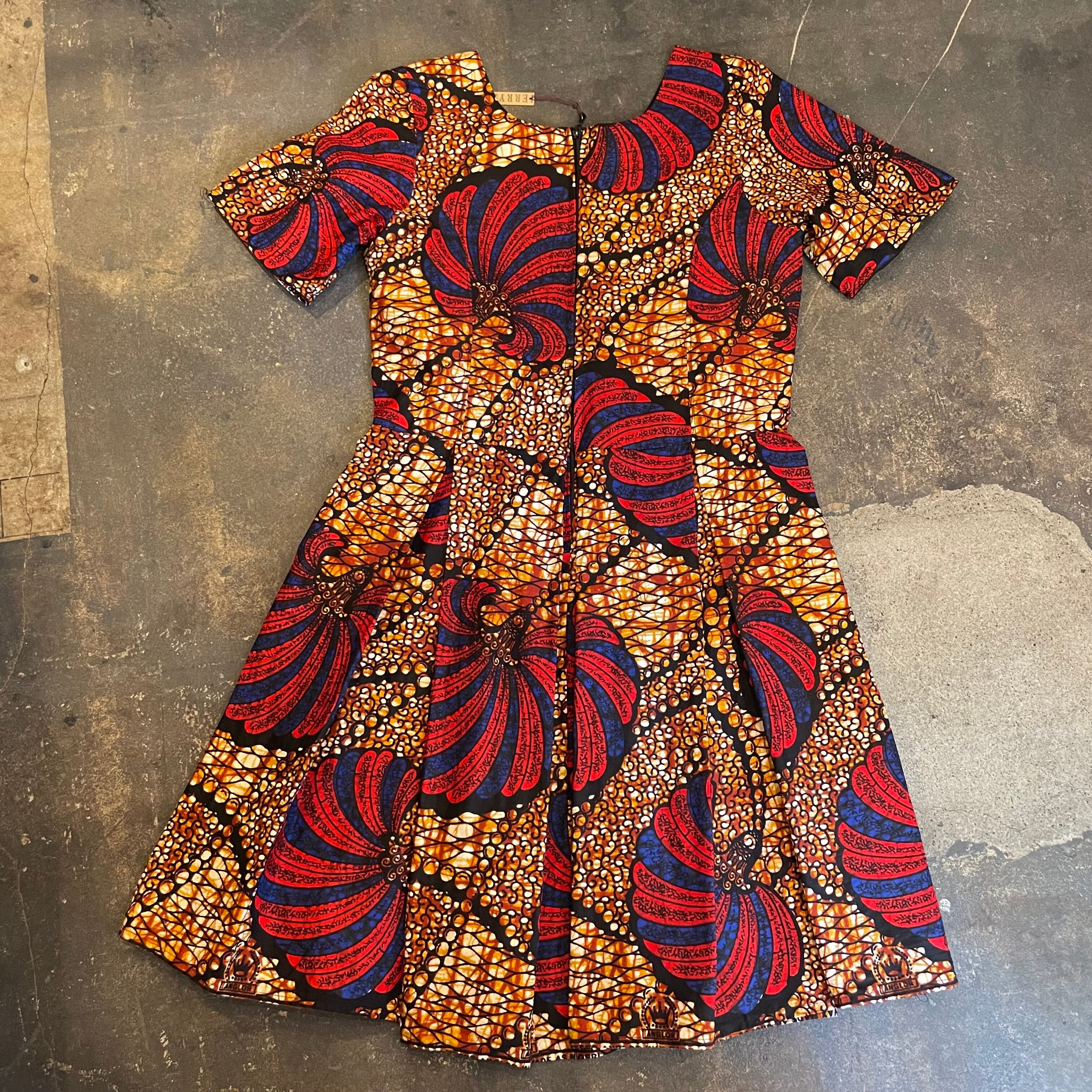 アフリカンバティック独特な色合わせや不思議な思い切りの良い柄などがとてもかわいいワンピースです。