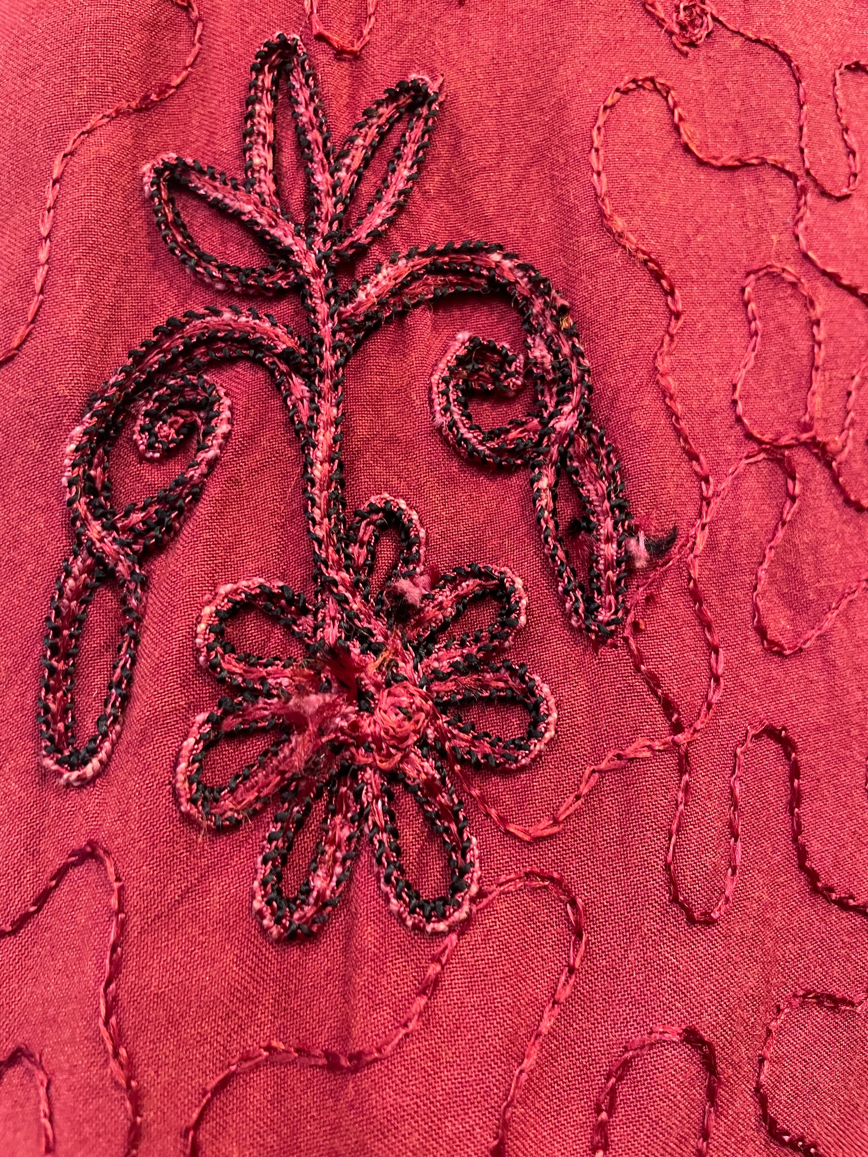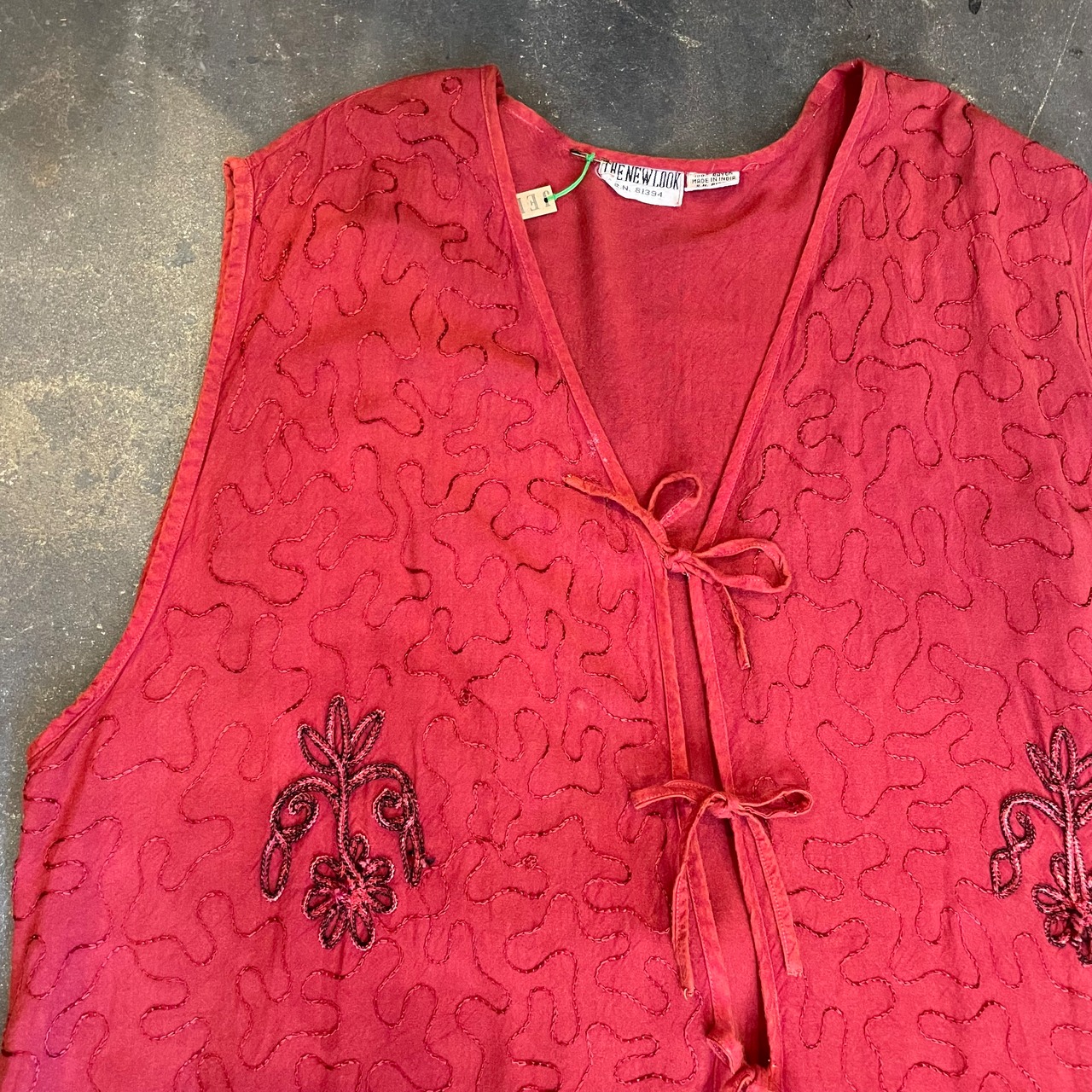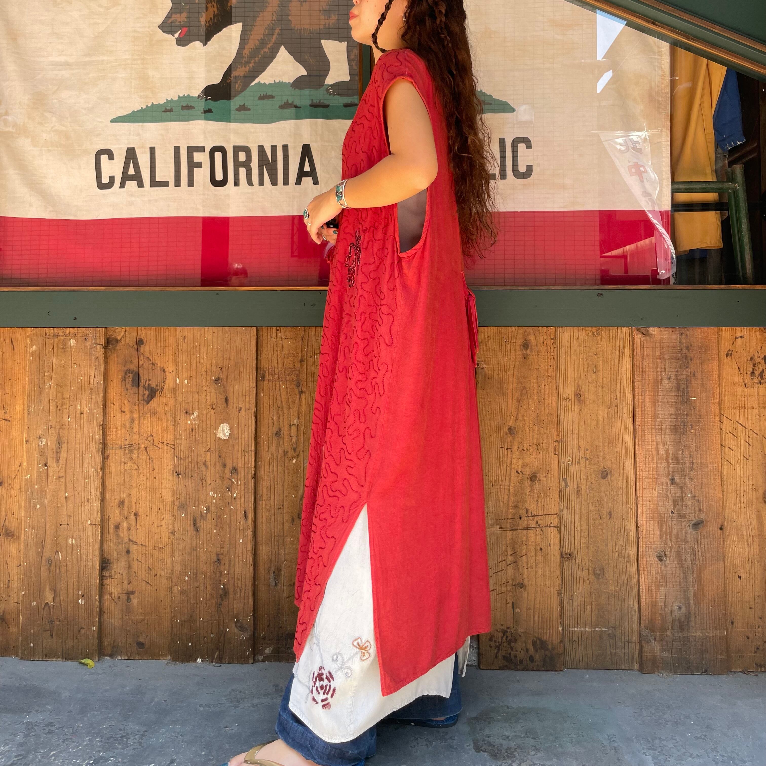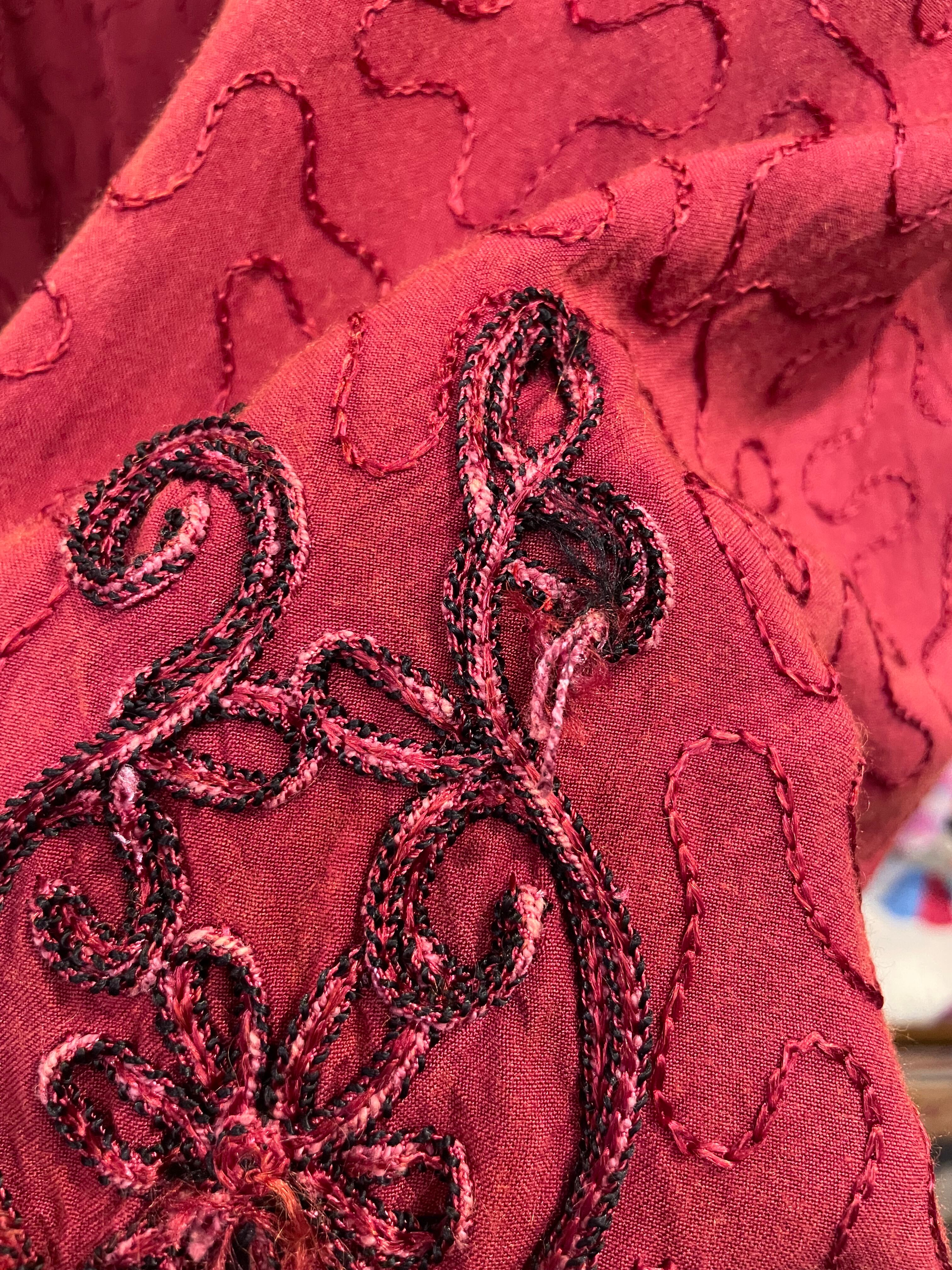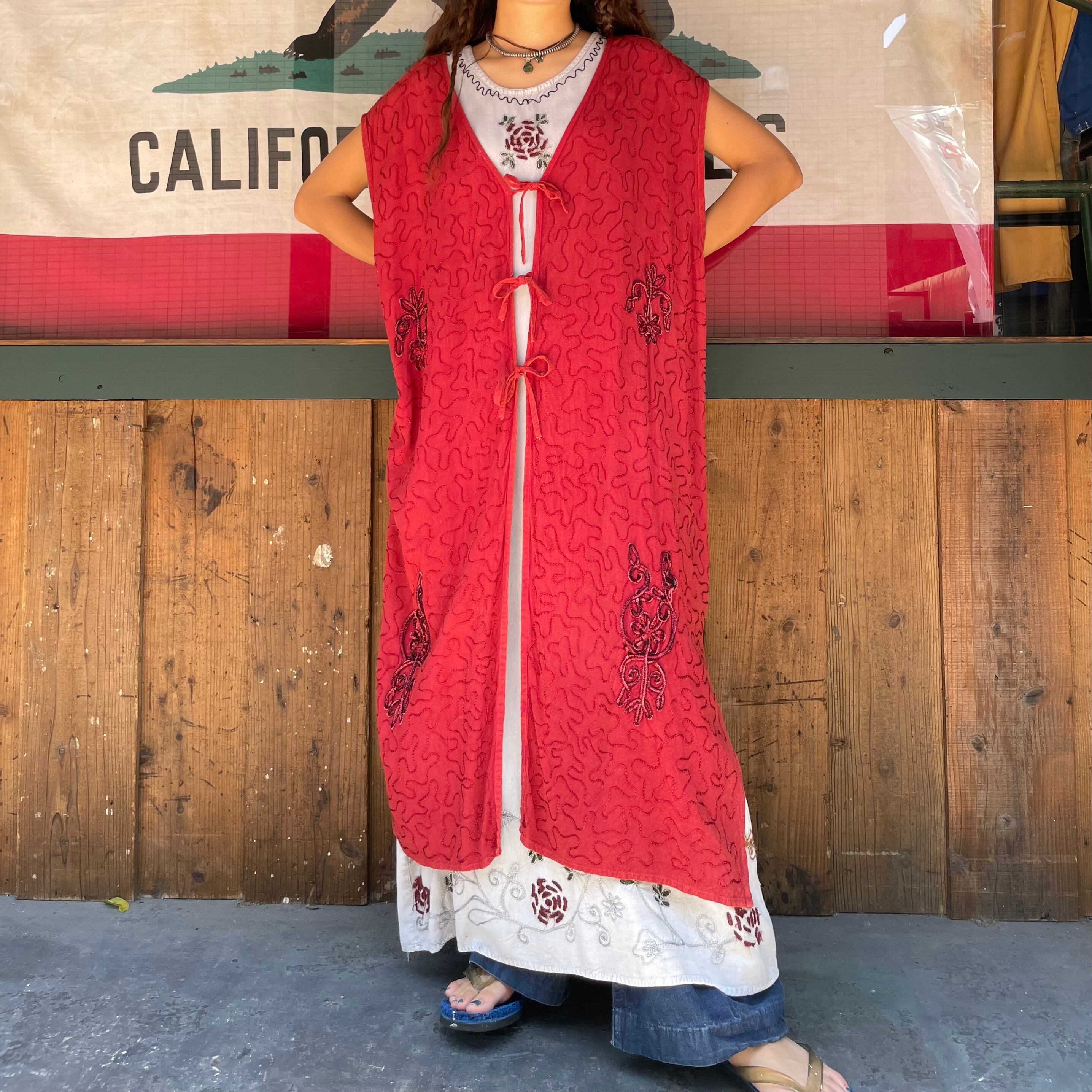 立体的なお花のロープ刺繍やうねうねと施されたチェーンステッチがかわいいロングベストです。