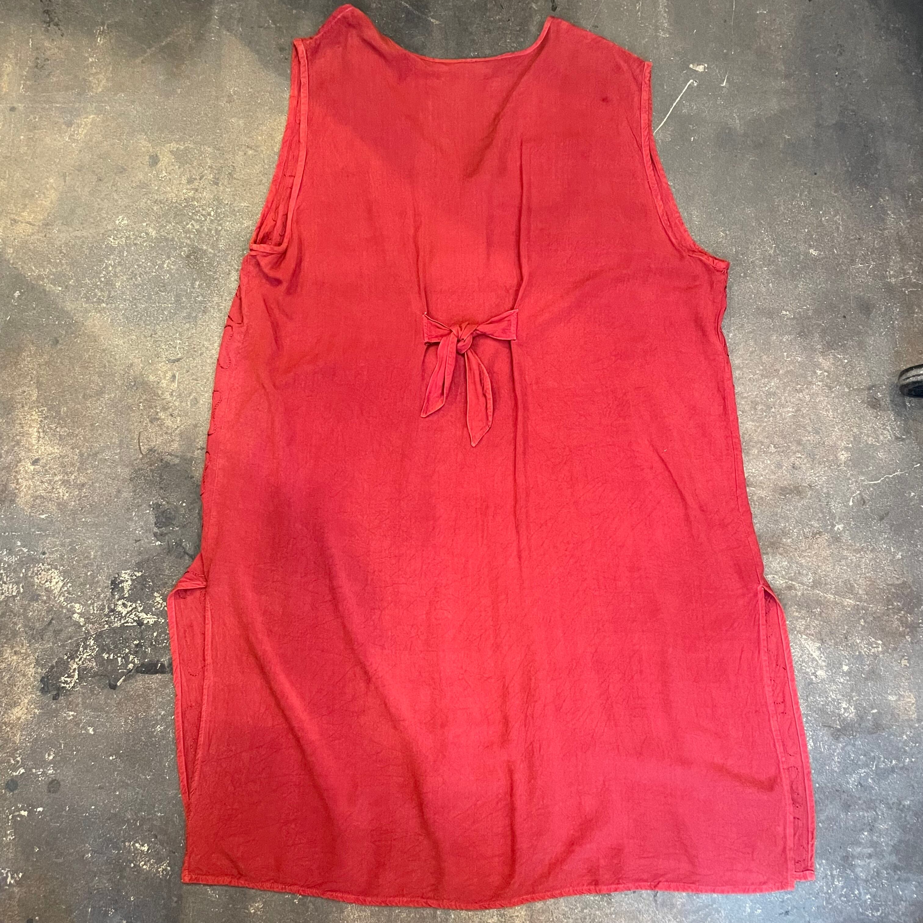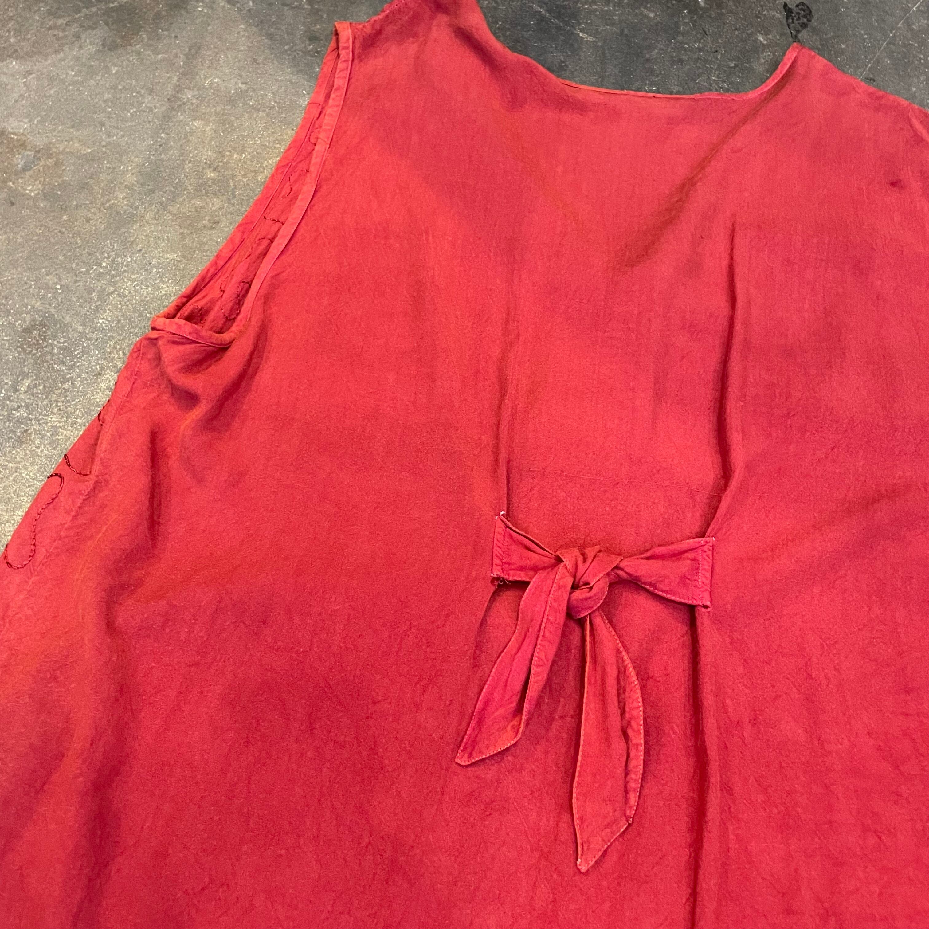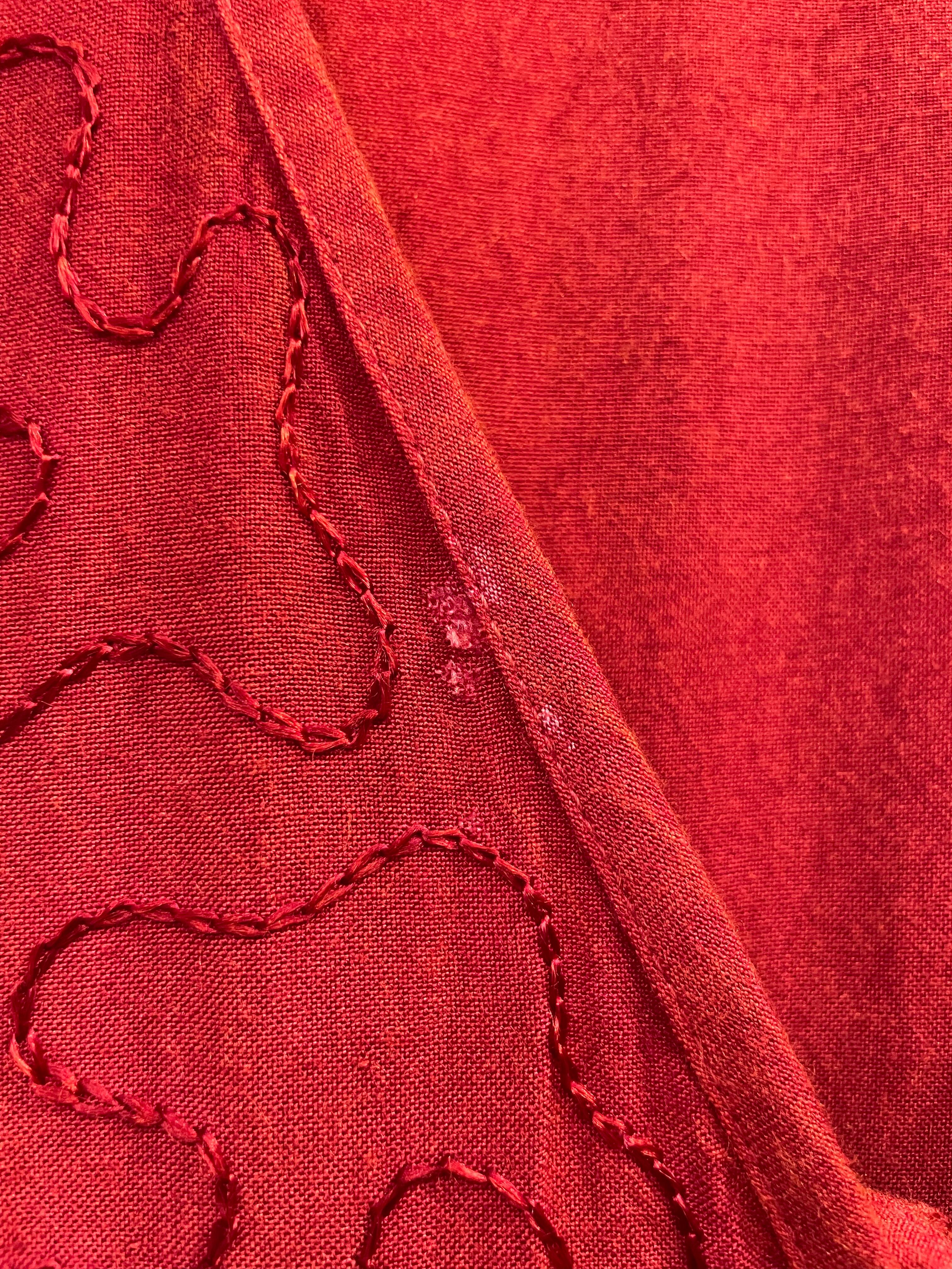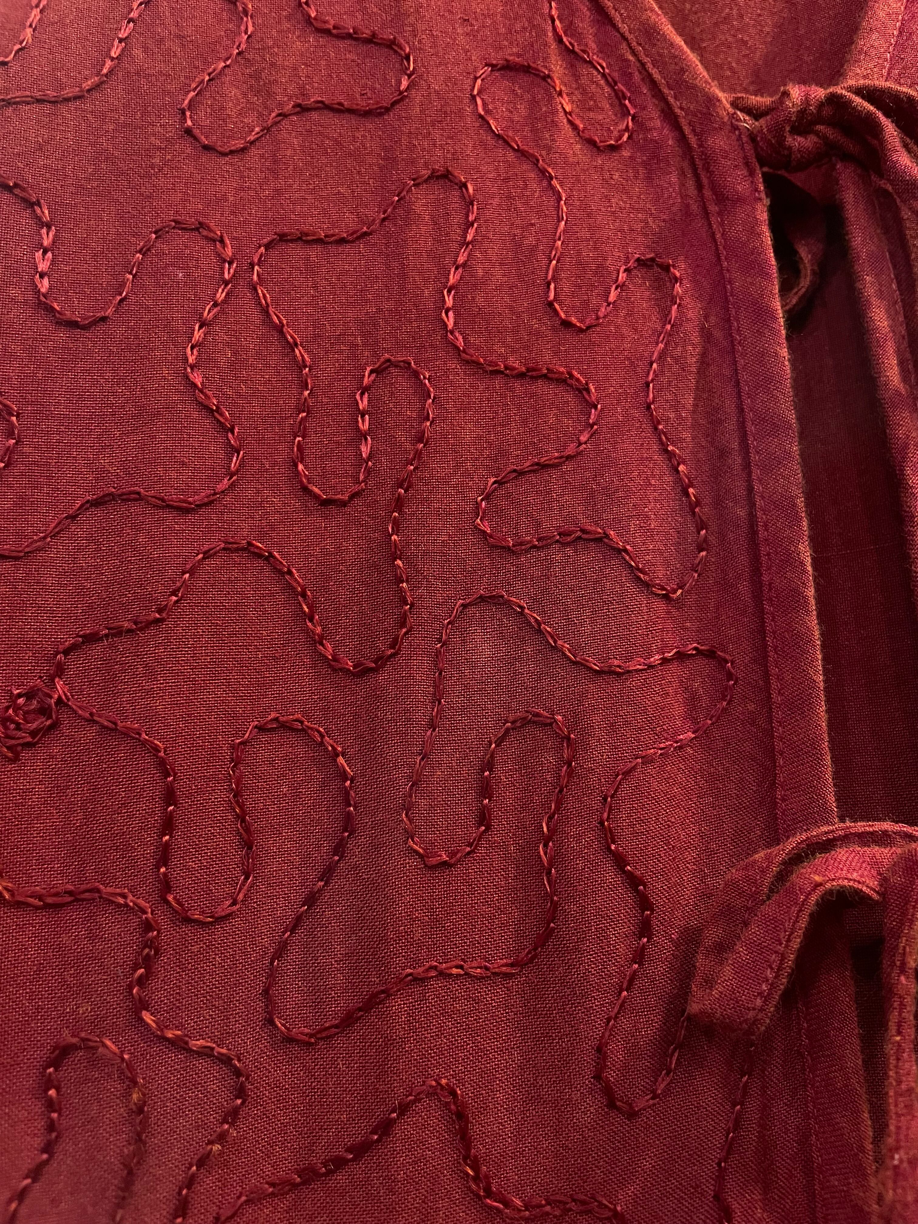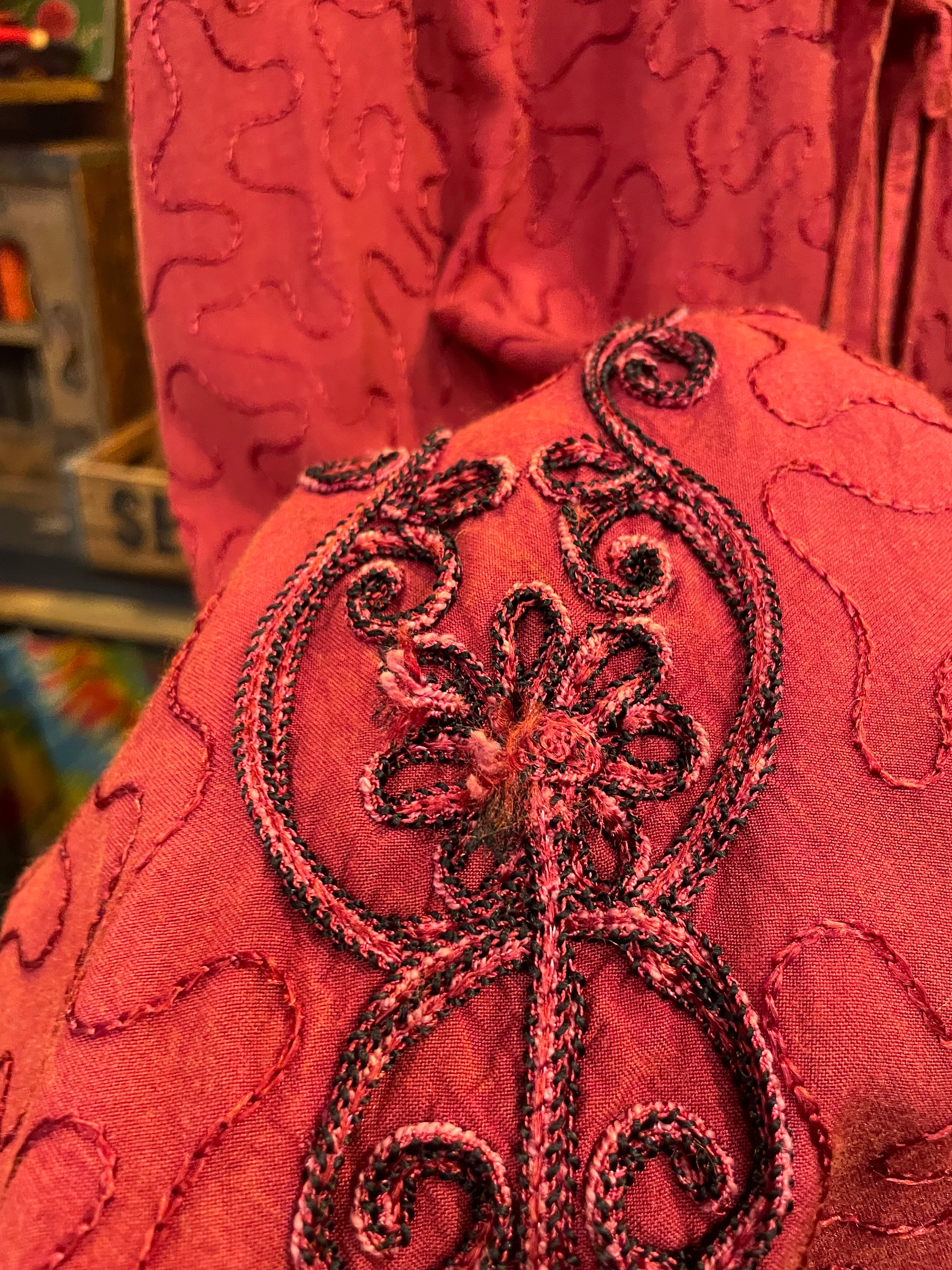立体的なお花のロープ刺繍やうねうねと施されたチェーンステッチがかわいいロングベストです。