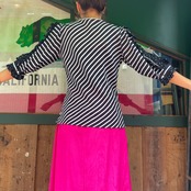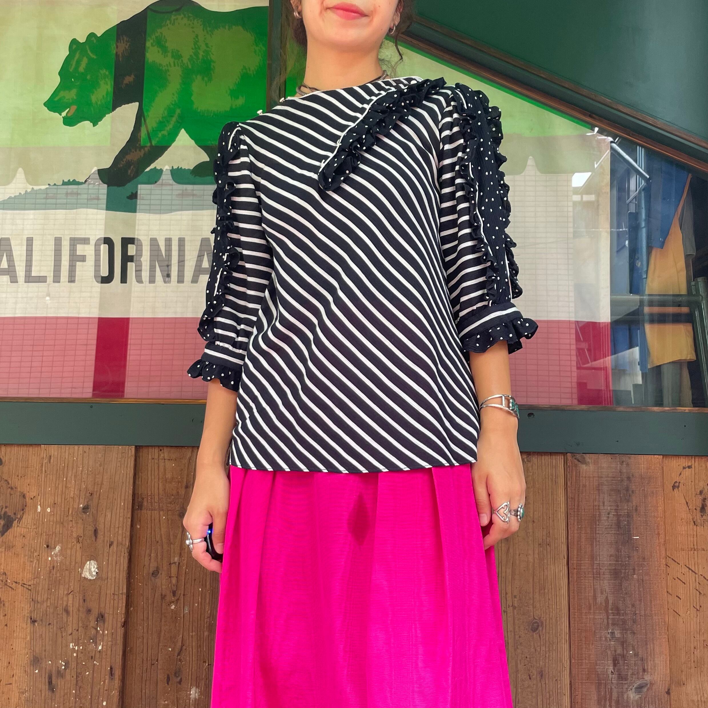 斜めストライプにドットの柄合わせがかわいいプルオーバータイプのブラウスです。袖のフリルや襟ぐりの斜めの開きなどフリフリしていますが独特な雰囲気なのでガーリーになりすぎず着ていただけそうです。