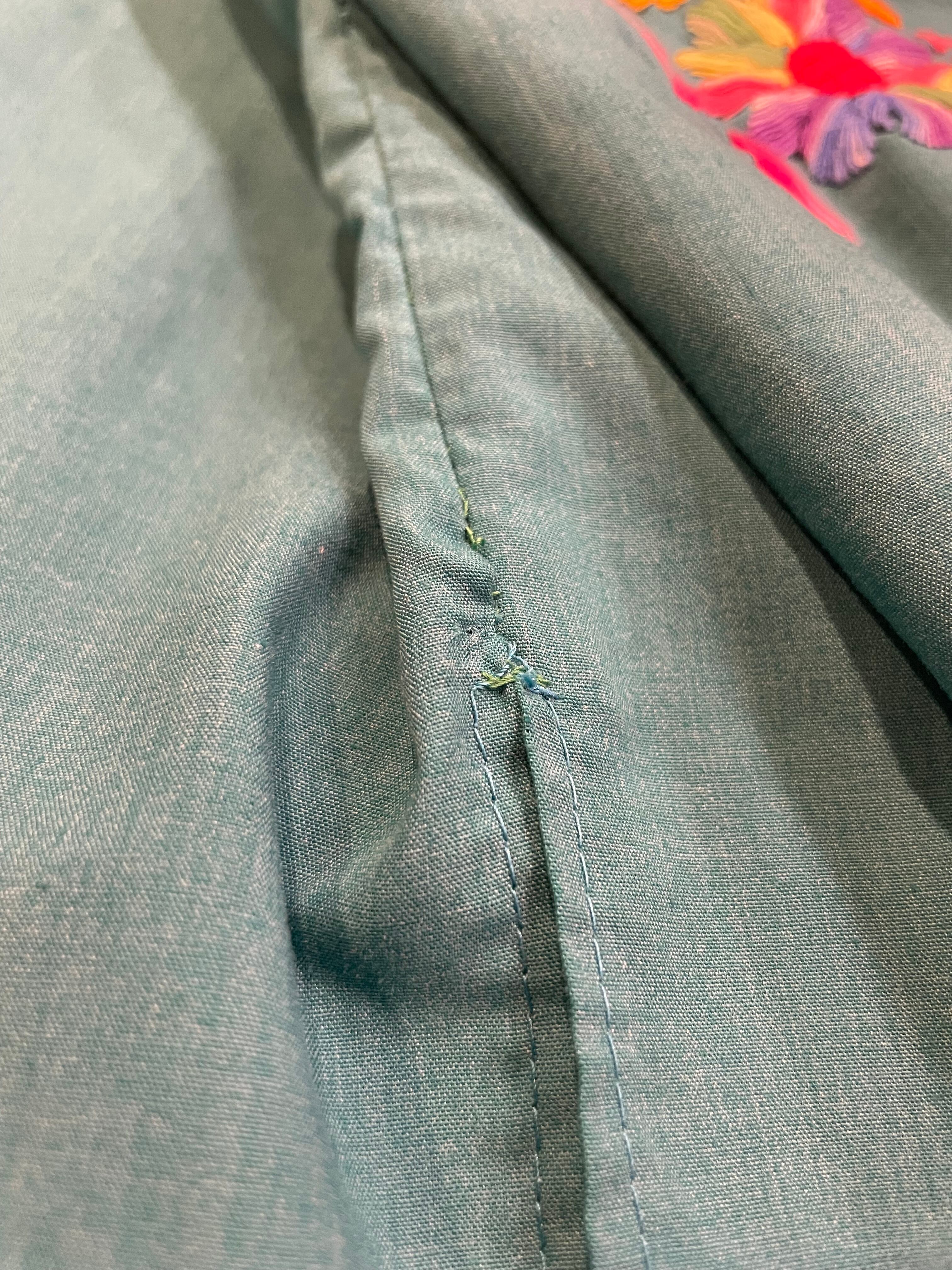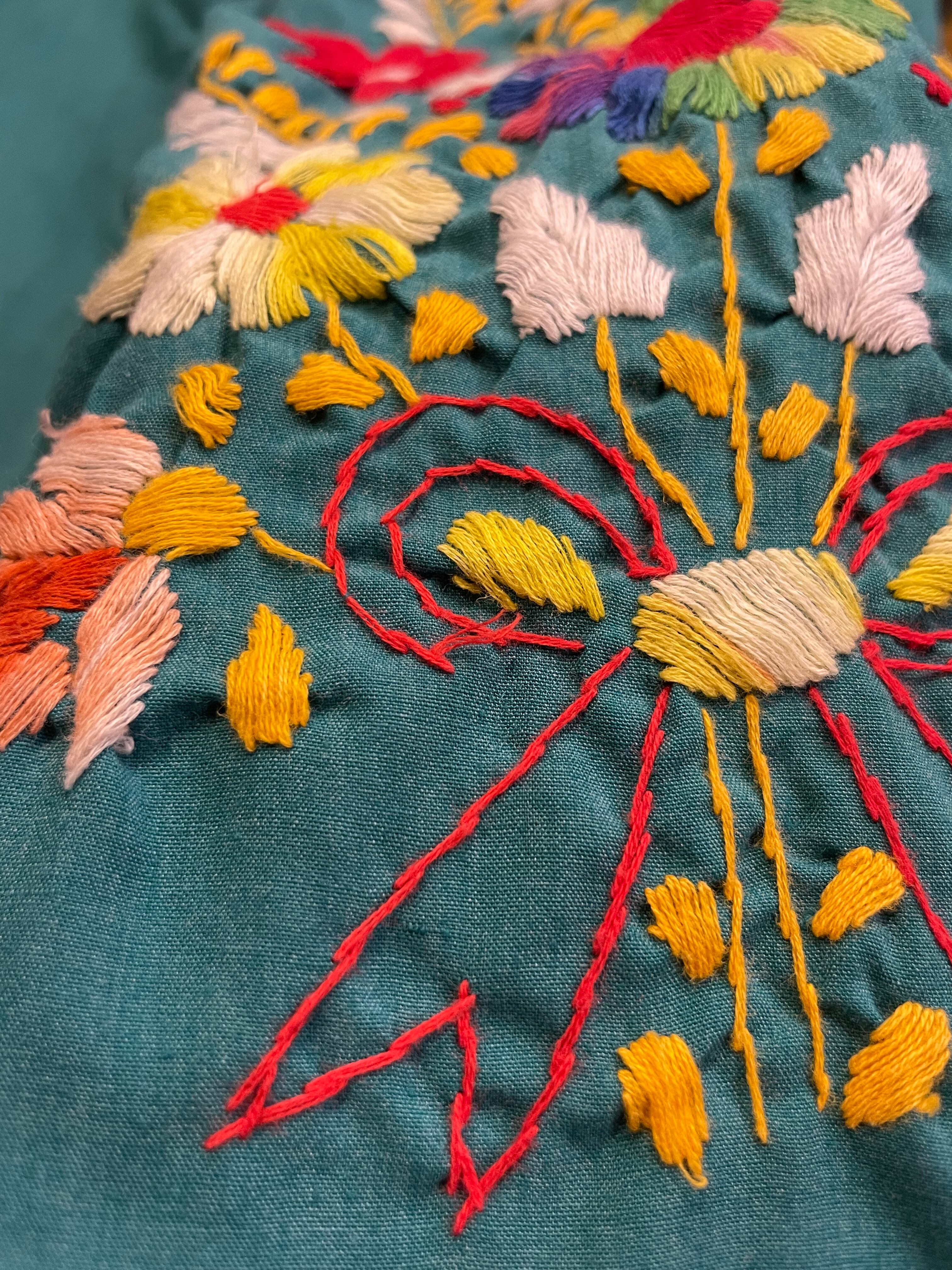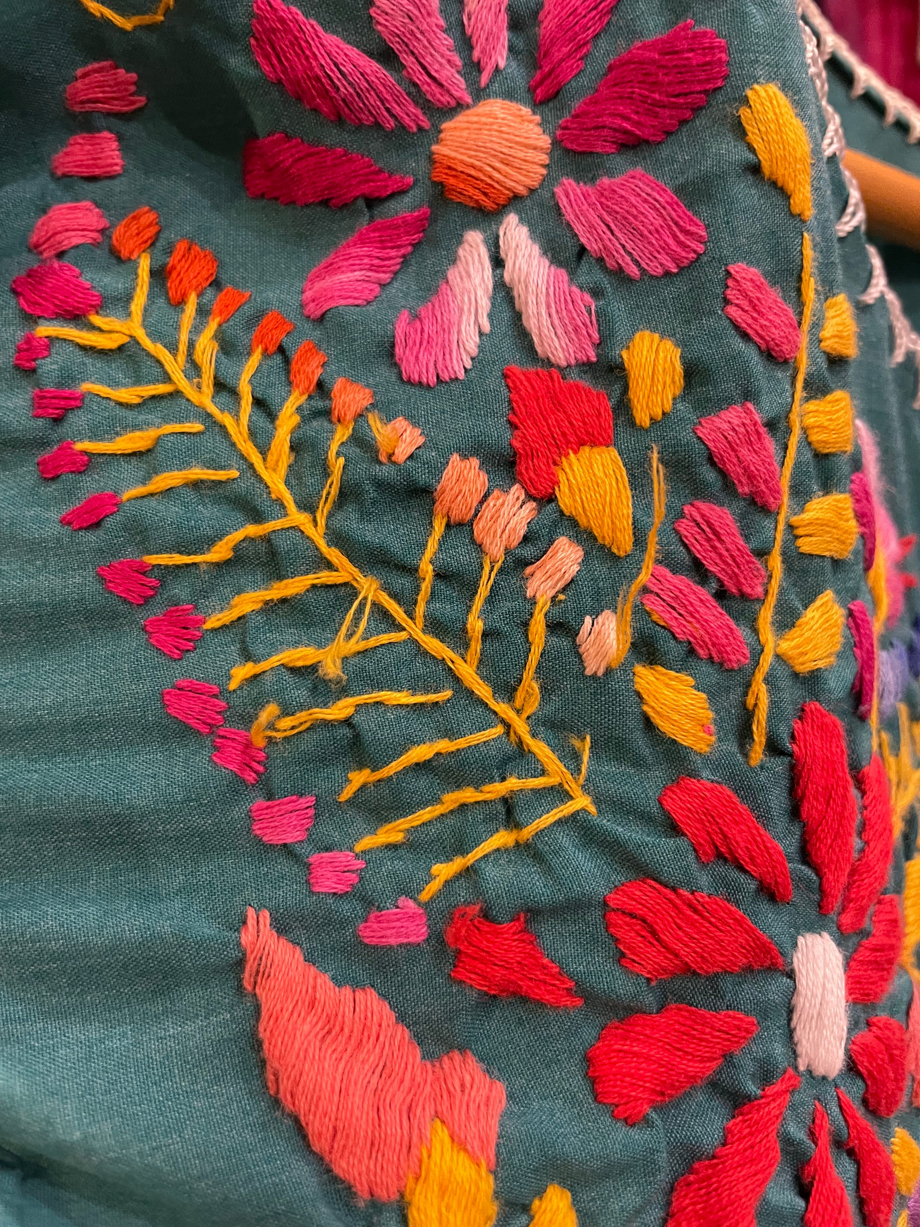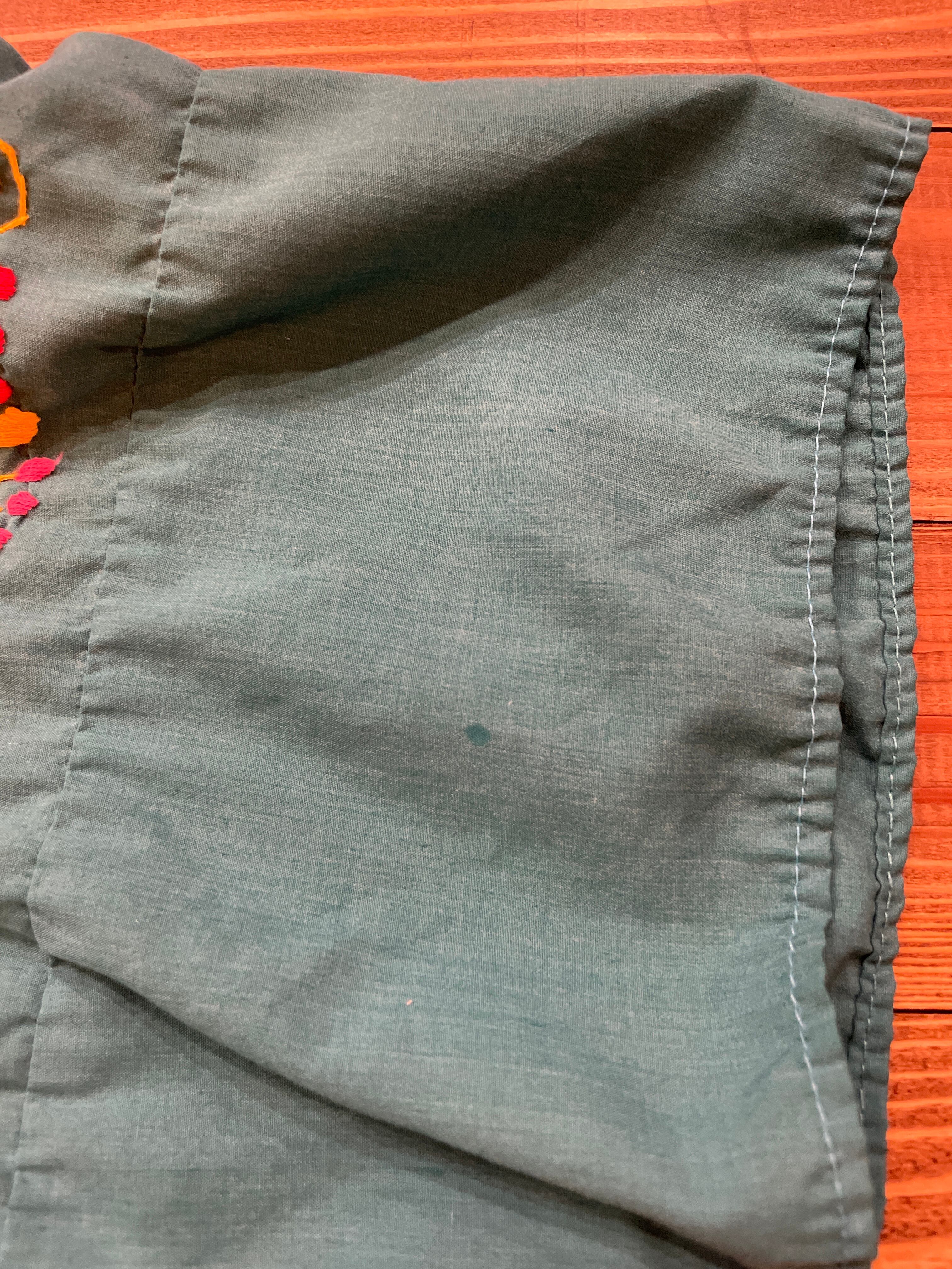 エメラルドグリーンっぽい絶妙な色味も爽やかで素敵ですし、ハッピーな刺繍も気分の上がる一枚です。