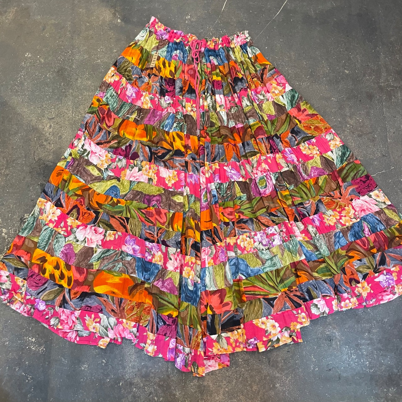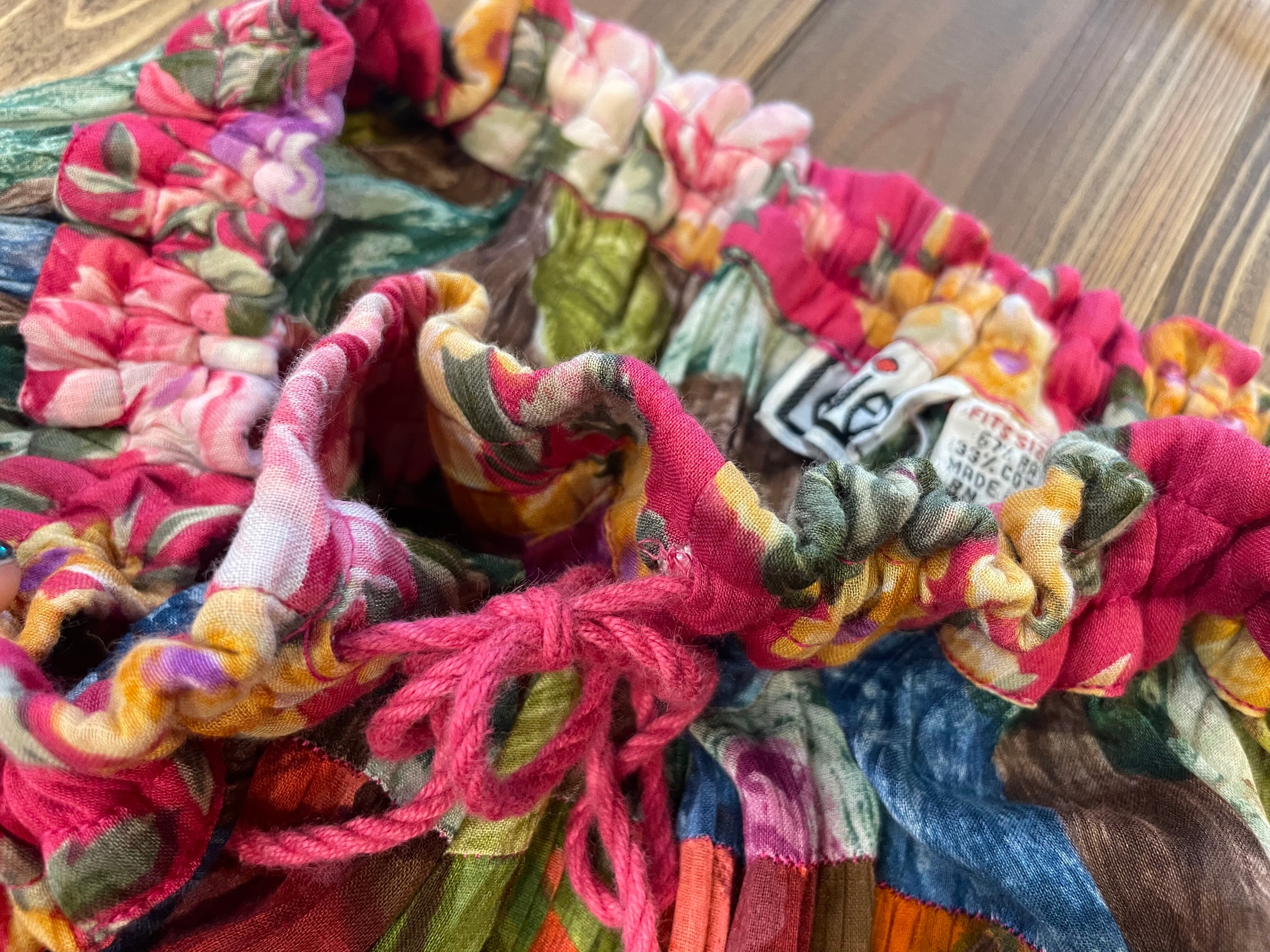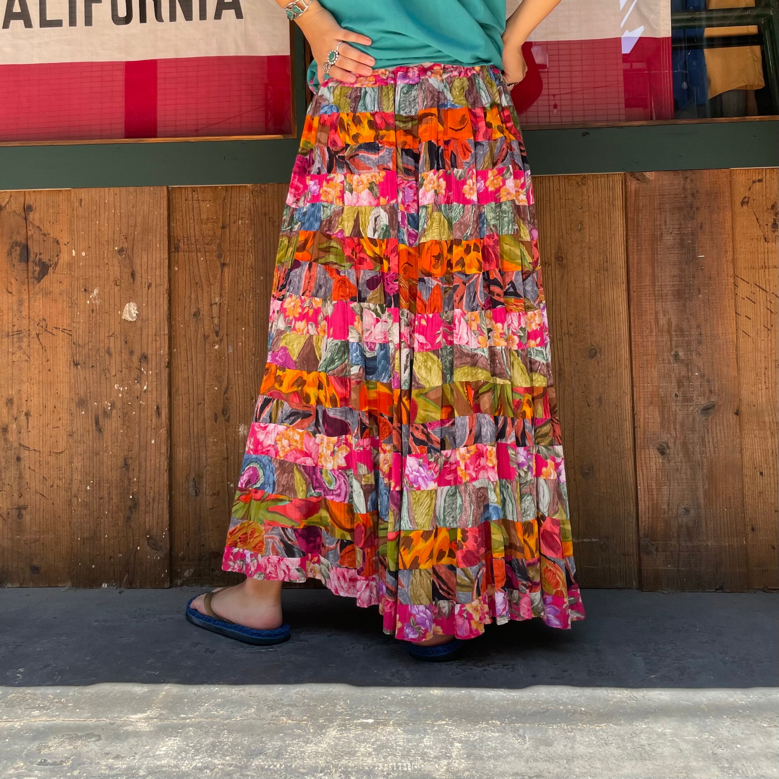 ピンクベースのいろんな生地の細かな切り替えがとてもかわいいスカートです。