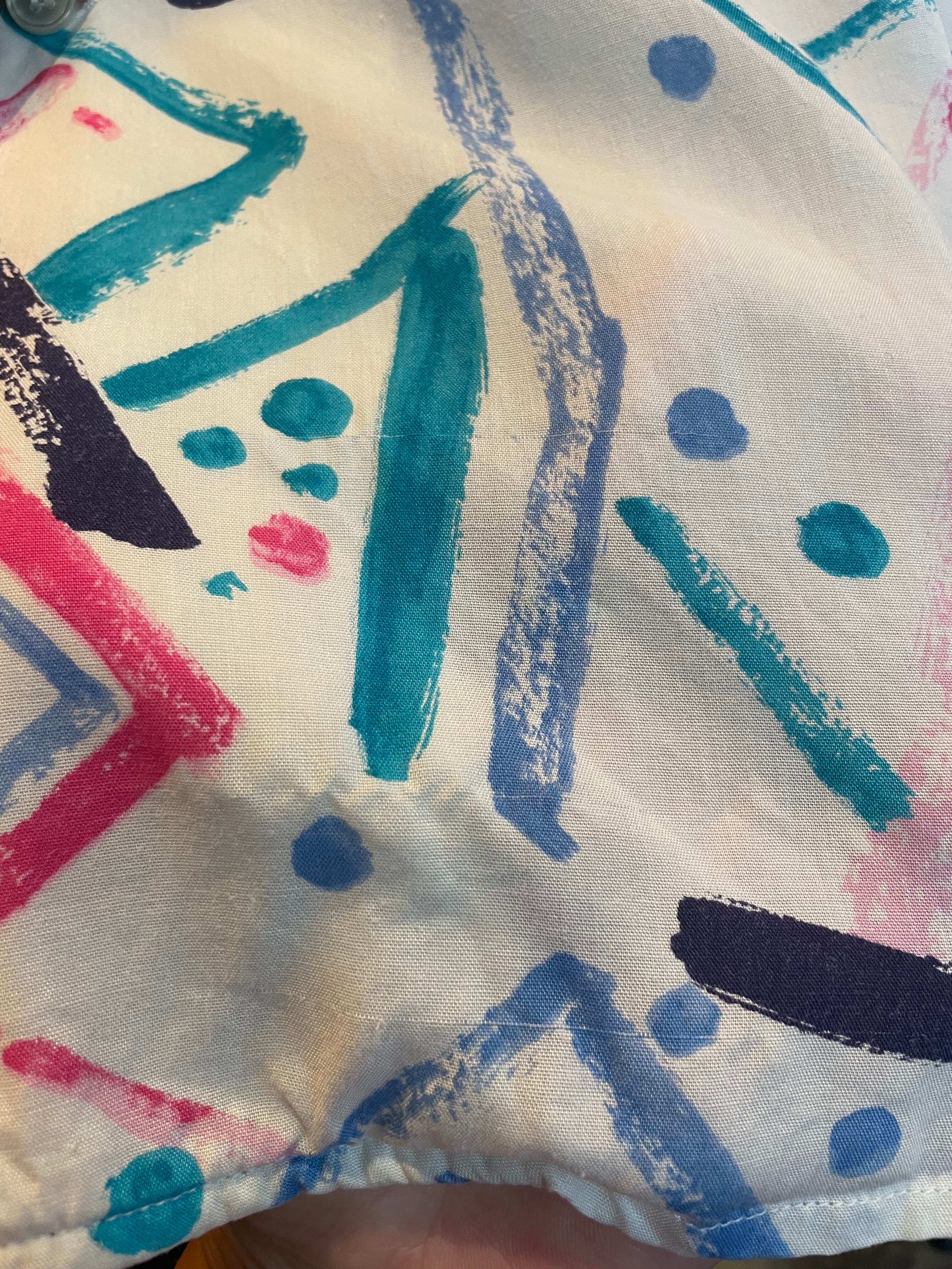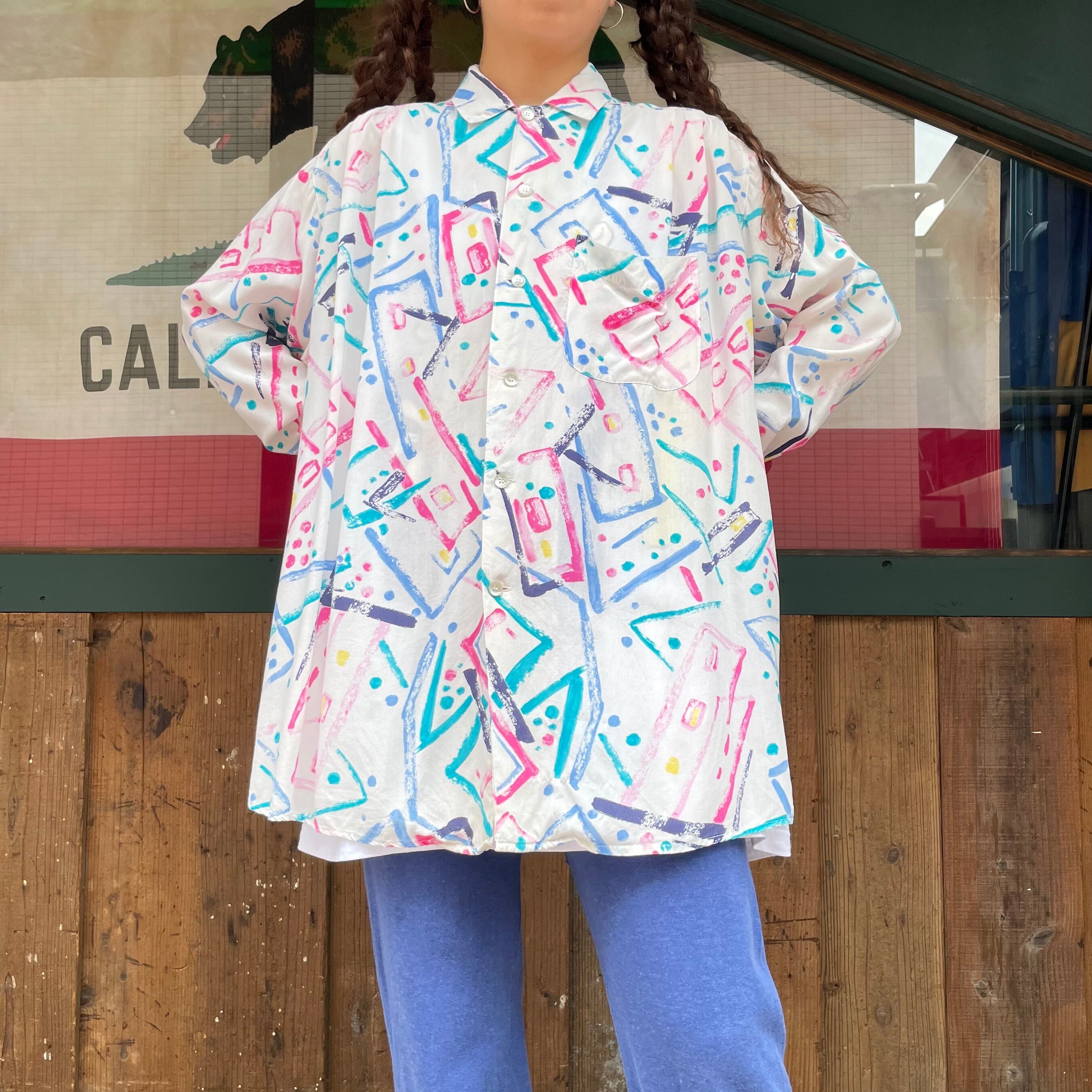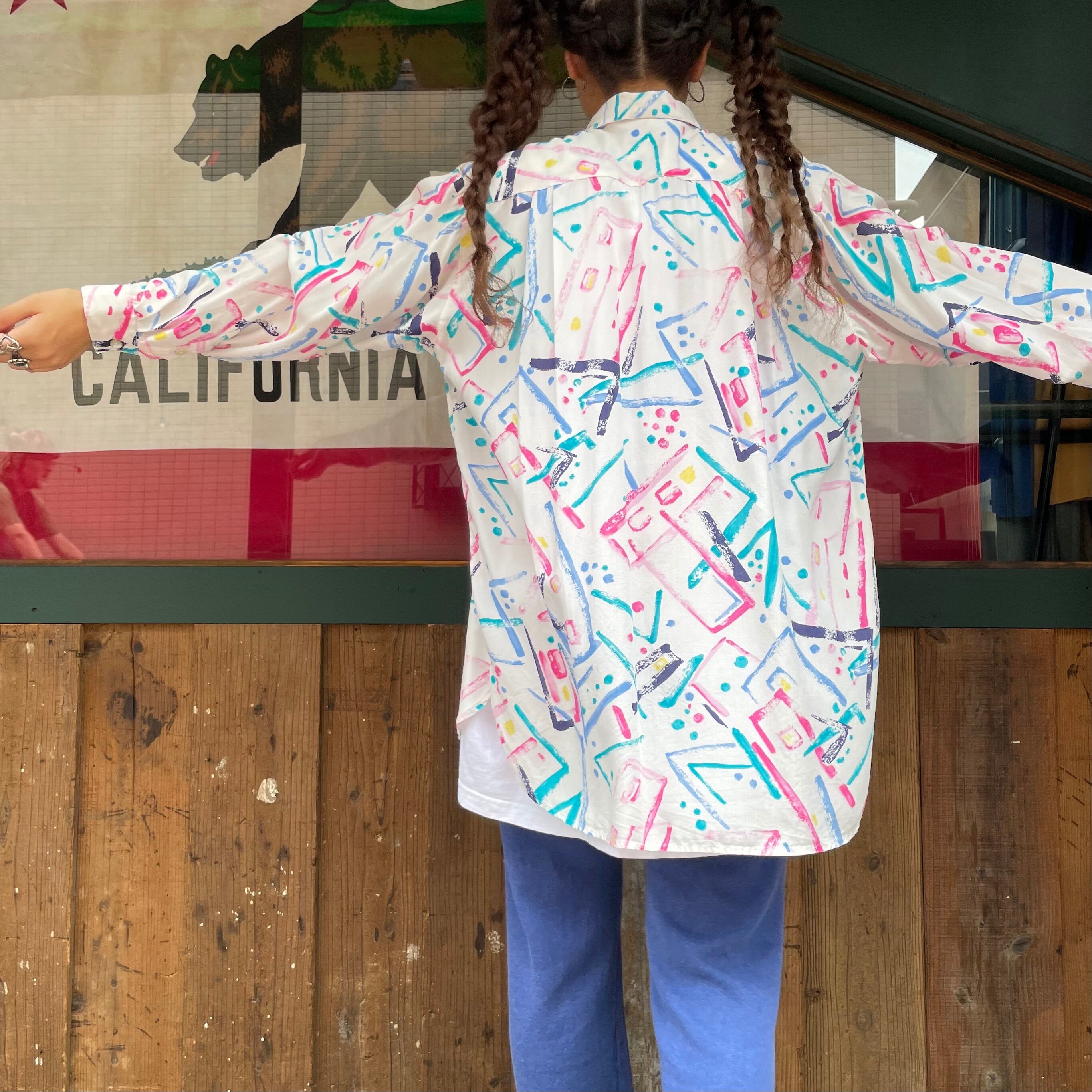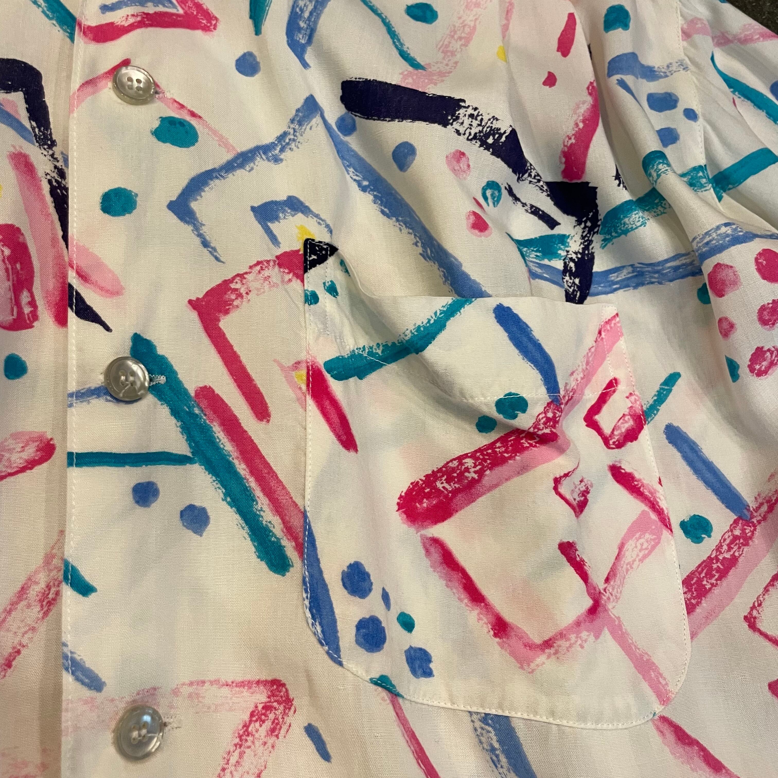 白地に水彩絵の具でシュシュっと落書きしたような柄がかわいい長袖シャツです。