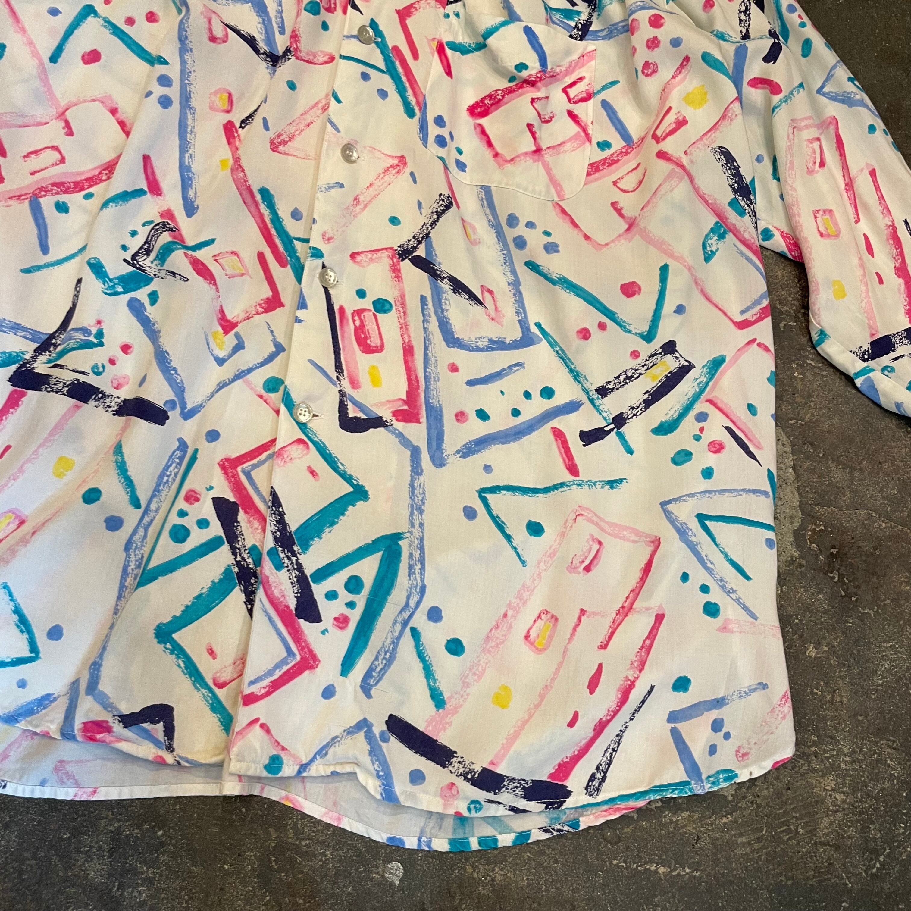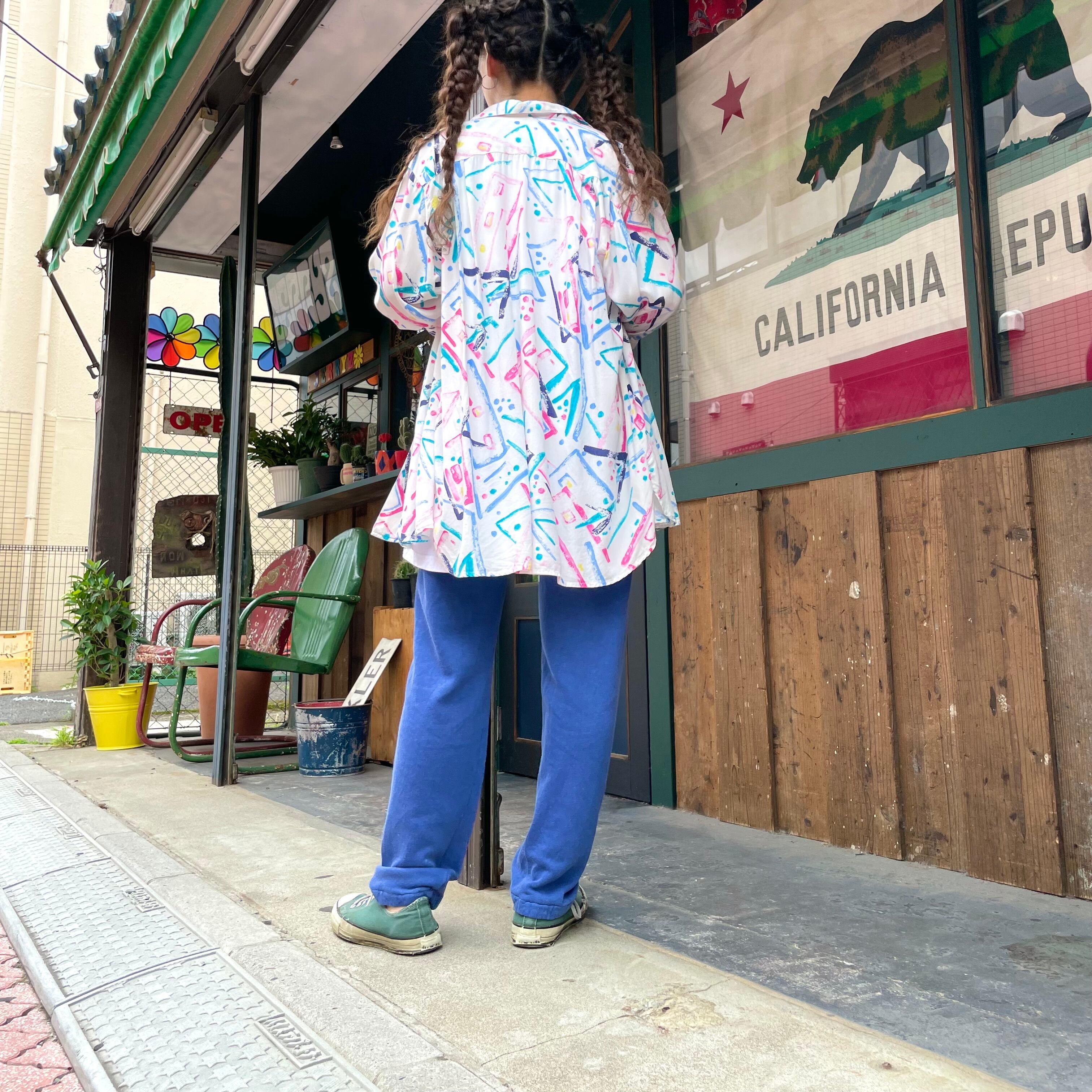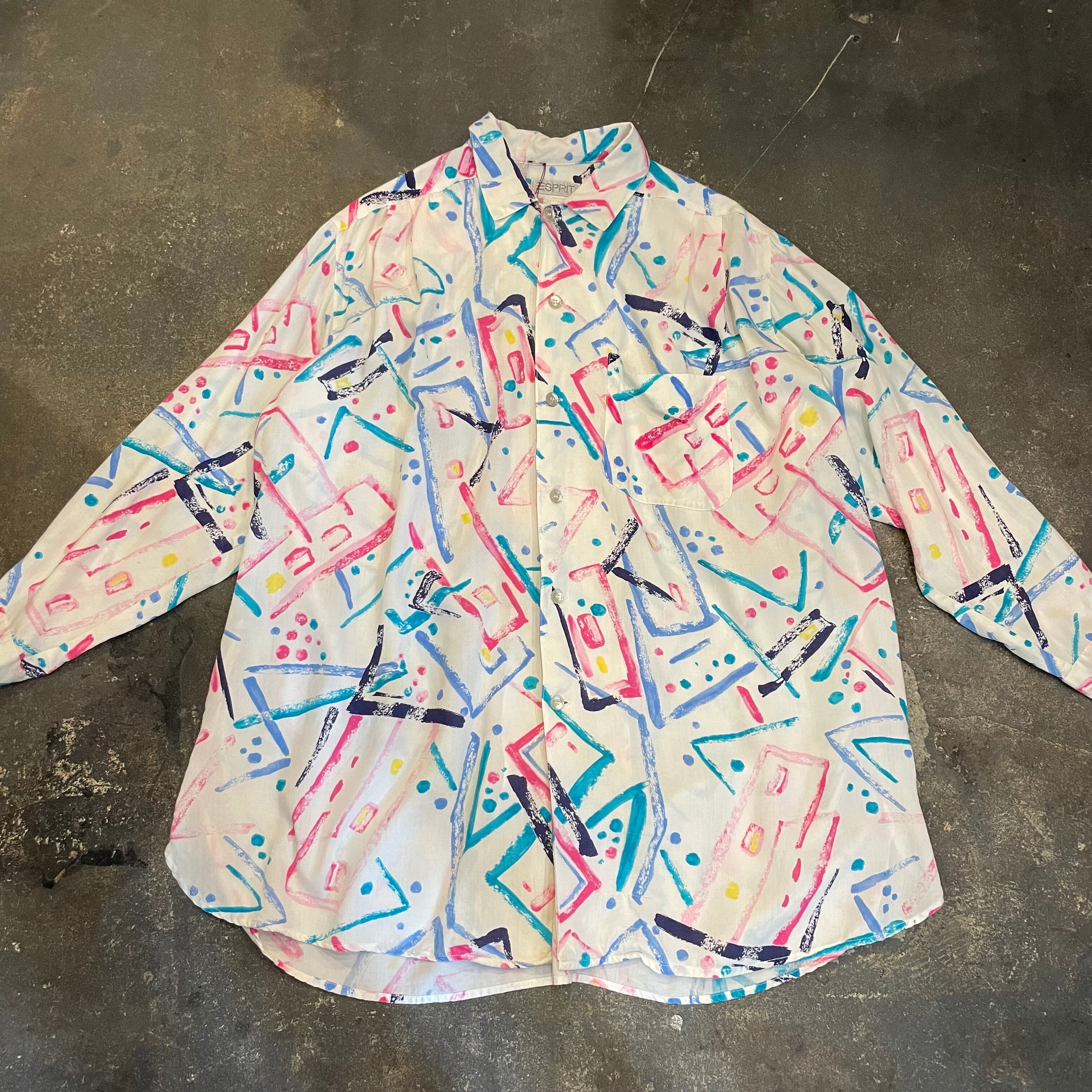 白地に水彩絵の具でシュシュっと落書きしたような柄がかわいい長袖シャツです。