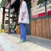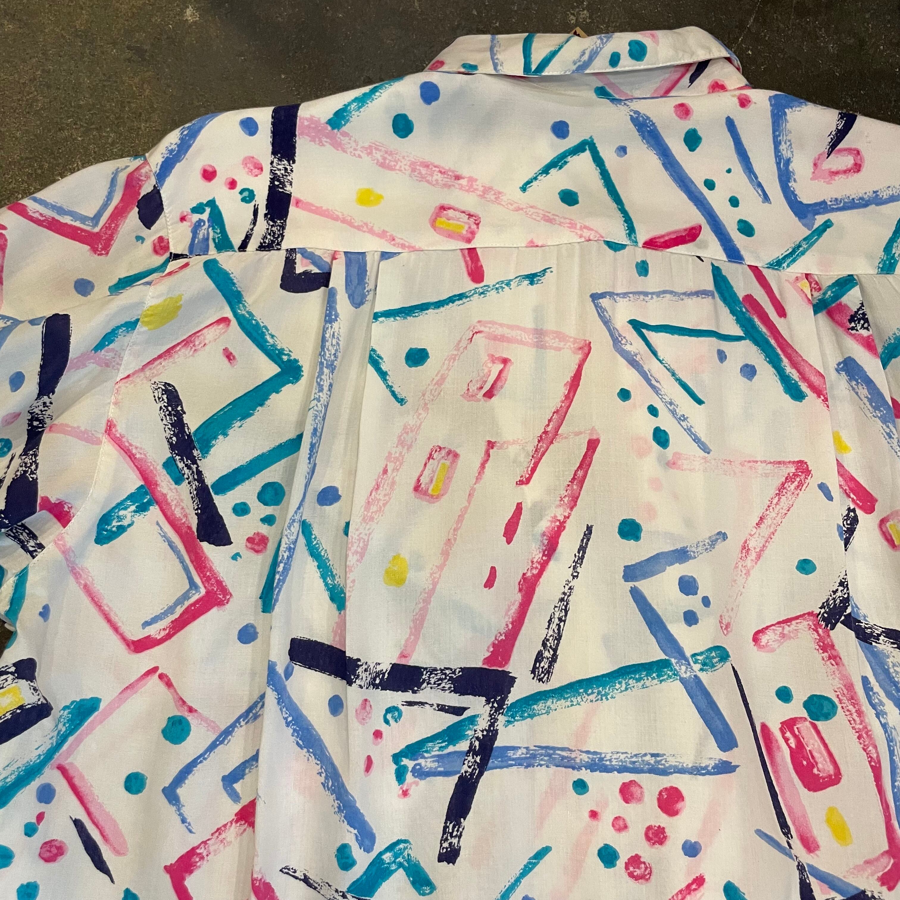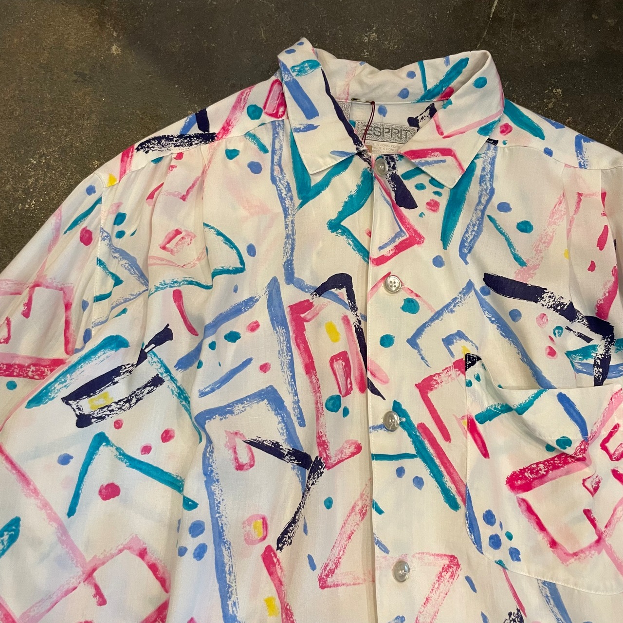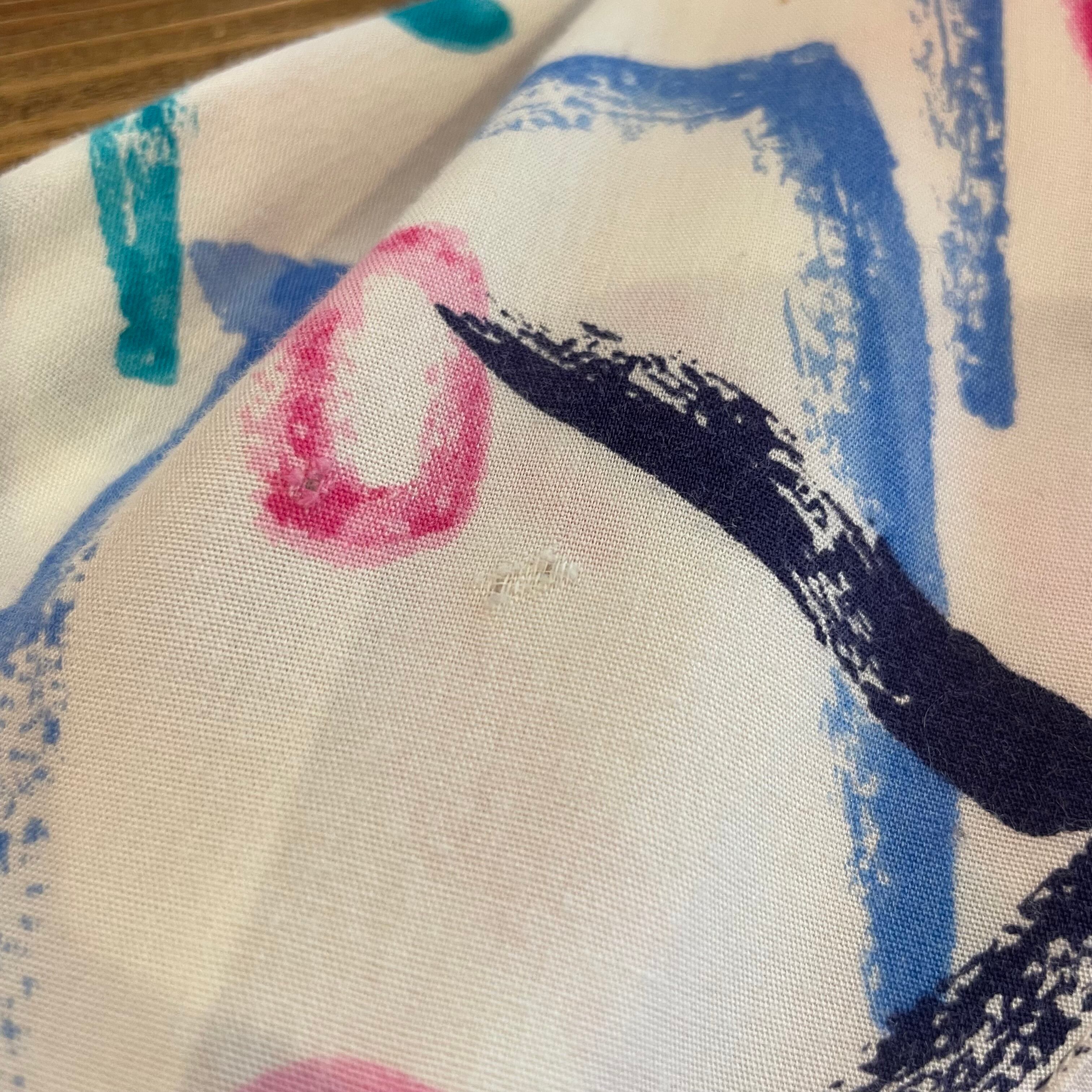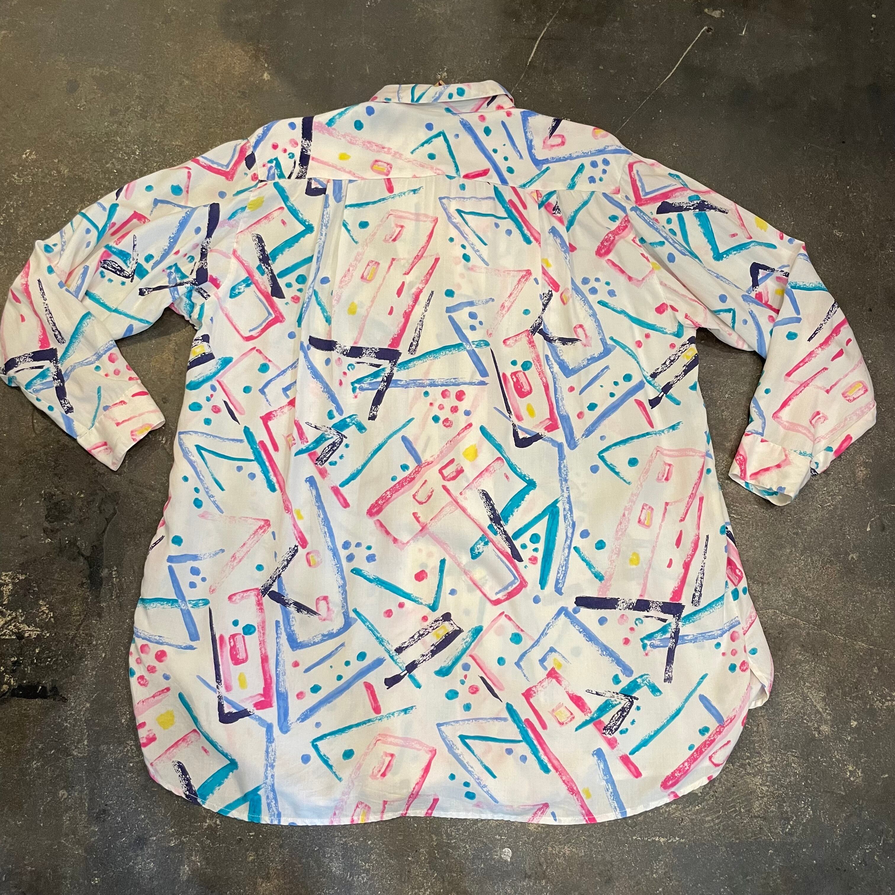 白地に水彩絵の具でシュシュっと落書きしたような柄がかわいい長袖シャツです。