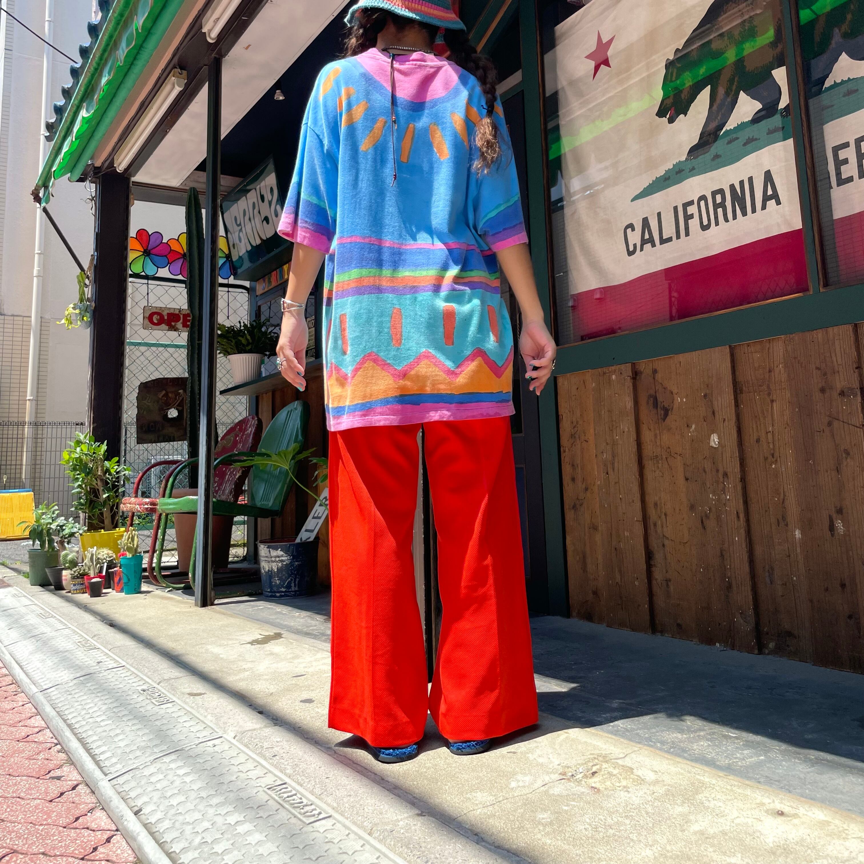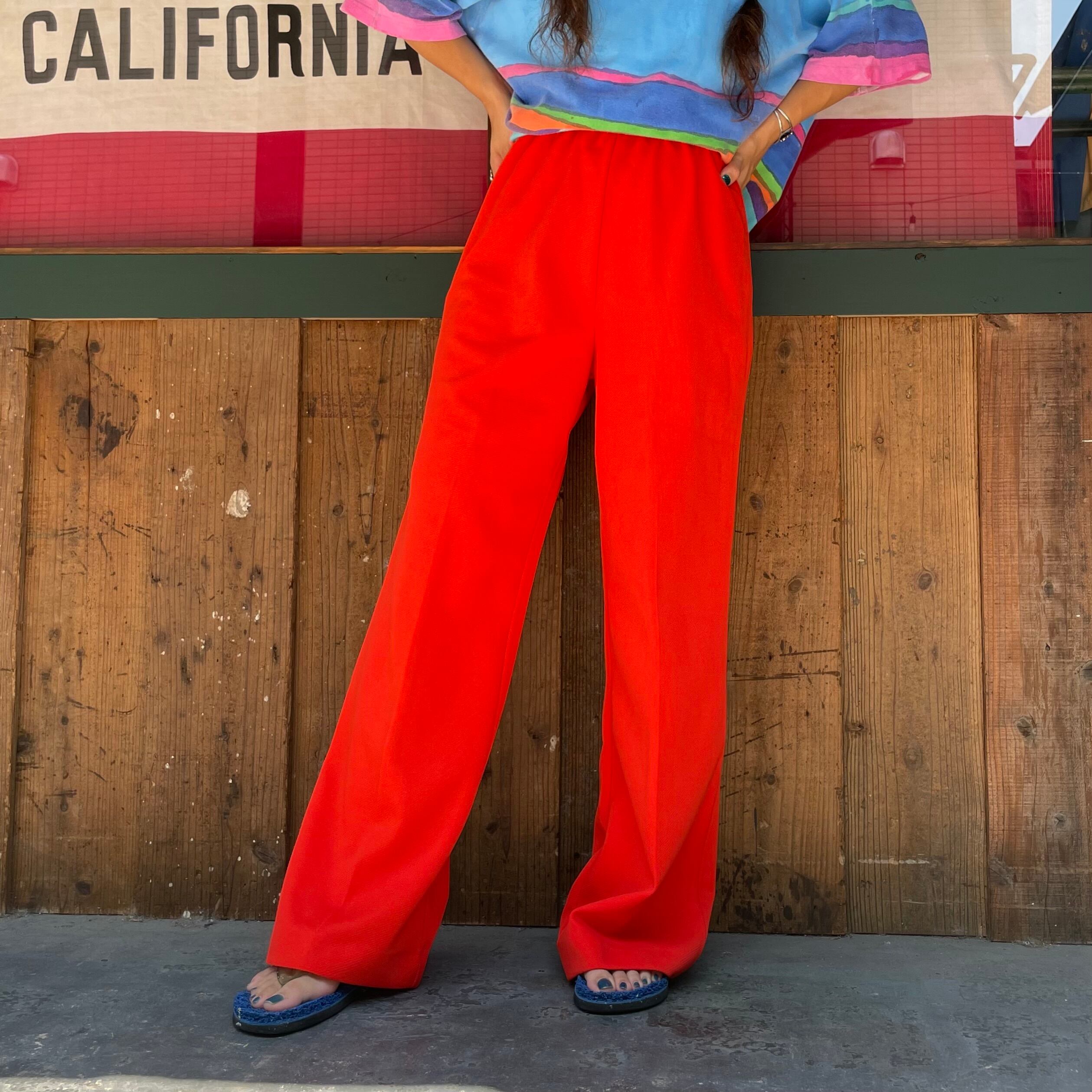 鮮やかなオレンジがかわいいイージーパンツです。バギーなシルエットがかっこいいですし、ピタっとしていないので風が通ります。