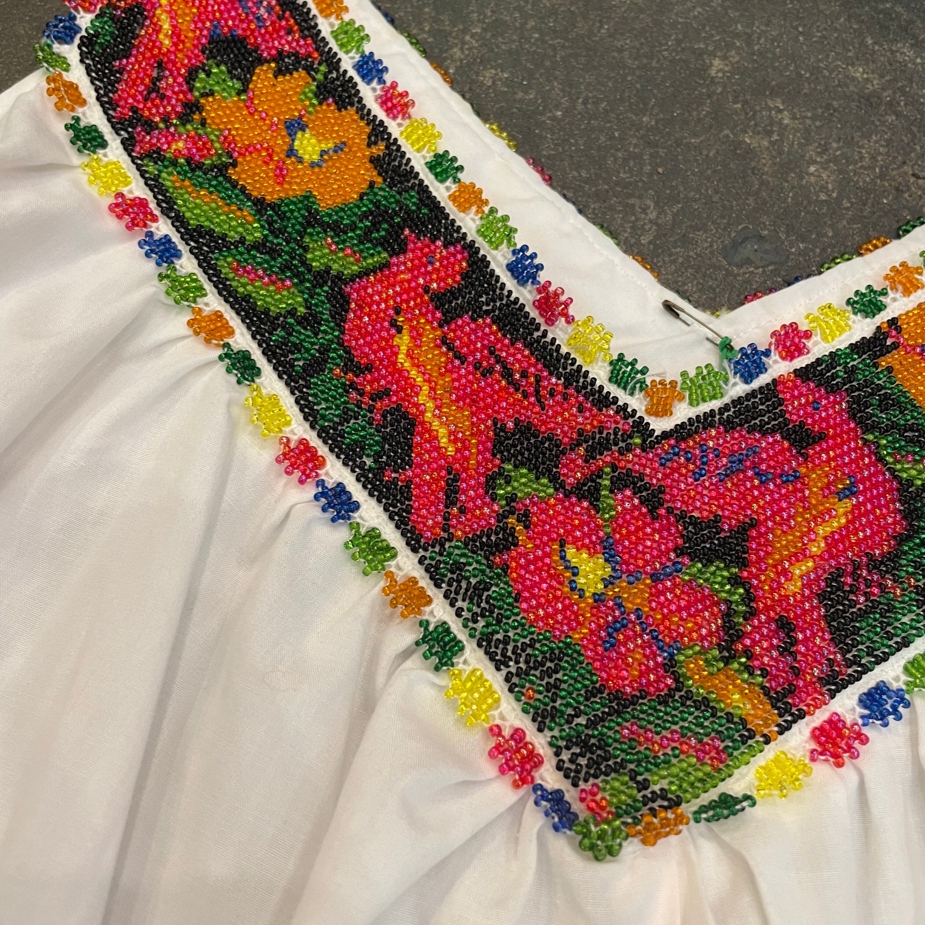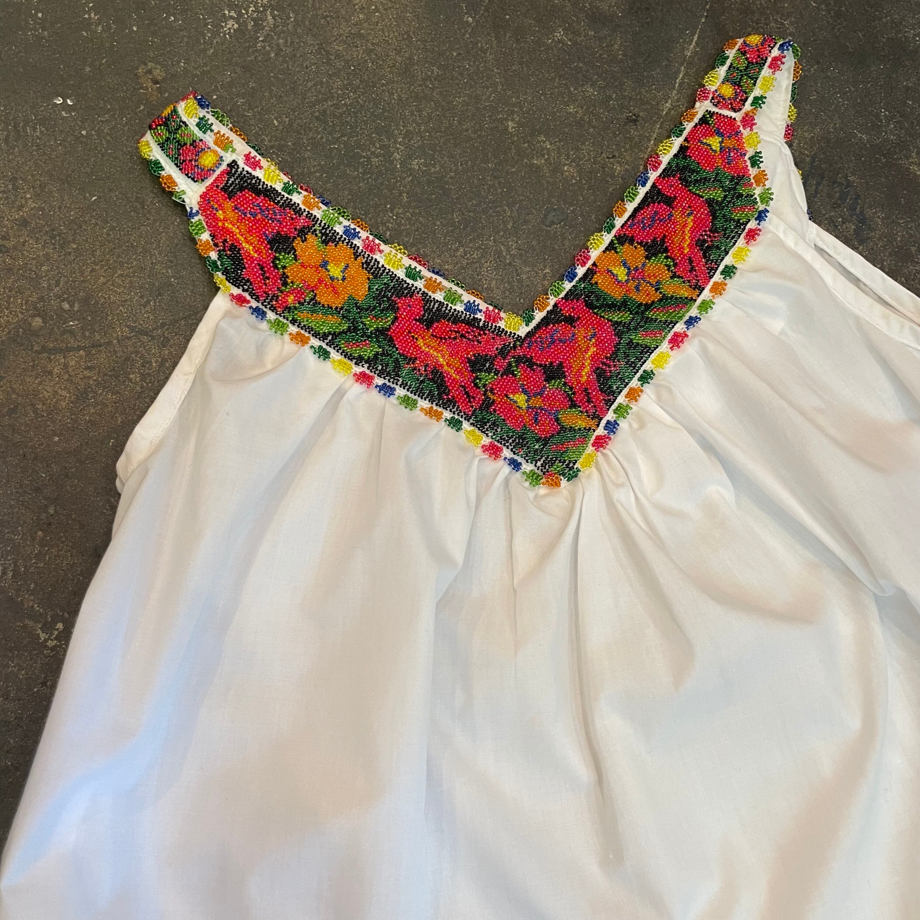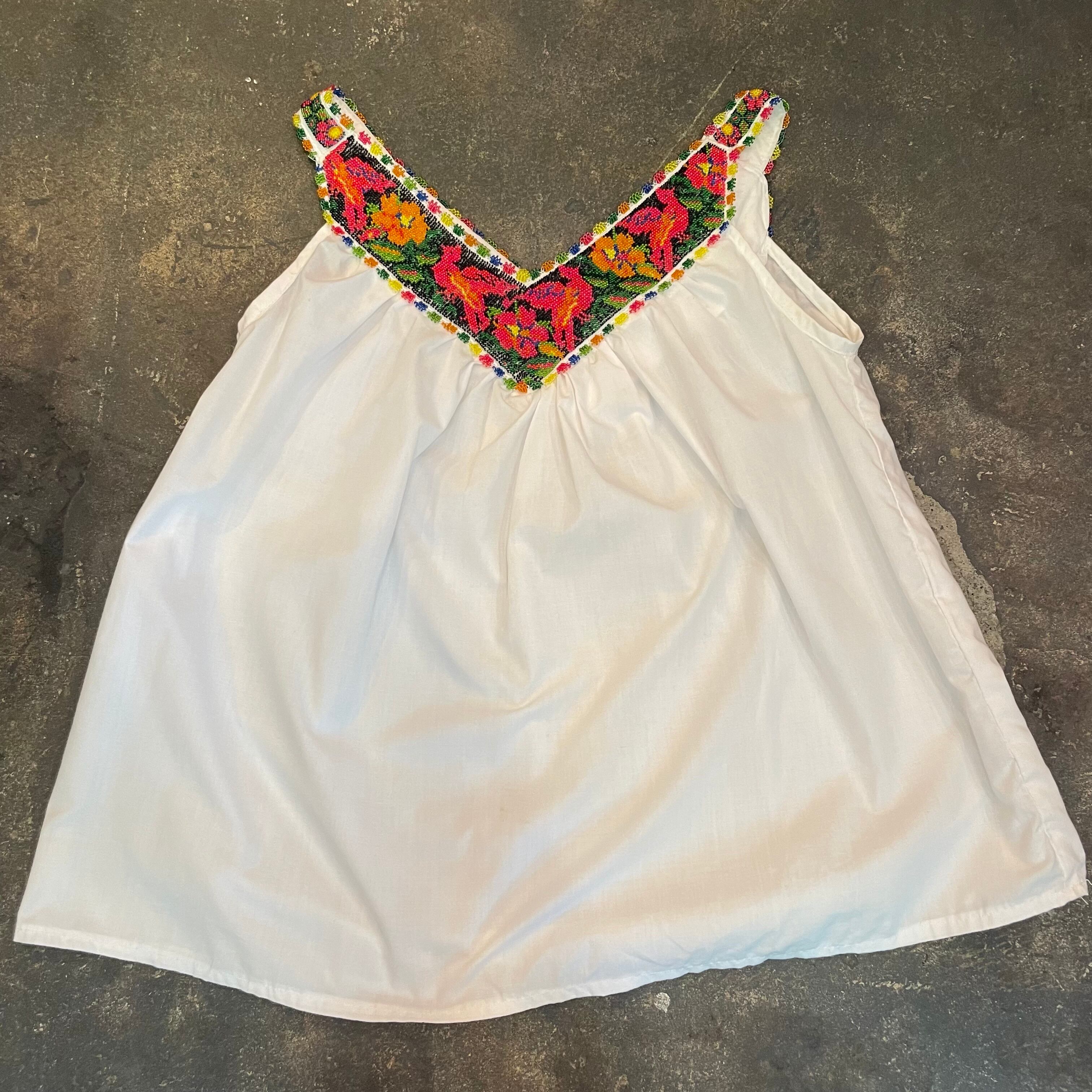白地にカラフルなビーズの刺繍がとてもかわいいチュニックトップです。鳥とお花の模様でびっしり細かいビーズが使われていて素敵です。