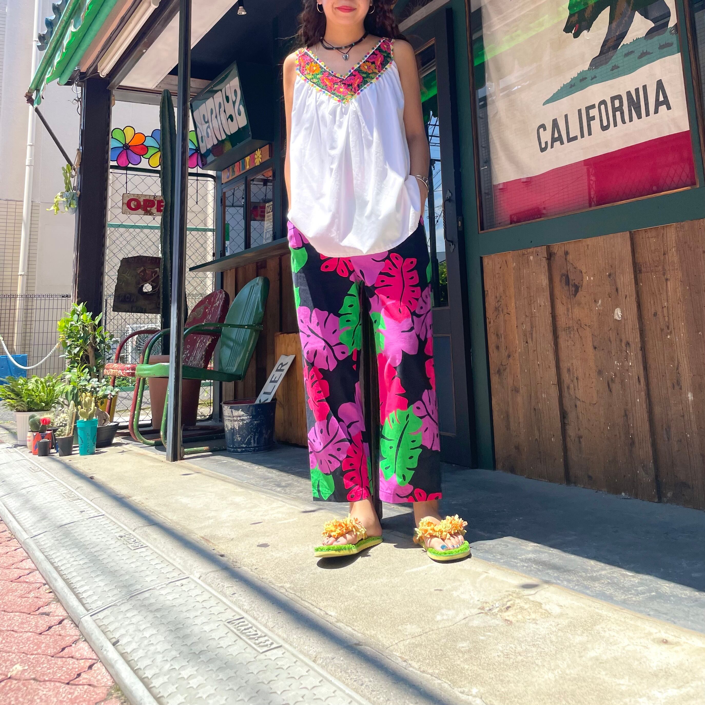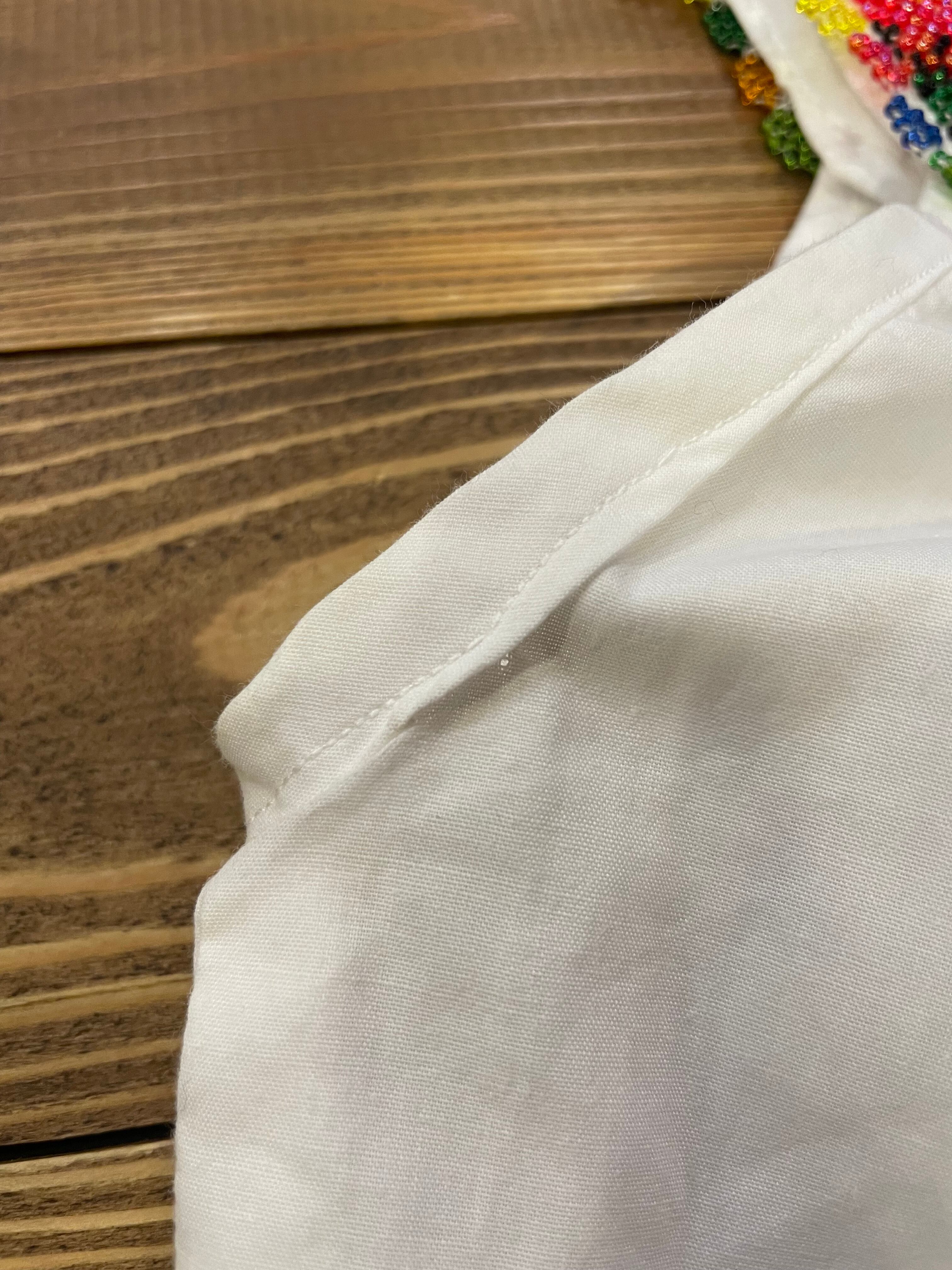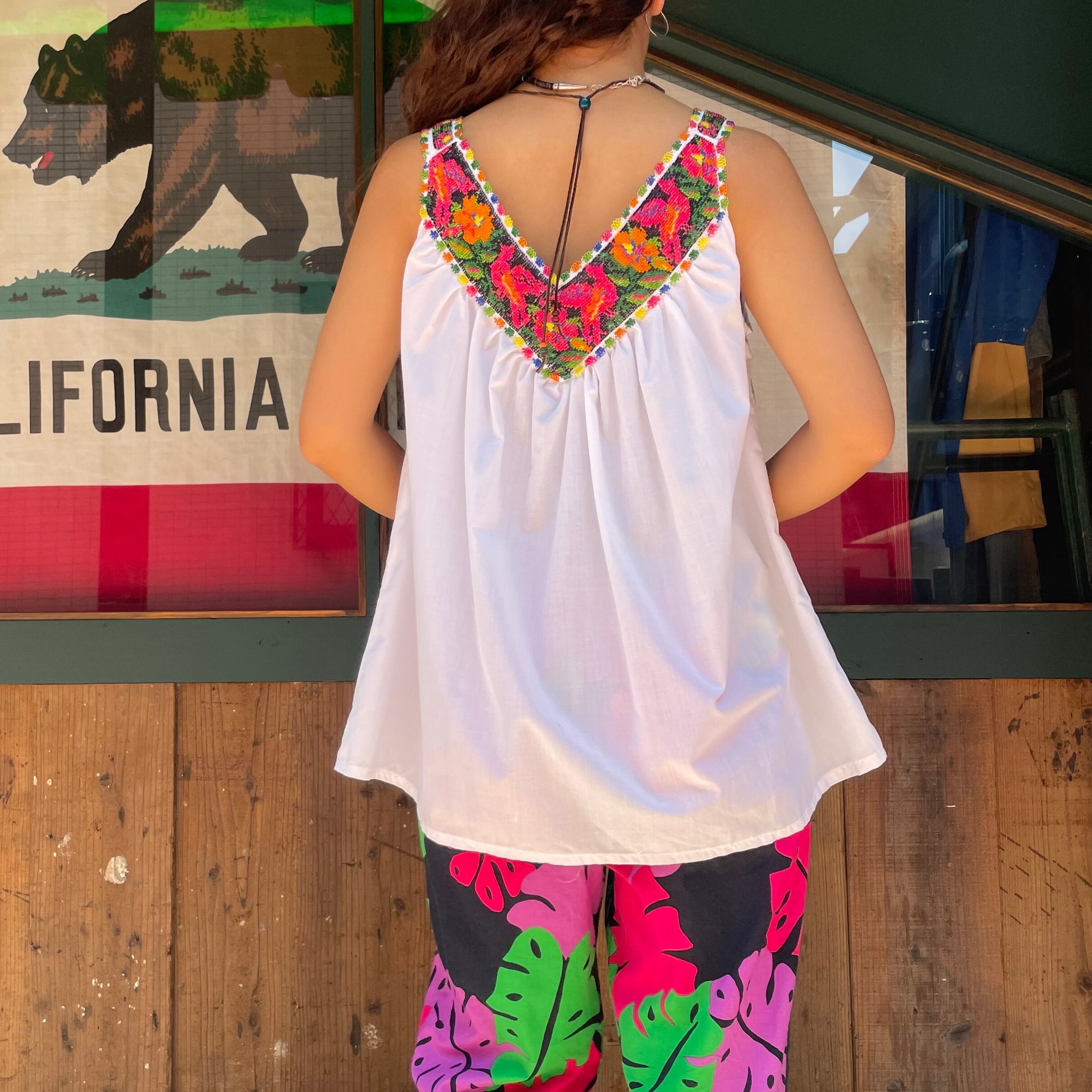 白地にカラフルなビーズの刺繍がとてもかわいいチュニックトップです。鳥とお花の模様でびっしり細かいビーズが使われていて素敵です。