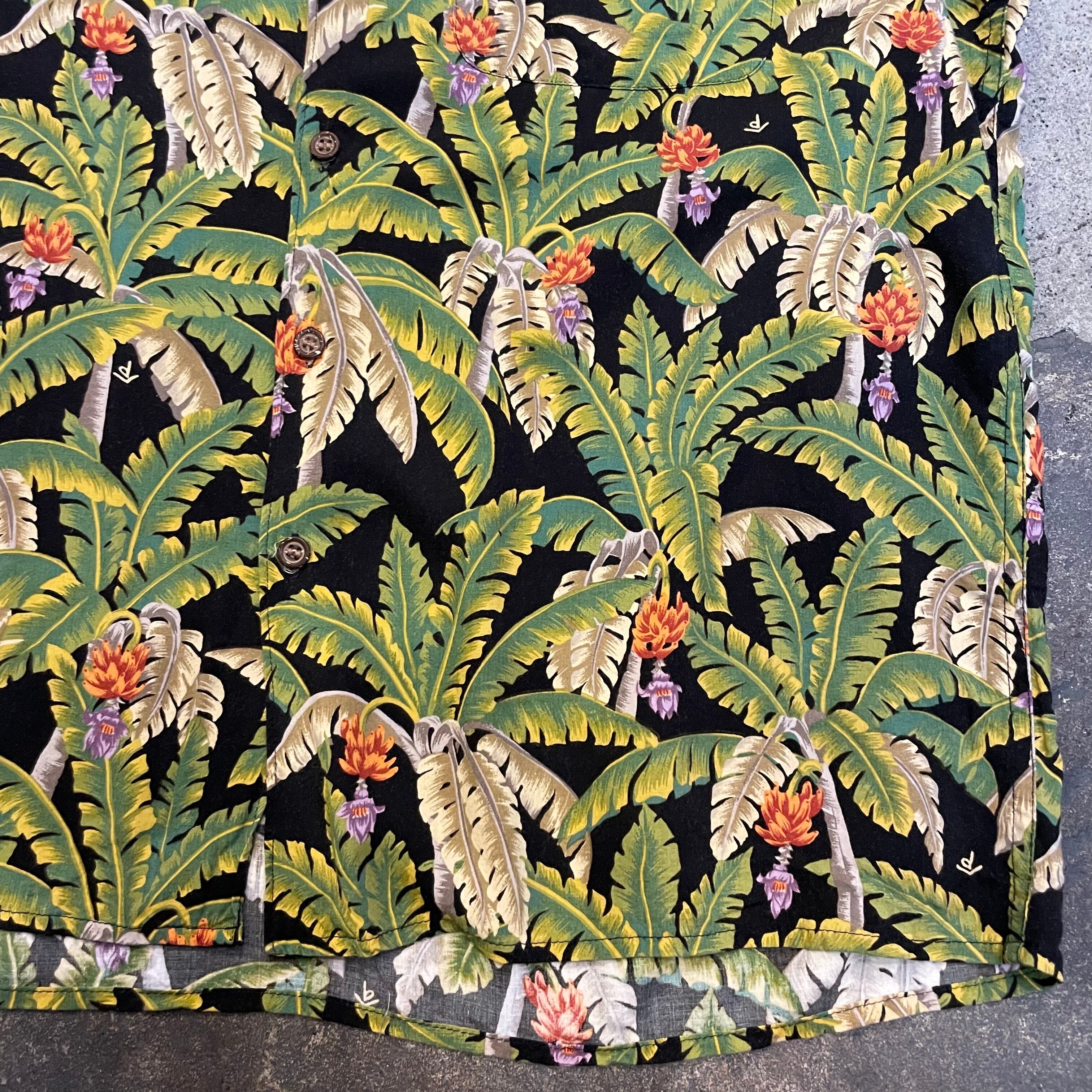 黒ベースにヤシの木?のような柄が良い雰囲気のアロハシャツです。