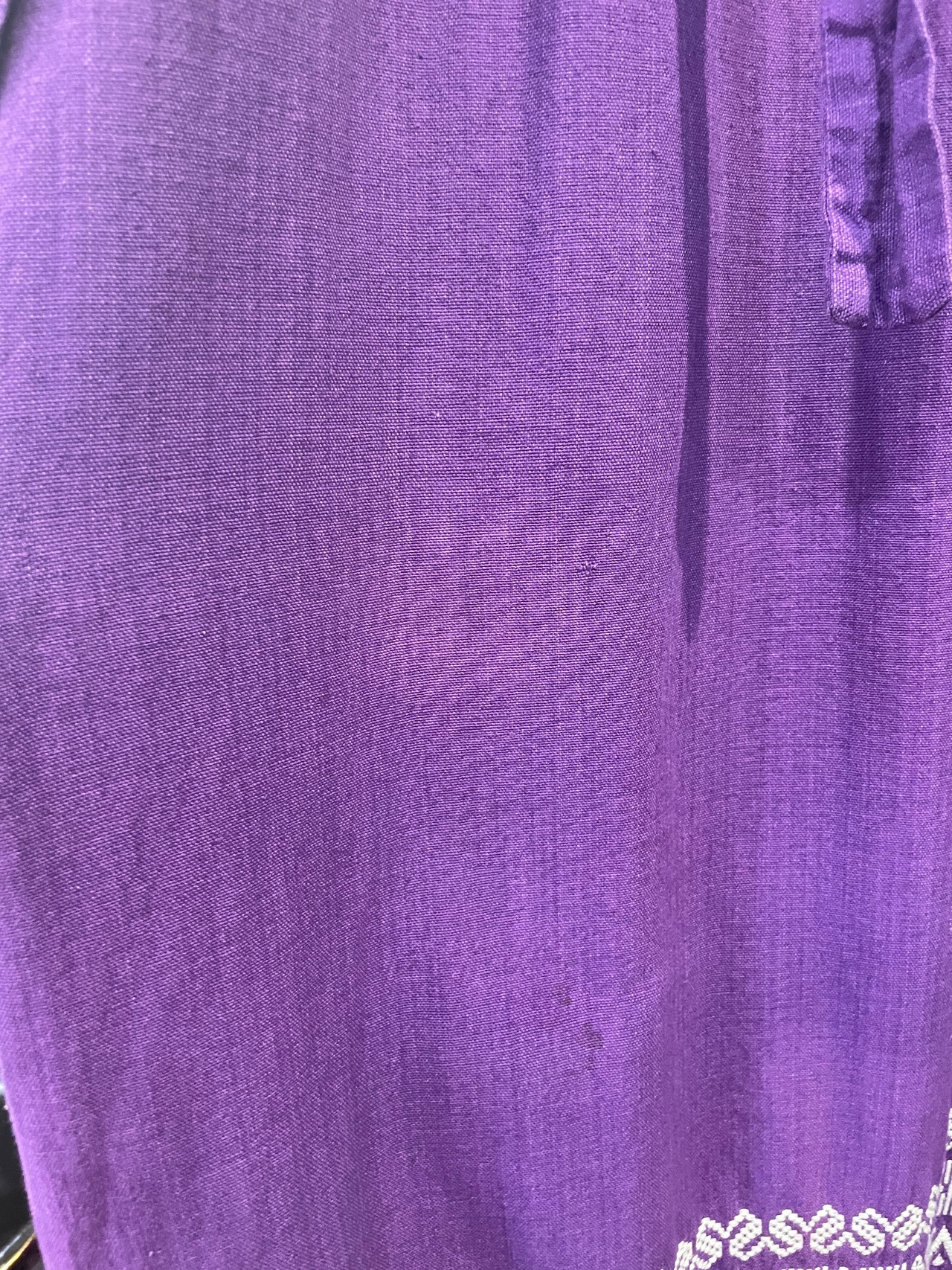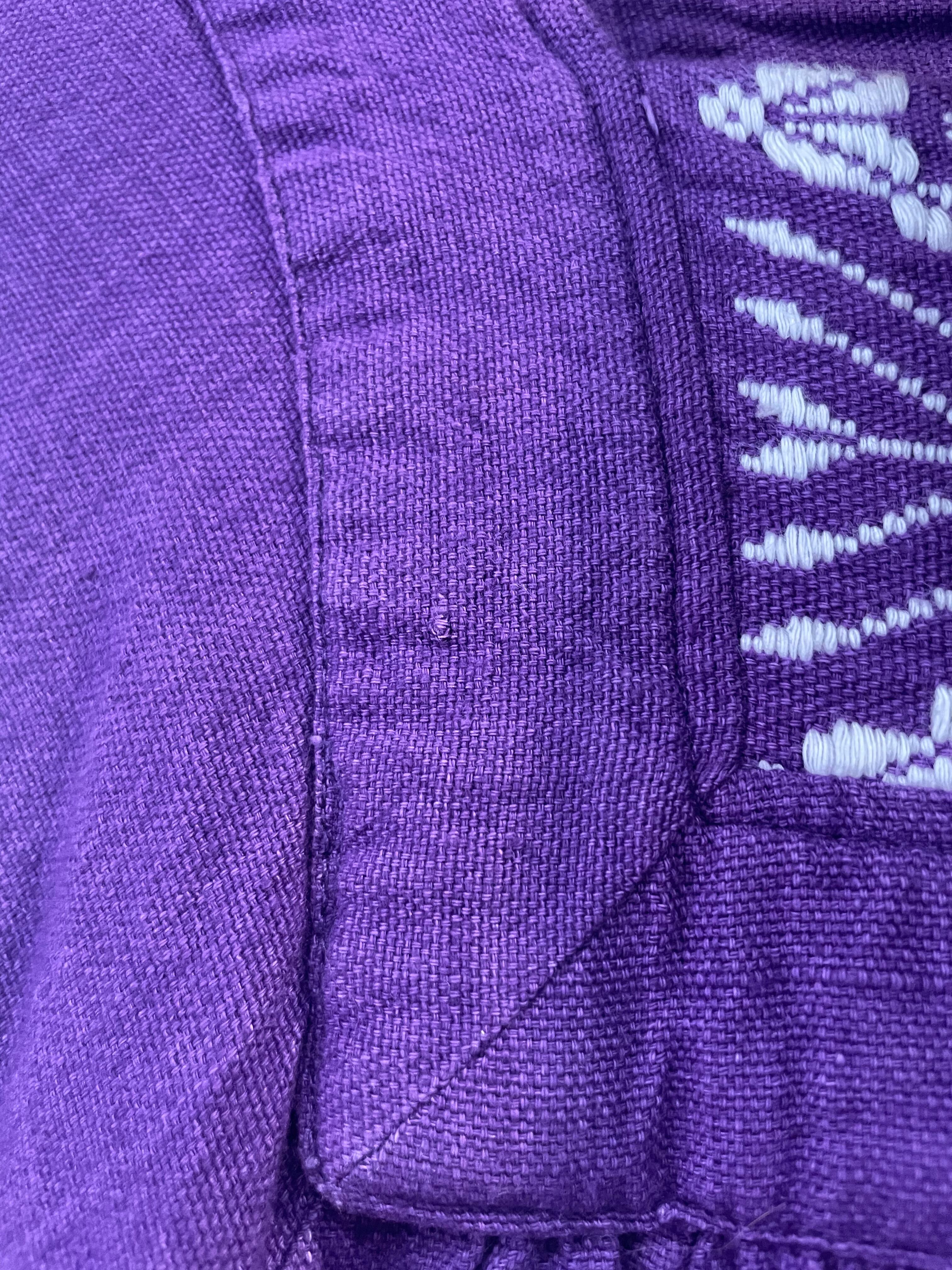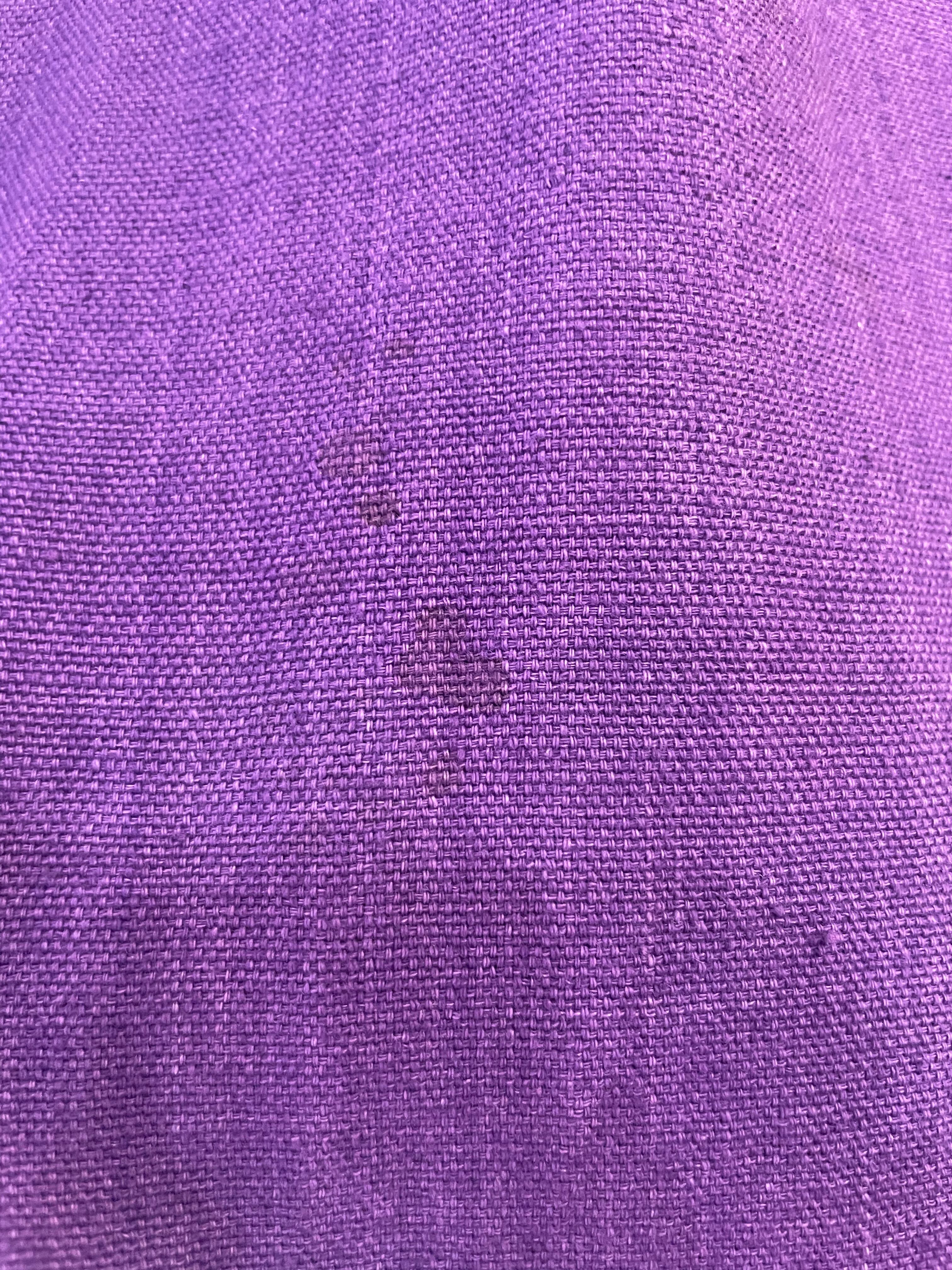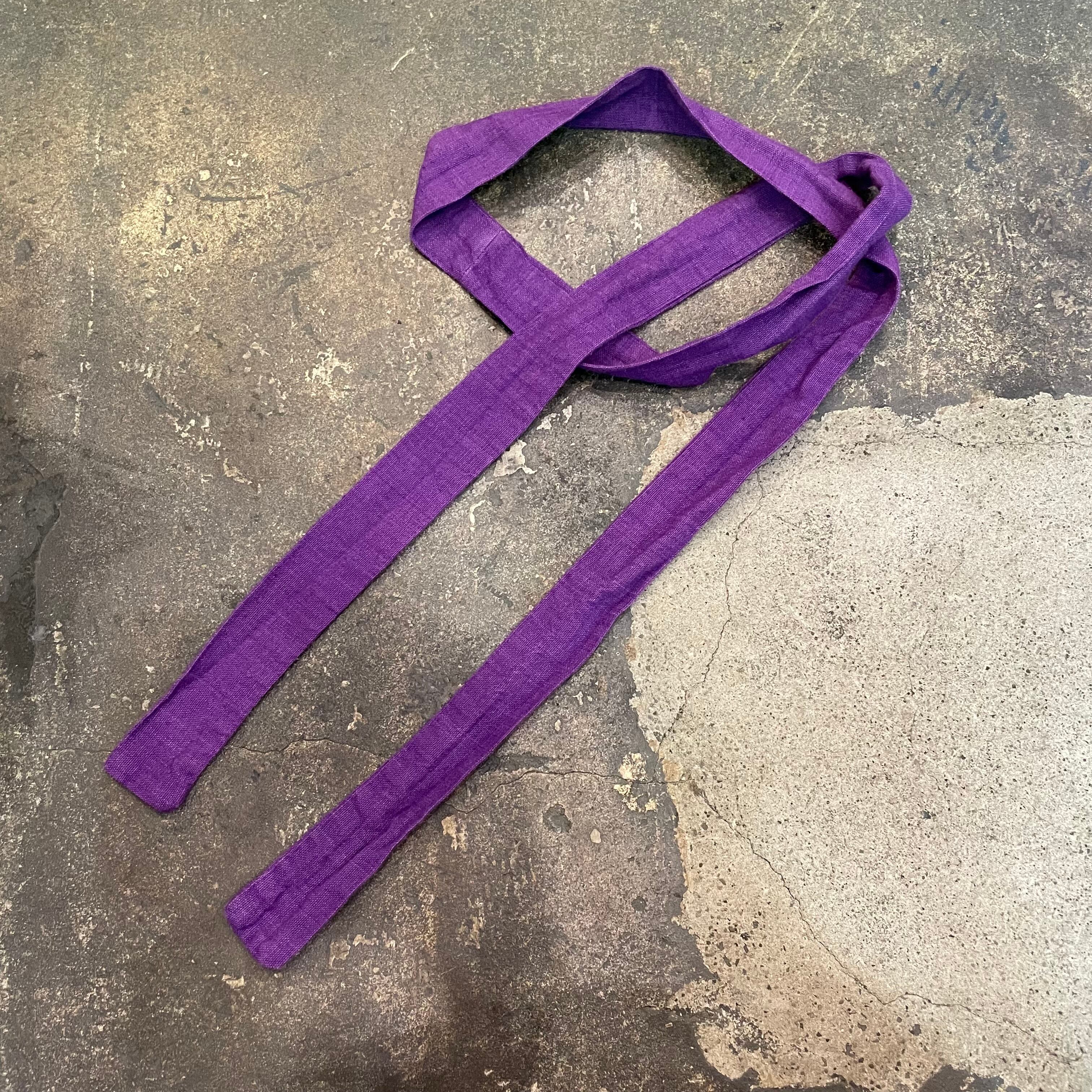 しっかり厚手な素材がとても上質で上品な雰囲気です。きれいな紫色で派手すぎず、スクエアネックでシルエットもすっきり大人っぽい一枚です。紐がついていますのでウエストで結んでブラウジングしたり、ヘアアレンジに使っても素敵ですね!