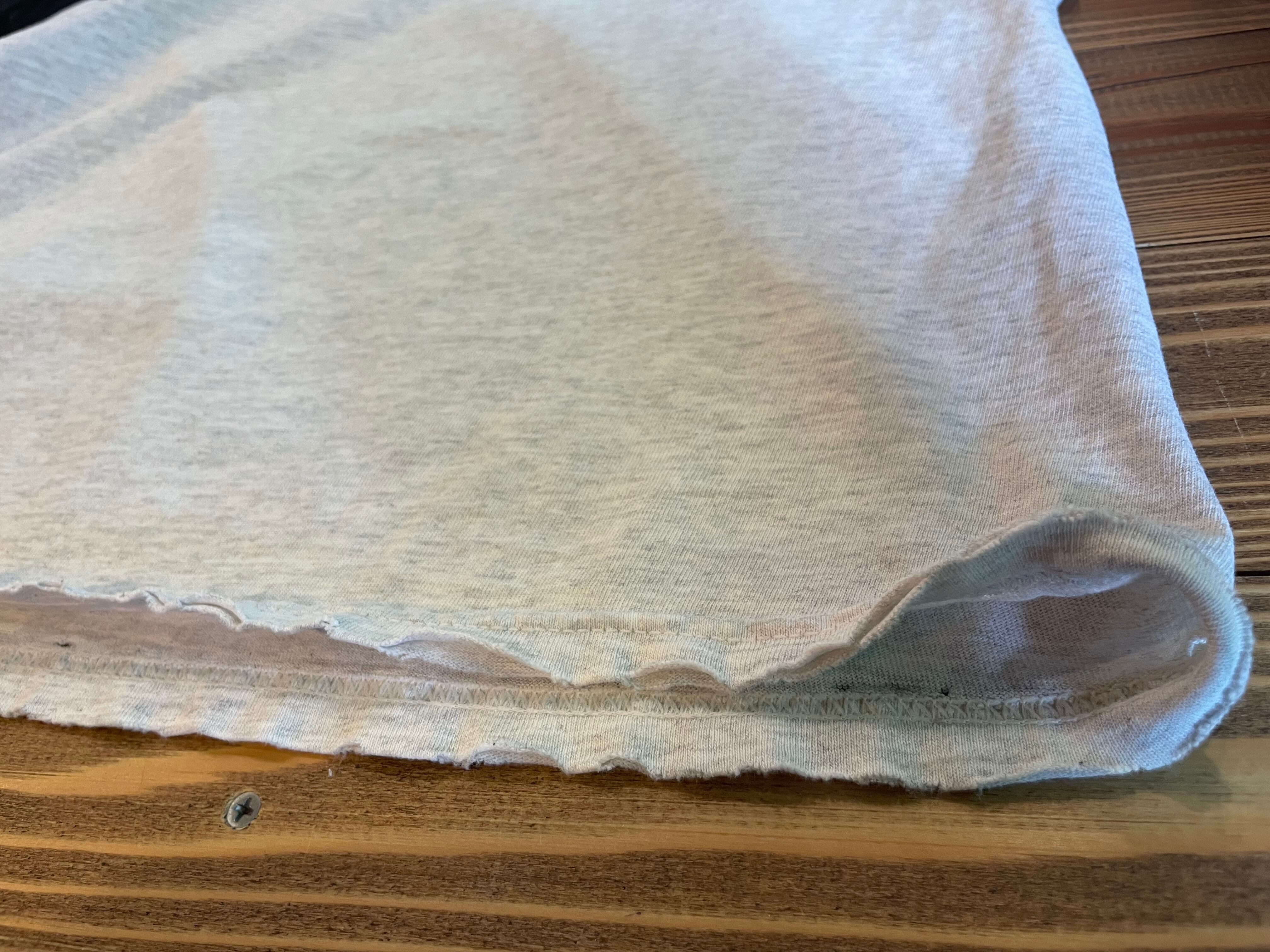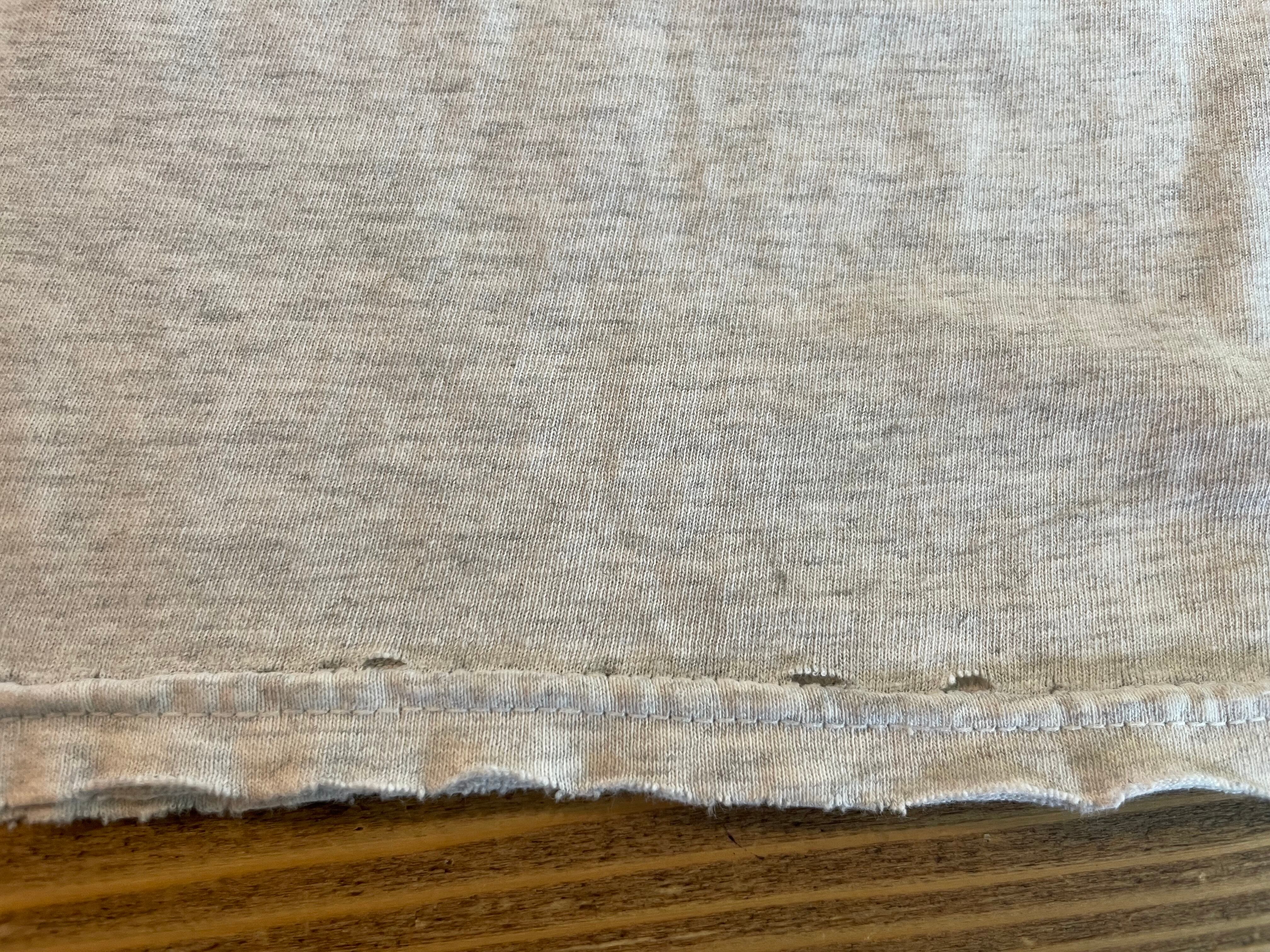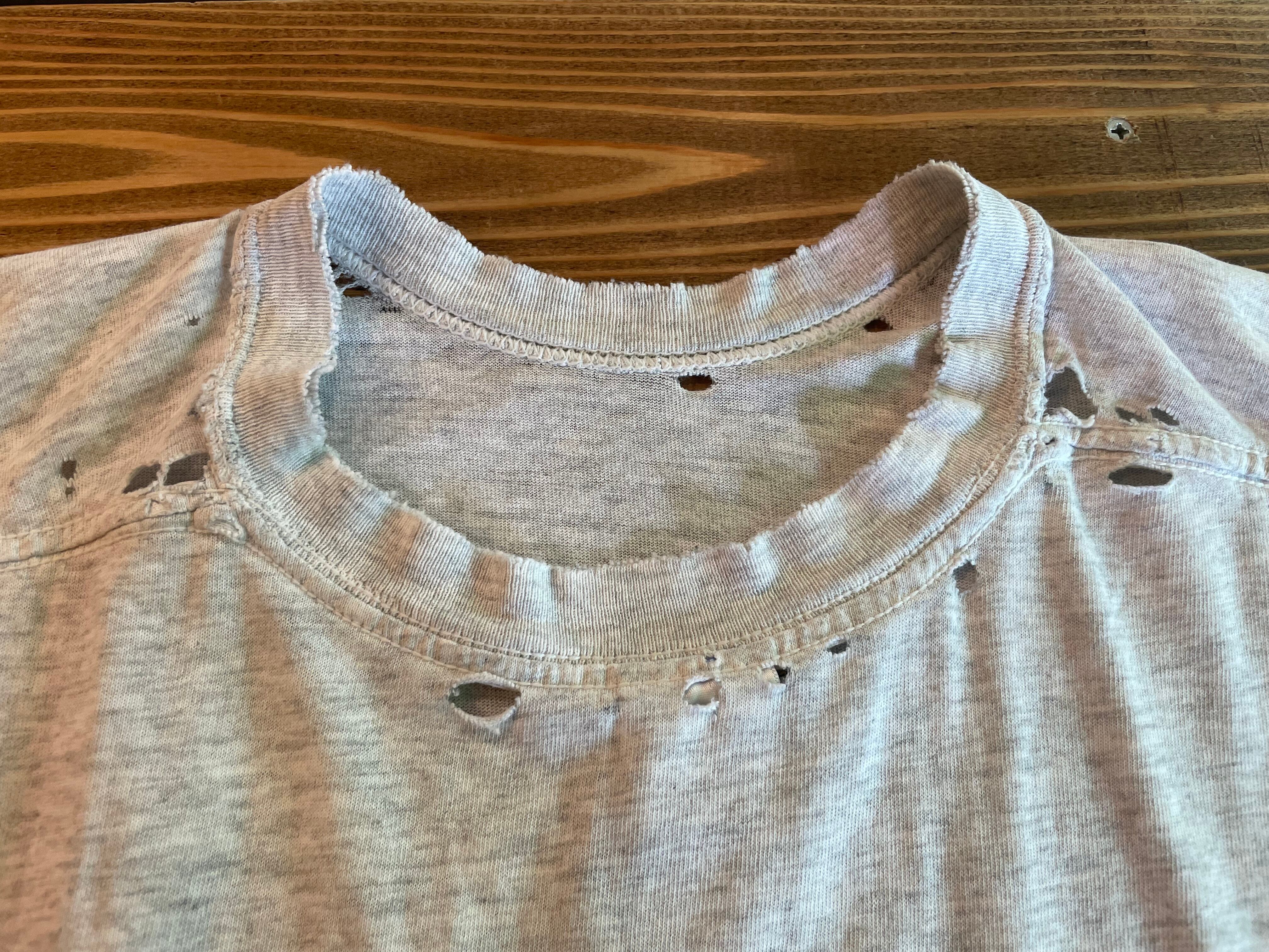 襟ぐりや裾に穴や擦れ、生地の薄くなっている箇所、脇に若干の黄ばみ、等かなりダメージのある商品です。