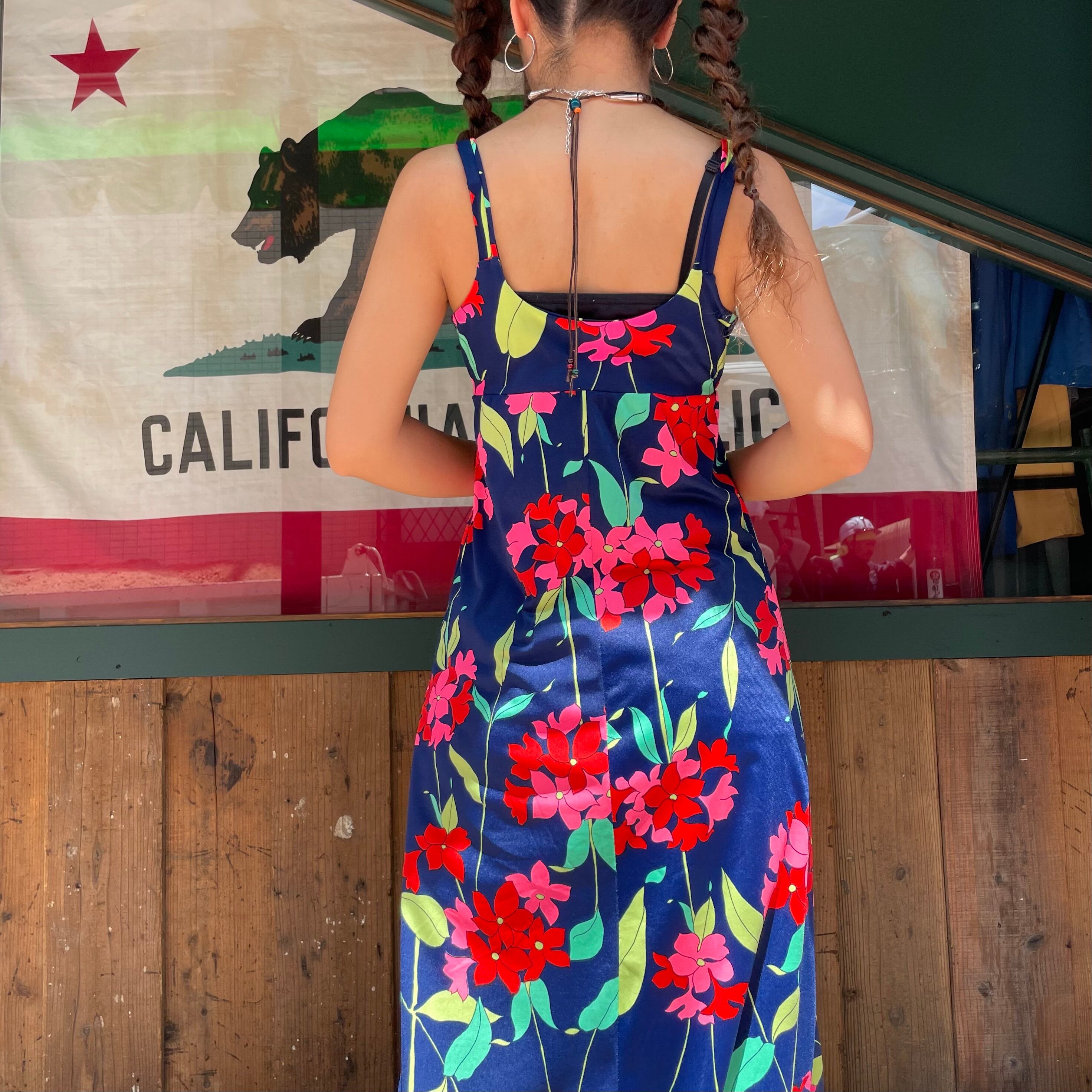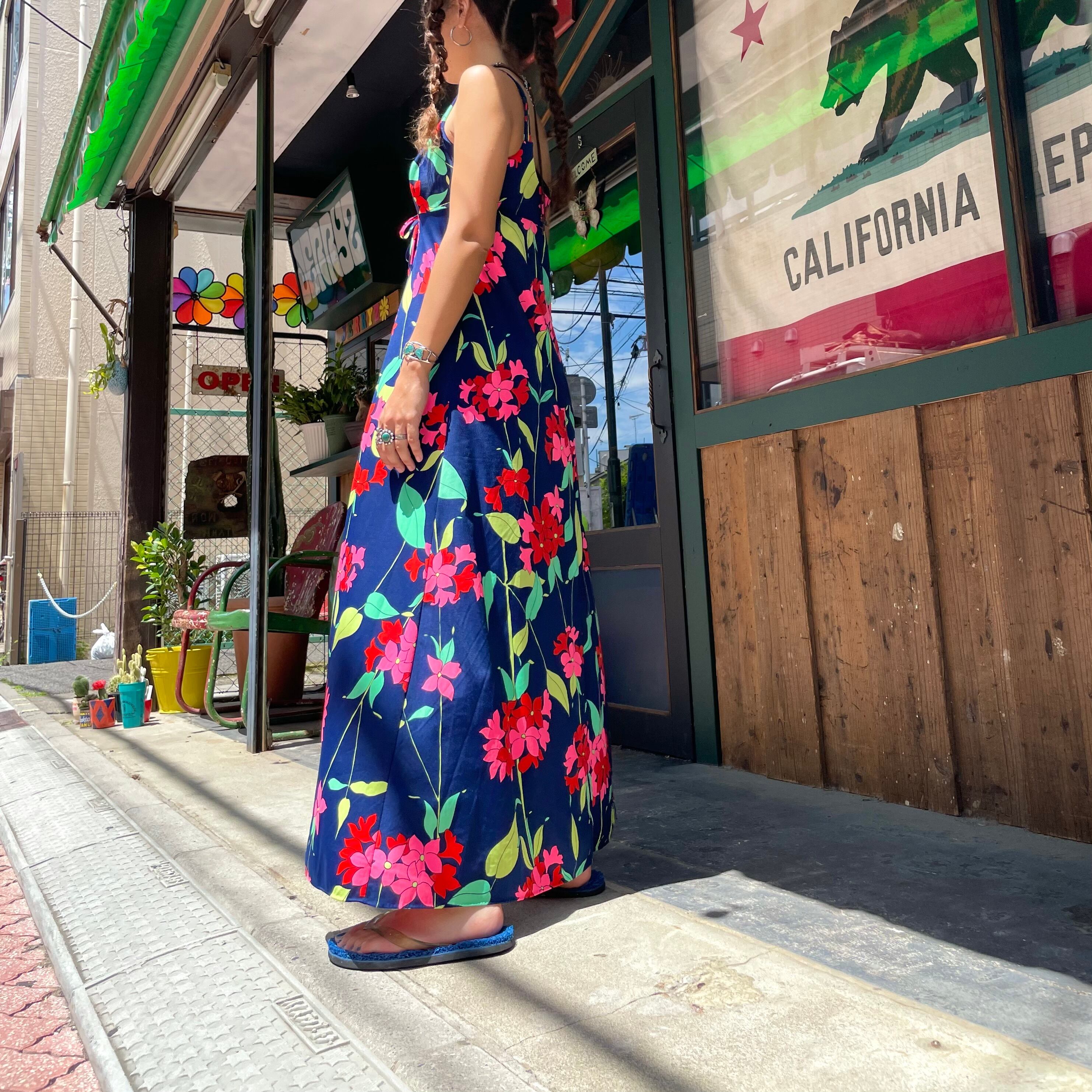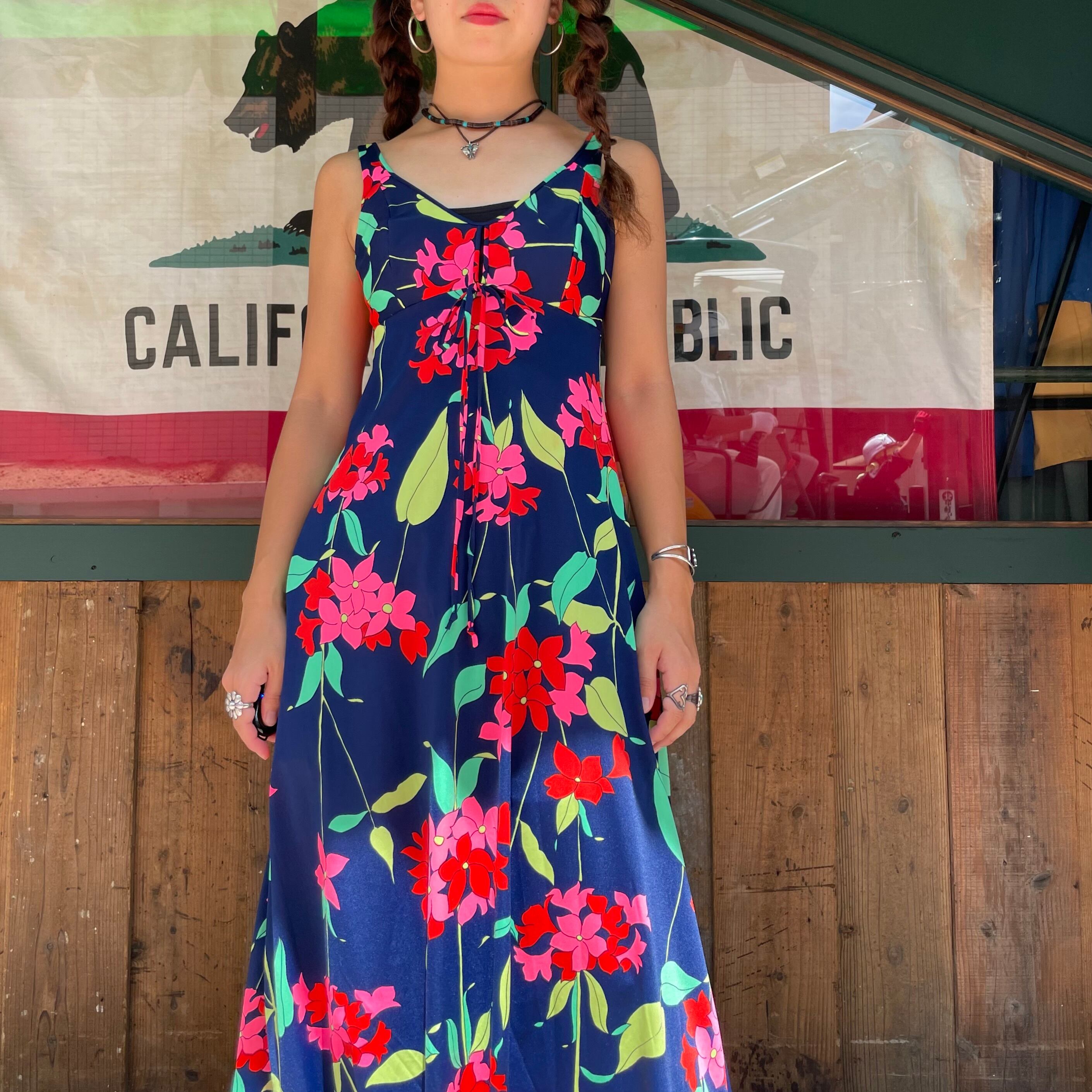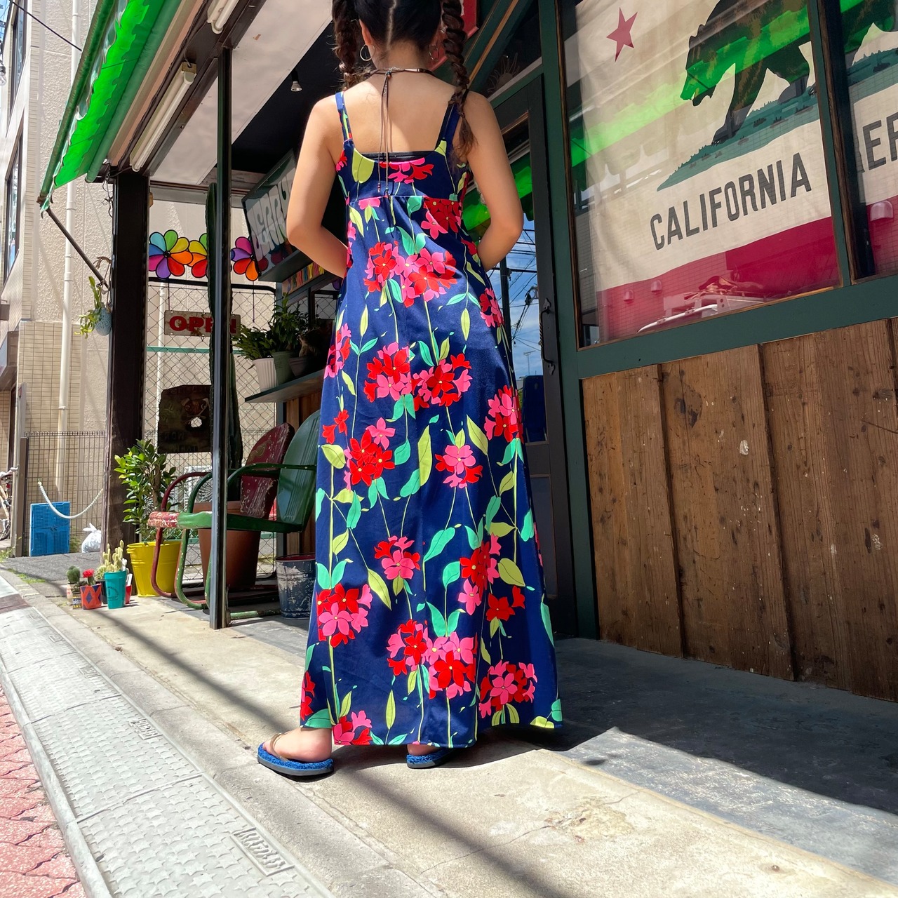 ネイビー地に赤とピンクの花柄がかわいいワンピースです。
